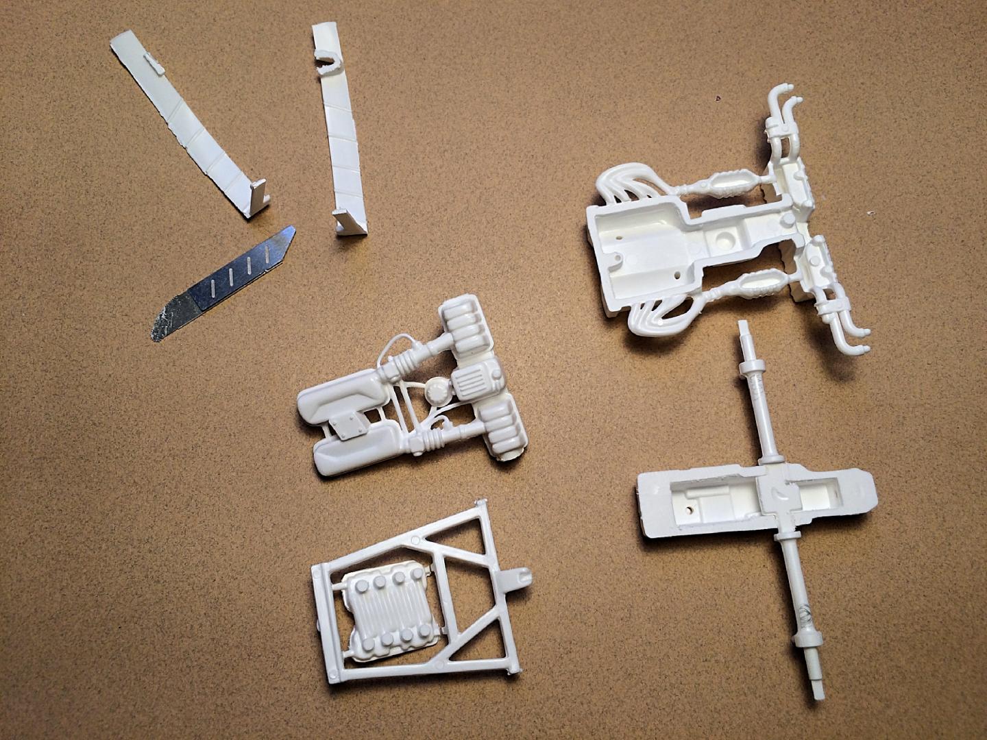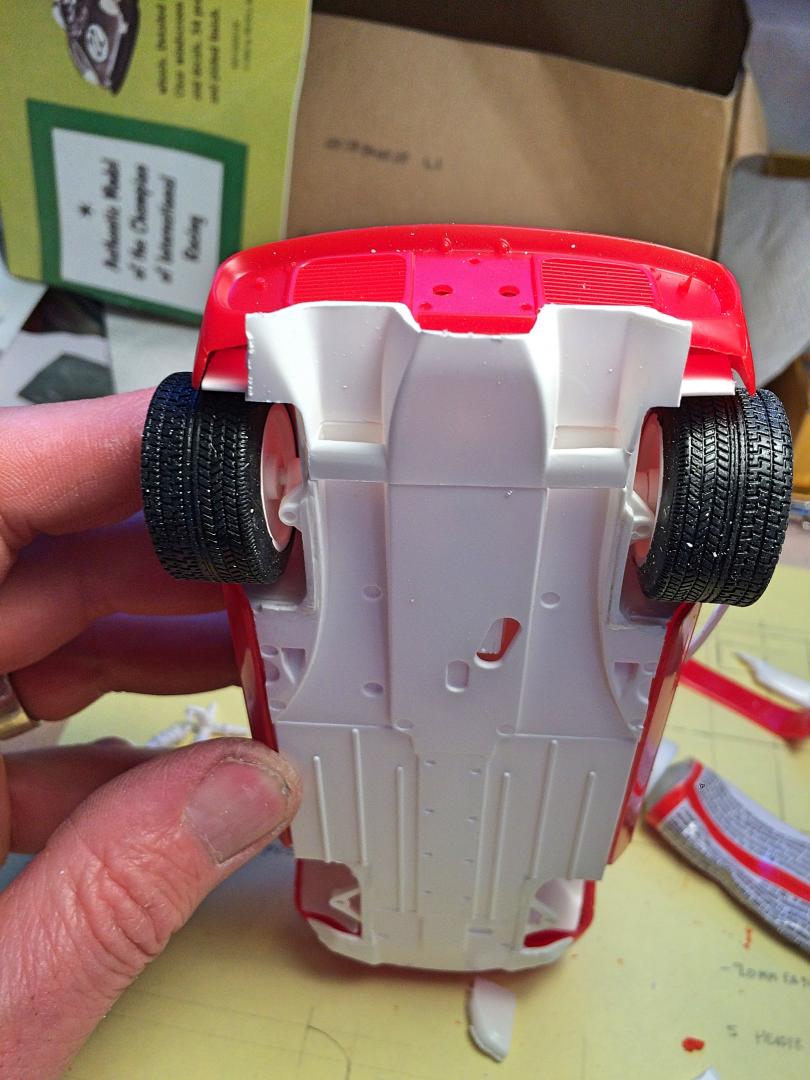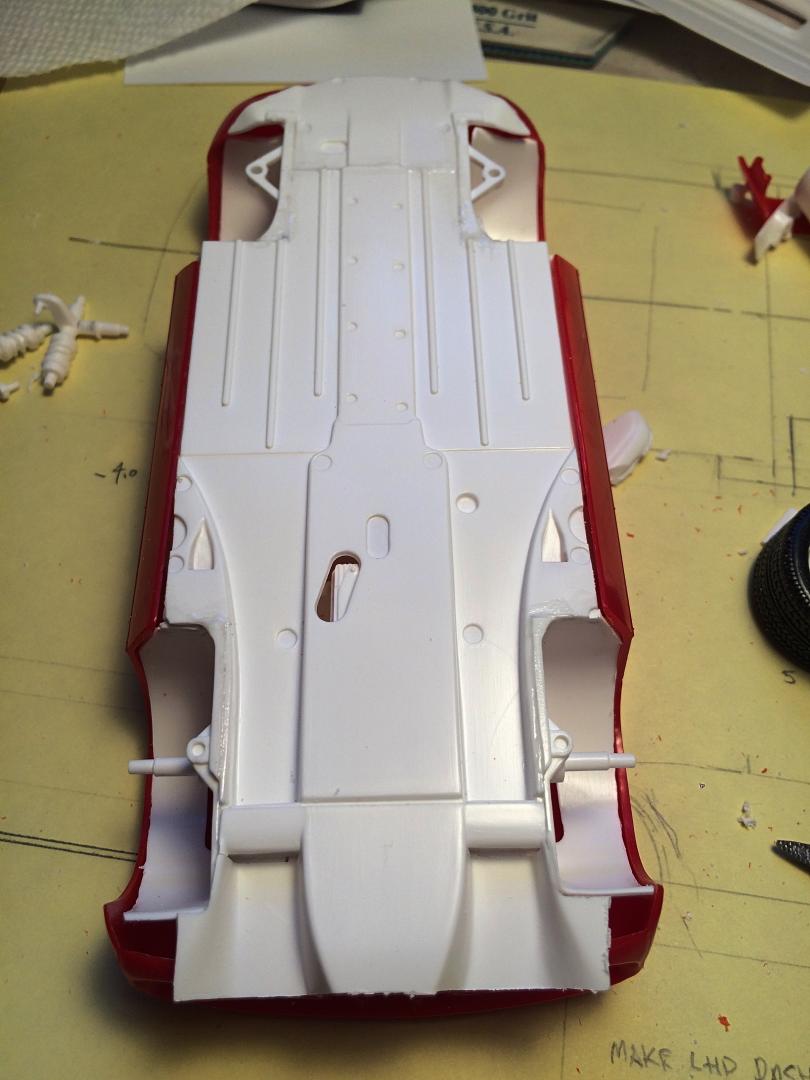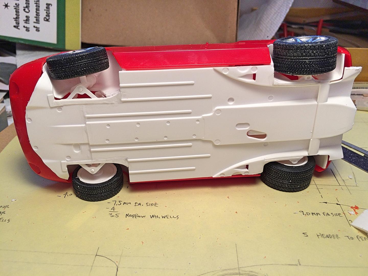 Gestation happened in my Monogram Ferrari 275P vintage kit review thread. I started by barely tacking the engine together and onto the chassis pan. Measured and drew plans to figure out where to chop and modify. I thought cutting down the engine components would help, and considering the way Revell engineered it, nobody would notice. Each surface was filed down before reassembling with just a little more glue, but still can separate to paint. Cut apart the plenum, air filter and canister part. Sawed off the engine bay sides. I sawed, and in some cases scribed and broke apart the chassis pan. The suspension is really non-existent, lower A-arms were easy to relocate. The back has been narrowed. Shortened the pan behind the front axle line. I glued all this with regular toxic Testors glue, and Flex-i-file liquid cement, much like welding. That way if I needed to adjust, could pull apart, and I could squirm it around for adjustment (supergluing does not allow this). I used the Dremel with this bit for everything, here I just removed the edge of the pan. I really cut apart the interior tub, with a saw, and filed down and straightened the cuts. I needed to keep this as a separate piece, for being able to get the struts in later. I tacked parts onto the pan, but welded all together as I went. I adjusted my plan as needed, kept the tunnel which will need some modification to the chrome trim part. I really like the tunnels, so cut off the rear body part, made several saw cuts. Front of the pan was sawed off, some Dremel grinding to shape, real rough at this time. But it all fits in great, and don't need an engine hump! Thinking of how to add fender flares, simple round bumps most likely. Still need to shorten front axles. Modified the rear, decided to keep the original grills, but going to be modified at the bottom, and will be mesh. Drilled holes for the Mondial taillights, have also done for the headlights. The valance edge will be refined later. I was going to have the exhausts exit through holes similar to the Mondial, but it will be easier (I hope) to direct down from the mufflers into the tunnels, and then back. Now I need to leave it alone, so the cement will cure. I discovered the body is twisted, so need to consider how to straighten with strategic body mounts using screws. The fender flares will be fun. Interior should have simple door panels, and dashboard. Need to figure out the radiator in front, thinking laid almost flat, with channels exiting before the wheels. Then when all that is done, cut off the engine lid, and then will need to fabricate chassis box thingies and framework continued from the engine part. Two more radiators in back, modify the body ducts. Then exhaust pipes. Then seats, I got some cool aftermarket units at the DSC show. Color, Ferrari red with a pearl overcoat. Dann will hate that.