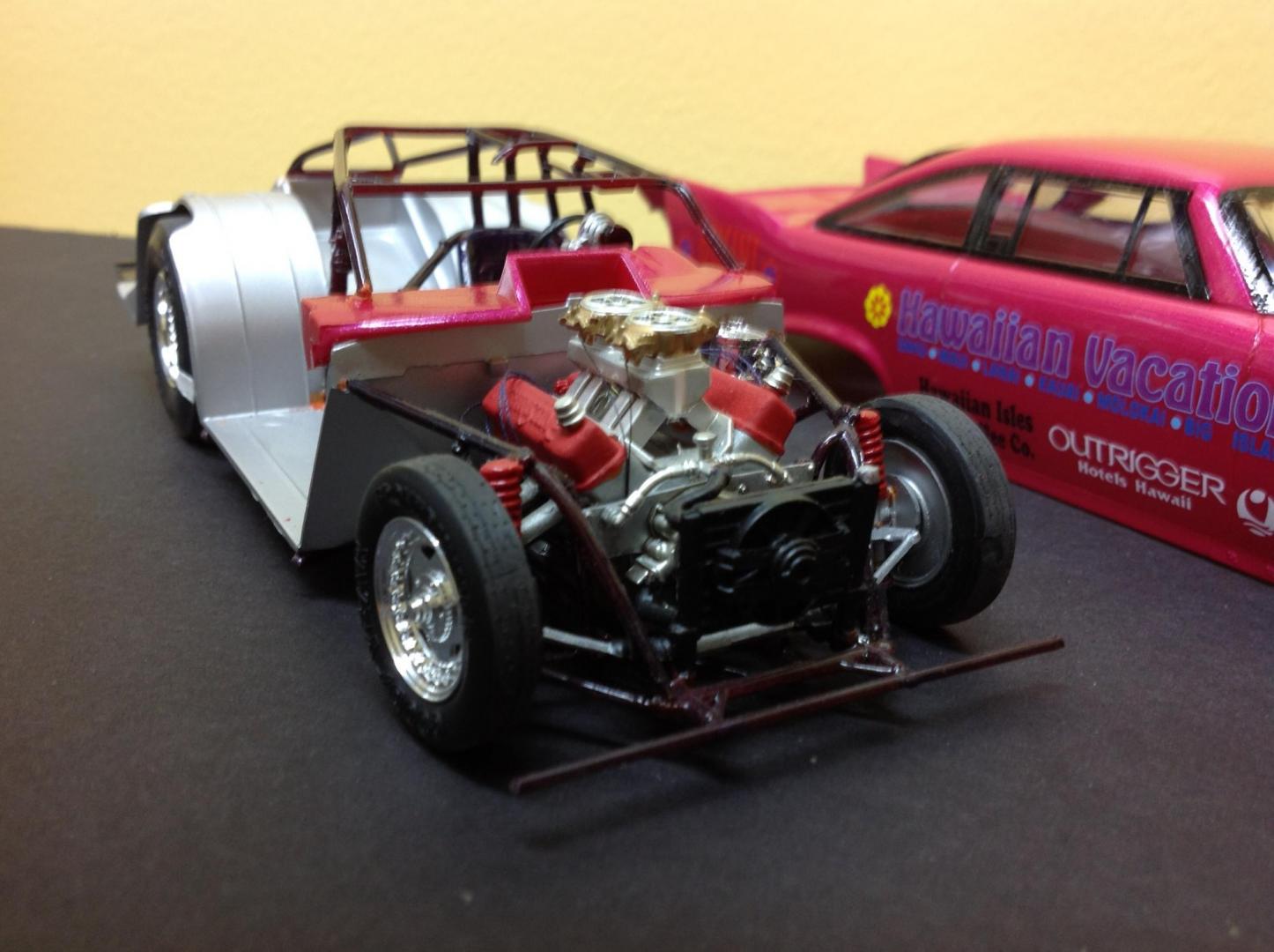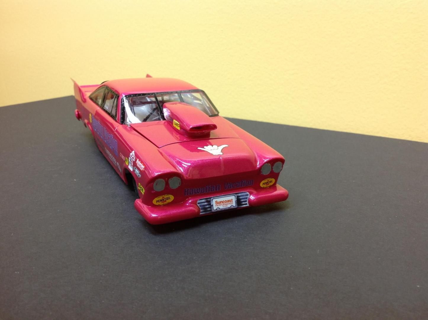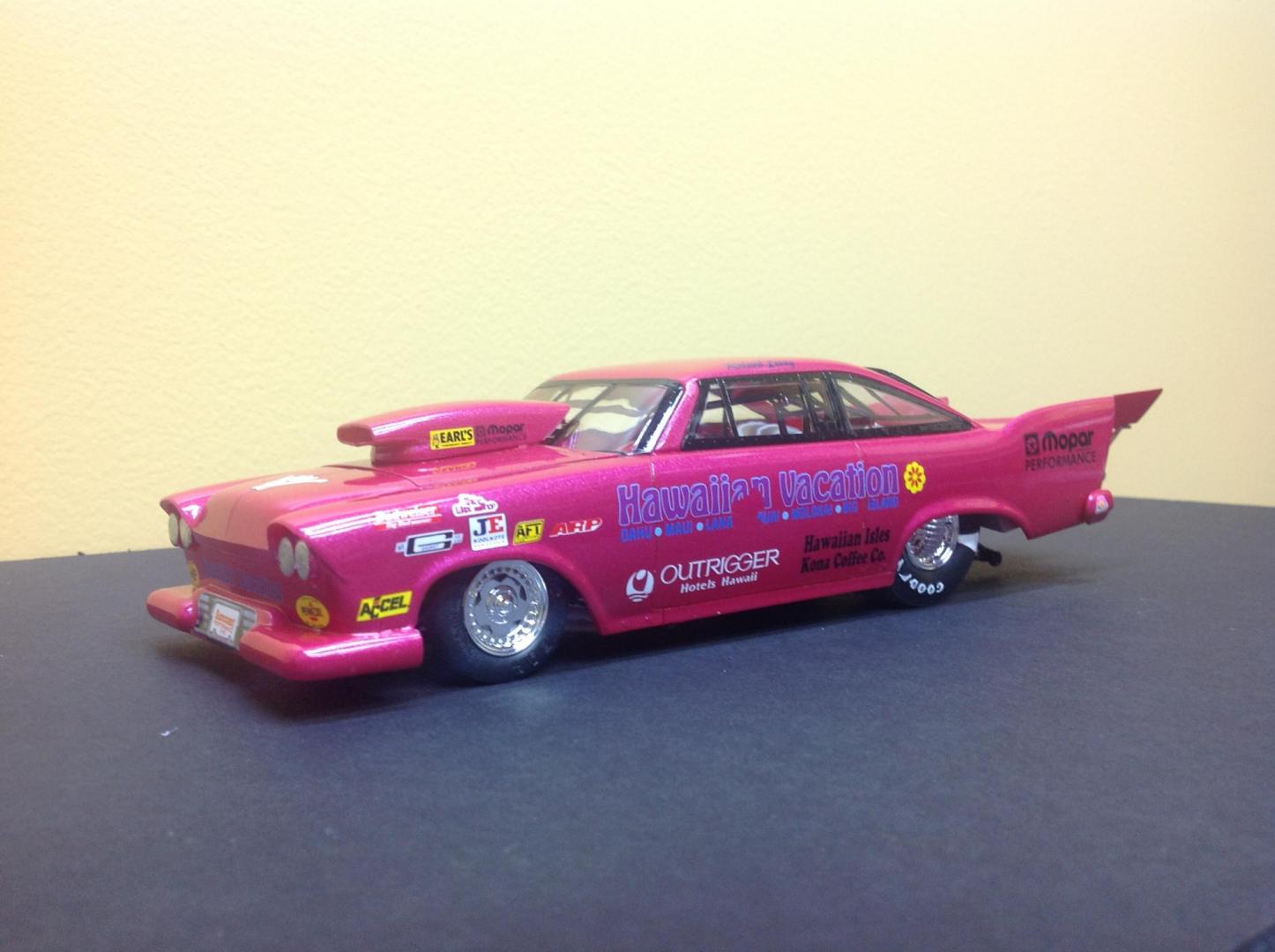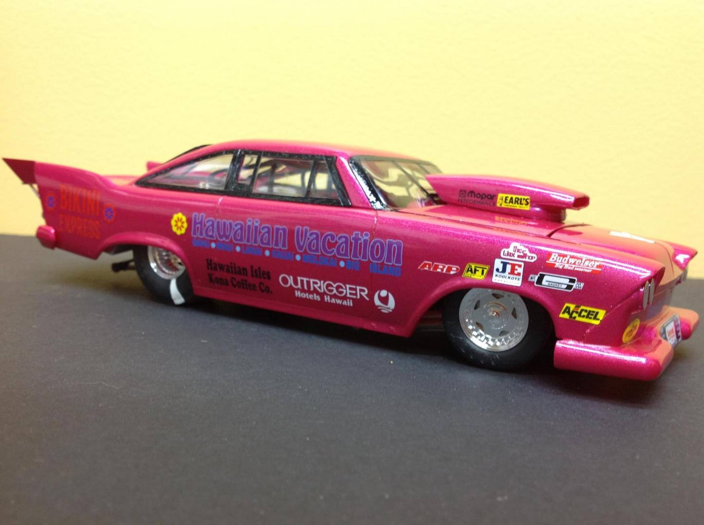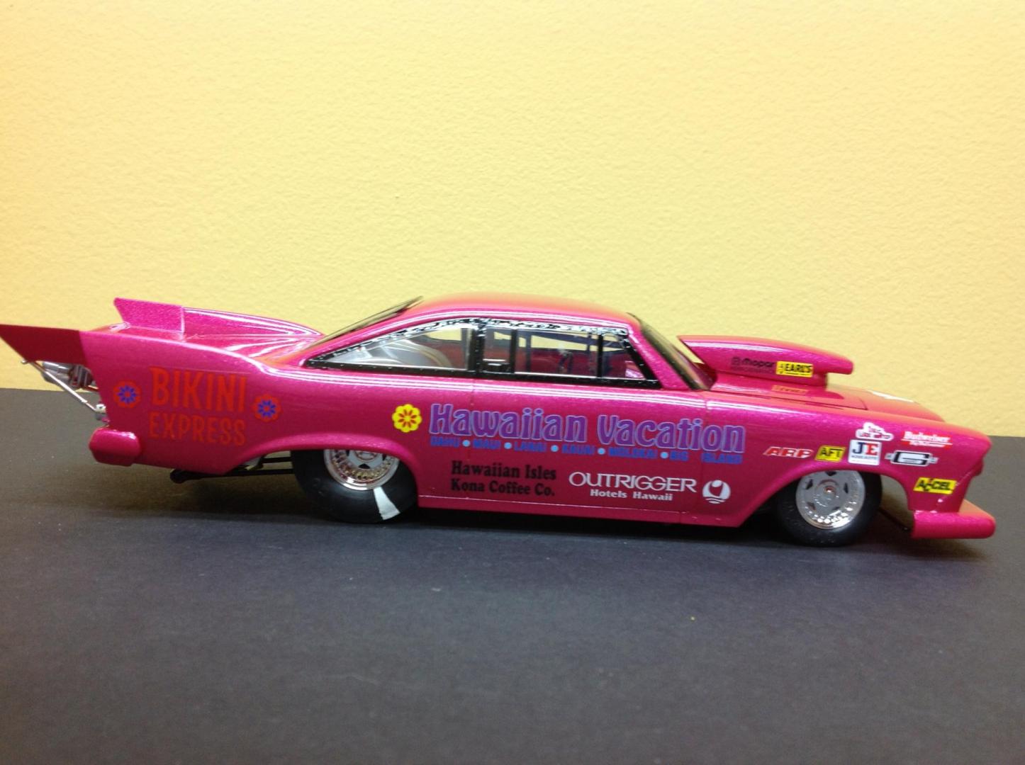 This Revell kit started out as a "Christine" Pro-Mod. Before losing all interest in building models my son finished the engine and chassis some 20 years ago. He allowed me to finish it so I got it done in late 2015. The kit decals were very yellowed and unusable so I decided to go with an Hawaiian theme from Slixx Decals. Painted with Testors electric pink. I learned on the drivers side not to use tape to hold windows in while the glue drys. Removed my Pledge Future and decal when tape removed, talk about a let down. So now it's only displayed from the right side. Also ruined the Mopar Performance decal so had to use the bikini express decal from my AMT Fruit Wagon kit on the right quarter panel.
