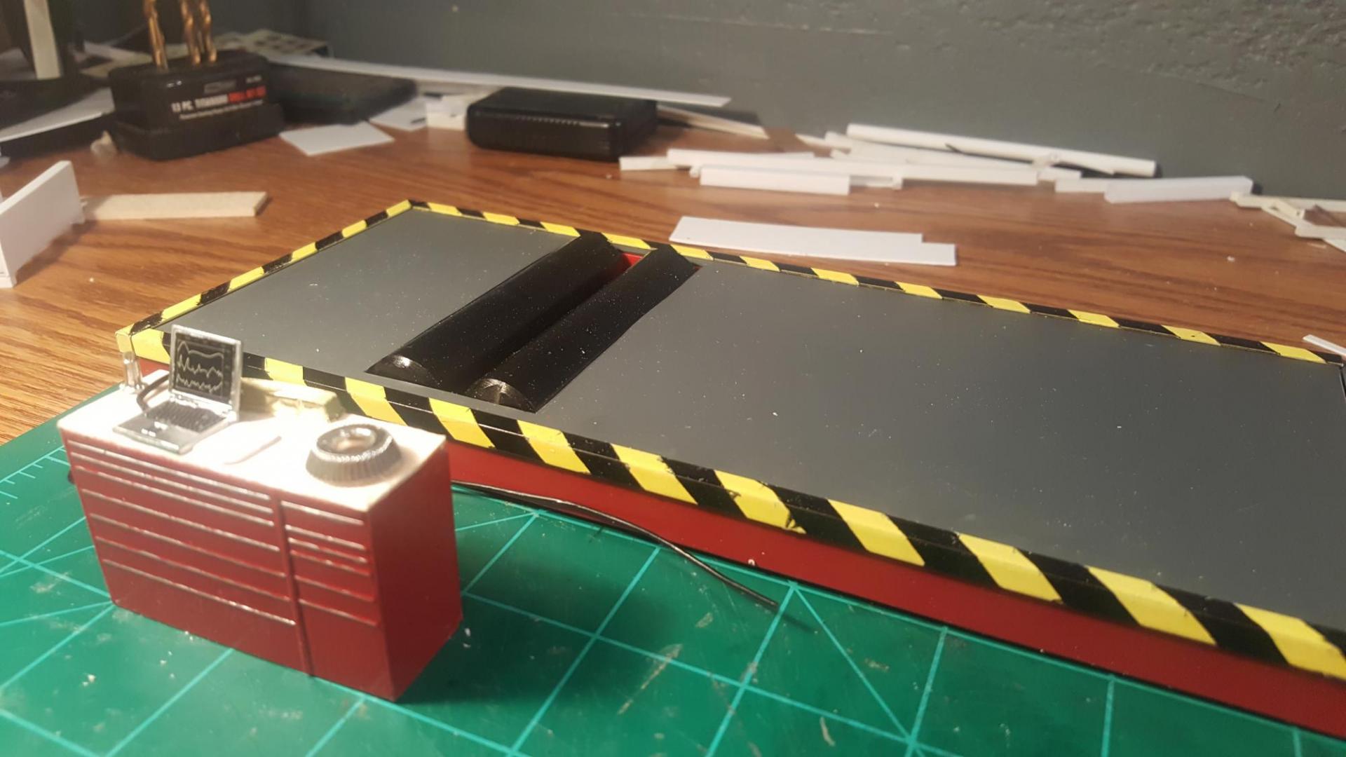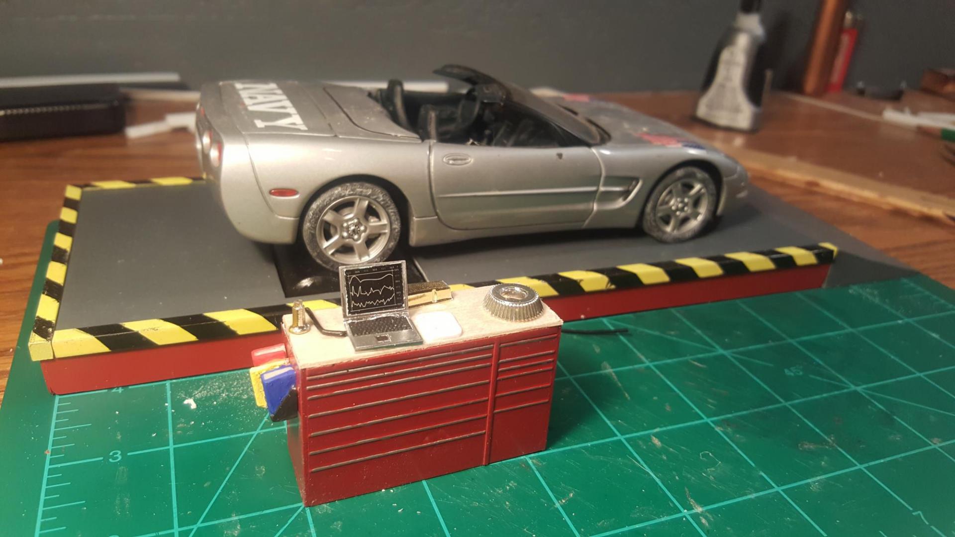 A friend asked me to build him a Dyno tester to display a funny car he is building. He wanted it to show it being tested as if he was working on the motor. I am not quite done as there is no sending units for which the computer can take readings from. They are outside drying and will be installed tomorrow. Then I will be able to connect the wire from the lap top. Any thoughts ? I also have to touch up the black and yellow caution paint as I had a little trouble with the tape lines. No biggie !