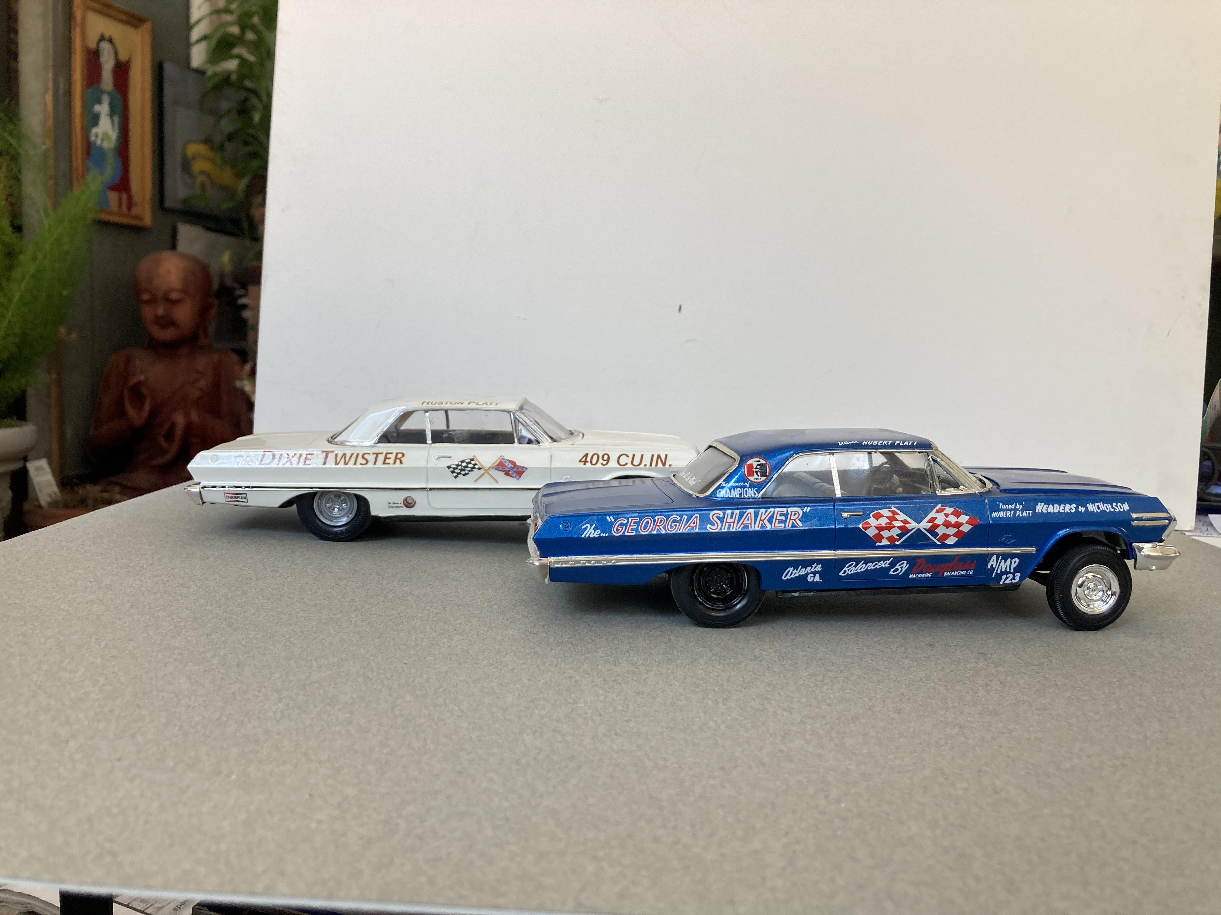 These Z-11 conversions were done by combining amt’s 1963 impala and the very well done 1962 super stock bel air kits . While you can’t really see it in the pictures I cut the console out of the 63’s interior tub , and replaced it with the transmission tunnel that I cut from the bel air along with the bench seat , shifter and tach. I use the chassis with the raised front suspension, and cut down rear coil springs . Use the bel air’s 409 with the optional Z-11 parts. The fender wells were cut from the bel air’s body and glued to the chassis along with the radiator support, and firewall. Hubert’s car is painted in testors metallic blue enamel with Fred Cady decals . Huston’s car is testors white enamel with smp decals . I’ve done quite a few of these Z-11 conversions and they’re such a joy to build . As always thanks for looking ?, Mike