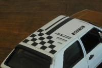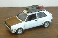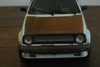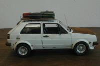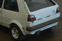 This diorama was to make as simple a base as possible, and attempt to show motion. The pavement is just a piece of Corian (plastic kitchen/bath countertop), which is the perfect grain and color, sandblasted texture for rolled out pattern. Tire marks are pastel chalk. I made the master, and made resin copies of the cones, most are solid, a few are hollow, and for the killed cone I bent it soon after casting. The timer equipment is really simple, I could have super detailed something better. The VW Golf II GTi is the Revell kit, the alleged "Tuner series", which has horrible wheels and hideous aero parts. I used Integra wheels. I modified the bumpers to be European looking, the grill has wire mesh, added a moon roof, Evo 5 mirrors, resin Vehicross gas cap, Euro tuner green taillights, real springs on the suspension (which nobody can see), removed door handles (which are really cheap units). Painted with Boyds turquoise, with a nail 'polish' green pearl over it, and clear. The interior back seat was removed, Scale Motorsport decal on seats, figure is modified race driver. Built in 2003. I owned a '91 Jetta GLi, did some autocross, so I *had to* do the lifted rear wheel.