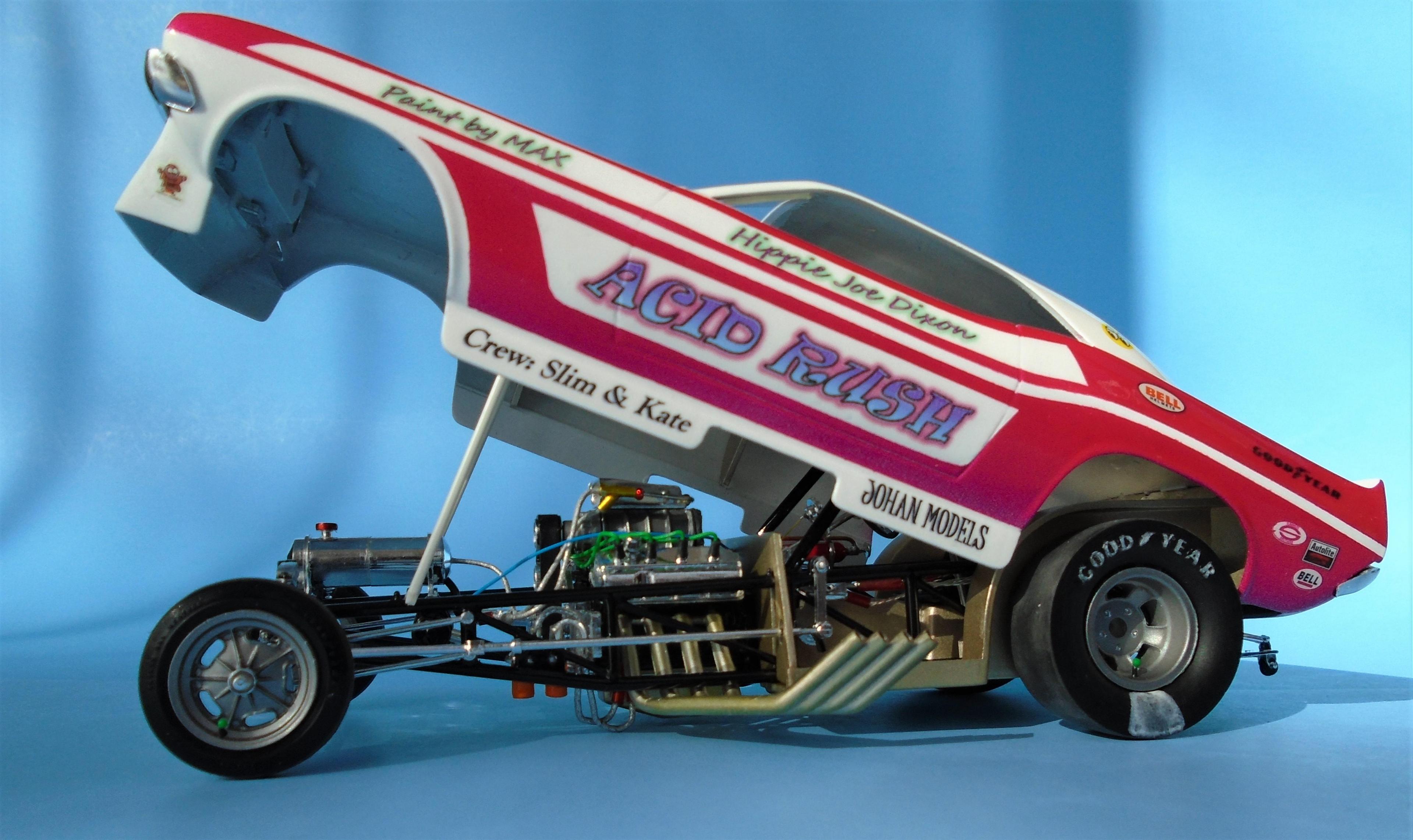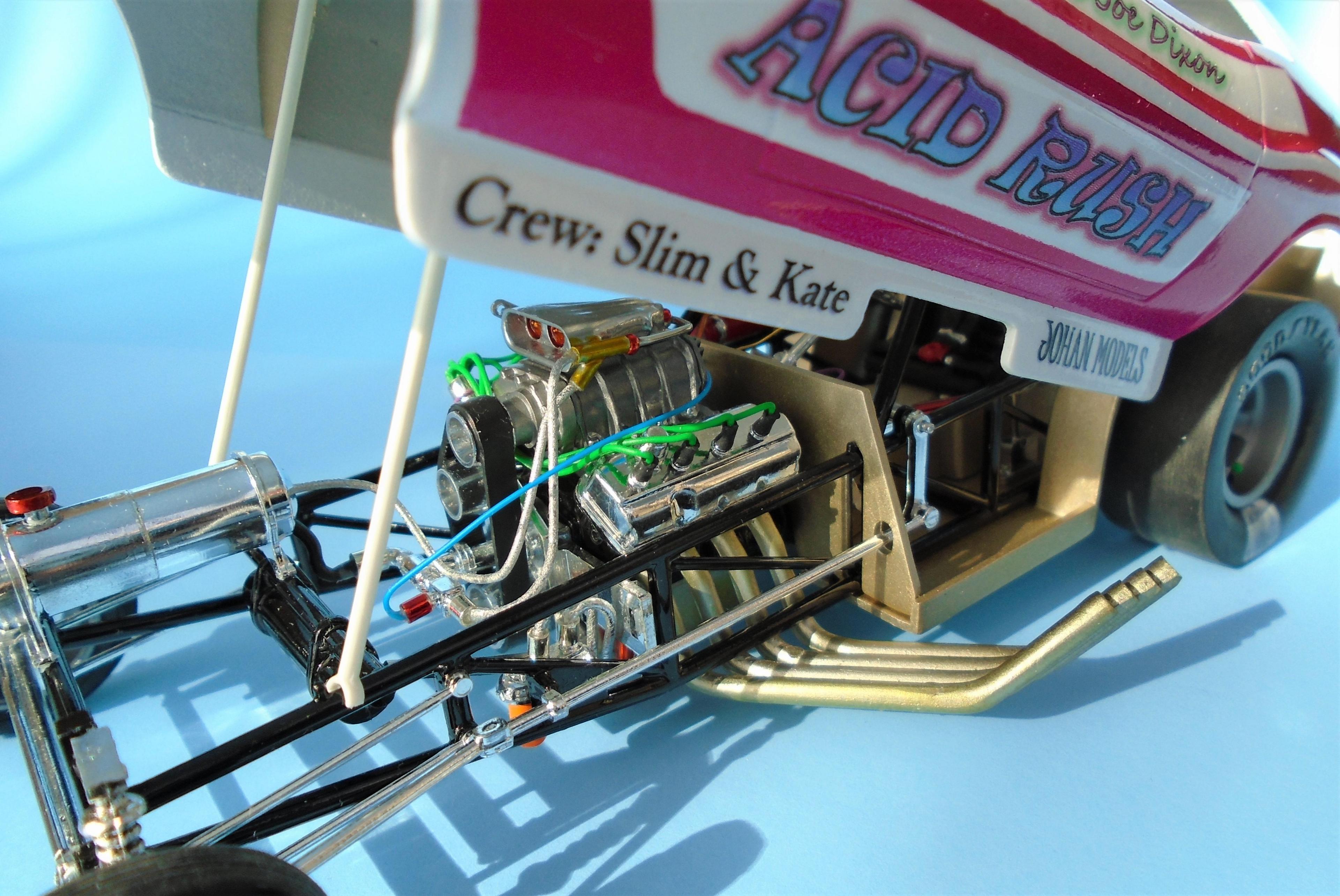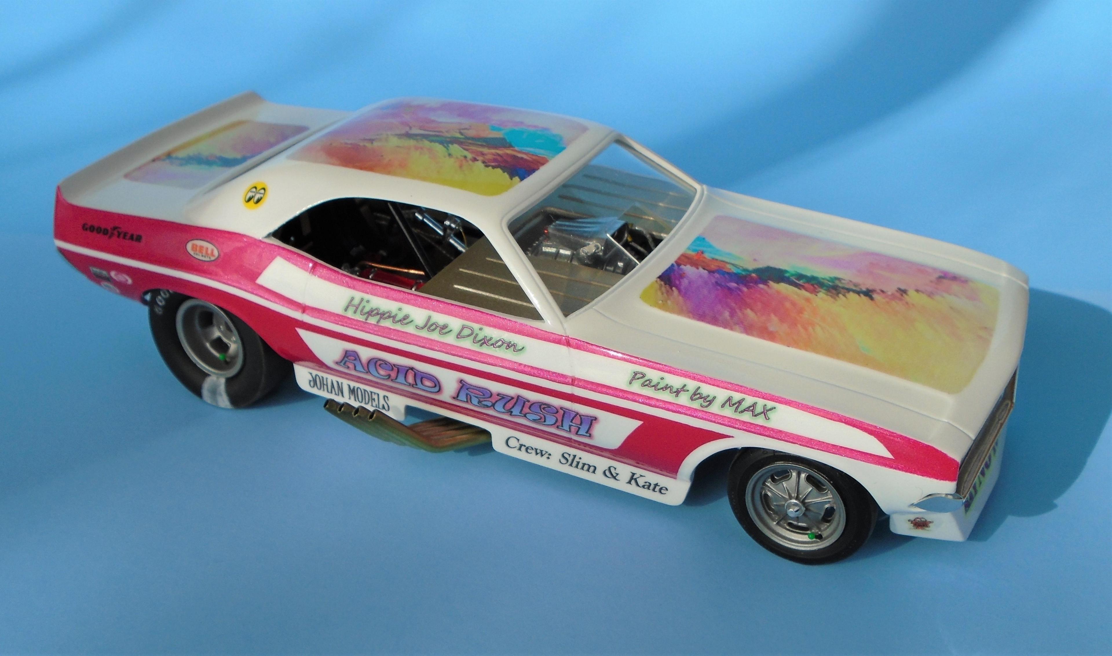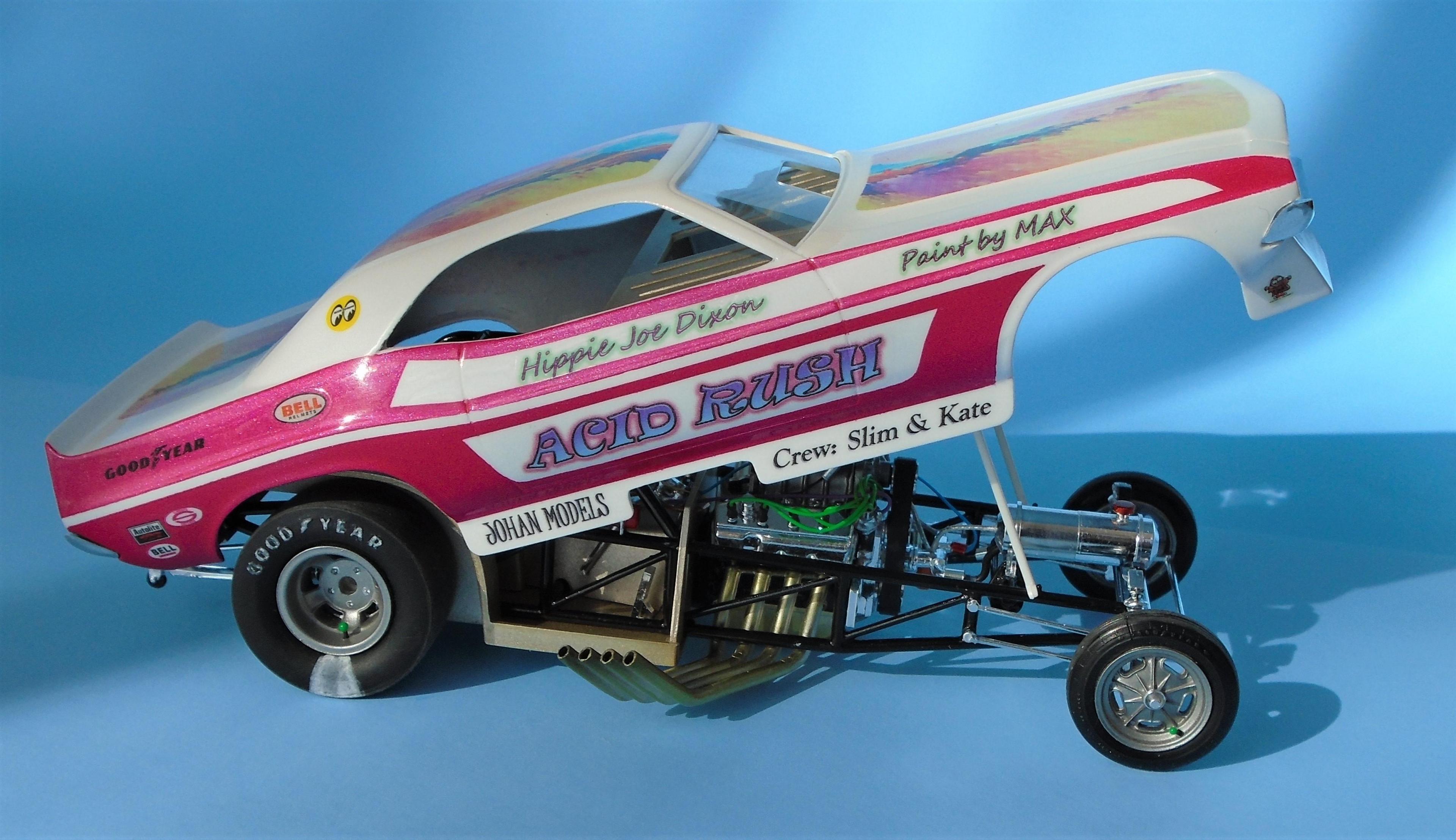 HI! I know... nostalgia exagerates the past. But to me. the 21st century funny-cars appearance pales in comparison to the era of more "similar" body styles, and creative colorfull liveries that bordered on art form, not vynil wrapped billboards. I also know that the sheer cost of running FCs leaves no choice to operators. But we can still celebrate the "groovy" era of the late 60s - early 70s, right? The Johan kit is a GREAT offering, even at 50+ years of age. Few glitches will slow you down. Tim Boyd comments favorably about the kit in his latest book, with reason. I found this one for 5$, because the seller was ashamed that the box, stored in his dirt-floor garage, was smelly because of mice dejections. One man's trash is... well you know this one! So: hosed, wired, detailed, painted Tamya's pure white with Testor's Hot Pink panels, and ficticious home-made decals added to recreate the era's vibe. The hood-top-trunk abstract artwork was a painting I found on the web, dowloaded, processed and trinted on clear decal sheet. Testor's Wetlook clear copiously soaks the whole thing. The frame is Testor's black enamel, and a variety of Alclad shades were used for the engine and accessories, They say that "if you remember the 60s, it means you weren't there", but I beg to differ. Long live nostalgia funny cars, even the ficticious ones! CT