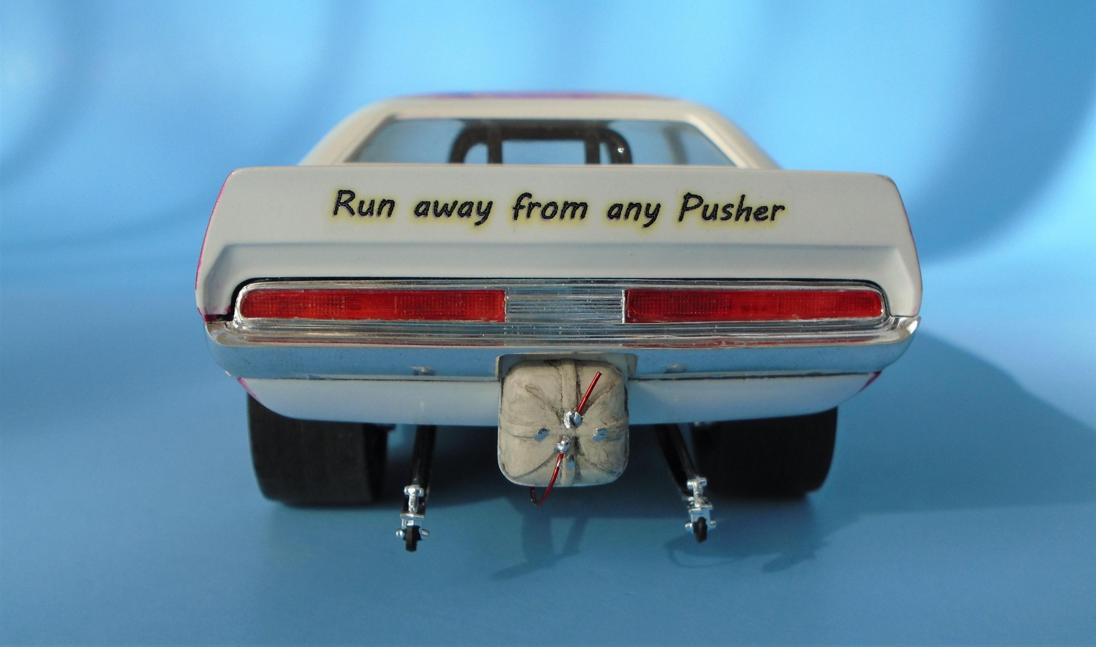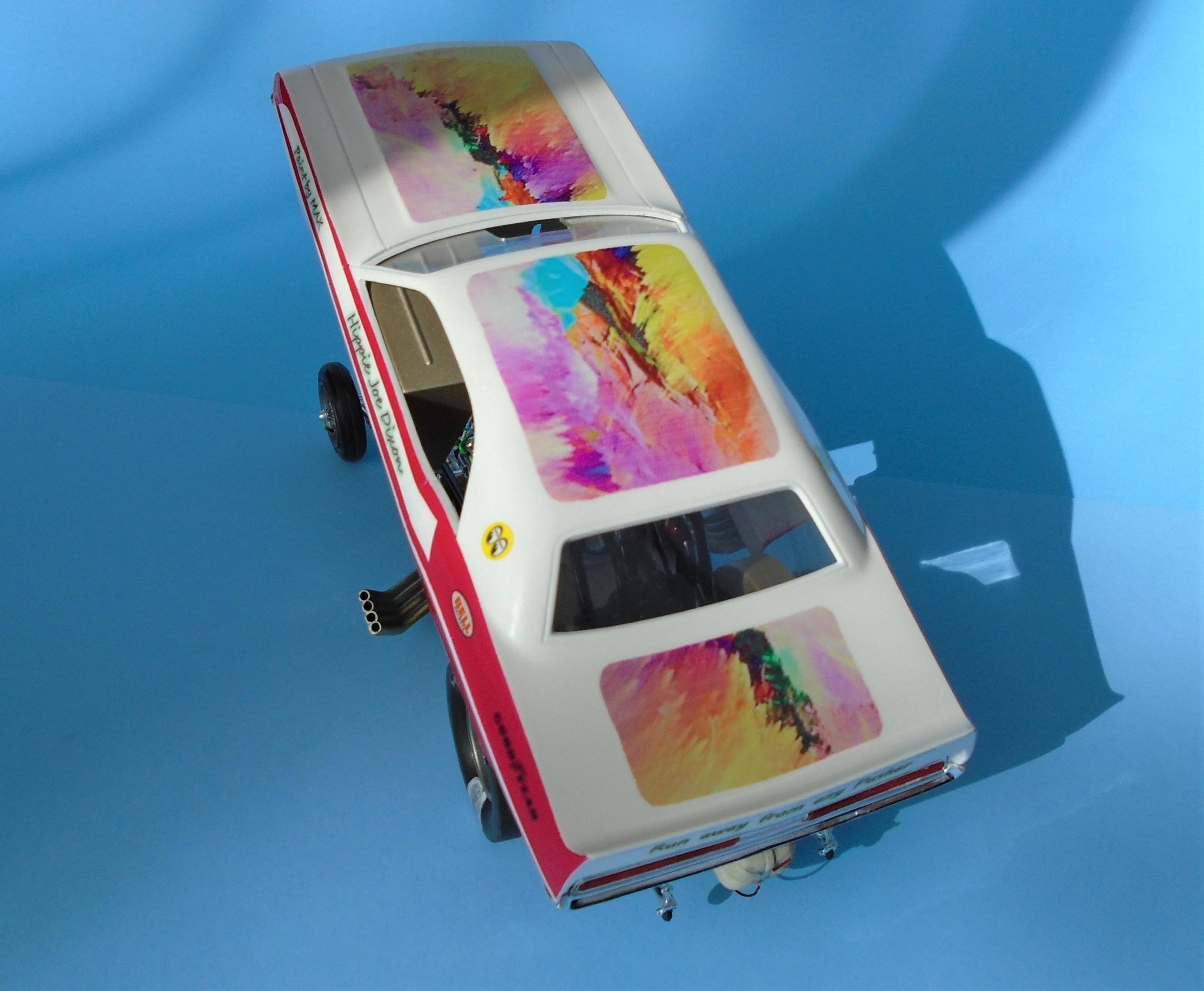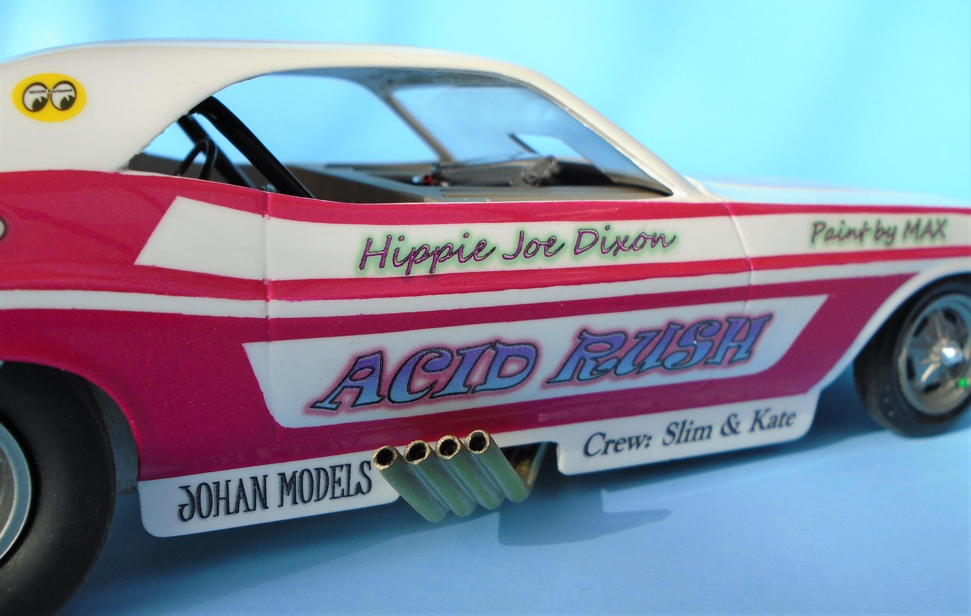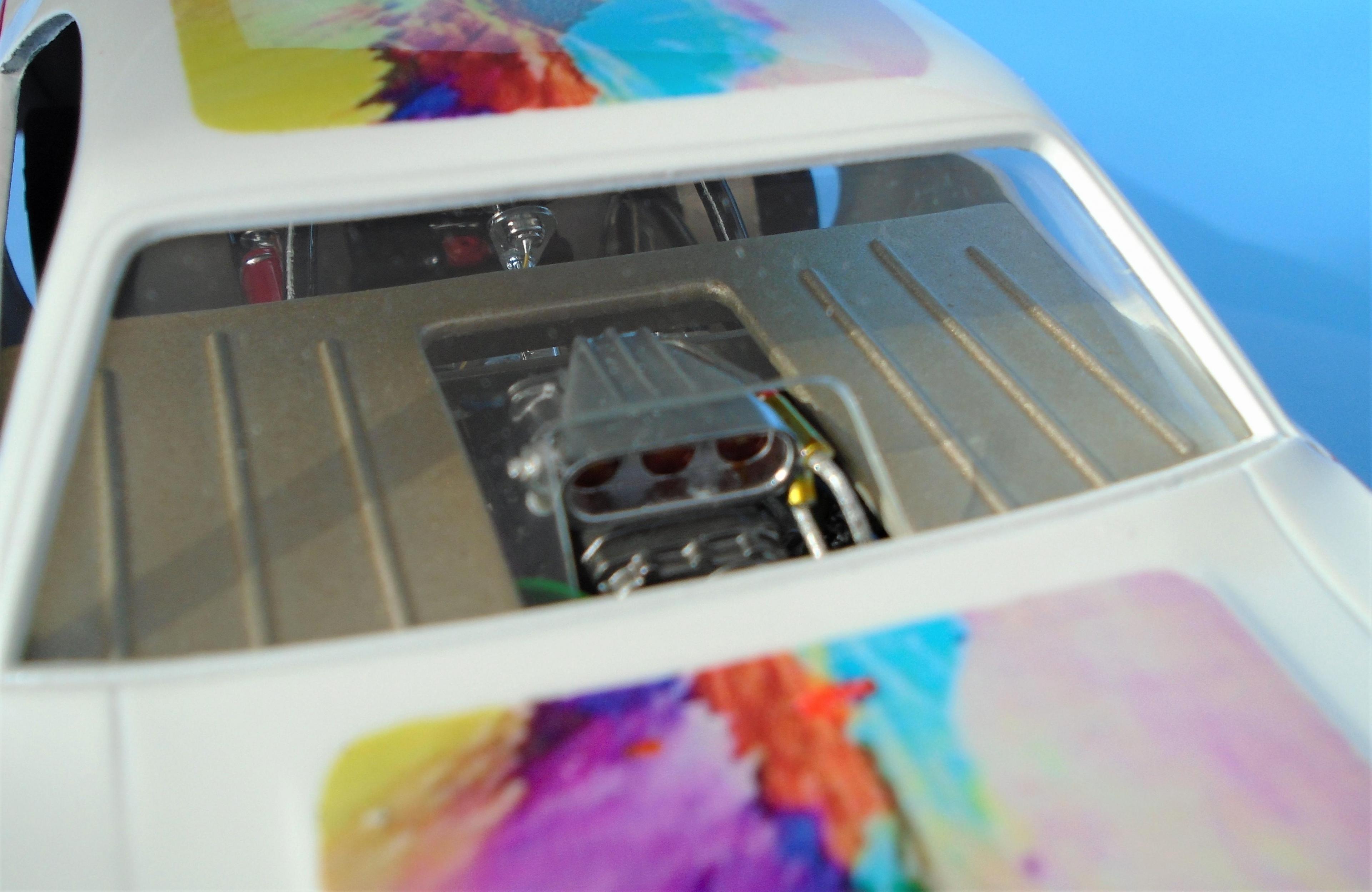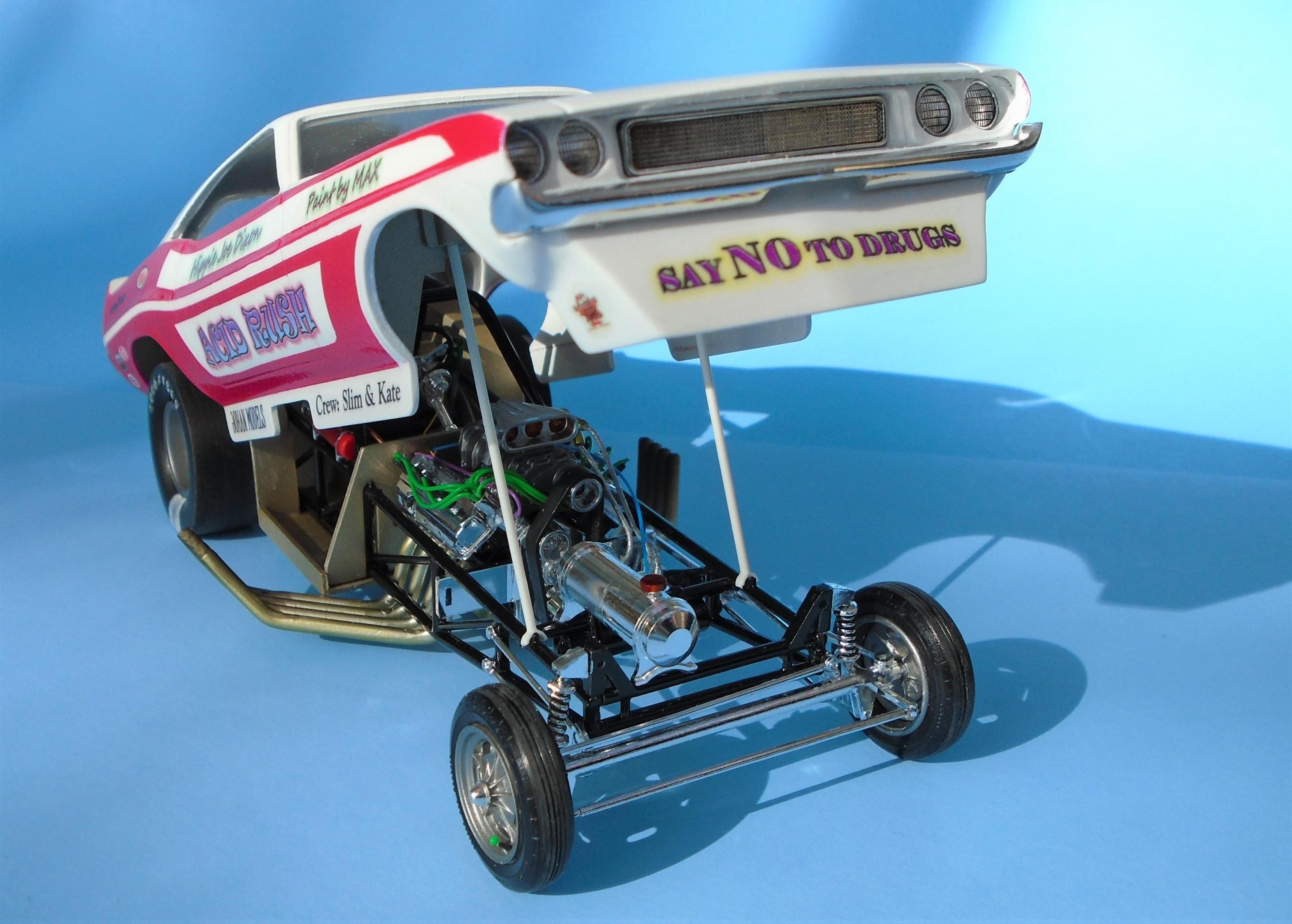 HI! I know... nostalgia exagerates the past. But to me. the 21st century funny-cars appearance pales in comparison to the era of more "similar" body styles, and creative colorfull liveries that bordered on art form, not vynil wrapped billboards. I also know that the sheer cost of running FCs leaves no choice to operators. But we can still celebrate the "groovy" era of the late 60s - early 70s, right? The Johan kit is a GREAT offering, even at 50+ years of age. Few glitches will slow you down. Tim Boyd comments favorably about the kit in his latest book, with reason. I found this one for 5$, because the seller was ashamed that the box, stored in his dirt-floor garage, was smelly because of mice dejections. One man's trash is... well you know this one! So: hosed, wired, detailed, painted Tamya's pure white with Testor's Hot Pink panels, and ficticious home-made decals added to recreate the era's vibe. The hood-top-trunk abstract artwork was a painting I found on the web, dowloaded, processed and trinted on clear decal sheet. Testor's Wetlook clear copiously soaks the whole thing. The frame is Testor's black enamel, and a variety of Alclad shades were used for the engine and accessories, They say that "if you remember the 60s, it means you weren't there", but I beg to differ. Long live nostalgia funny cars, even the ficticious ones! CT
