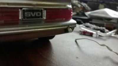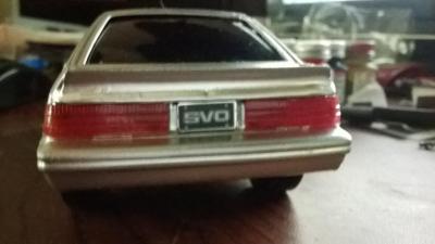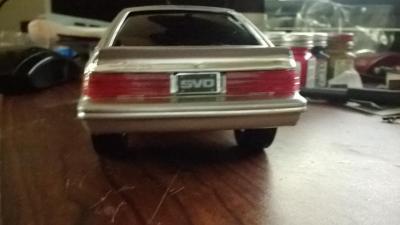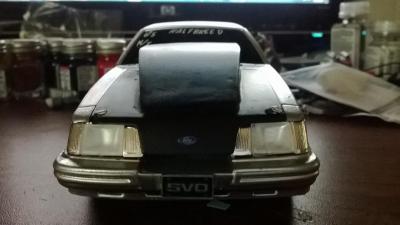 85 Grudge Mustang. Made the custom front bumper most fox-body's have, Used my other 85 mustang cowl hood for the mock-up. Front rims aren't the ones I'm going to use. The fronts will be the same as the rears, Header exit holes done going to prim the body up in a few then make a set of headers. Filed down the orginal wing modled in the body, so the wing will look right. Love the stance on this car lol