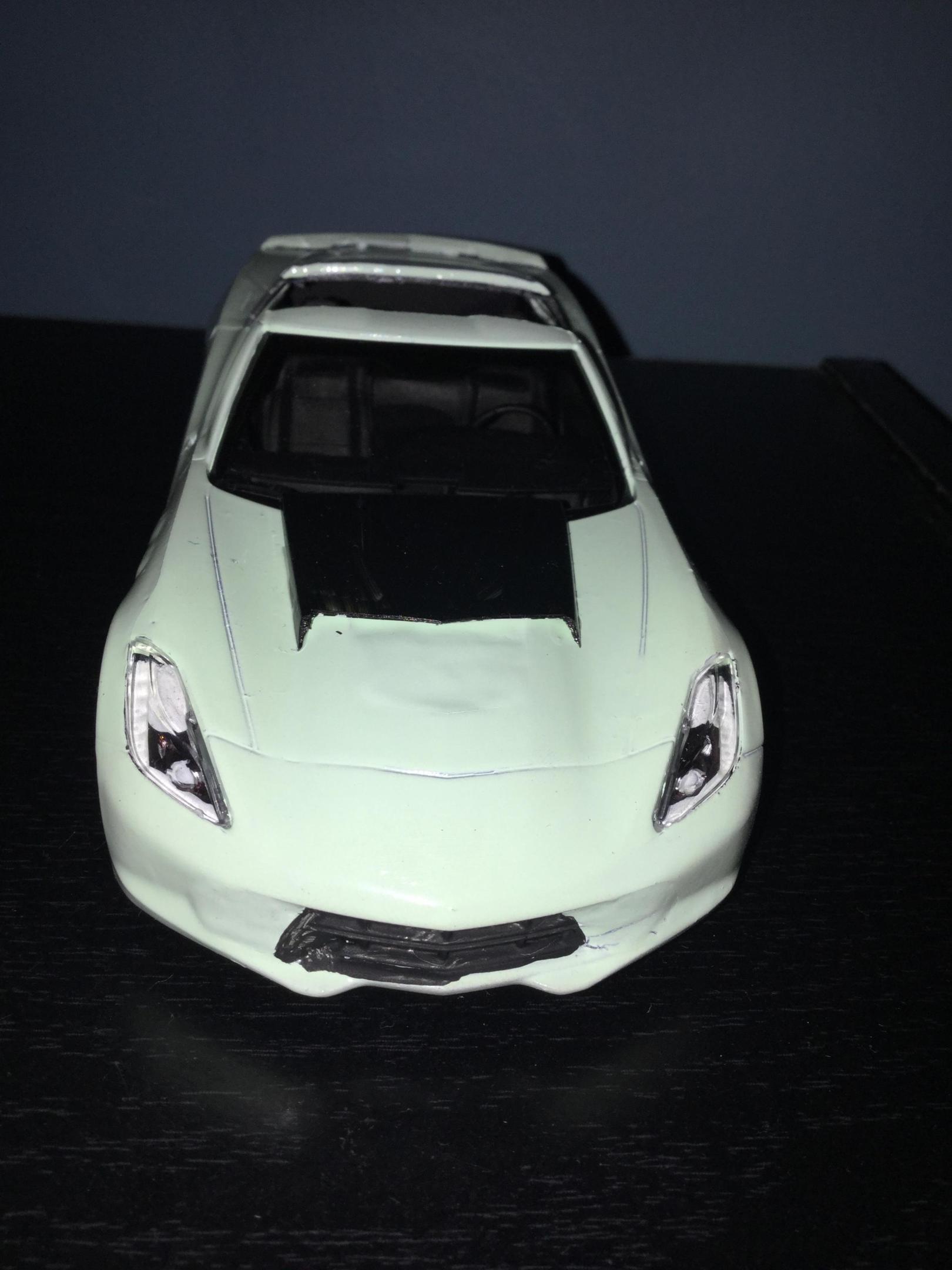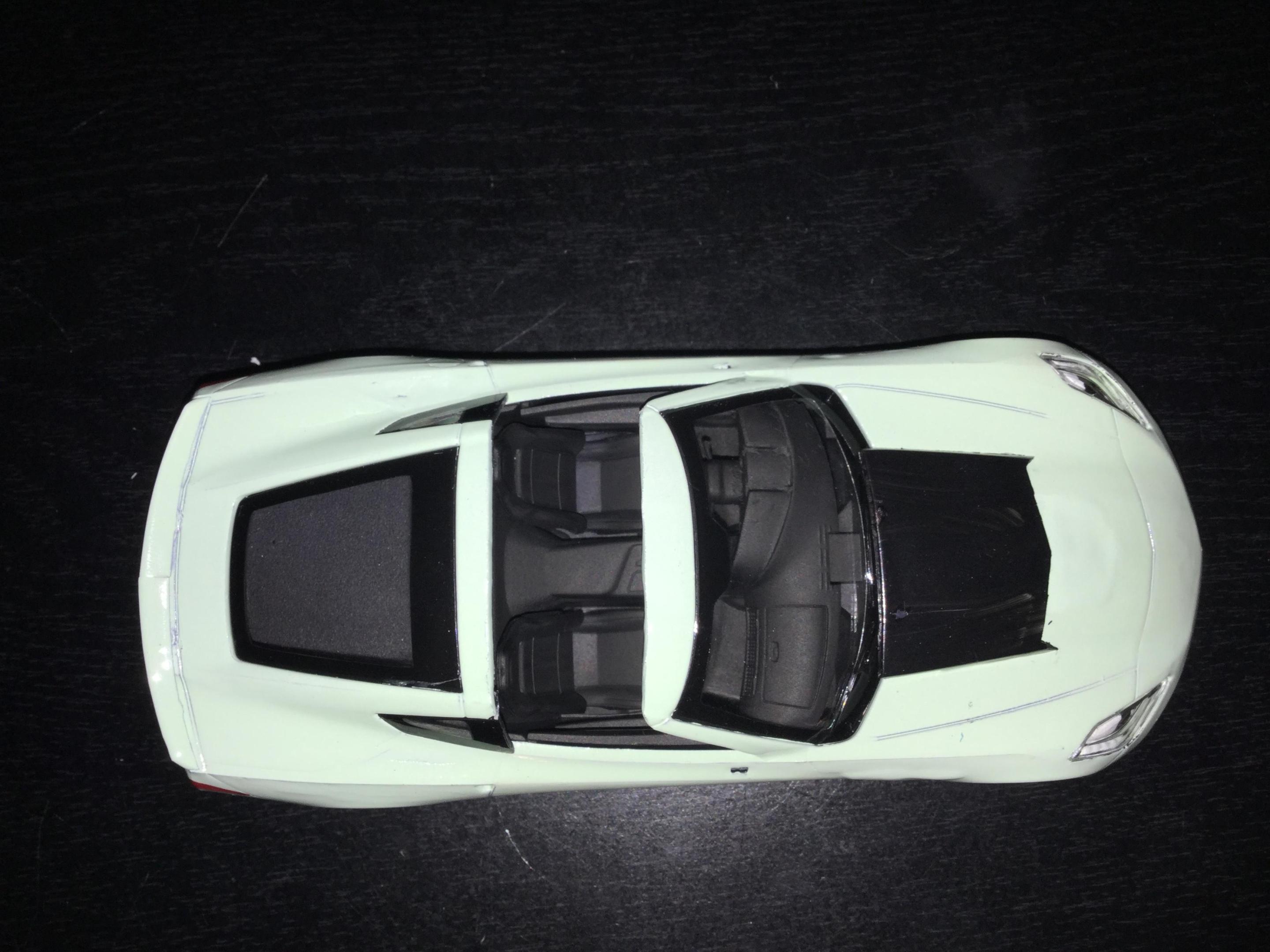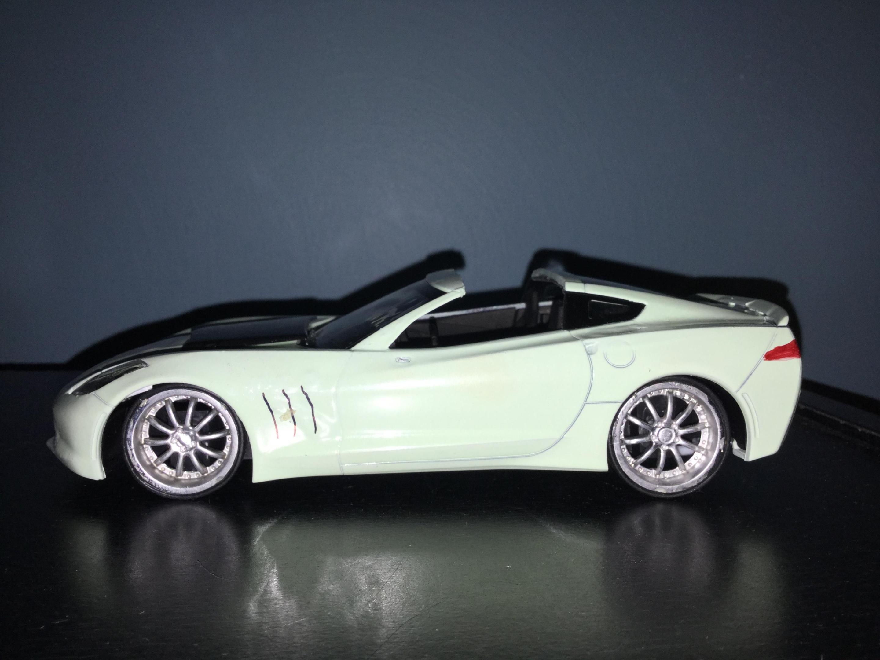1/25 scale model of the invetero coquette from gta 5 I used a Revell of Germany easy click system 2014 corvette stingray kit and swapped out the dash and rims and tires with ones from my parts boxes i also used putty to modify the body to match the coquette from gta 5 I cut a section of the roof away to make it the targa roof option from the game and added a hood scoop from my parts boxes to match the option from the game