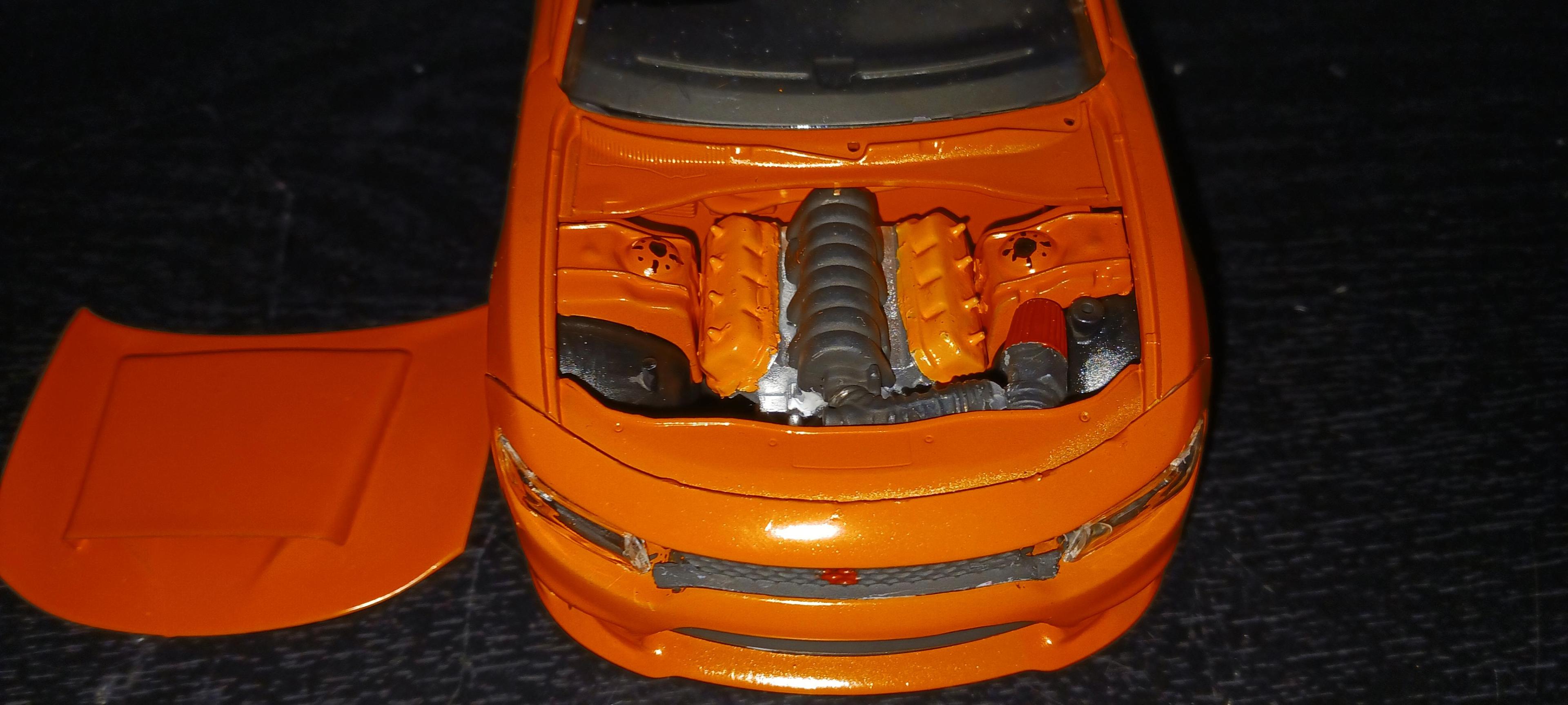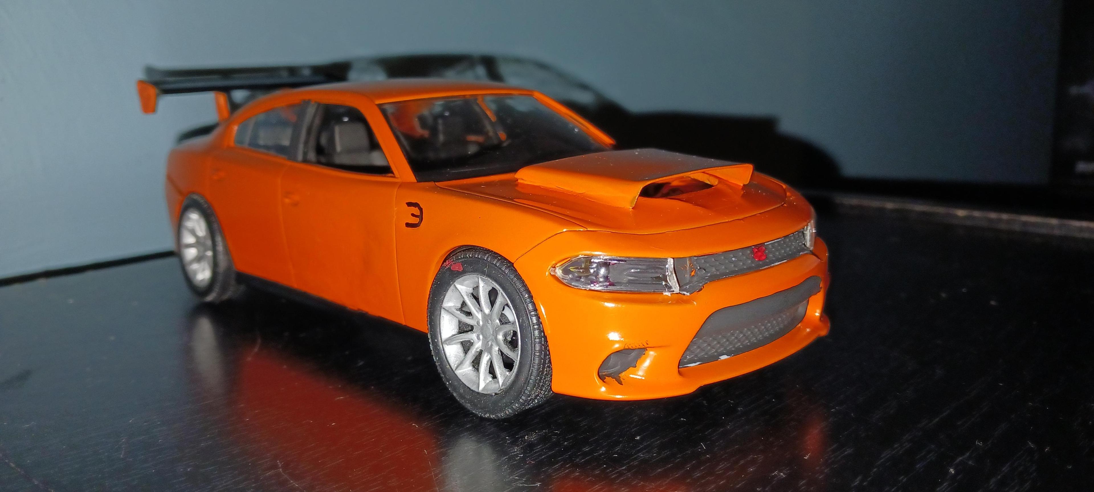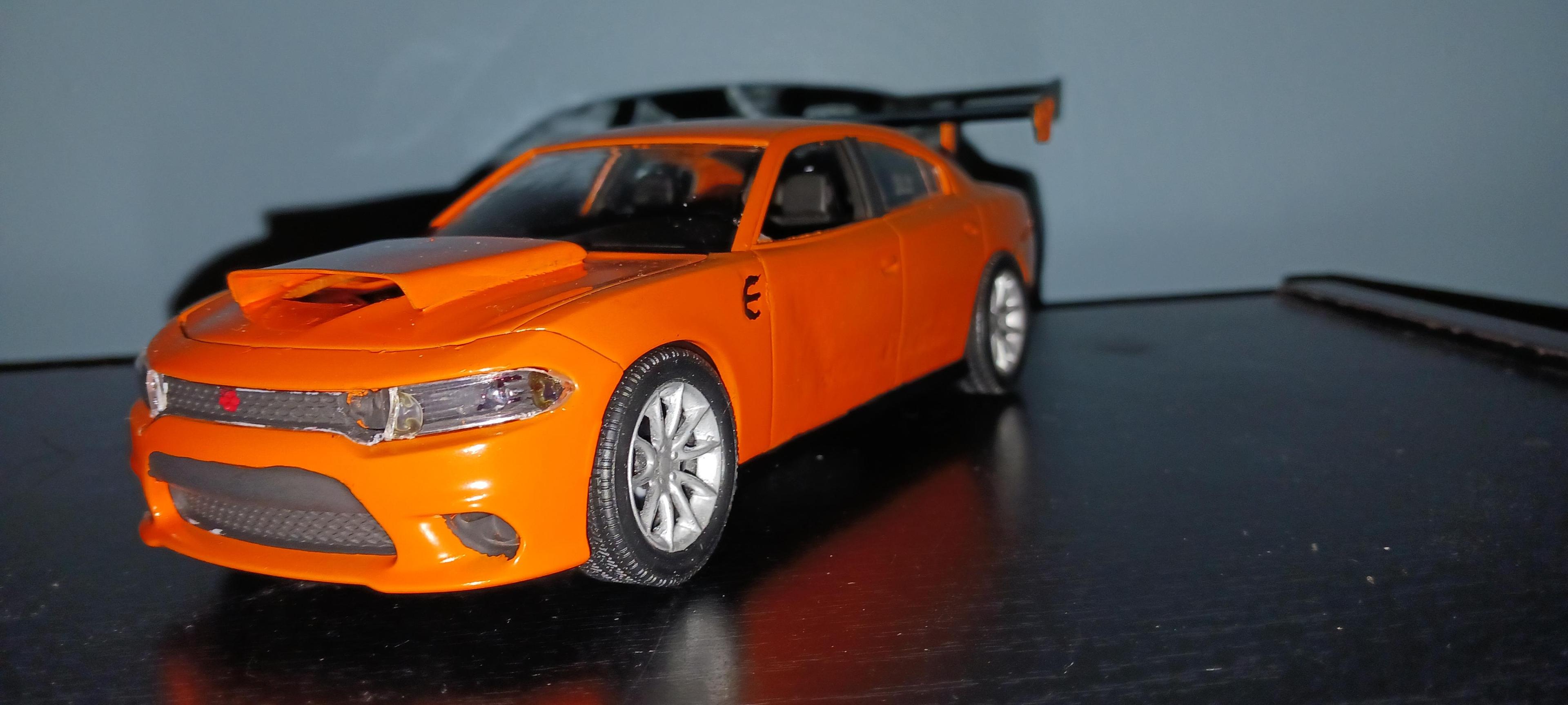 I made the gta online car using the new amt 2021 dodge charger r/t kit and rims and tires hood scoop and turner wing and engine parts from my parts boxes and a set of exhaust from a amt 2009 dodge challenger r/t kit I modified the body and dash and grille to match the changes gta designers made to the 2015-2023 charger to make this version of the bravado Buffalo