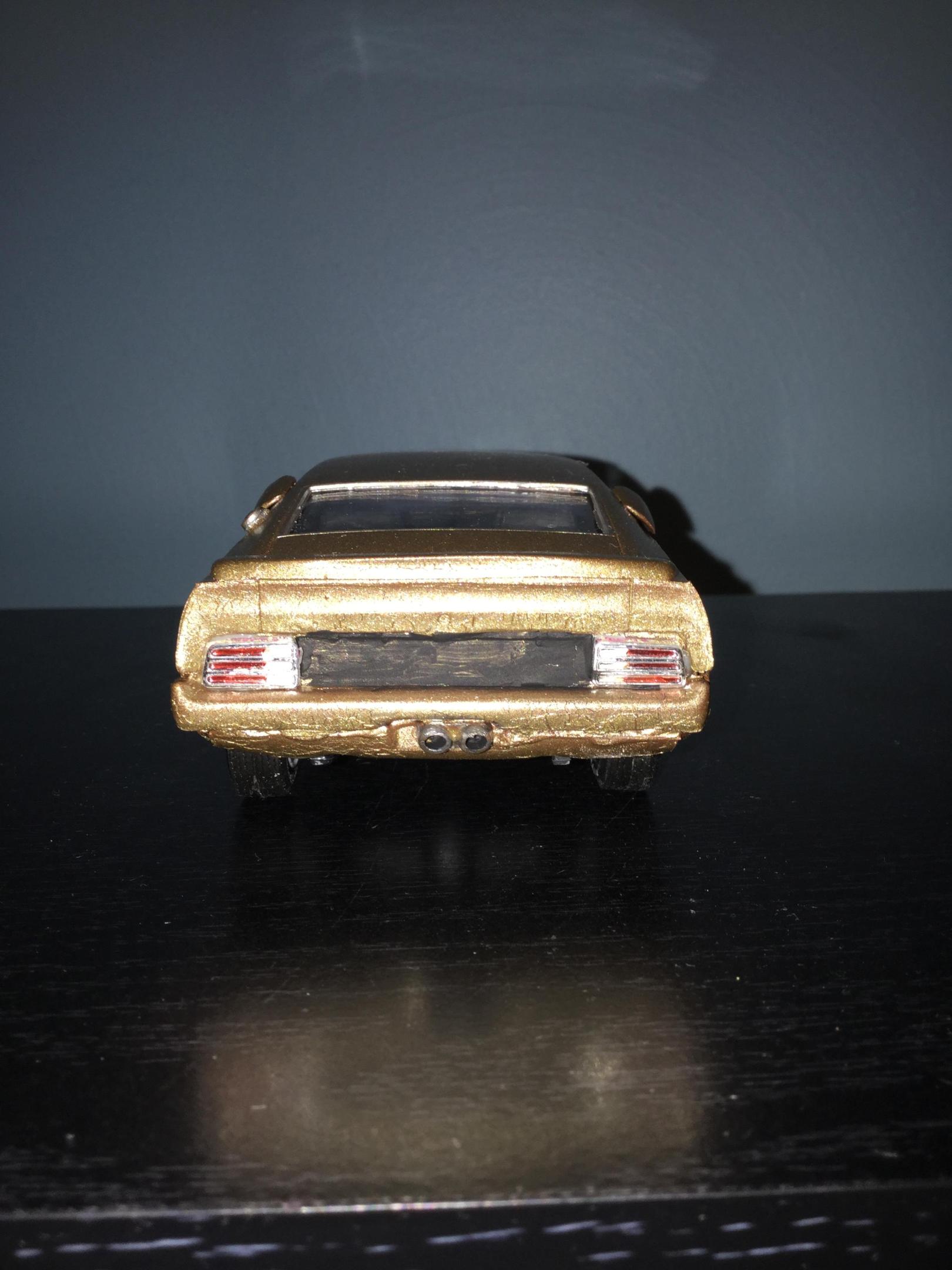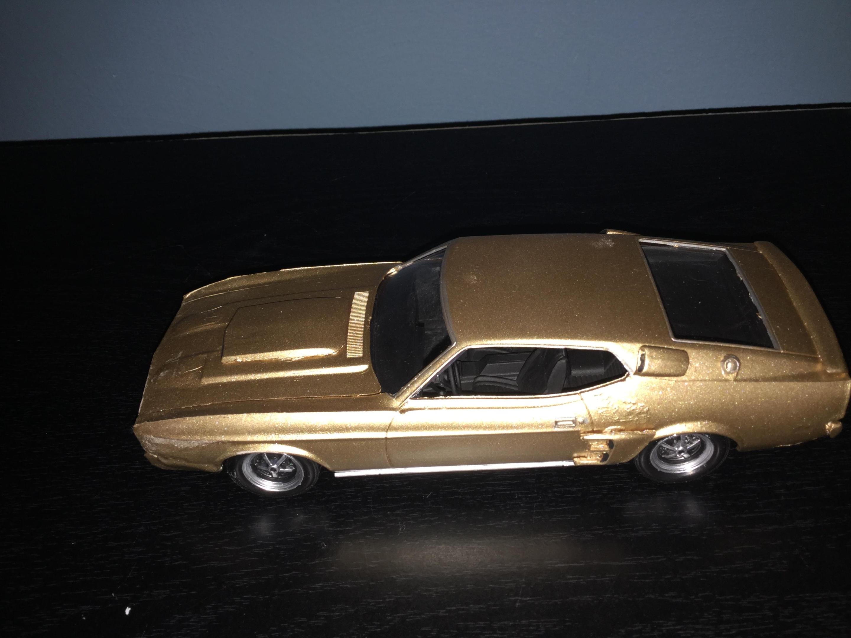 1/25 scale kitbashed model of a vapid ellie from gta online I made with an amt 71 mustang Mach 1 and a lower air dam from a Revell Shelby gt-350R and a set of revell 70 cuda taillights and a dash and rims and hood scoop and exhaust tips and rocker panels from my parts boxes I also uses putty for some body mods and I cut a set of side body vents from an amt 67 mustang gt body I had in my parts boxes