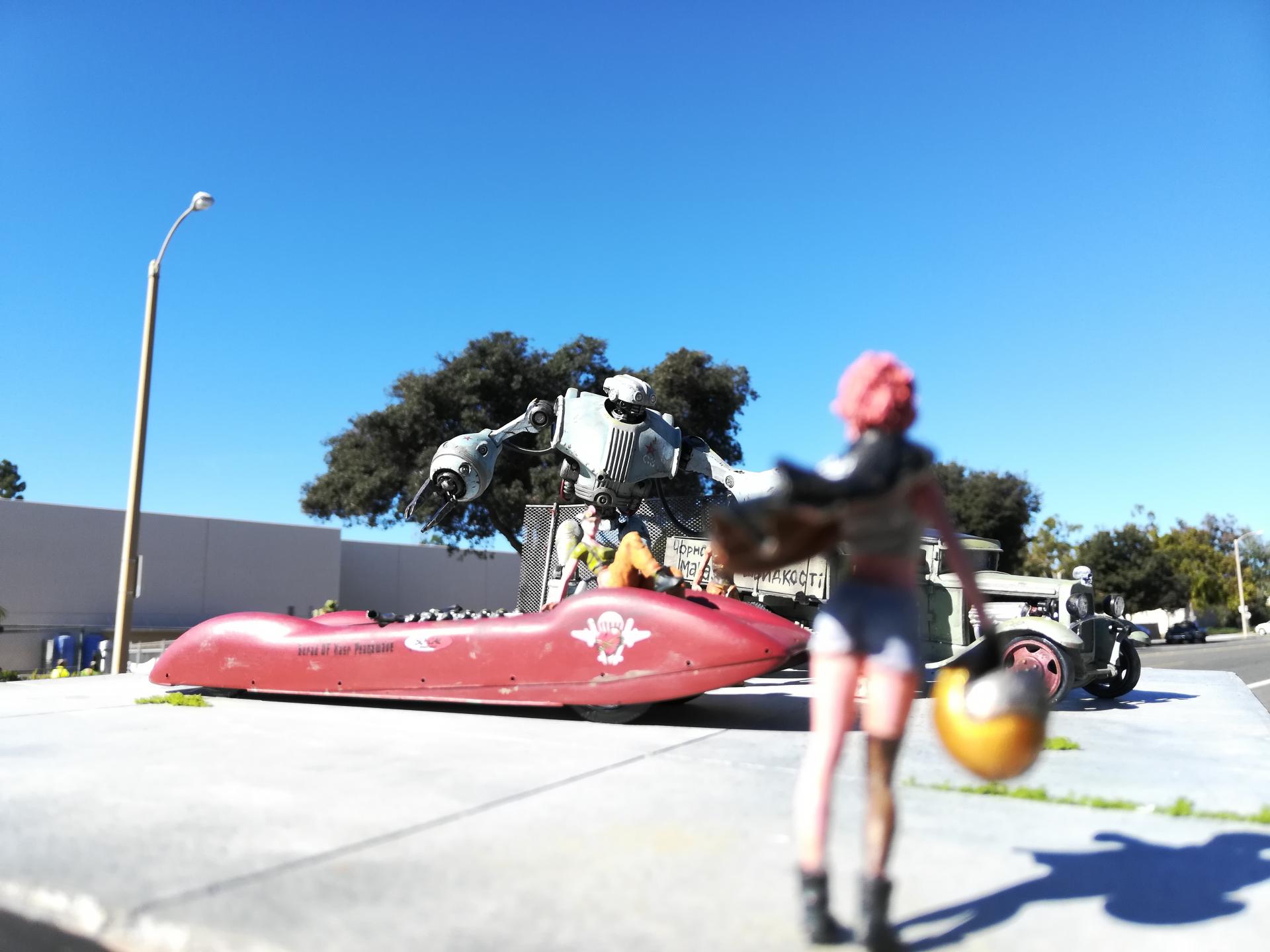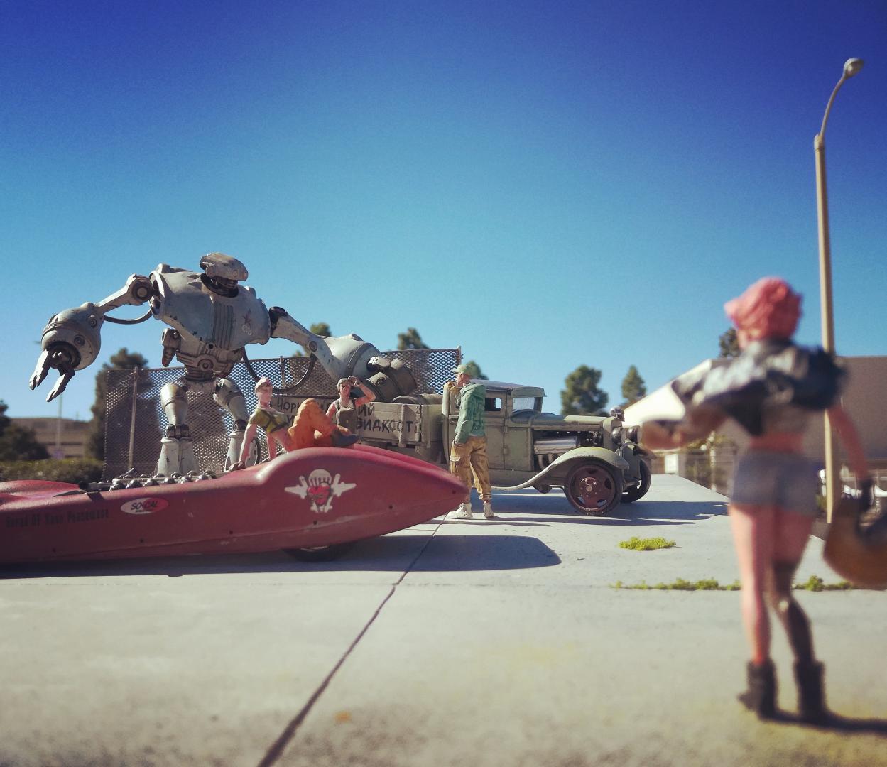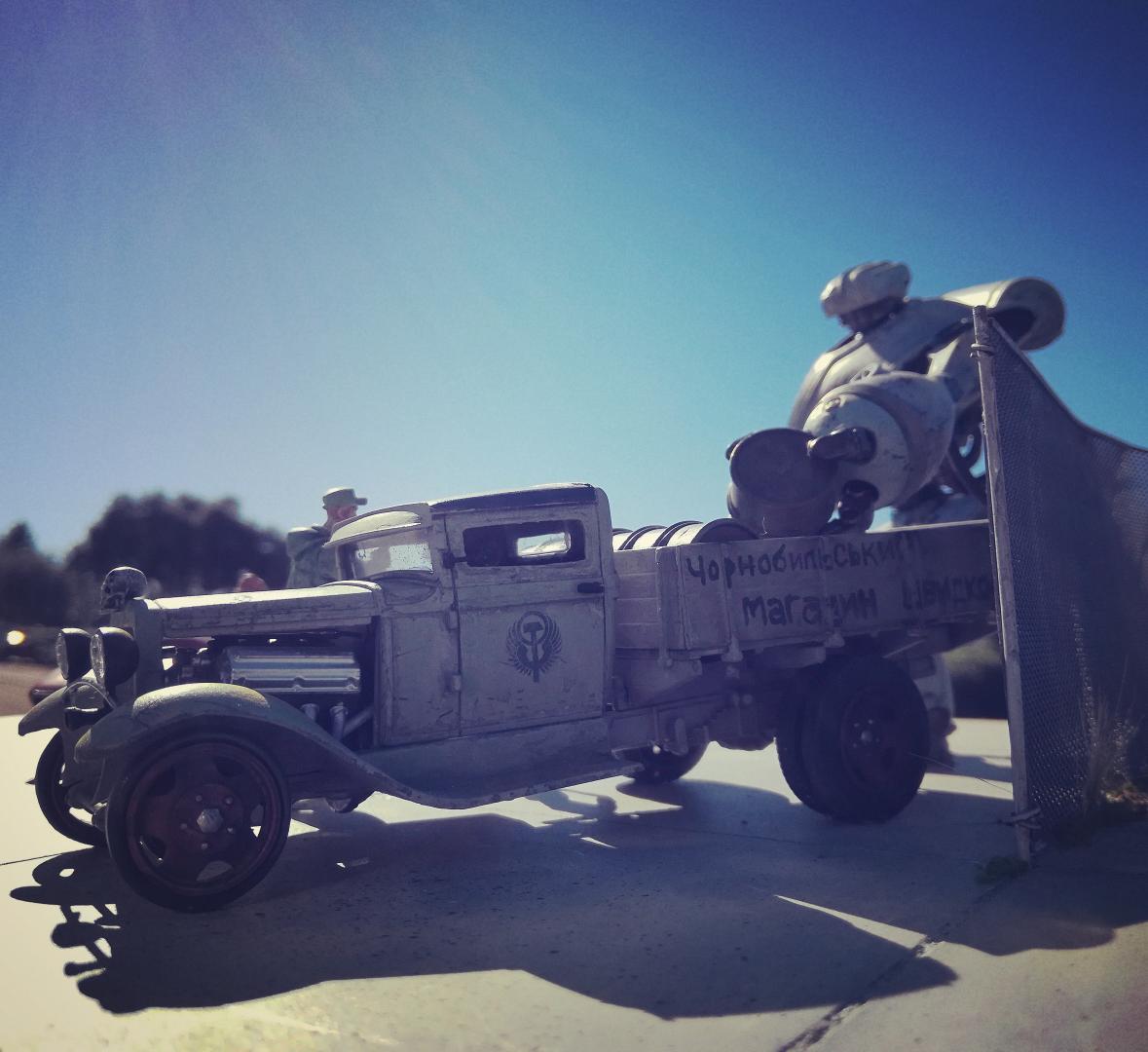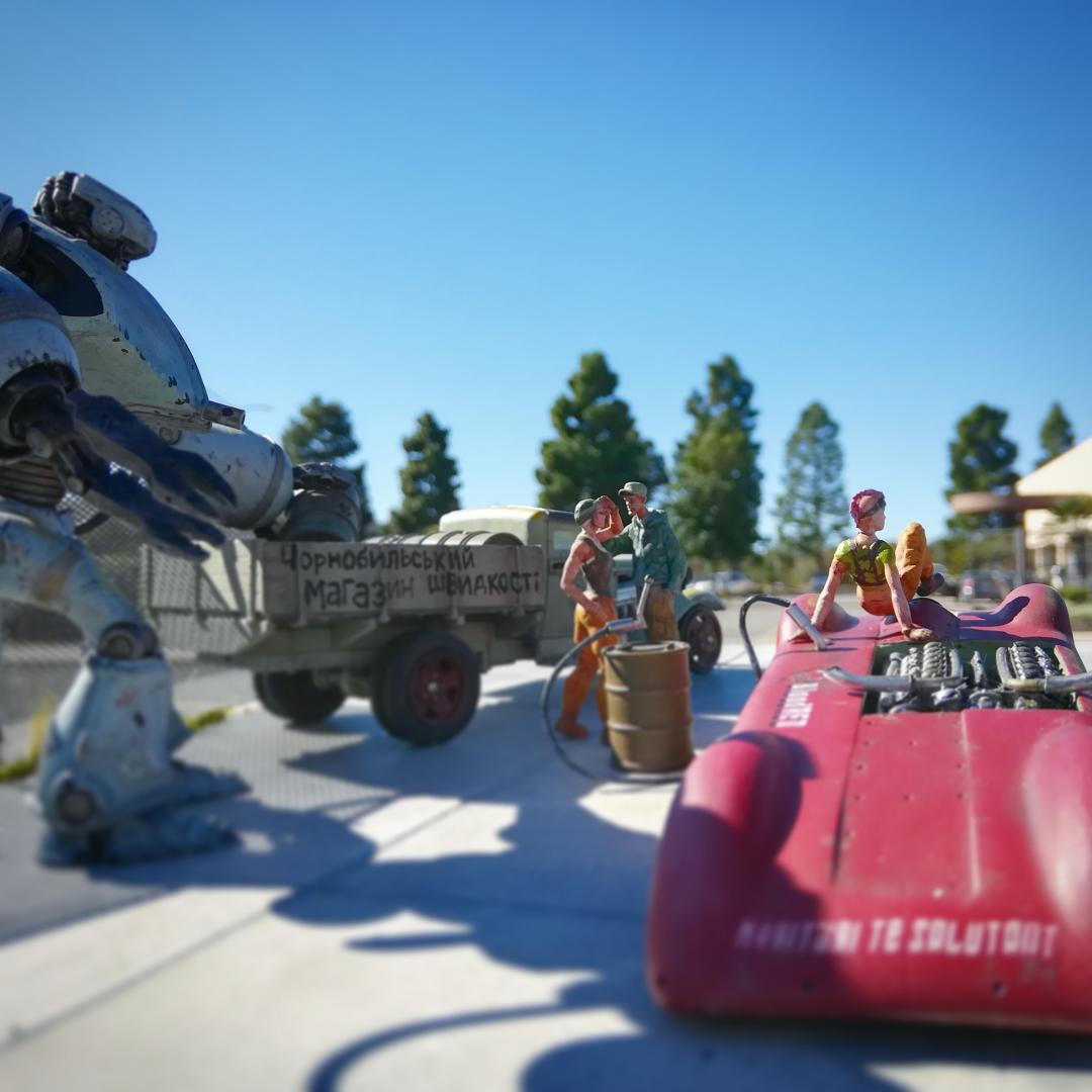 Just finished up my Chornobyl Speed Shop diorama, which takes place in an alternative universe's Ukraine where robot labor was a thing during the Cold War. The car kits are a Toko Models GAZ-AA truck in 1:35, while the land speed racer is based on an old rubber band powered Hawk kit, which I narrowed, built a full bellypan and cockpit for, and stuffed full with a Tatra V12 tank engine. Figures are from Imaquinaria, Industria Mechanika, and Blacksmith Miniatures. The robot is STAN, from Futuristic Models. The base was plaster of paris that I carved the lines into after it had set up, painted, and then added weeds and fencing.