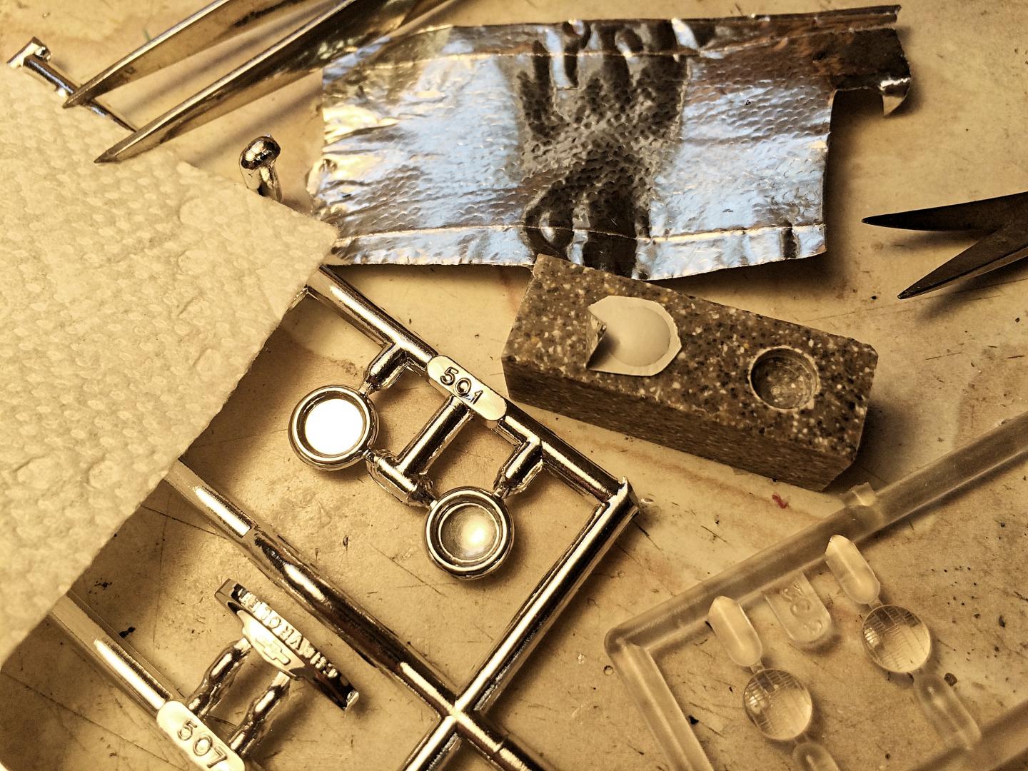 Pet peeve of mine, why couldn't they make the back of the headlight concave, like the real thing? This is AMT's '50 Chevy pickup, nice kit, but the flat headlight reflector is almost as lame as molded on chrome headlights. This technique could work for those lenses with the locating pin too, after sanding off the pin (Revell 240Z for example). 1. Remove the center of the bezel. In this case, used the Dremel; you could drill a small hole and ream out with a blade. I kept the bezel on the tree for easier handling. 2. I used a round file to work to the bezel, leaving what I hope is enough ledge for the lens. I also removed the remaining back locating "pin", making the edge thin as possible. 3. I scavenge things like thick shiny foil, this may have come from Christmas decorations. Wine bottle foil could work, not the stuff with plastic on it, but real foil on more expensive wine, and that needs to be polished first. Reynolds foil is too thin. 4. I used the drill press to make a hole the same size as the bezel, in a scrap piece of Corian. I'm not thrilled with the rough edge, but it will not be seen. I think using wood would be worse. 5. I put a paper towel over the foil, then pressed down with a finger and rotated back and forth. Go just enough to create the dish, too much and foil will crease or rip. 6. Cut with scissors, very carefully to not bend the rim. I left about a 30° tab, and folded so I could use to position using tweezers. 7. Good idea to paint silver first, on the cut bezel edge. 8. I dabbed tiny drops of superglue at 4 spots, 2 would be bare minimum. Then I placed the foil and made sure it was centered. After a couple of minutes, I applied more glue so it would capillary around about half that is opposite the tab. After that was set, cut off the tab with the knife, then finished gluing. 9. I plan to use JB Weld on the back after getting the second one done, so I won't accidentally dent the foil. 10. I expect to taper the hole on the fender so they sit flush. Just a little trick I've developed, hope this helps!