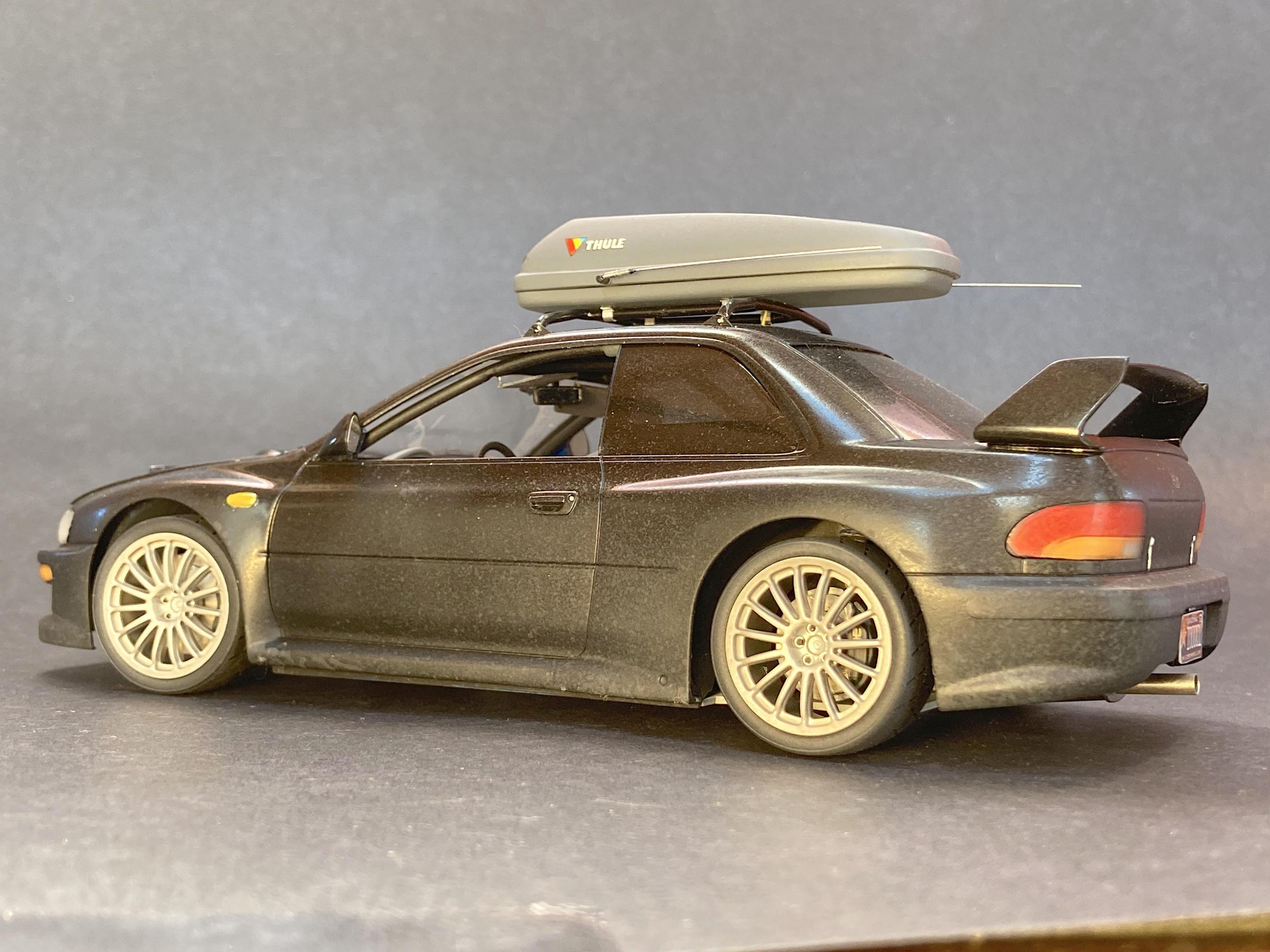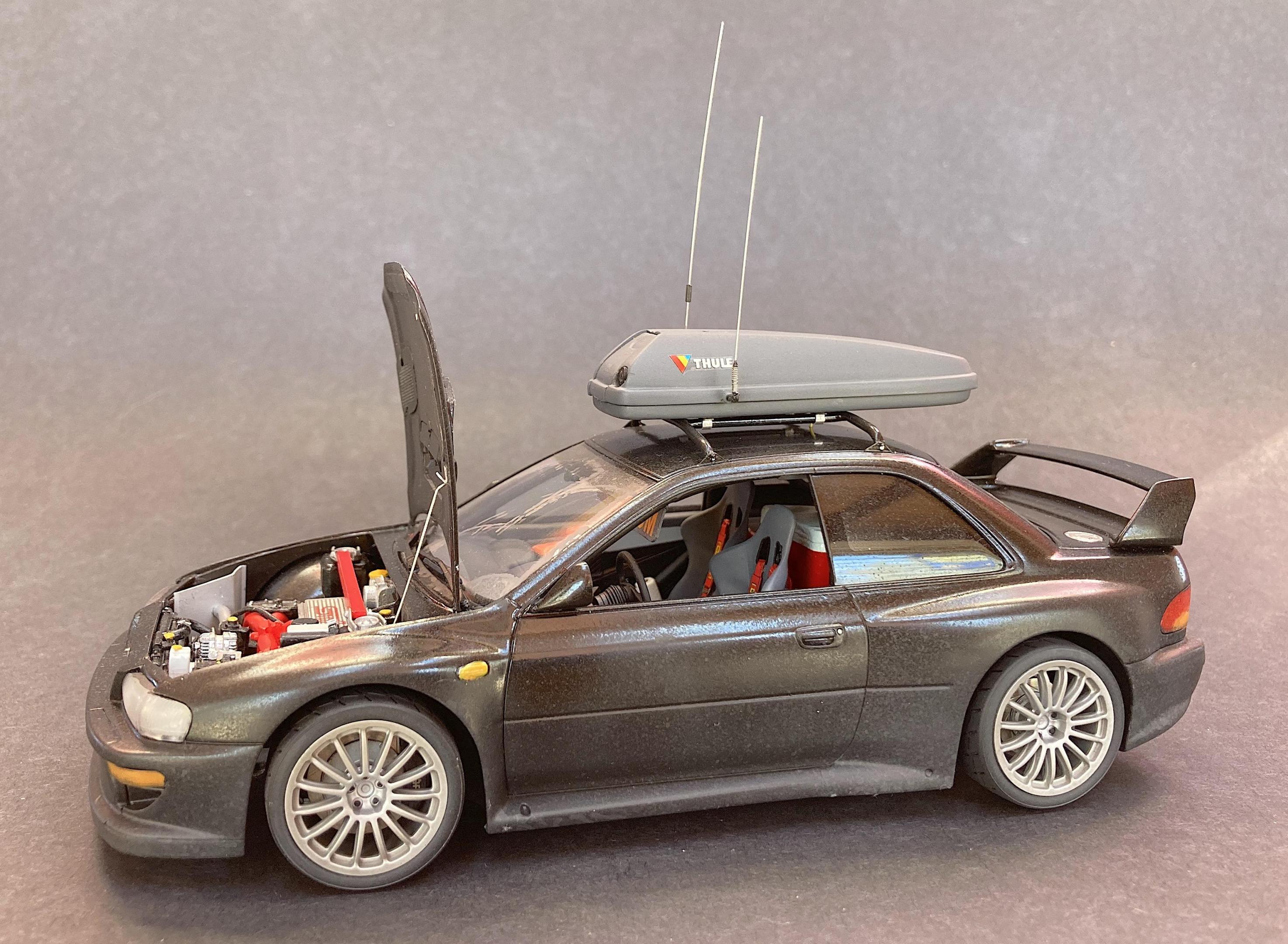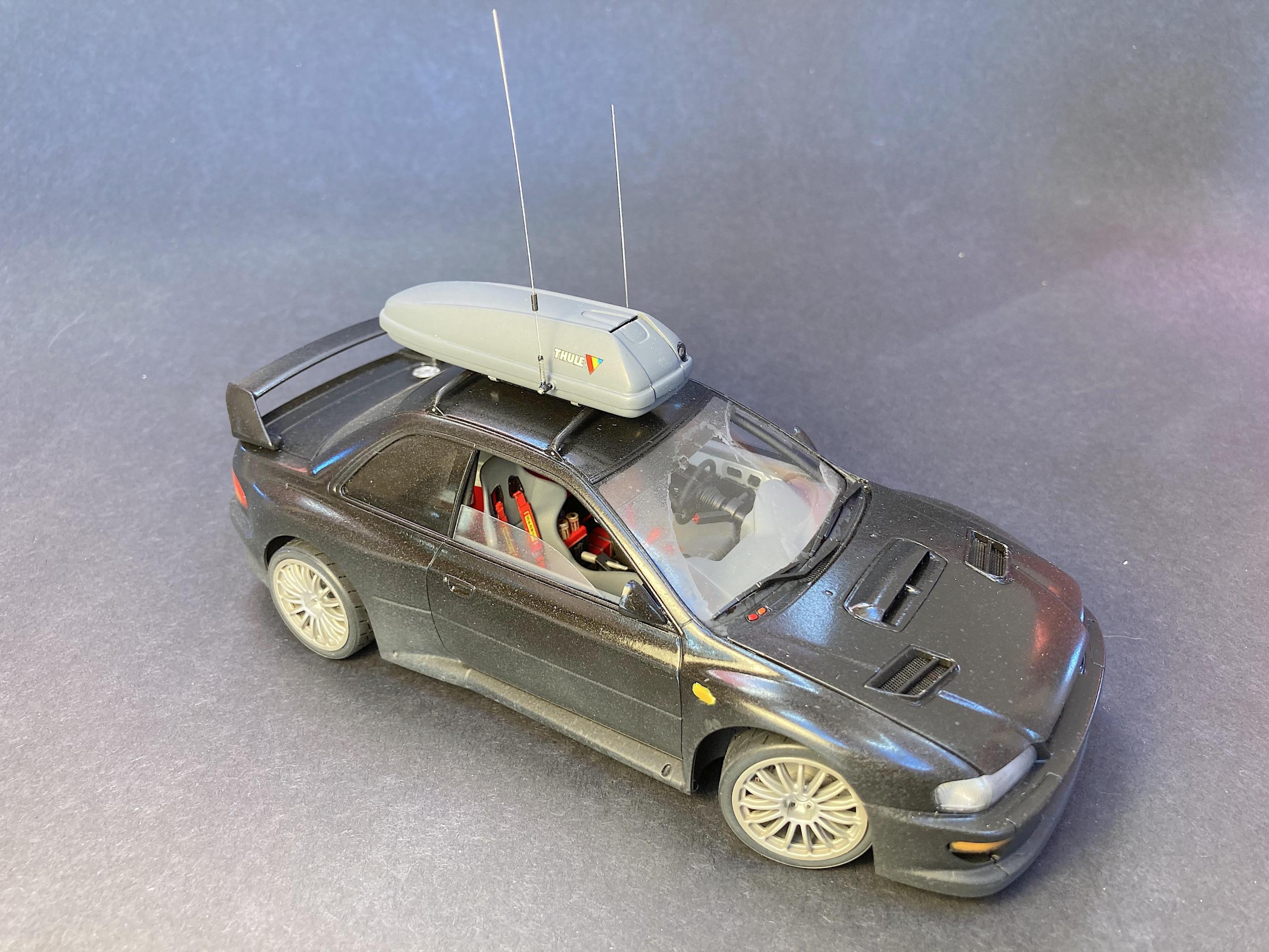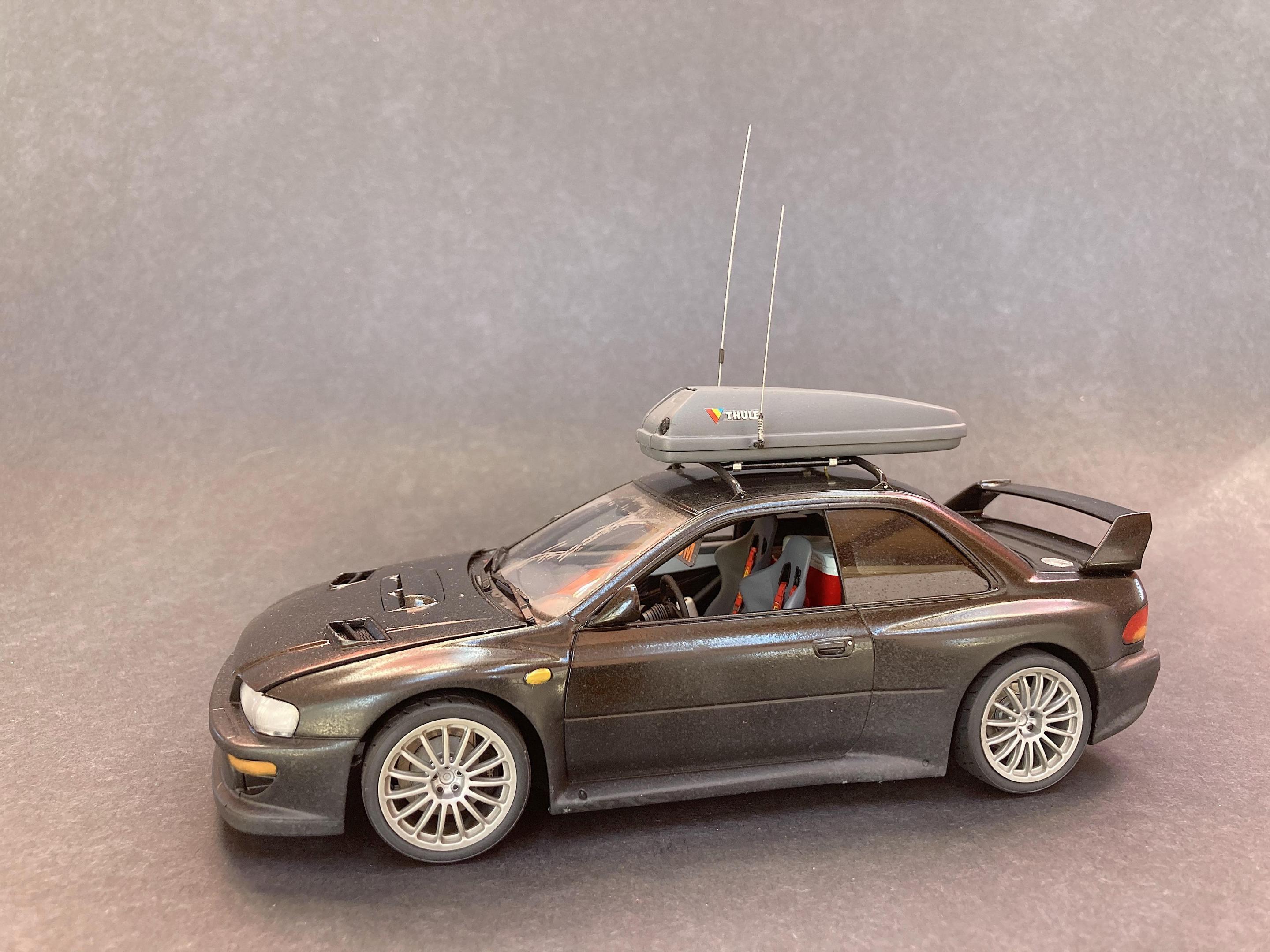 Built for the The '21 Cannonball Ruse community build. WIP: Tamiya Subaru Impreza (not WRC but Cannonball Ruse) with Hobby Design engine I always wanted to build this Tamiya Subaru Impreza as a private citizen road car, got the Hobby Design EJ20 engine kit a long time ago for this project. The Tamiya kit is typical awesome. The engine needed some modifications to fit. The Thule cargo box is from the Fujimi set that also has the bicycle, it was shortened and turned around, and has one rally light and a lens scavenged from a real camera. Interior has an Igloo cooler, a bunch of Monster drink cans, CB and scanner radio, camera screen, and sun visors. Built in a month, 125 hours. My intent was to not make a show car, but could be a cheap repaint of a retired rally car.
