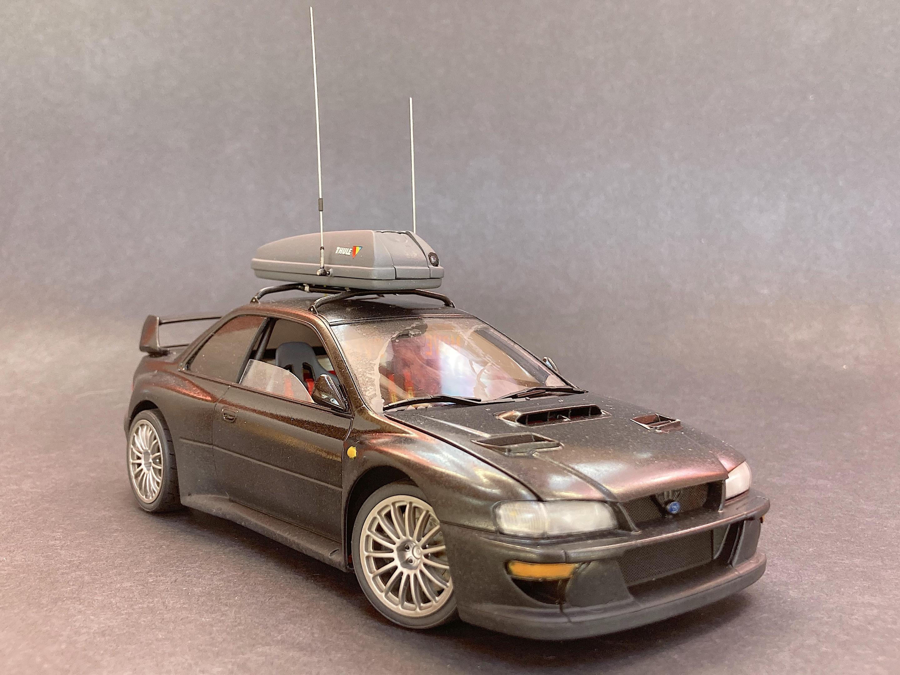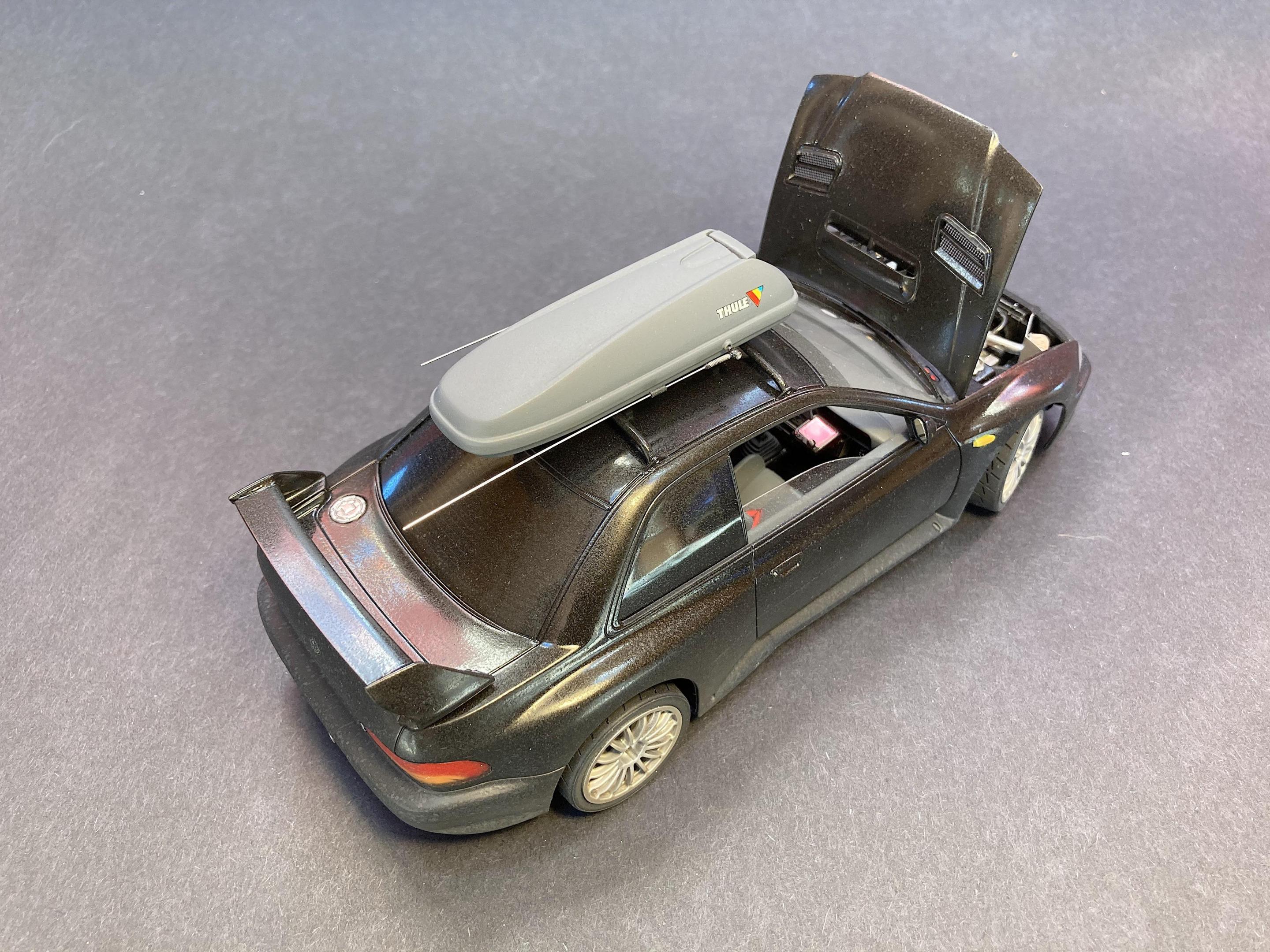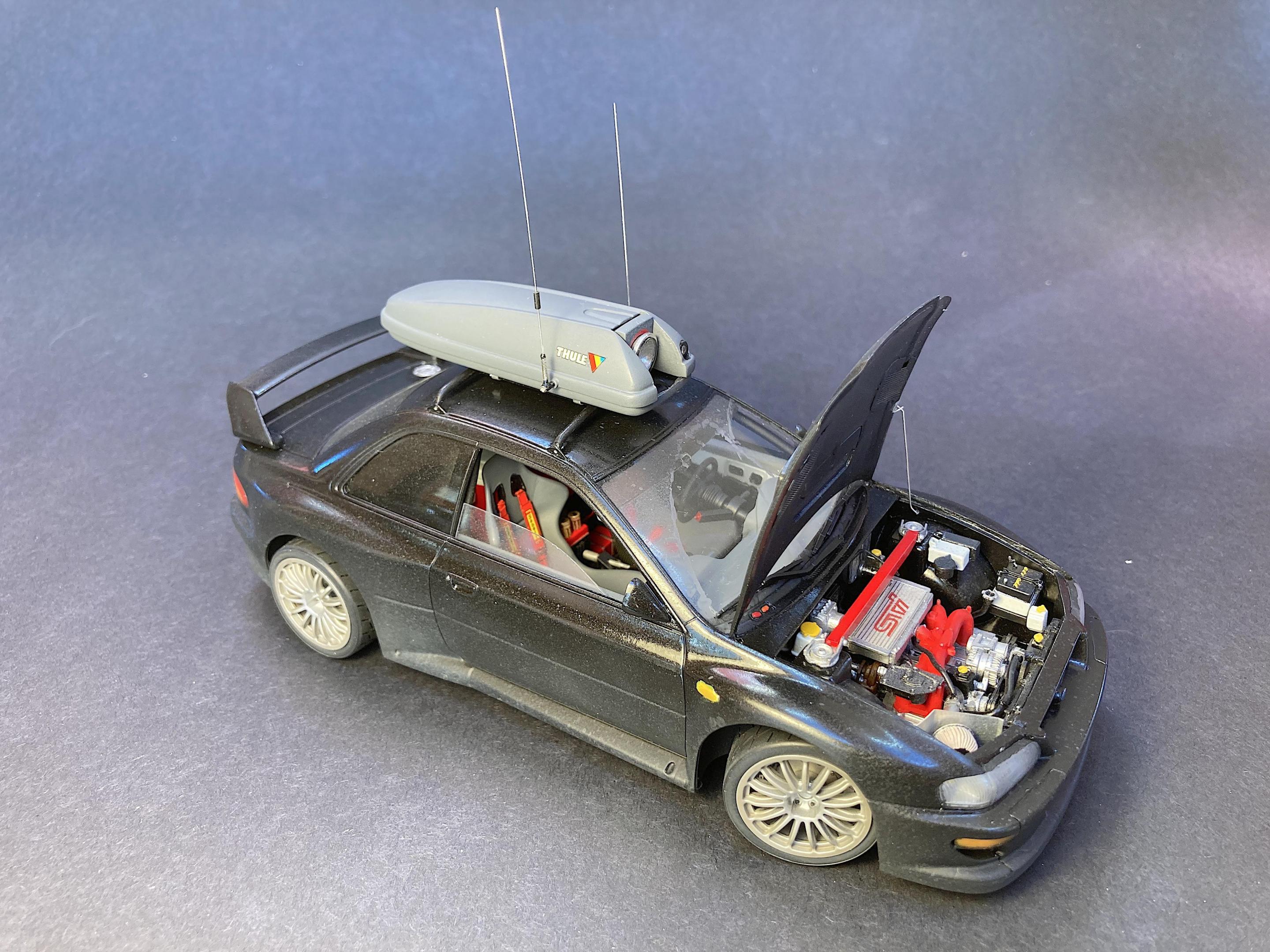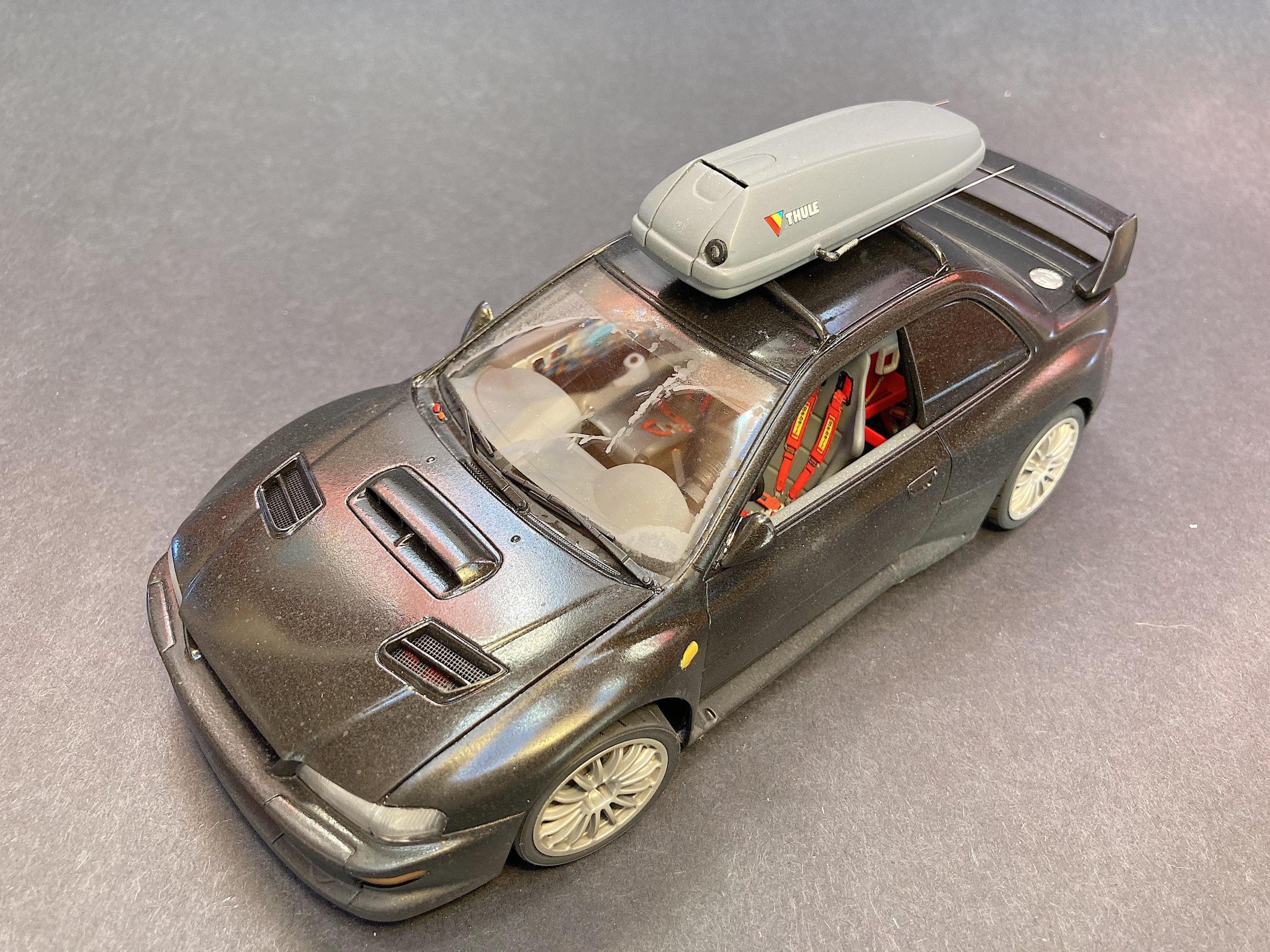 Built for the The '21 Cannonball Ruse community build. WIP: Tamiya Subaru Impreza (not WRC but Cannonball Ruse) with Hobby Design engine I always wanted to build this Tamiya Subaru Impreza as a private citizen road car, got the Hobby Design EJ20 engine kit a long time ago for this project. The Tamiya kit is typical awesome. The engine needed some modifications to fit. The Thule cargo box is from the Fujimi set that also has the bicycle, it was shortened and turned around, and has one rally light and a lens scavenged from a real camera. Interior has an Igloo cooler, a bunch of Monster drink cans, CB and scanner radio, camera screen, and sun visors. Built in a month, 125 hours. My intent was to not make a show car, but could be a cheap repaint of a retired rally car.
