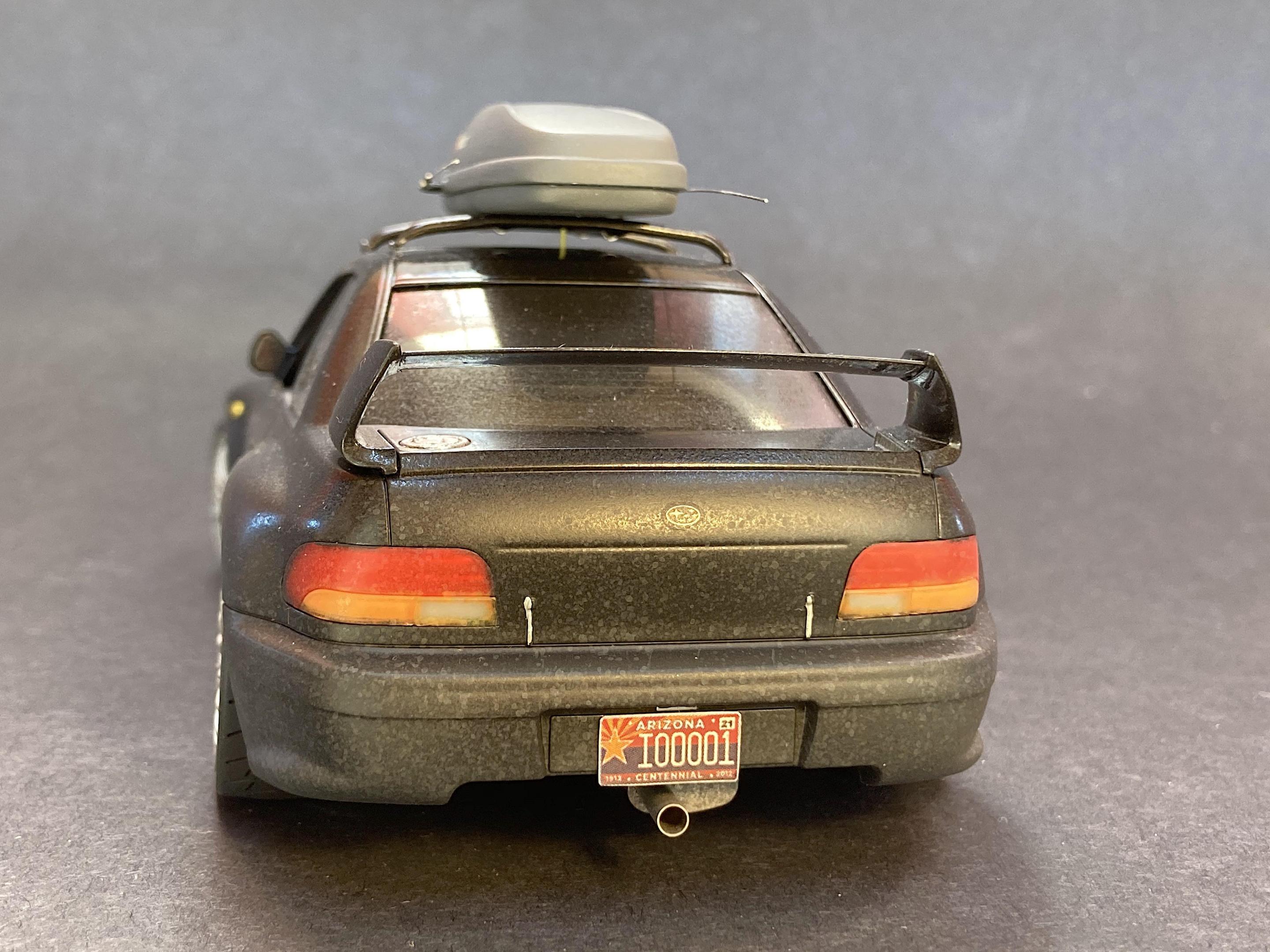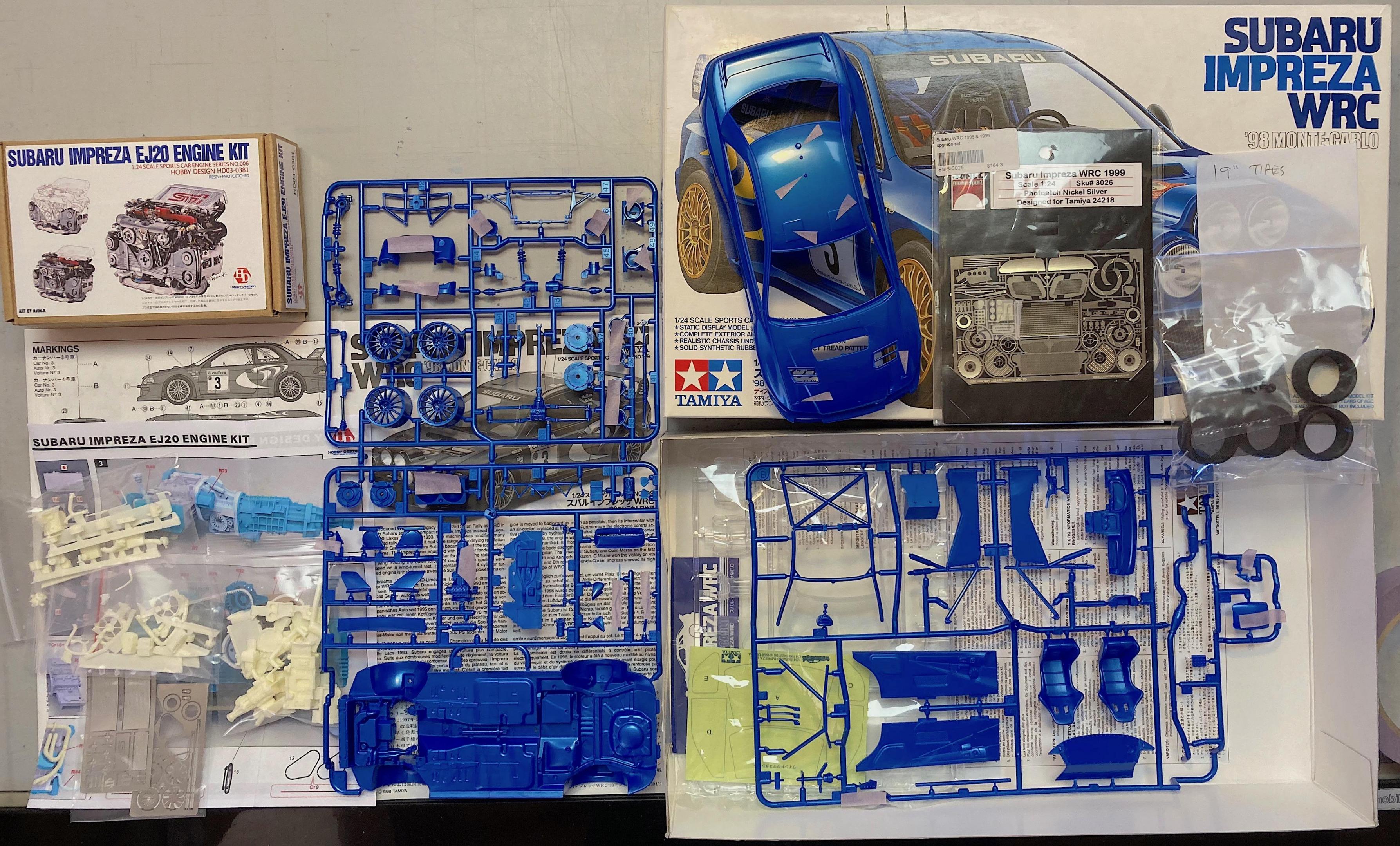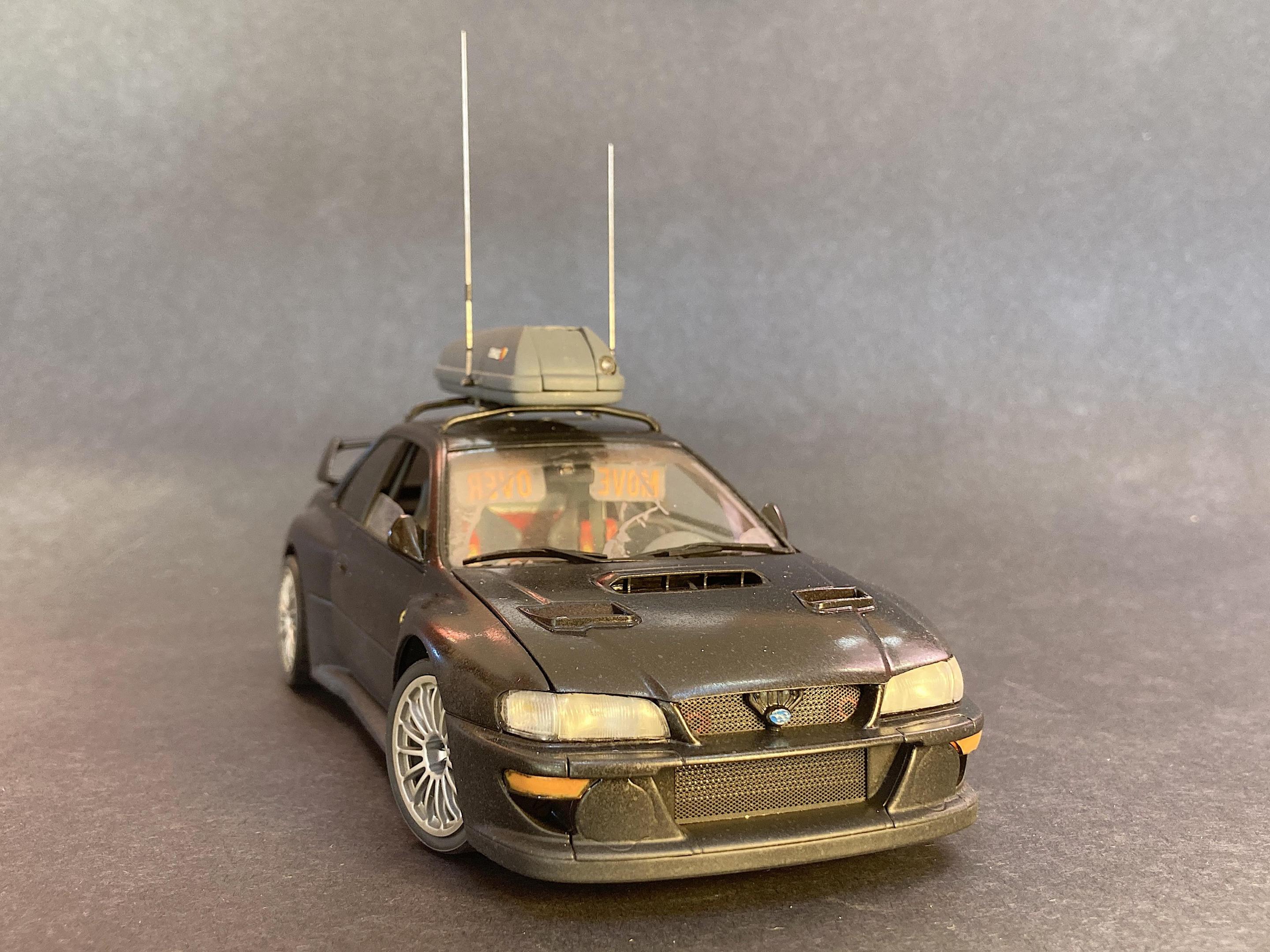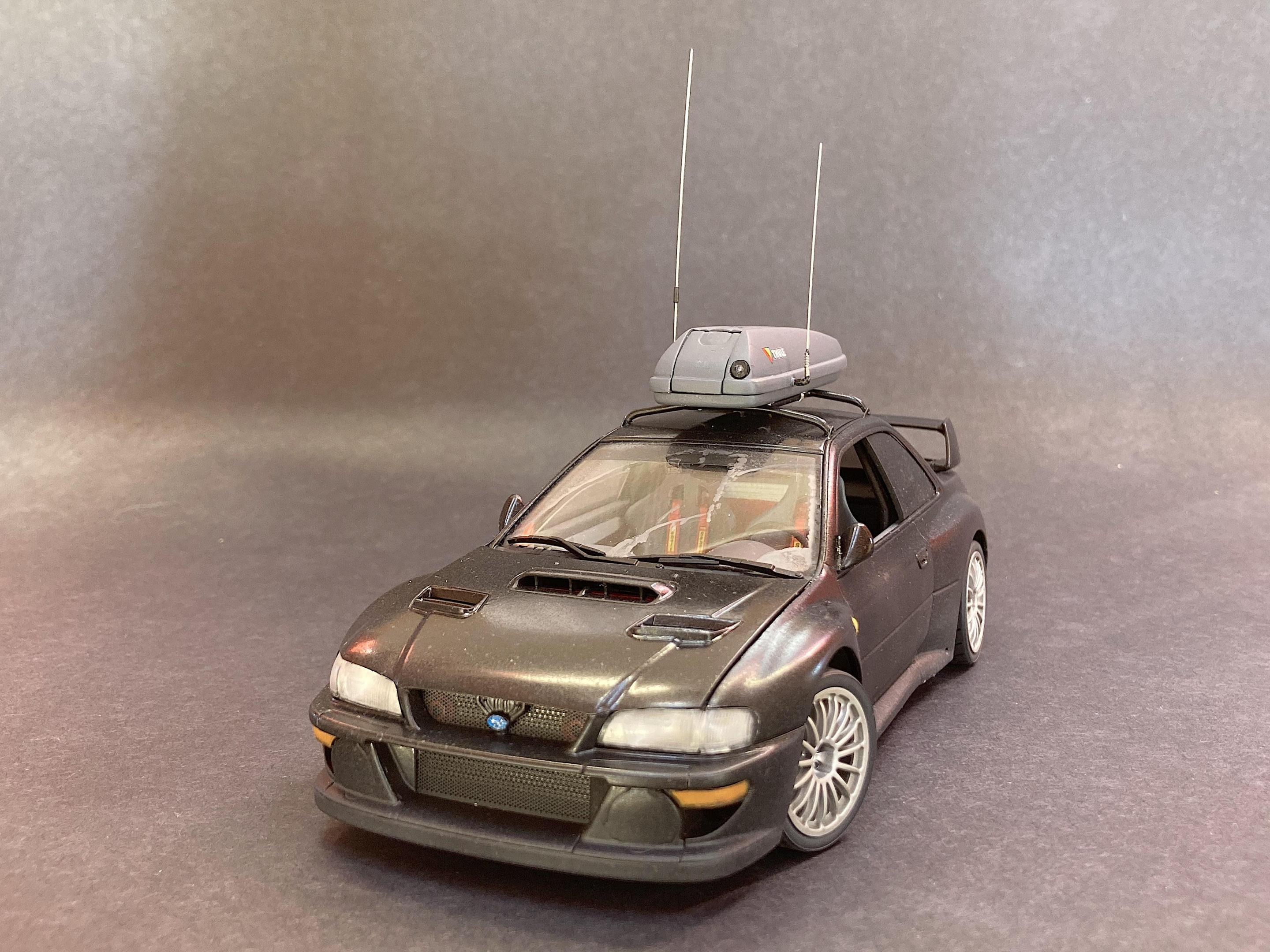 Built for the The '21 Cannonball Ruse community build. WIP: Tamiya Subaru Impreza (not WRC but Cannonball Ruse) with Hobby Design engine I always wanted to build this Tamiya Subaru Impreza as a private citizen road car, got the Hobby Design EJ20 engine kit a long time ago for this project. The Tamiya kit is typical awesome. The engine needed some modifications to fit. The Thule cargo box is from the Fujimi set that also has the bicycle, it was shortened and turned around, and has one rally light and a lens scavenged from a real camera. Interior has an Igloo cooler, a bunch of Monster drink cans, CB and scanner radio, camera screen, and sun visors. Built in a month, 125 hours. My intent was to not make a show car, but could be a cheap repaint of a retired rally car.
