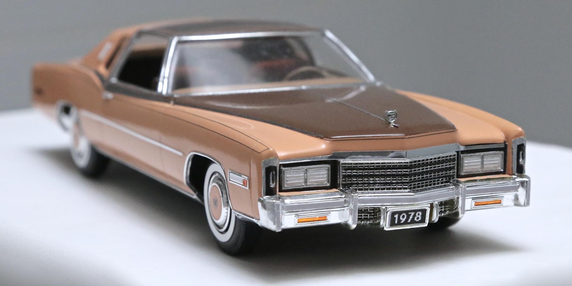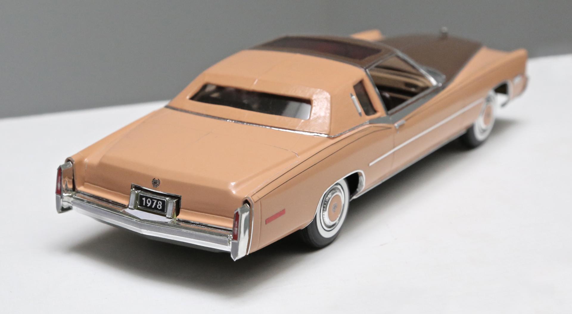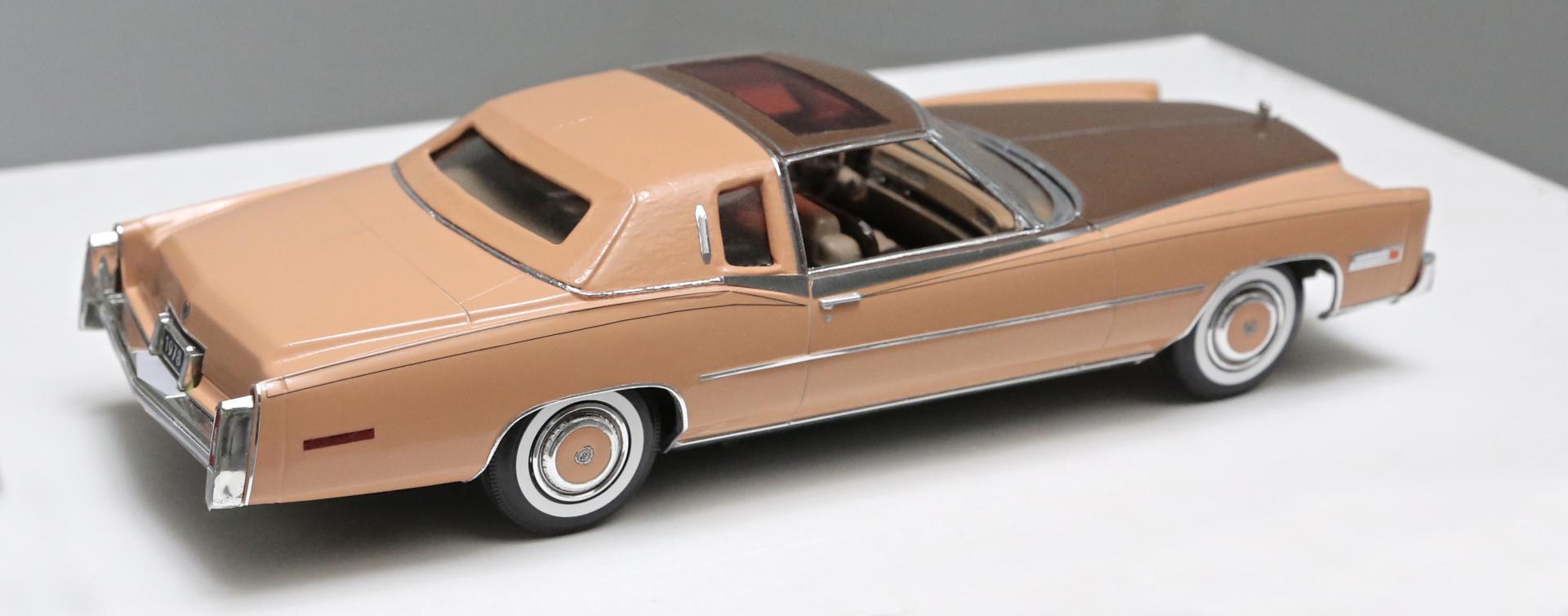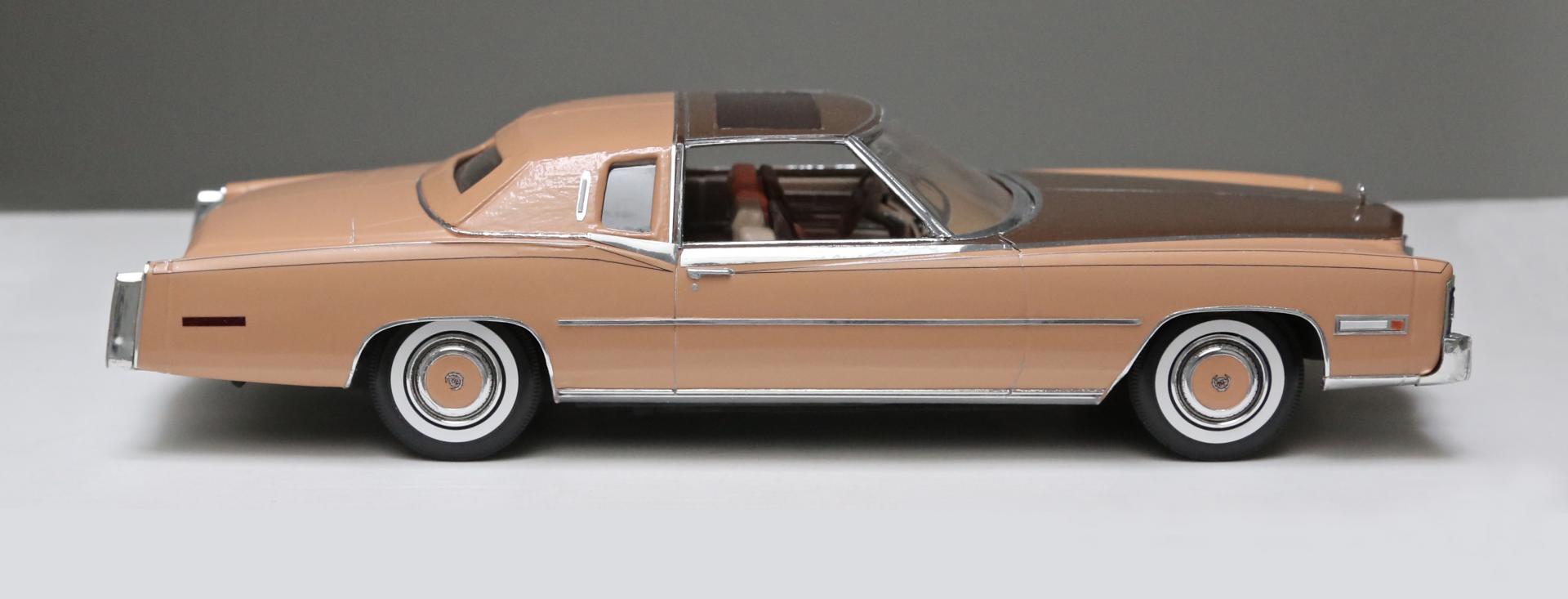 Hi ! Here is my very first Cadillac conversion, made a couple of years ago. JoHan only produced Eldorado Coupes from 1971 to 1976, so I took a old "76' Eldorado Rancher" kit to make this specific version. As 1978 would be the final year for the full sized Cadillac Eldorado, I wanted to make the highest trim level. The "Custom Classic" was very distinctive with its 2 tones exterior body and also a duo-tone pillowed leather interior ( done with clay ). 2000 Classics have been built that year, only 25 with a sunroof, like my version. I unfortunately couldn't get the exact same colours at the time I built the model ( Arizona Beige and Demitasse Brown Metallic ) but I tried to get as close as I could. As she's my first conversion, some mistakes here and there..., like a missing "Eldorado" script on the front edge of the hood. Rear bumper and taillights have been modified, as well as the rear window. Shock absorber fender and trunk lines sculpted. It was so fun to do though , but putting the 1mm black line decals on fenders ?....no so much !