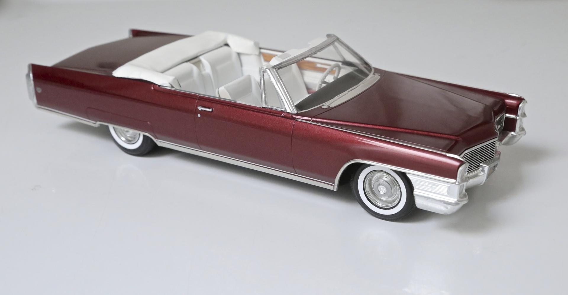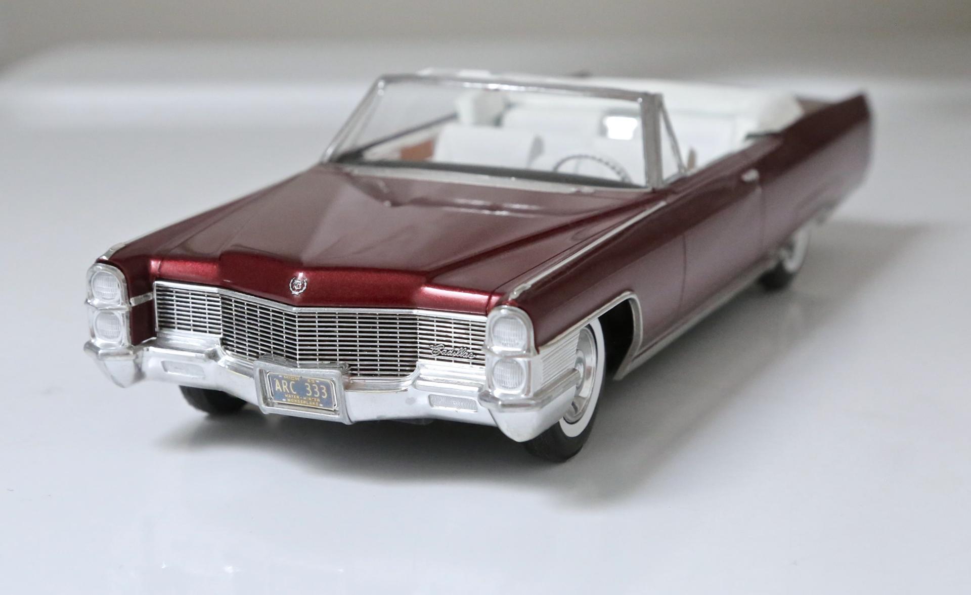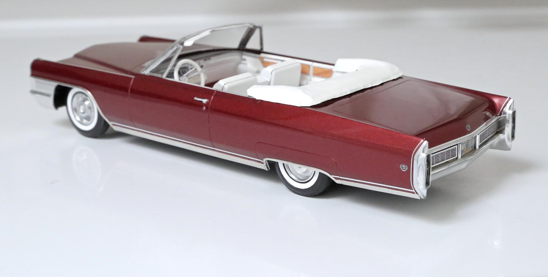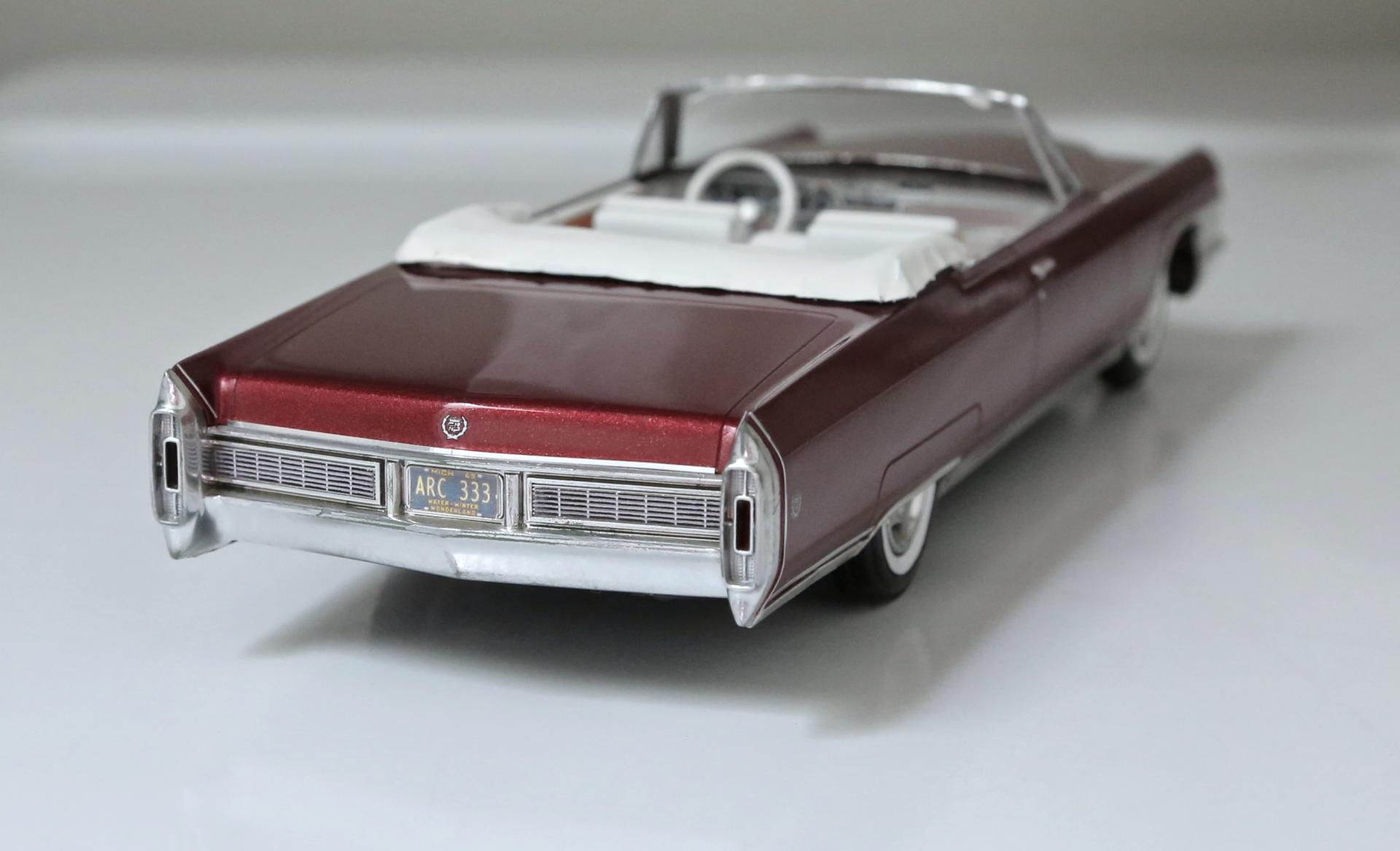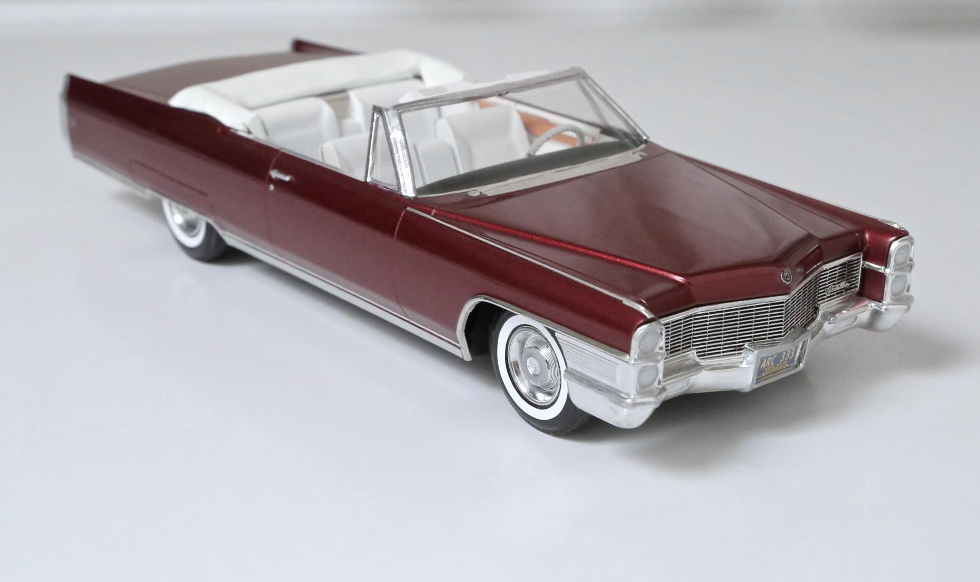 Picked up this open box model from a widow who lost her husband recently. He had many built and unbuilt, but my budget was just for 5 out of the lot. I have owned a few real caddy's in my day and my dad always had one as a family car growing up. We never had a convertible though. Anyhow, I decided to go with Rustoleum Gloss Berry Pink for the exterior and Rustoleum Candy Pink for the interior. Found some nice felt to use as carpet at Michaels for 33 cents. JoHan's models seem to be well fitting in my experience and this was as well. Was an open box, so a couple things were missing, but I fixed that. The wheels are rollers, which meant that it was easier to drop in the weeds because of the straight axles. Used bigger whitewalls and rims from my parts box. No gloss coat on here. I used Pledge/Future Floor wax and it came out nice. Also, I did the windshield trim with a chrome pen instead of BMF. Did the engine in the same pink as the interior. No awards will be won here, but had fun building another shelver. Thanx for looking.