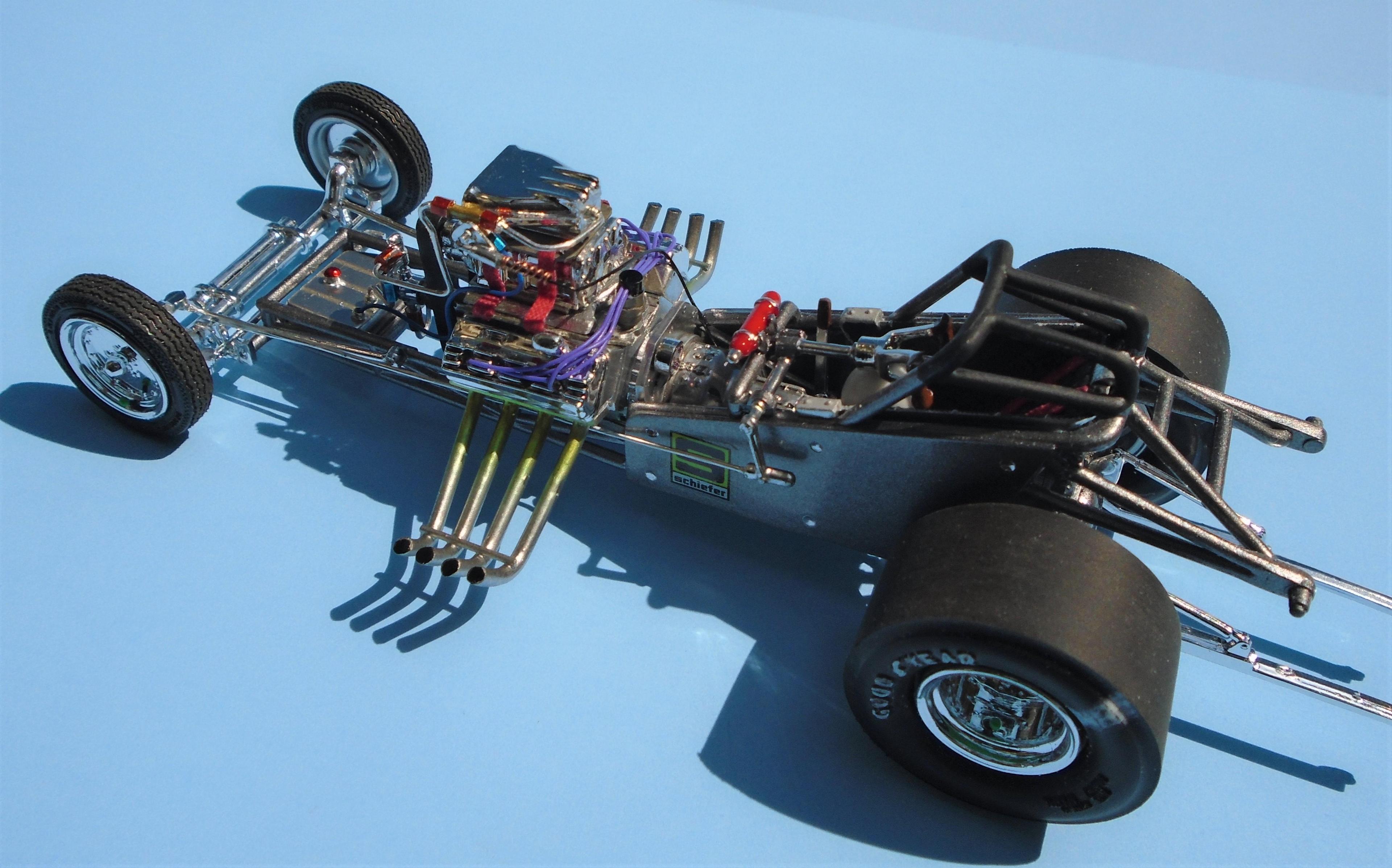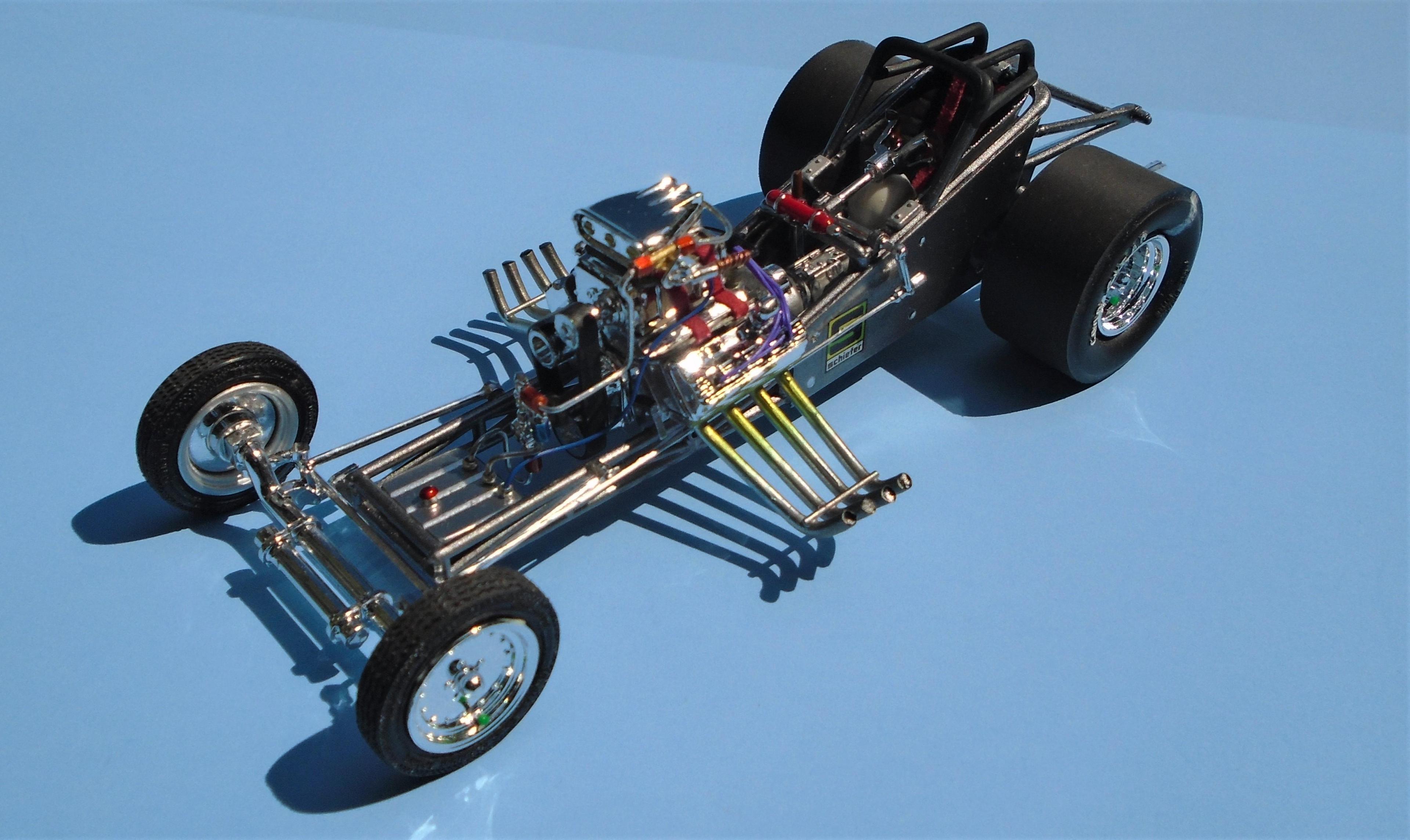 I built this from the original johan kit . However it was missing the super charger , front axle, and the complete rear end assembly. I was able to raid my parts hoard for the necessary pieces.most of the front axle assembly was scratch built with aluminum tubing and paper clips. It sure feels good to take a rare old kit and build it.It’s sprayed pearl blue with chuck Boener decals. The decals are a little intimidating you just have to take your time with them. Until next time. Thanks for looking. Mike