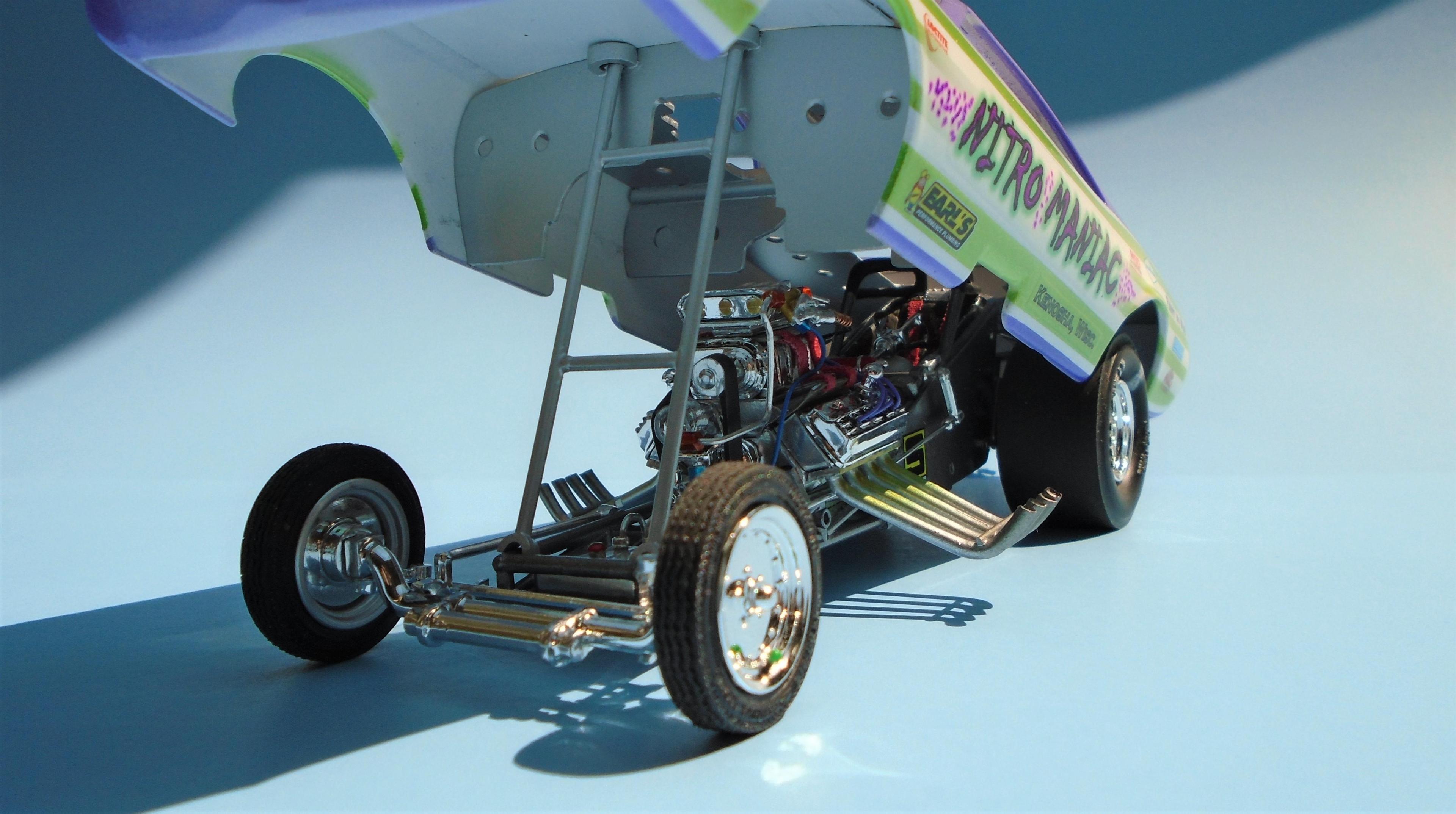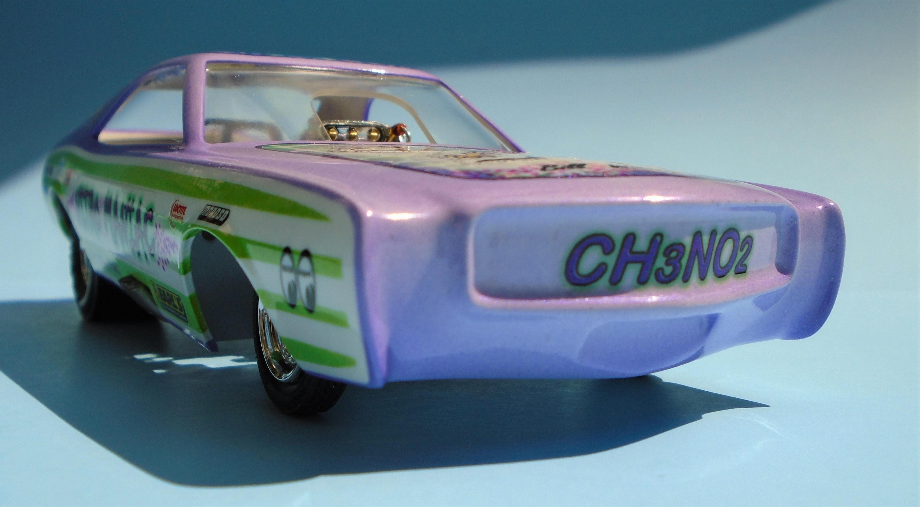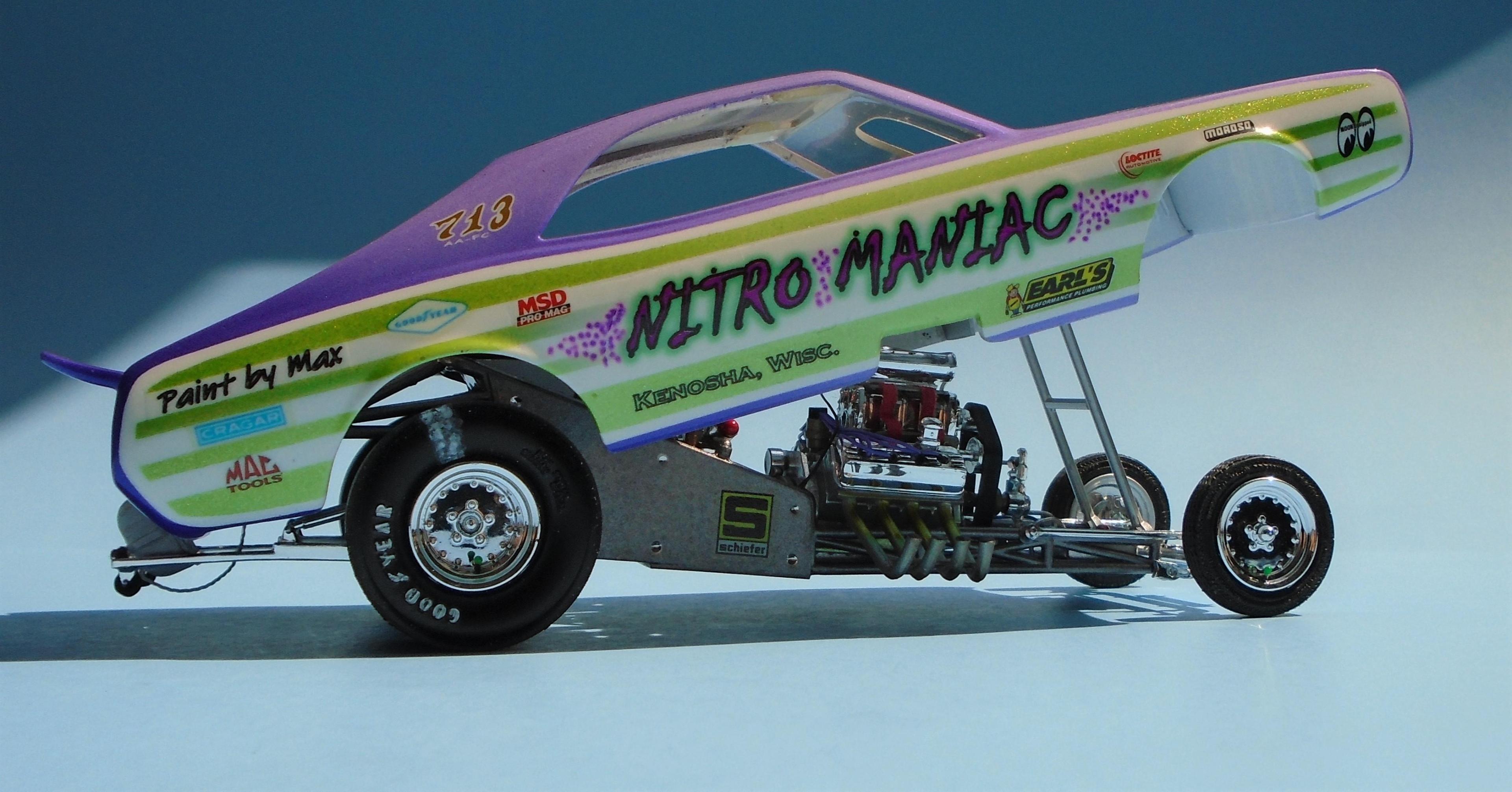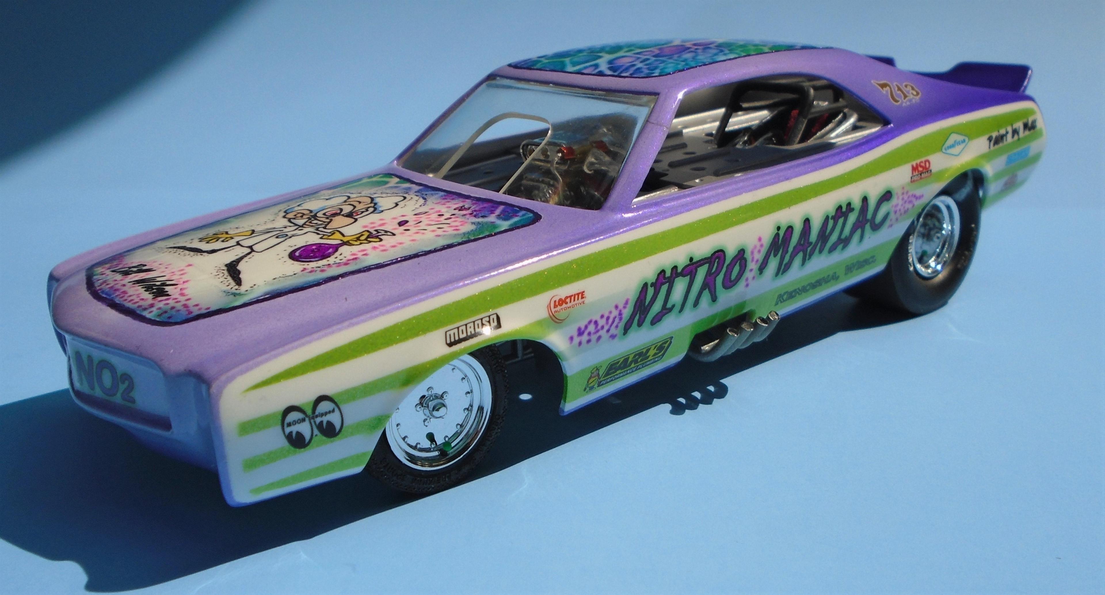 HI! Those of us who lived the 60's Funny-Cars great expansion will remember three dominant features: 1- cars looked indeed like the cars they represented, 2- They had a "theme" or nickname (Bounty hunter, LA Hooker, The Snake, etc.) and 3- Most could double as show cars, featuring the wild psychadelic "panel painting" & lettering techniques of the day. Meet NITRO MANIAC: a fantasy 69 Johan FC, restored from a glue bomb. The AMC 3 color paint scheme was stipped, the hood scoops shaved, the custom ft & rr ends kept in place but molded, and AMT's modified Trojan Horse M2 FC chassis slipped under the smoothed body (instead of the Logghe chassis of the kit). Scratchbuilt tin work, gas tank, chassis side-panels, barrel valve, wiring & plumbing, shifter, gas pedal and linkage, steering rod, etc. Home-made and parts box decals. Tamya's pure white, Silverleaf, Gunmetal, HOK Passion pearl, Testor's ice green, Mr.Hobby Topcoat clear, fully polished. Metallic gel pen pinstriping. Molotow's chrome. A paint experiment, and hours of fun with styrene! CT
