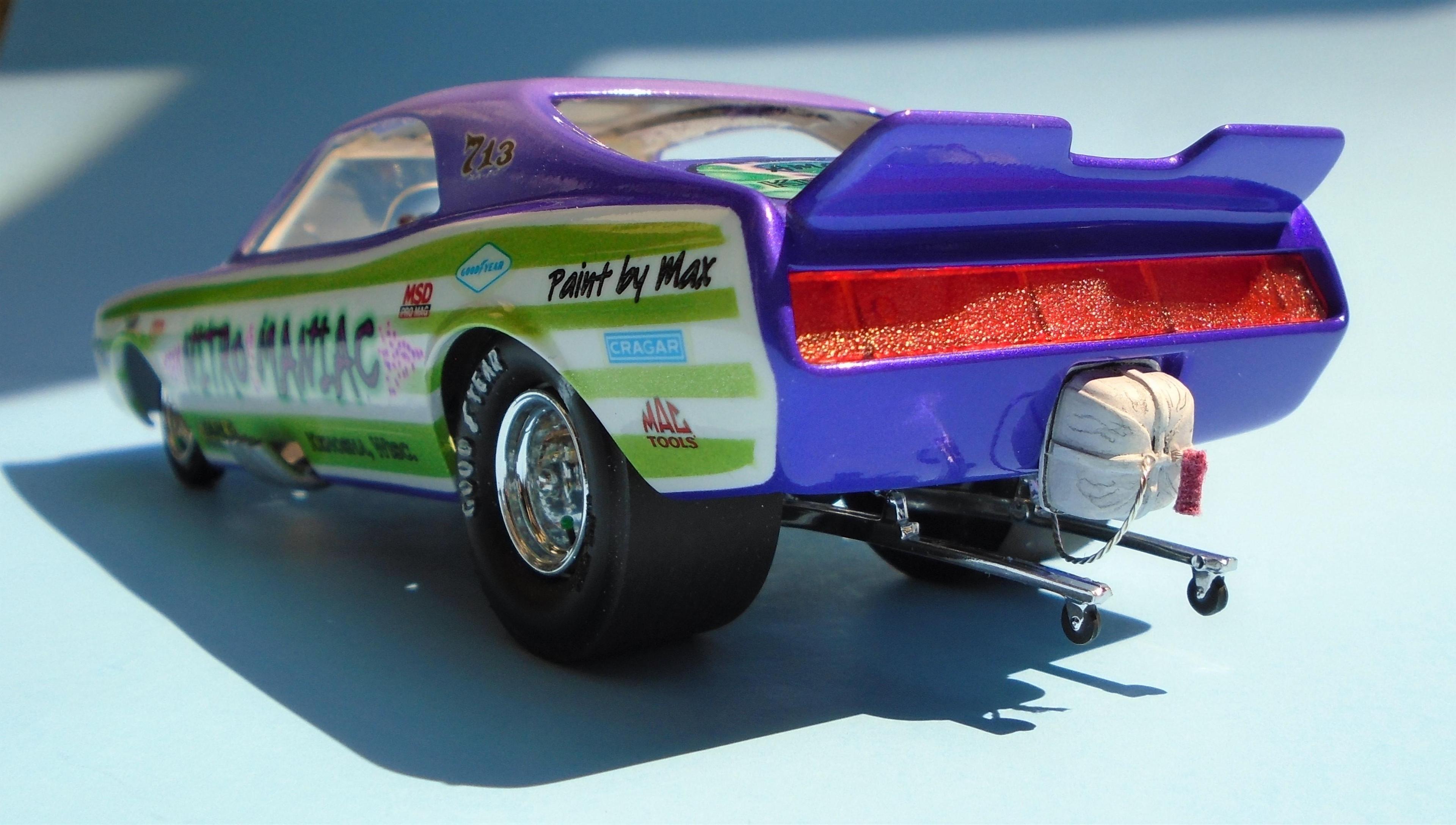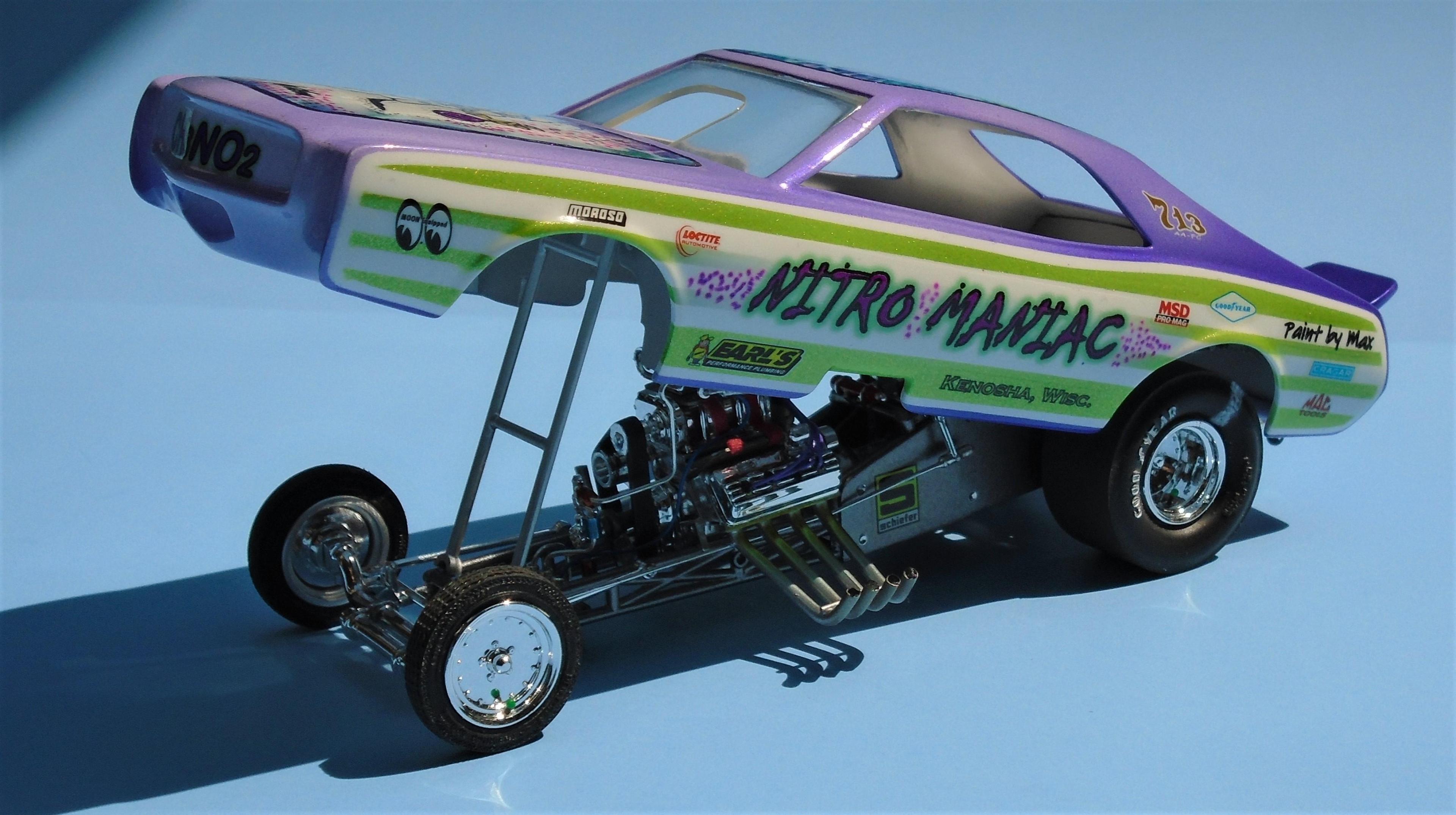 This is a box stock johan challenger funny car with testors white enamel and stang 1 forever decals. These old Johan funny cars were so good they pretty much fall right together with very accurate bodies to boot. Until next time thanks for looking. Mike