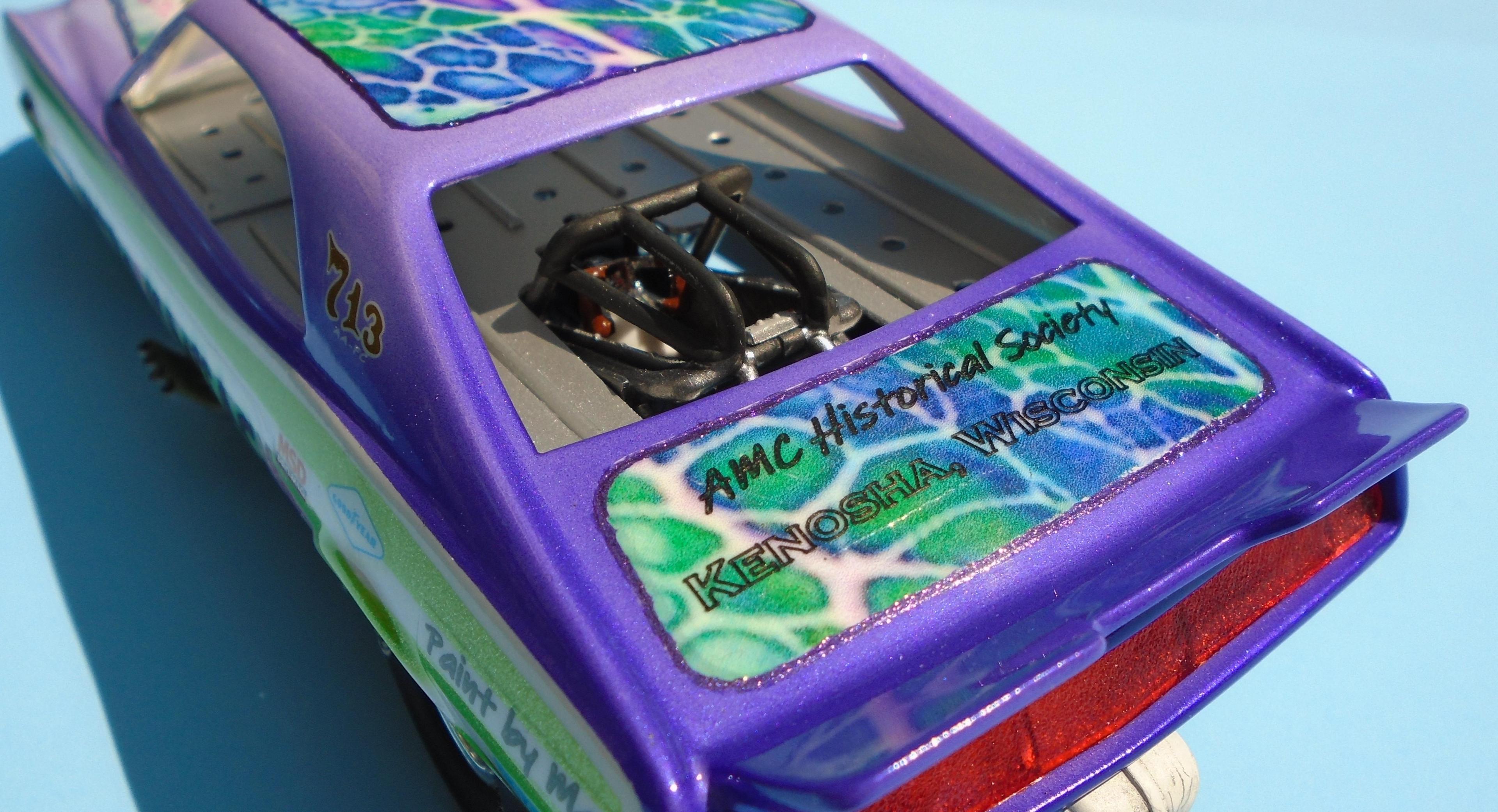 After picking this one up last week, I disassembled and gave it a good soaking in Super Clean. The chassis and interior were coated with the customary model paint smothering. But the body and glass are in great shape! The only thing ever applied to the shell were decals, same for the glass. Lots of ample glue piles under the hood and in a few other spots. I think another soak and some careful cleaning this resto will be under way. I'd like to use these wheels and tires, the extra bumpers, scoop and decals are bonuses.