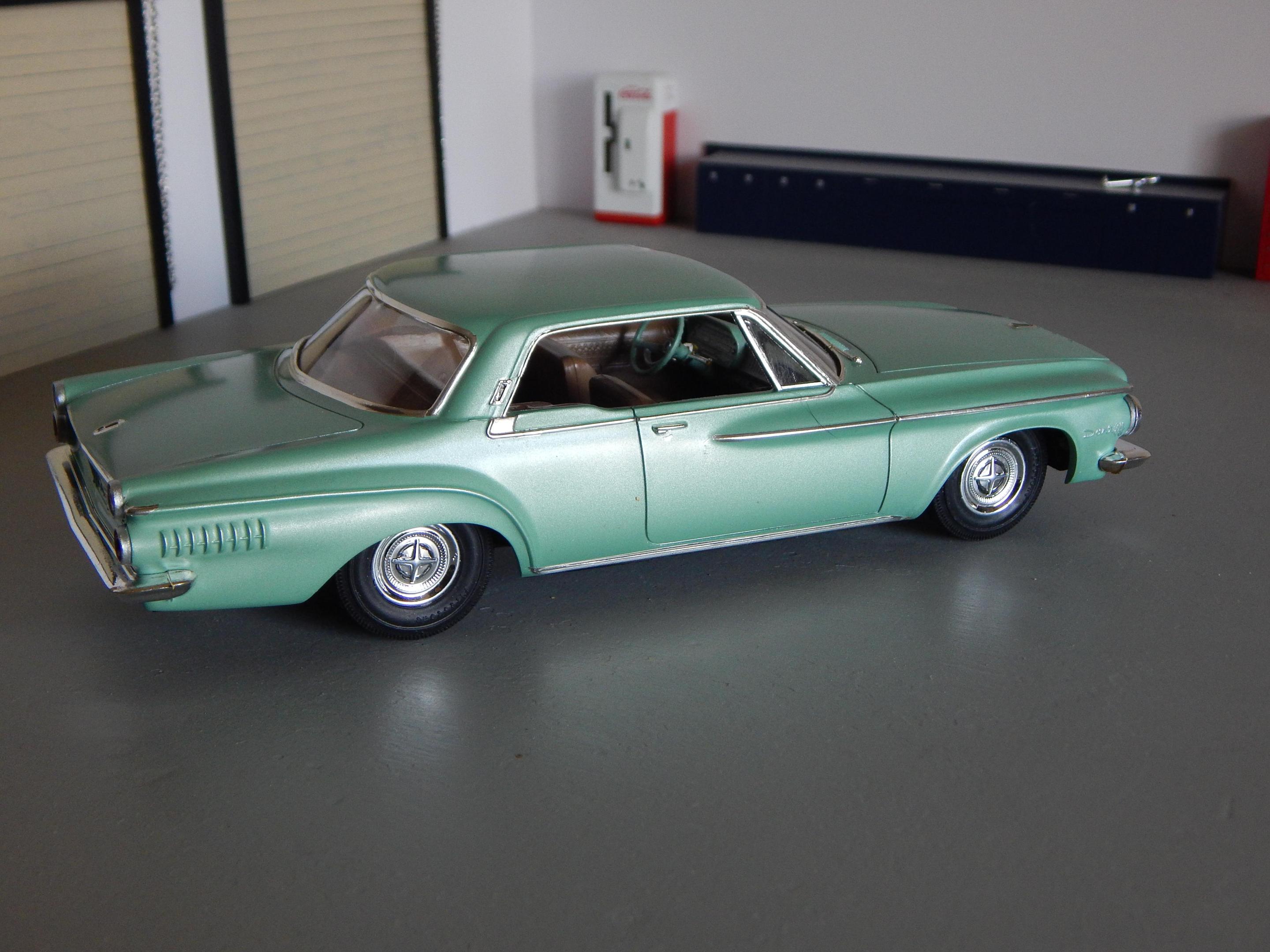 This project started back as a replica stock build in 1980 with a mint kit. Now it's finally almost finished as a mild custom! Sometime the roof got broken and I tried to fix it but those thin roof pillars were just too fragile. Junk '59 Fury to the rescue! The Plymouth roof is essentially identical to the Dodge. Here I've also stripped the chrome for a replate and started to shave off the extraneous trim from the body. Here she is in fresh Tamiya primer and fresh Little Motor Kar Co. replated bumpers. Still to be removed were the door handles and the large piece of ribbed trim with the "Custom Royal" nameplate at the leading edge of the fin. I decided to remove and reshape the taillight bezels, then have them plated. Custom taillight lenses came from an original issue AMT '57 T-bird kit. Tailpipe extensions were made styrene rod. The JoHan Dodge is quite accurate except for the rear wheel opening shape. Back when I started the project I reshaped the openings. Here you can see the corrected one compared to an unmodified kit... After sectioning the chassis to shorten the wheelbase slightly for a more accurate look, I added material to JoHan's flat chassis so that the model will have a finished look underneath and viewers won't be able to look inside the body through the wheel openings. Now it's in paint! Tamiya Pearl "Light Red" for the main color and a pink mixed from Tamiya Pearl Light Red and Tamiya Pearl White. Hope you like it so far!