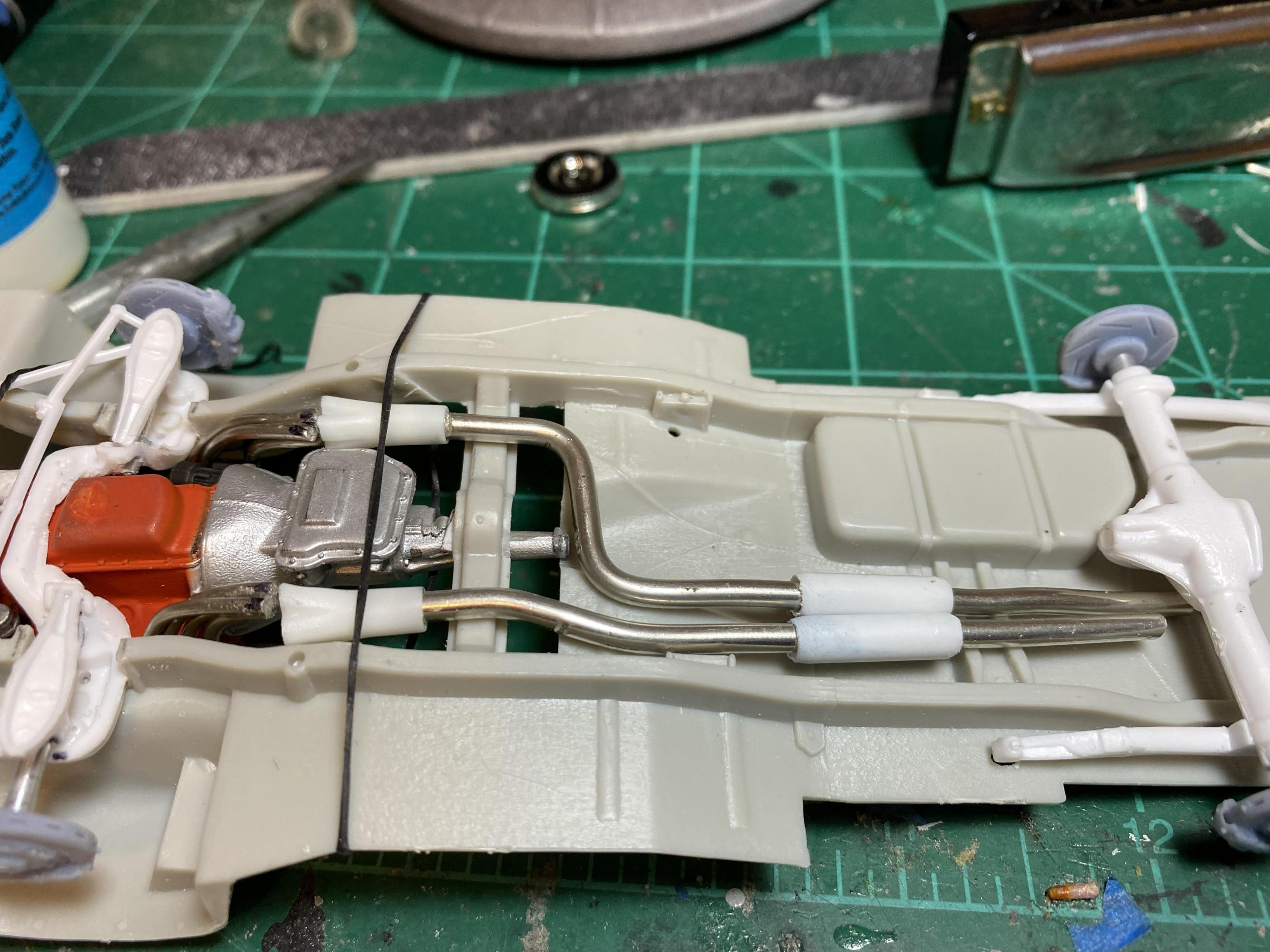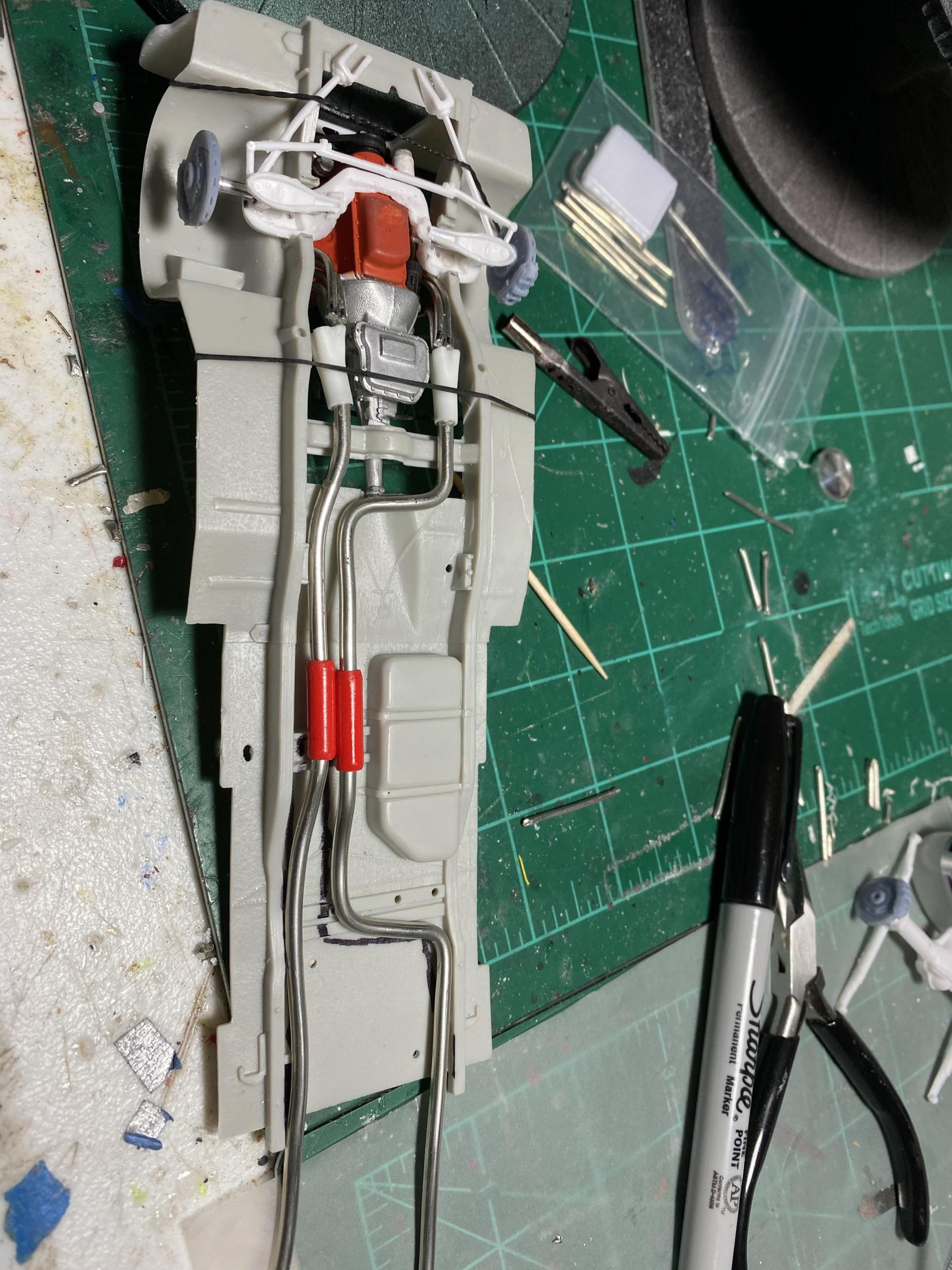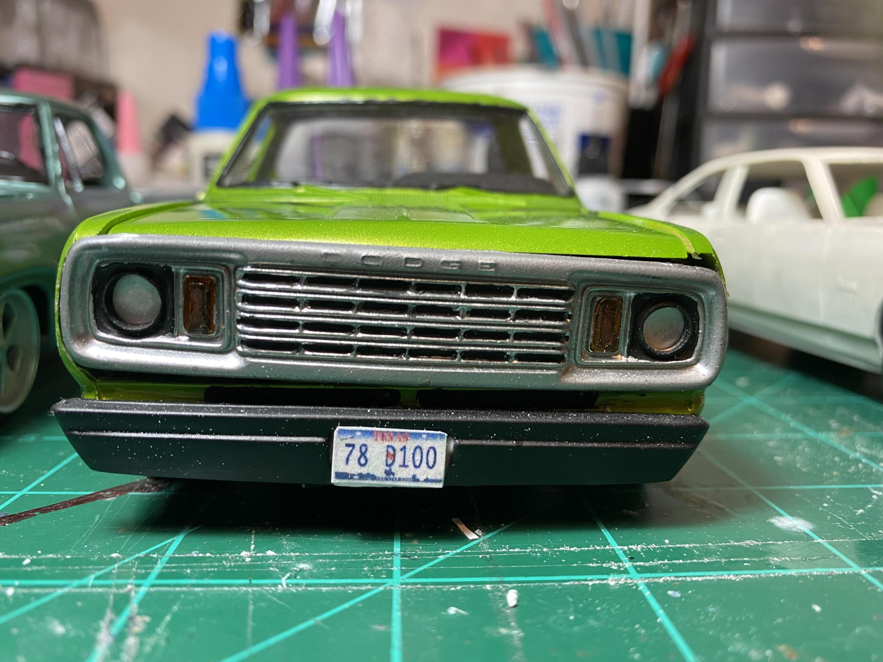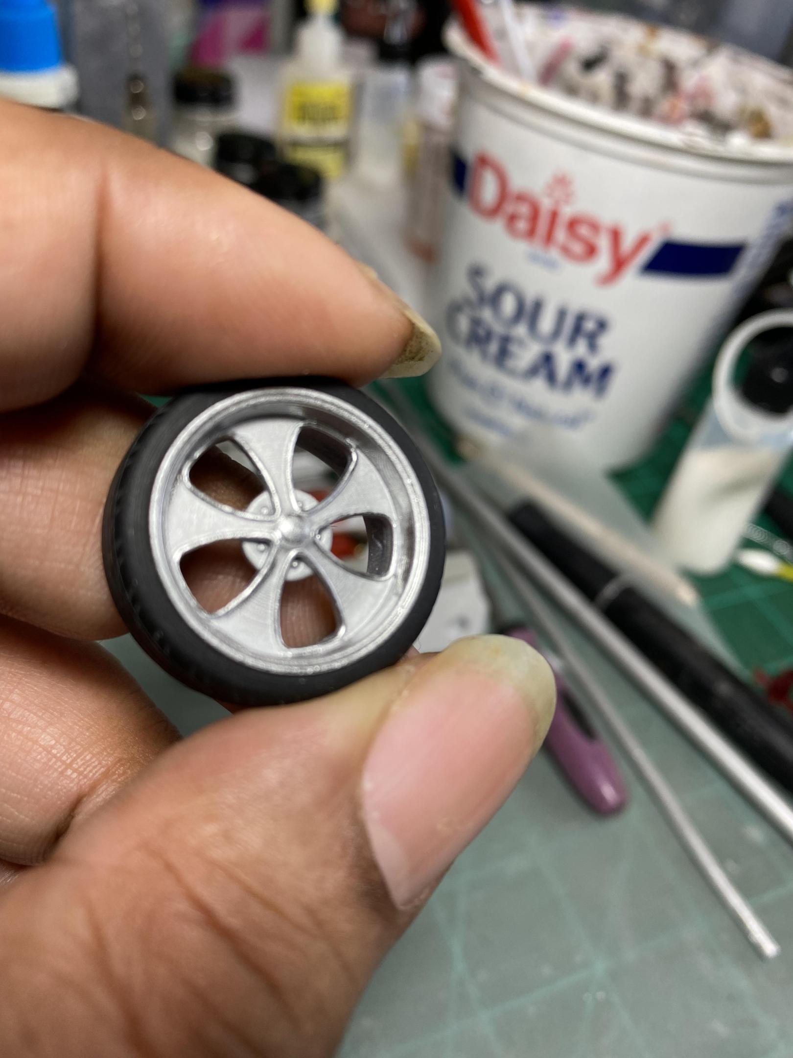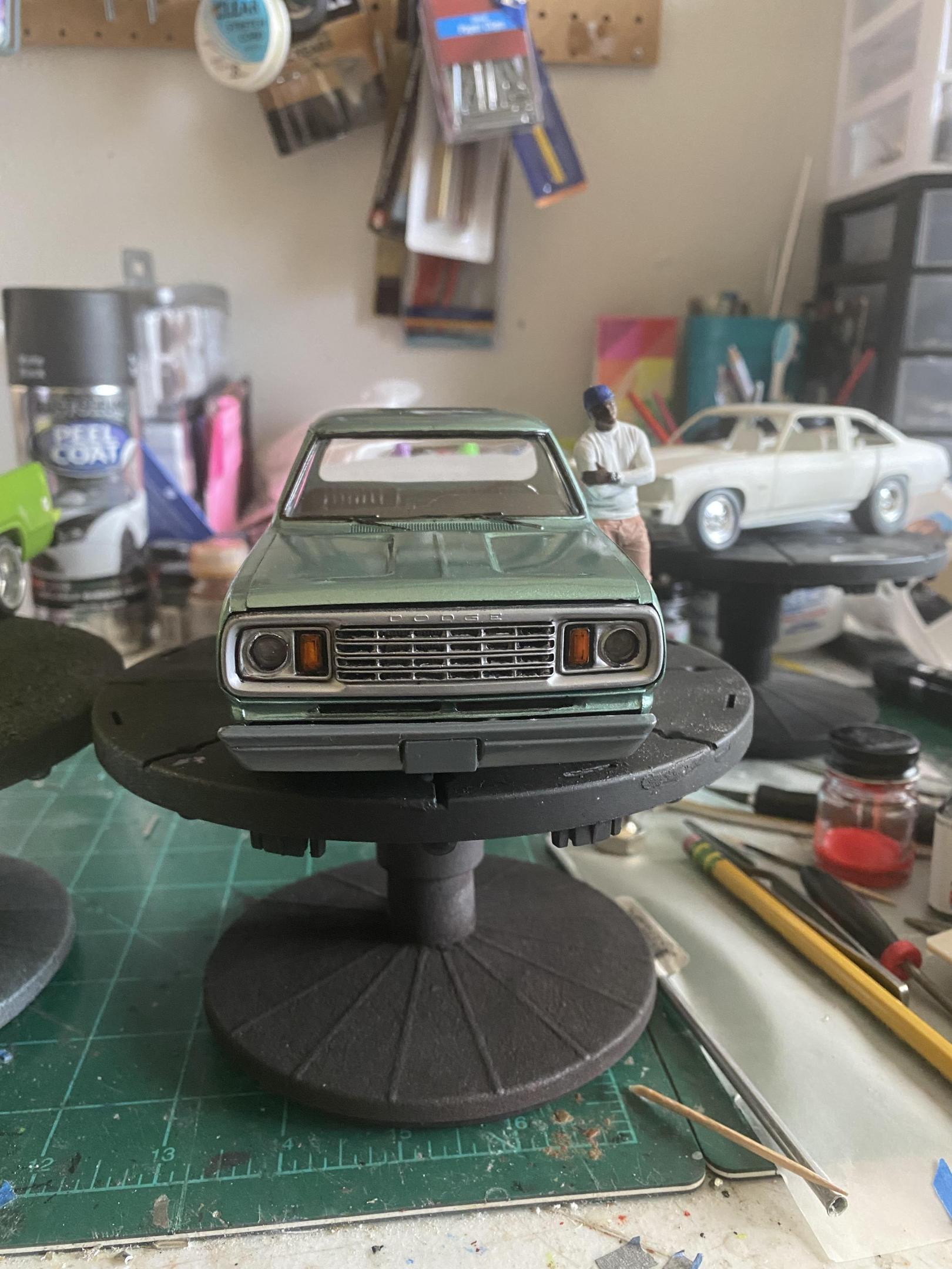I’ve had it in my head for a while to do the MPC Plymouth Volaré with an AMT 1971 duster, chassis, suspension and drivetrain. it was never a question. I definitely wanted to put fireball model works Steelies on the car. It all started by making sure that the chassis line up underneath the Volaré body. Of course it pretty much lined up, but the interior was a problem. I had to cut a hole in the interior tub of the Volaré to fit the duster chassis. This was really fun and I really do mean it. I’m not being sarcastic. Seeing how the Volaré comes with no real detail in the engine bay, I decided to use the Duster’s engine bay. Also, because this was going to be a quick build just to see if the chassis would fit this model I decided to use the drivetrain from the Duster. I was quite impressed myself when I was able to get the engine bay to lineup under the.Volaré body. Paint: I have a hard time to decide what color to paint this thing I wanted it to be in the beginning just the kind of beater run around old grandma‘s car that was turned into a hot rod. I wanted it to be yellow like a banana and maybe have some primer spots or something like that. I decided to use craft acrylic paint for the color. I started with a banana yellow, and mixed in some other colors to try and shade it a little more pea green. However, I overshot the mark and added one too many drops of green to the mix and that is how we wound up with this color. 😂 Now I didn’t want it to be a show winning paint job, but rather a worn and faded look. I primed it with red oxide primer so I can have some primer and surface rest spots come through. I dig it. 😎👍🏾 Interior: I am pretty proud of the interior. As I said, I cut a hole in the floor of the. Volaré to accommodate the floor pan incorporated into the duster chassis. Only a slight modification or rounding to the tunnel in the middle of the rear seat was needed to make it fit. The dusters bucket seats were used along with its shifter. I added a few extra little details, like some reading material, a tarp, a roadkill sticker, and a gas brake and clutch pedal. I also noticed that for Volarés head shoulder seatbelts. Once I saw this, I had to put it into this car. I would’ve been mad later on if it wasn’t in there. I use some sheet plastic and cut slivers so I could slide some ribbon through it. Then I hung it from the roof of the car behind the drivers and passenger seat. I had a lot of fun with this. Engine: The engine is out of the AMT 1971 duster kit. My original idea was to put a 440 into this one, but like I said, I wanted this to be quick and to see if the duster chassis would fit this car. The motor is basically straight out of the box. I did add some 3-D printed parts such as the air cleaner and the distributor. I used Grandpa Mark‘s hobbies method of wiring the distributor. Which is going from the heads back to the distributor using Protech wiring. I decided to also do my valve covers in chrome. The whole engine has a used look because I used red oxide primer under a custom mixed orange paint that I airbrushed onto the engine. I like it. Exhaust: The exhaust is straight out of the box from the duster as well, but I changed the tailpipes. I didn’t want to see the duster exhaust tips coming out of the back of this car. I wanted straight tail pipes coming out of the back. Body: I’ve done this kit once before as a pro touring car but this time I wanted to do it a little more like an every day car. A daily driver turned weekend street machine run around play car. The first thing I did was fill in the headliner and remove lines from the roof. As you can see in the pictures below, it takes quite a bit to remove the t-tops. I like the smooth roof. At the time of this riding, the car is about 98% done. Feel free to take a look at the pictures and let me know what you think. Thank you for following. Have a great day!