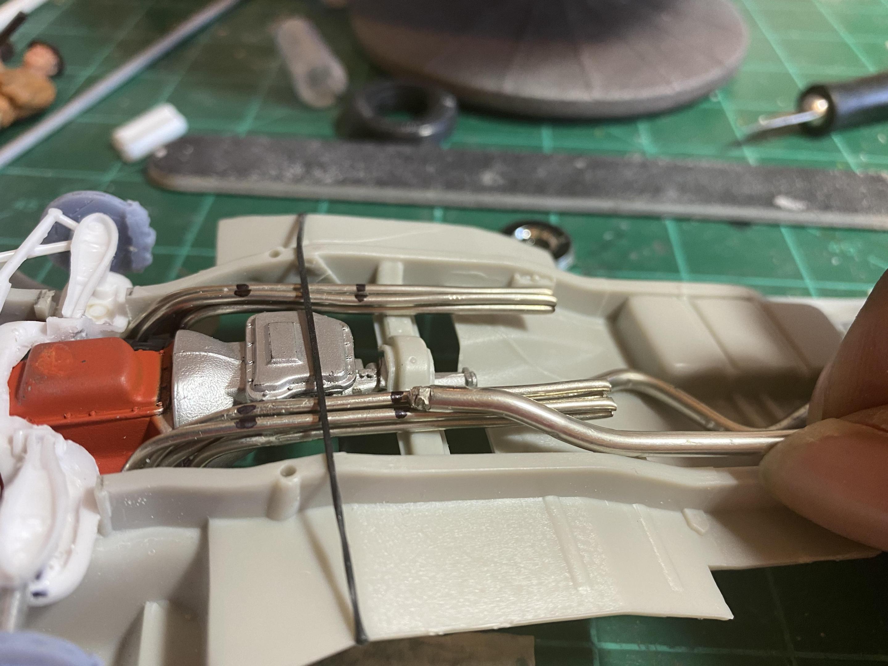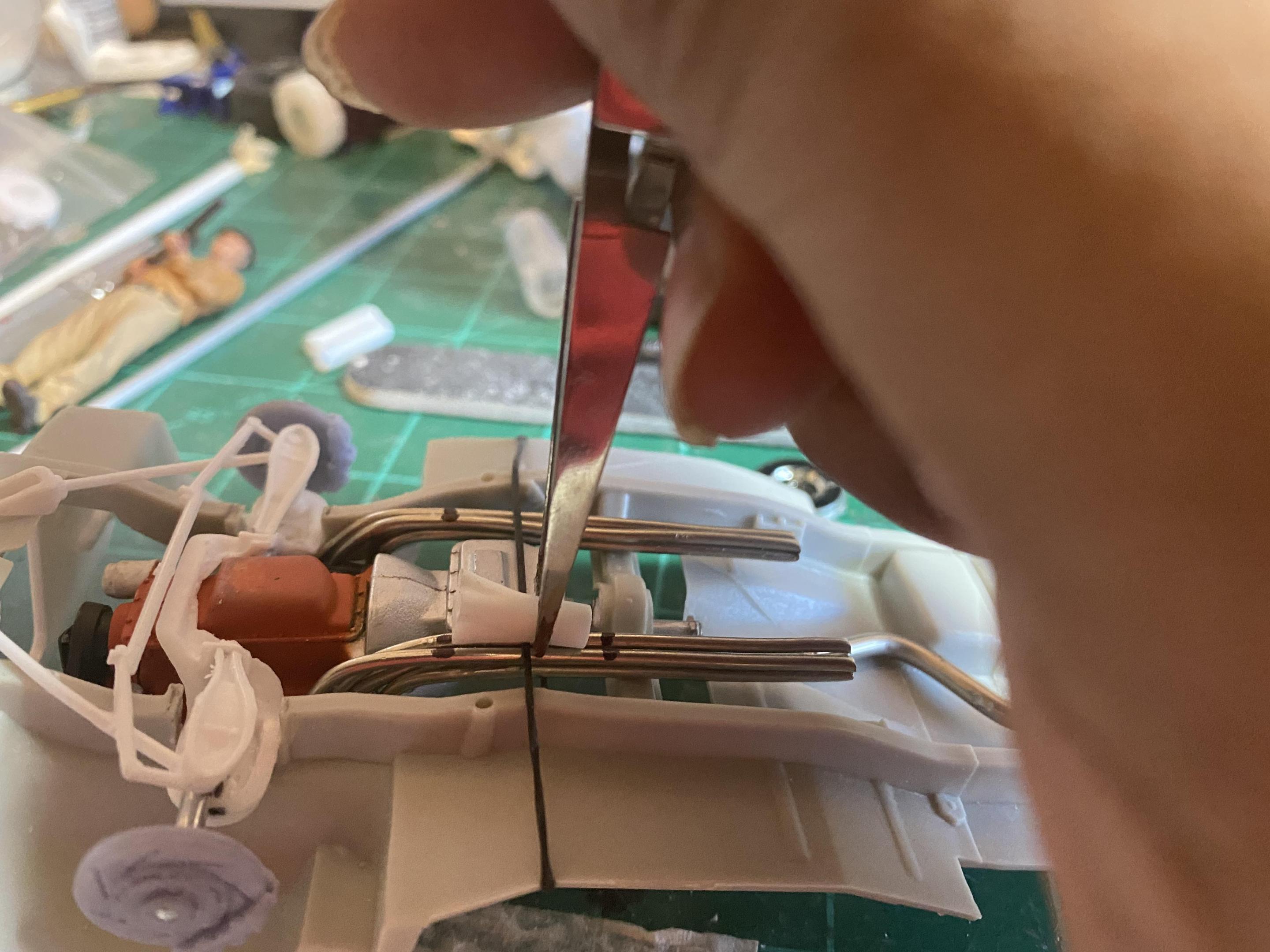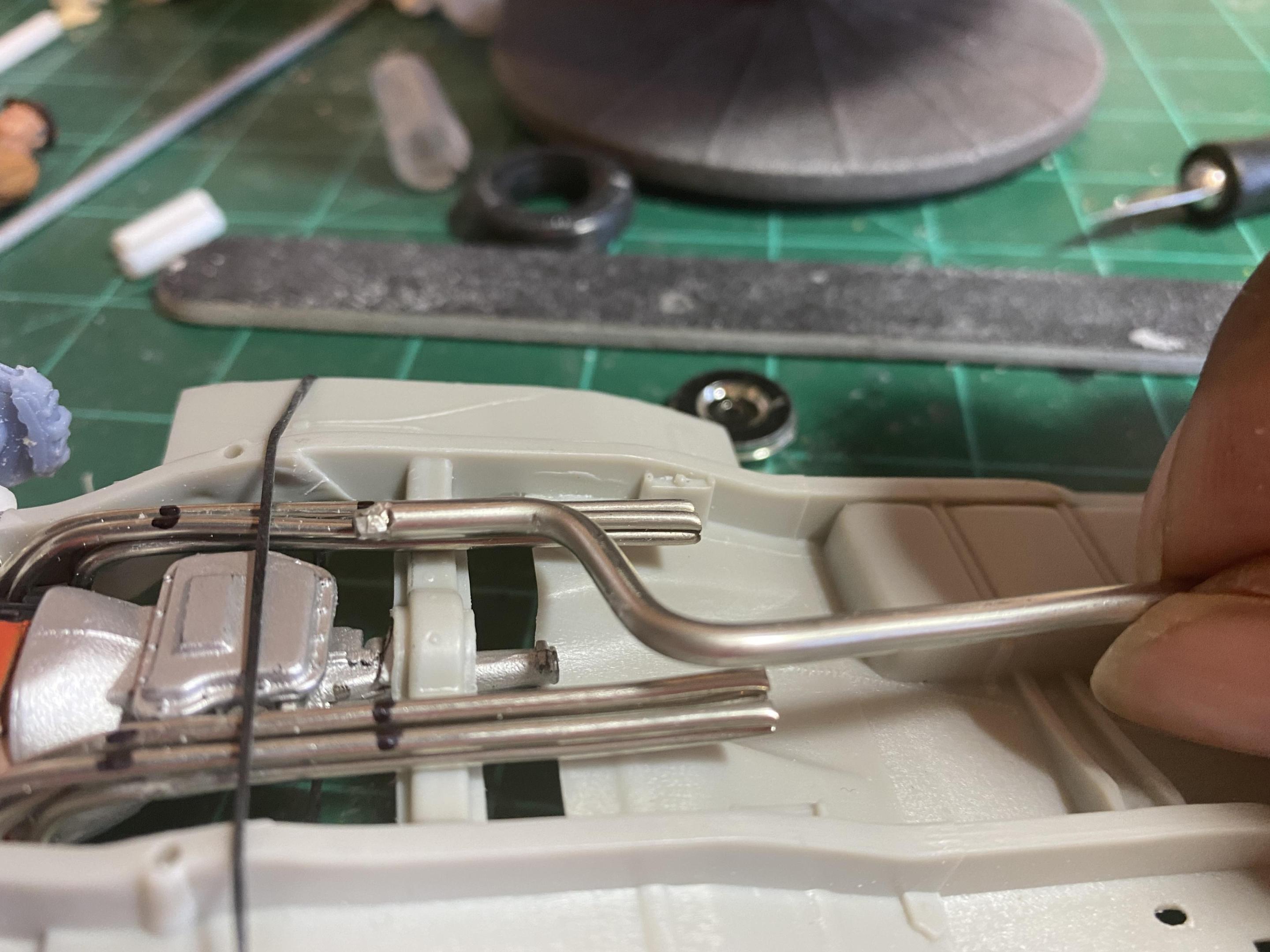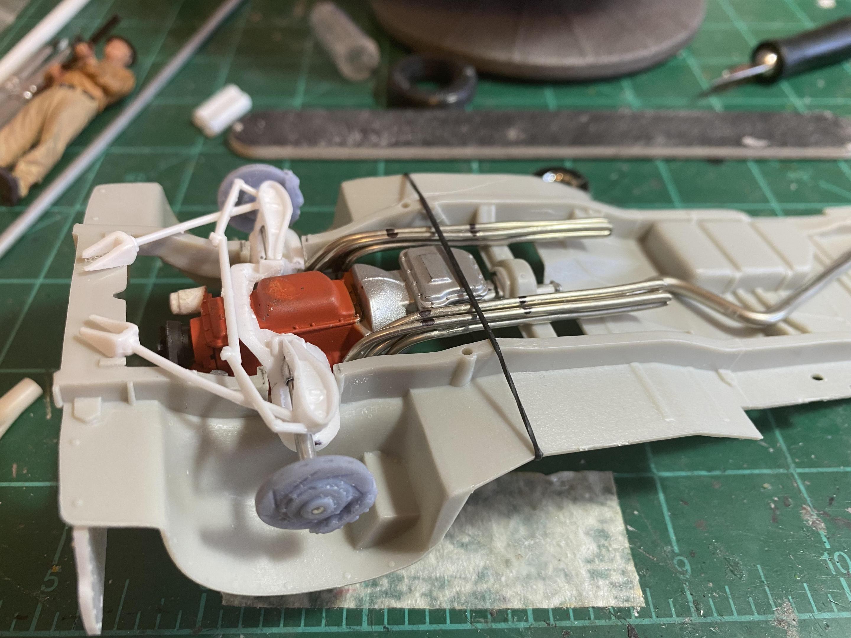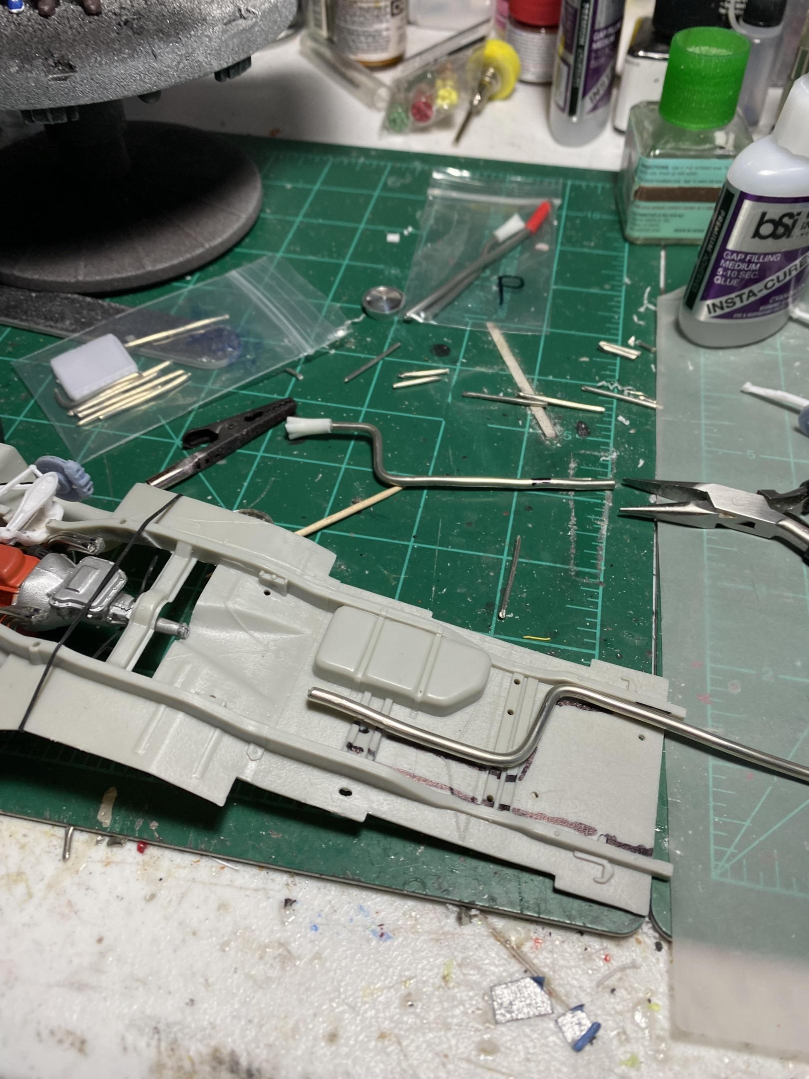 I’ve had it in my head for a while to do the MPC Plymouth Volaré with an AMT 1971 duster, chassis, suspension and drivetrain. it was never a question. I definitely wanted to put fireball model works Steelies on the car. It all started by making sure that the chassis line up underneath the Volaré body. Of course it pretty much lined up, but the interior was a problem. I had to cut a hole in the interior tub of the Volaré to fit the duster chassis. This was really fun and I really do mean it. I’m not being sarcastic. Seeing how the Volaré comes with no real detail in the engine bay, I decided to use the Duster’s engine bay. Also, because this was going to be a quick build just to see if the chassis would fit this model I decided to use the drivetrain from the Duster. I was quite impressed myself when I was able to get the engine bay to lineup under the.Volaré body. Paint: I have a hard time to decide what color to paint this thing I wanted it to be in the beginning just the kind of beater run around old grandma‘s car that was turned into a hot rod. I wanted it to be yellow like a banana and maybe have some primer spots or something like that. I decided to use craft acrylic paint for the color. I started with a banana yellow, and mixed in some other colors to try and shade it a little more pea green. However, I overshot the mark and added one too many drops of green to the mix and that is how we wound up with this color. 😂 Now I didn’t want it to be a show winning paint job, but rather a worn and faded look. I primed it with red oxide primer so I can have some primer and surface rest spots come through. I dig it. 😎👍🏾 Interior: I am pretty proud of the interior. As I said, I cut a hole in the floor of the. Volaré to accommodate the floor pan incorporated into the duster chassis. Only a slight modification or rounding to the tunnel in the middle of the rear seat was needed to make it fit. The dusters bucket seats were used along with its shifter. I added a few extra little details, like some reading material, a tarp, a roadkill sticker, and a gas brake and clutch pedal. I also noticed that for Volarés head shoulder seatbelts. Once I saw this, I had to put it into this car. I would’ve been mad later on if it wasn’t in there. I use some sheet plastic and cut slivers so I could slide some ribbon through it. Then I hung it from the roof of the car behind the drivers and passenger seat. I had a lot of fun with this. Engine: The engine is out of the AMT 1971 duster kit. My original idea was to put a 440 into this one, but like I said, I wanted this to be quick and to see if the duster chassis would fit this car. The motor is basically straight out of the box. I did add some 3-D printed parts such as the air cleaner and the distributor. I used Grandpa Mark‘s hobbies method of wiring the distributor. Which is going from the heads back to the distributor using Protech wiring. I decided to also do my valve covers in chrome. The whole engine has a used look because I used red oxide primer under a custom mixed orange paint that I airbrushed onto the engine. I like it. Exhaust: The exhaust is straight out of the box from the duster as well, but I changed the tailpipes. I didn’t want to see the duster exhaust tips coming out of the back of this car. I wanted straight tail pipes coming out of the back. Body: I’ve done this kit once before as a pro touring car but this time I wanted to do it a little more like an every day car. A daily driver turned weekend street machine run around play car. The first thing I did was fill in the headliner and remove lines from the roof. As you can see in the pictures below, it takes quite a bit to remove the t-tops. I like the smooth roof. At the time of this riding, the car is about 98% done. Feel free to take a look at the pictures and let me know what you think. Thank you for following. Have a great day!