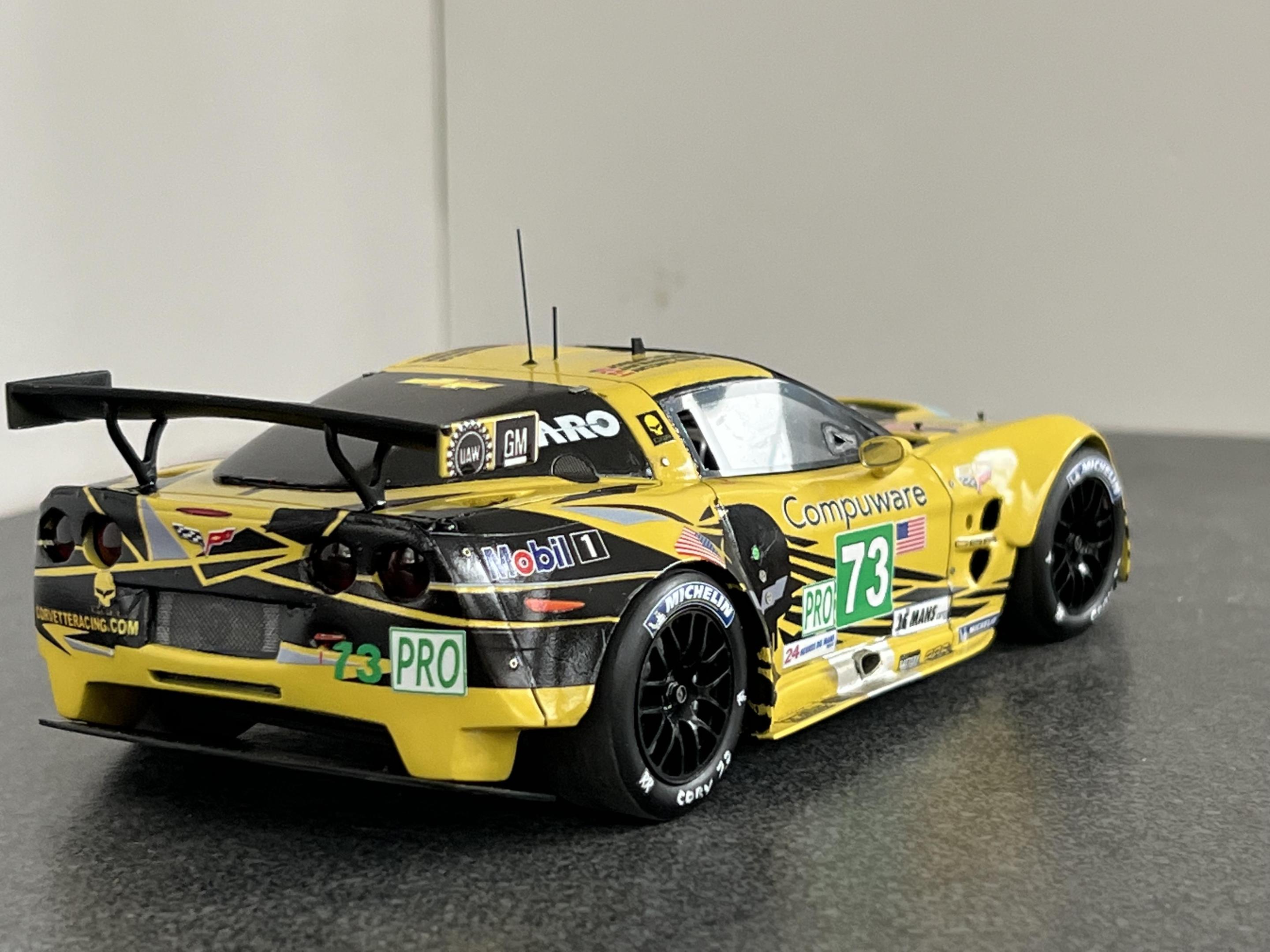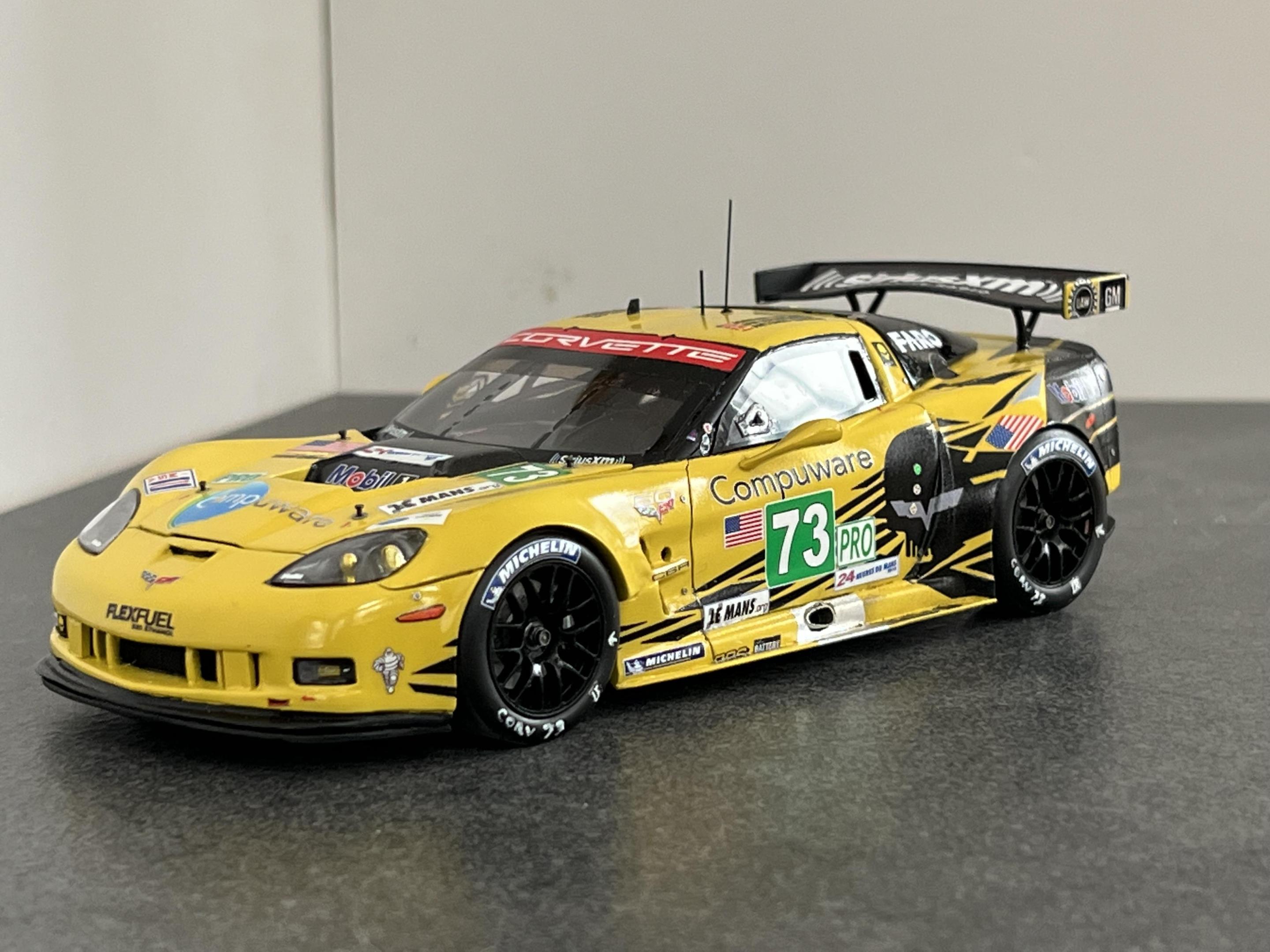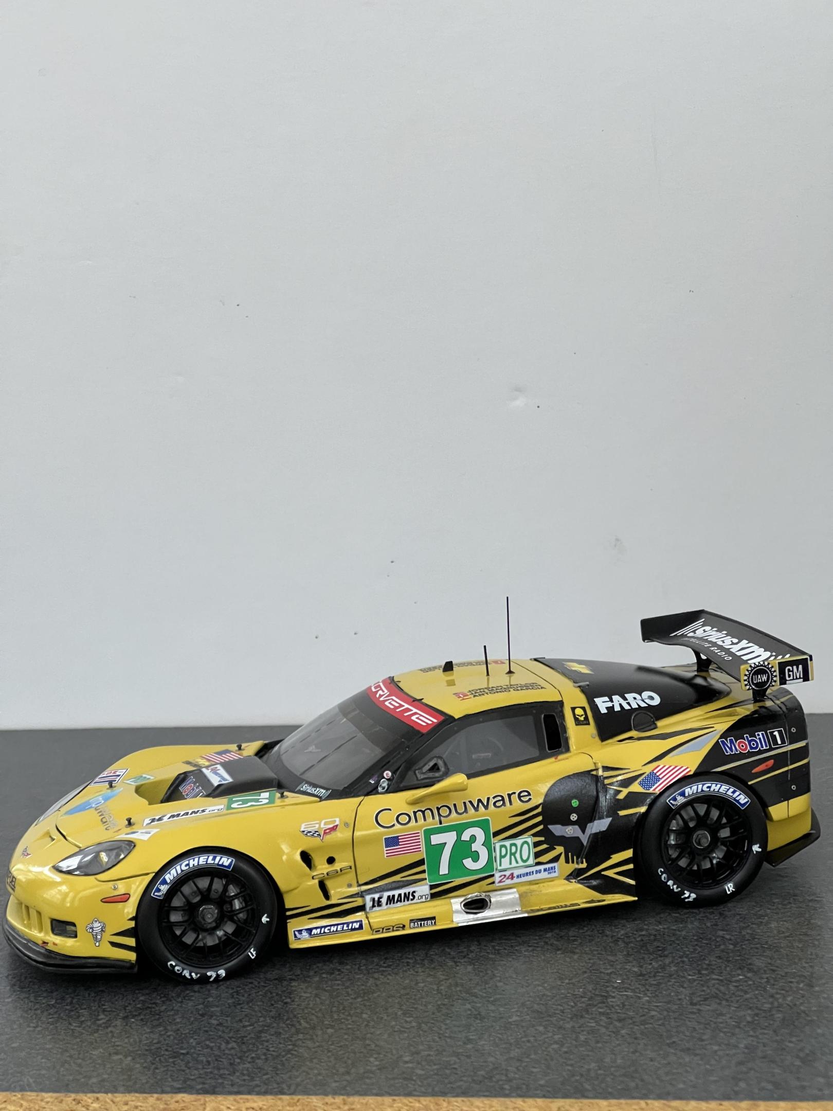 Finally completed the Corvette C6R-ZR1, #73 car, as raced at the 2012 LeMans. The model is in 1/25 scale and uses a Revell ZR1 body as the base, that was mastered by Jay Savarese; The C6R kit by Scale Motorsports donated the chassis, interior, and engine and photoetch parts; a Revell ZR1 kit donated the front and rear 'glass', the headlight and driving light lens covers and a C7R kit donated the outside rear view mirrors and the rear deck wing and struts. The main 'Jake' livery decals were from Pattos Place and other various decals were used. More detailed build info can be found in the 'WIP' section of the forum. Appreciate any and all comments!