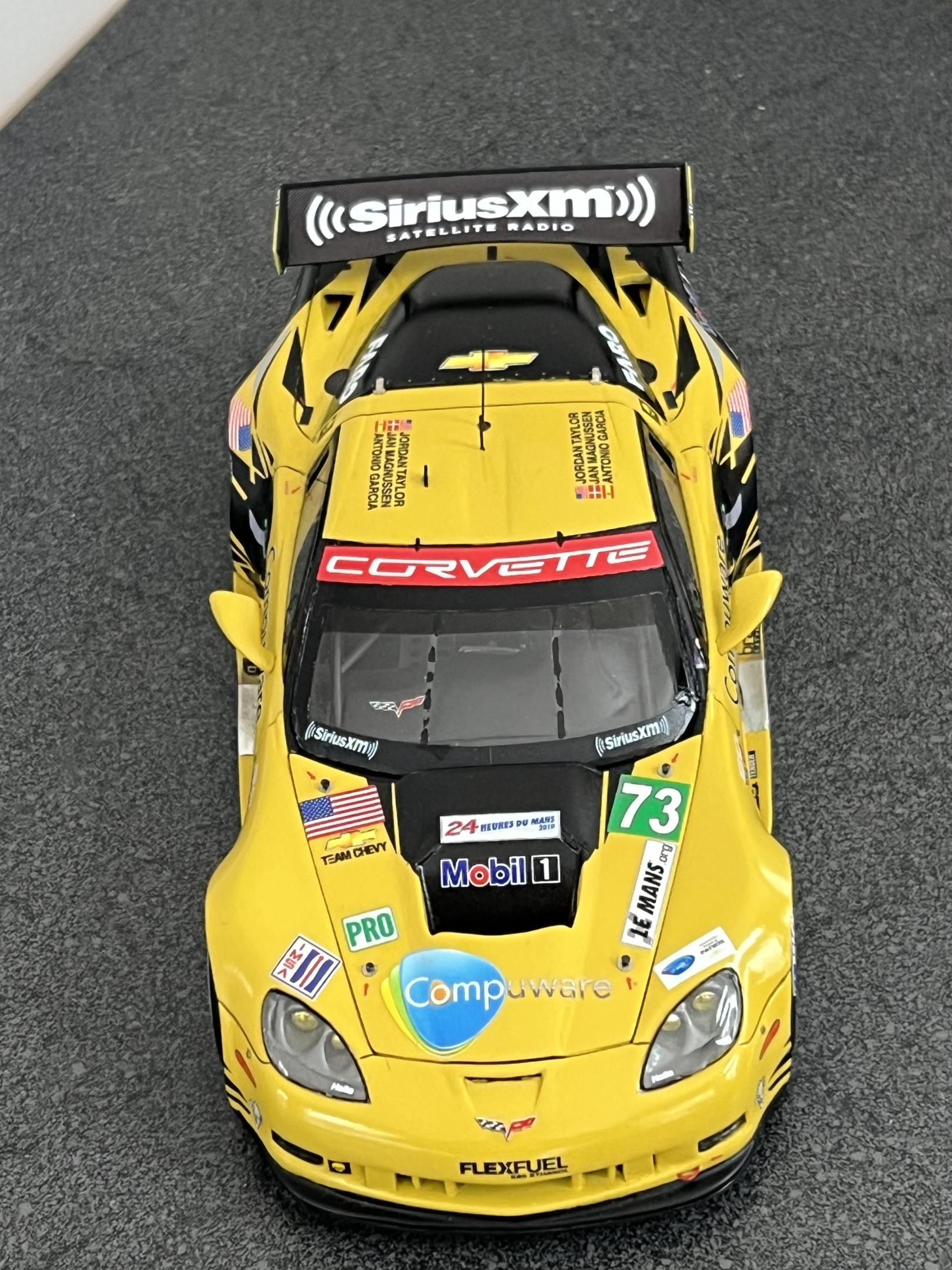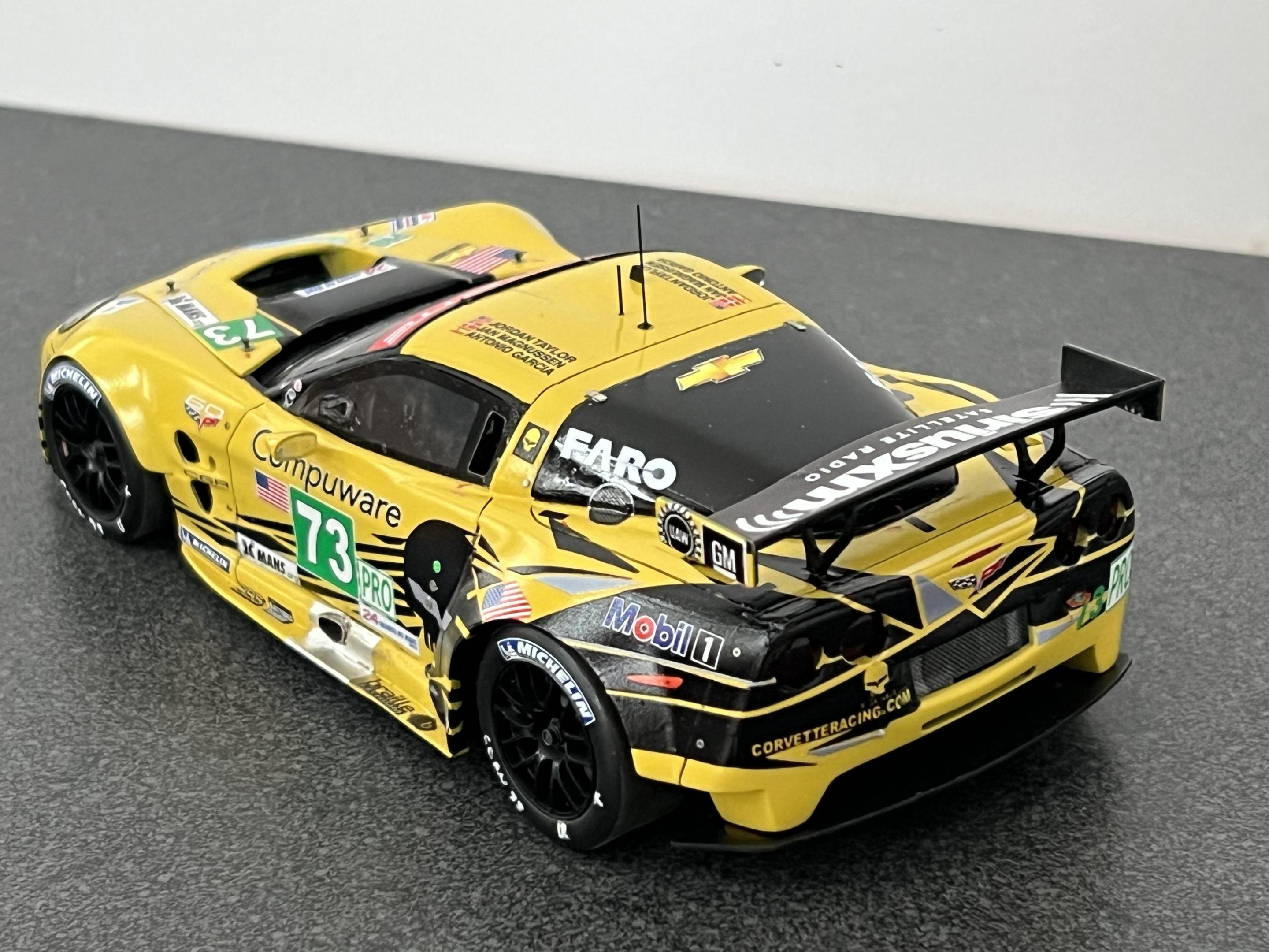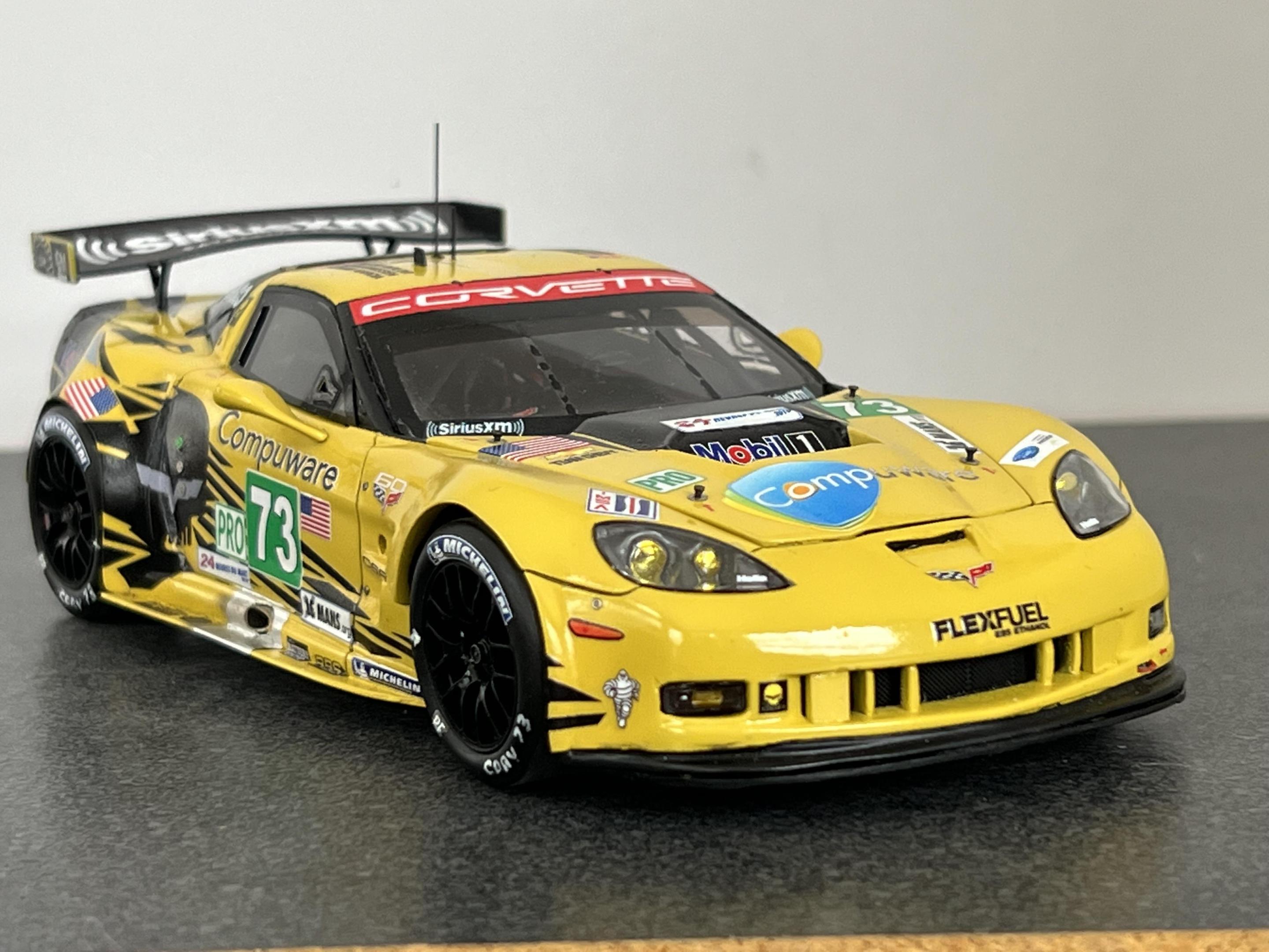 Finally completed the Corvette C6R-ZR1, #73 car, as raced at the 2012 LeMans. The model is in 1/25 scale and uses a Revell ZR1 body as the base, that was mastered by Jay Savarese; The C6R kit by Scale Motorsports donated the chassis, interior, and engine and photoetch parts; a Revell ZR1 kit donated the front and rear 'glass', the headlight and driving light lens covers and a C7R kit donated the outside rear view mirrors and the rear deck wing and struts. The main 'Jake' livery decals were from Pattos Place and other various decals were used. More detailed build info can be found in the 'WIP' section of the forum. Appreciate any and all comments!
