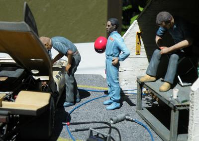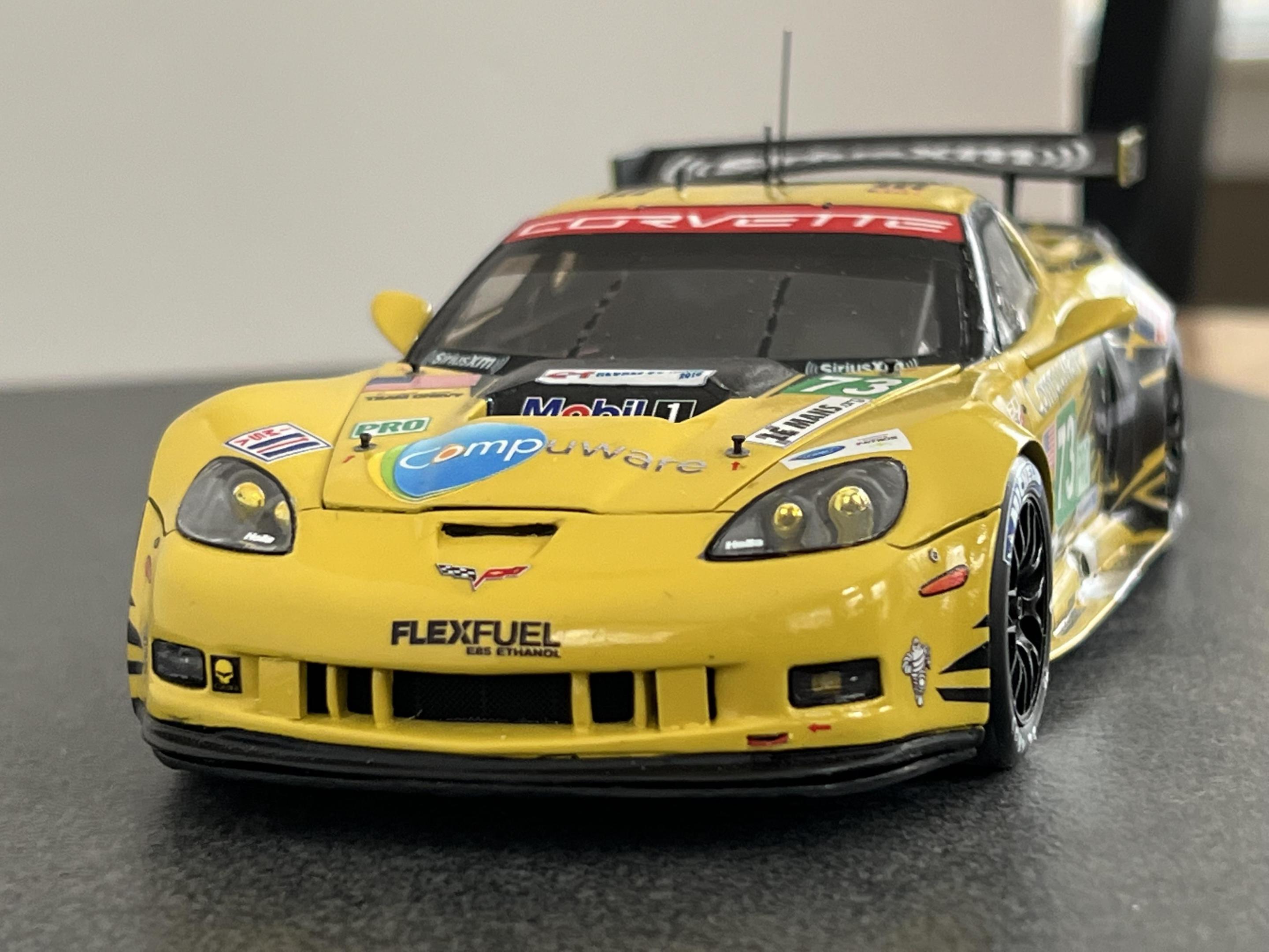 Another two at once build. Both Revell kits that were painted the same base color..Tamiya TS-34 Camel Yellow. This was done to match the rest of my Corvettes that are also pictured here. The subjects of this build are the 2001 LeMans entry C5R and the Bad Boy Corvette that was entered at the last 2007 ALMS Laguna Seca event. Although both kits had a lot of similar painting to be done the similarity ended there. Considering they were both Revell kits they were vastly different. That's because one was a Revell of Germany (C5R) and the other a domestic release (C6R) Much more information in the picture captions. Thanks for looking. . Chassis on the C5R. Very well detailed engine and interior. For some unknown reason the hood was molded shut. Thought about opening it but cutting around the cowl and hood vents seemed daunting. So I made the whole body removable and then there is this picture. Rear veiw ov the C5R chassis and even more detail. Most of this is visible through the rear window. Chassis on the C6R. Very basice engine that is mostly covered by the intake. Hood is removable on this model ...but why. I thought the interior of the C6R was pretty decent so I took this shot. Body is removable on this build too. Both builds complete. Made the wheels steer on both and lowered the front stance slightly. Bad Boy Vette decals were from Scale Motorsports and they went on very nicely. Rear end of both cars showsdifferent approach to the diffuser and other details. The C6R had one of its radiators in the rear. Note the two pins at the bottom of the body. There are two on the other side and they insert into the chassis bottom to hold the body in place. This was necessary as the body did not fully drop onto the chassis. A common problem as gluing was never going to hold. Also note the black ribbon decal on the left front fender. This was done to honor Dale Earnhardt Sr who drove this car at the Daytona 24 Hours and tragically lost his life at the Daytona 500 Nascar race. Those hood vents were a lot of fun to open. Special Bad Boyvette graphics. The yellow in the decals did not match the Tamiya TS-34. I mixed Tamiya clear yellow and orange and thinned it slightly. Two thin coats and they came up on color. I did not plan this from the beginning but luckily solved the problem...whew!1 The wholle tribe of endurance racing Corvettes. All of these are Revell kits with the exception of the GTP Corvette in the back. Believe it or not this is a toy I found at a flea market and is a fair representation of the model.. I have the very rare Quik Skins resin kit of this car in the works. The 1/64 diecast of the C6R is a Green Light release and is pretty darn accurate.