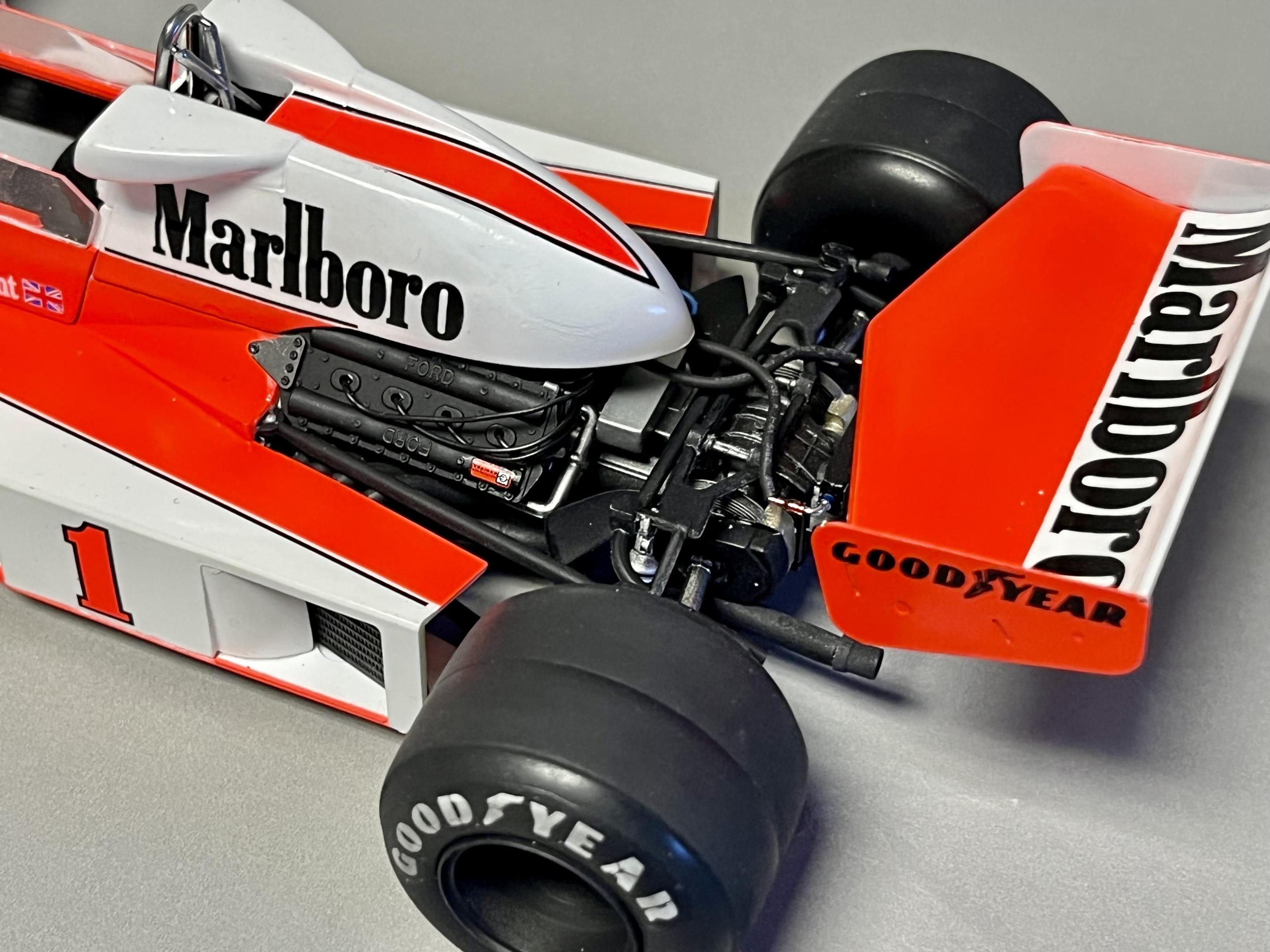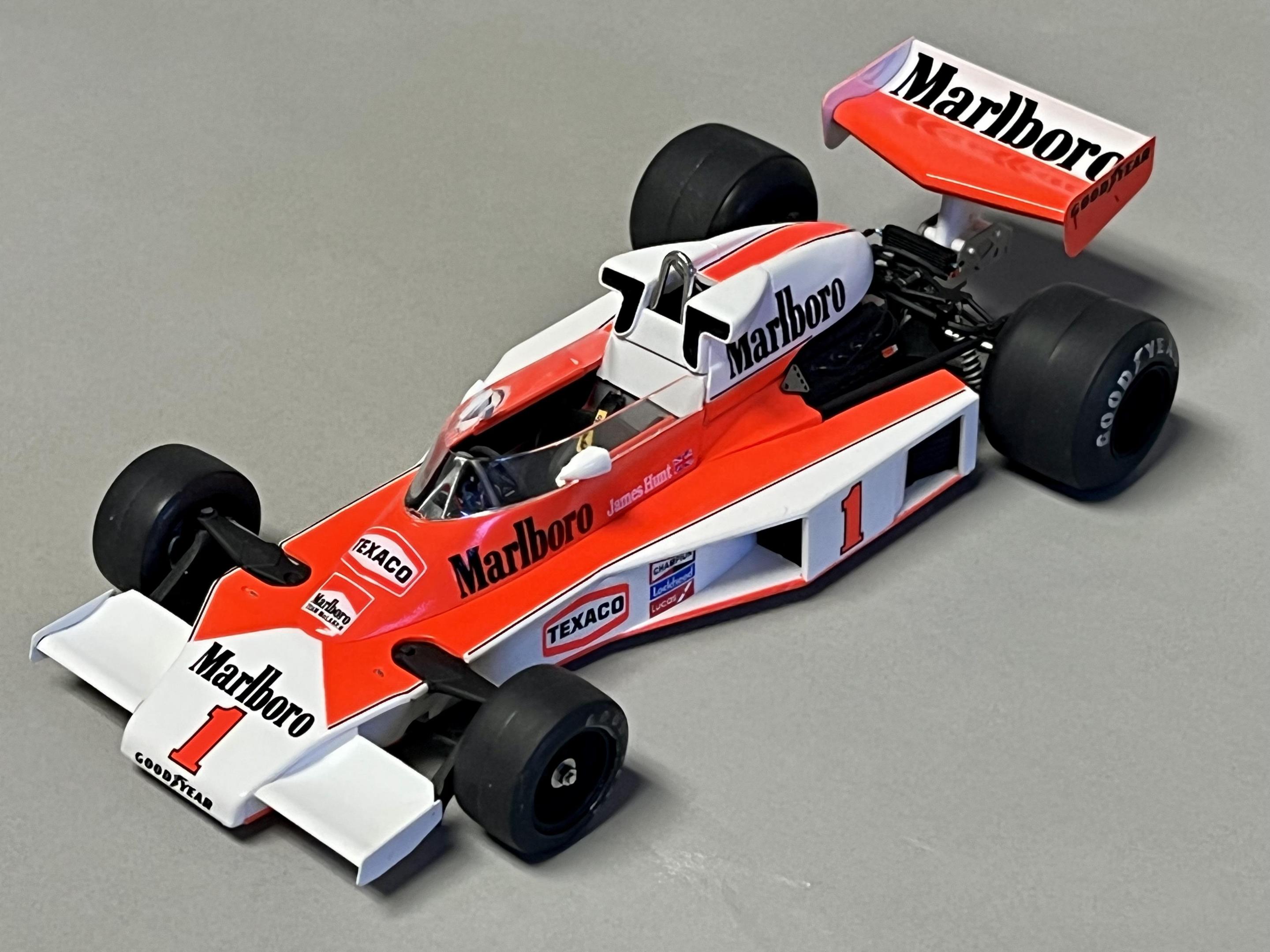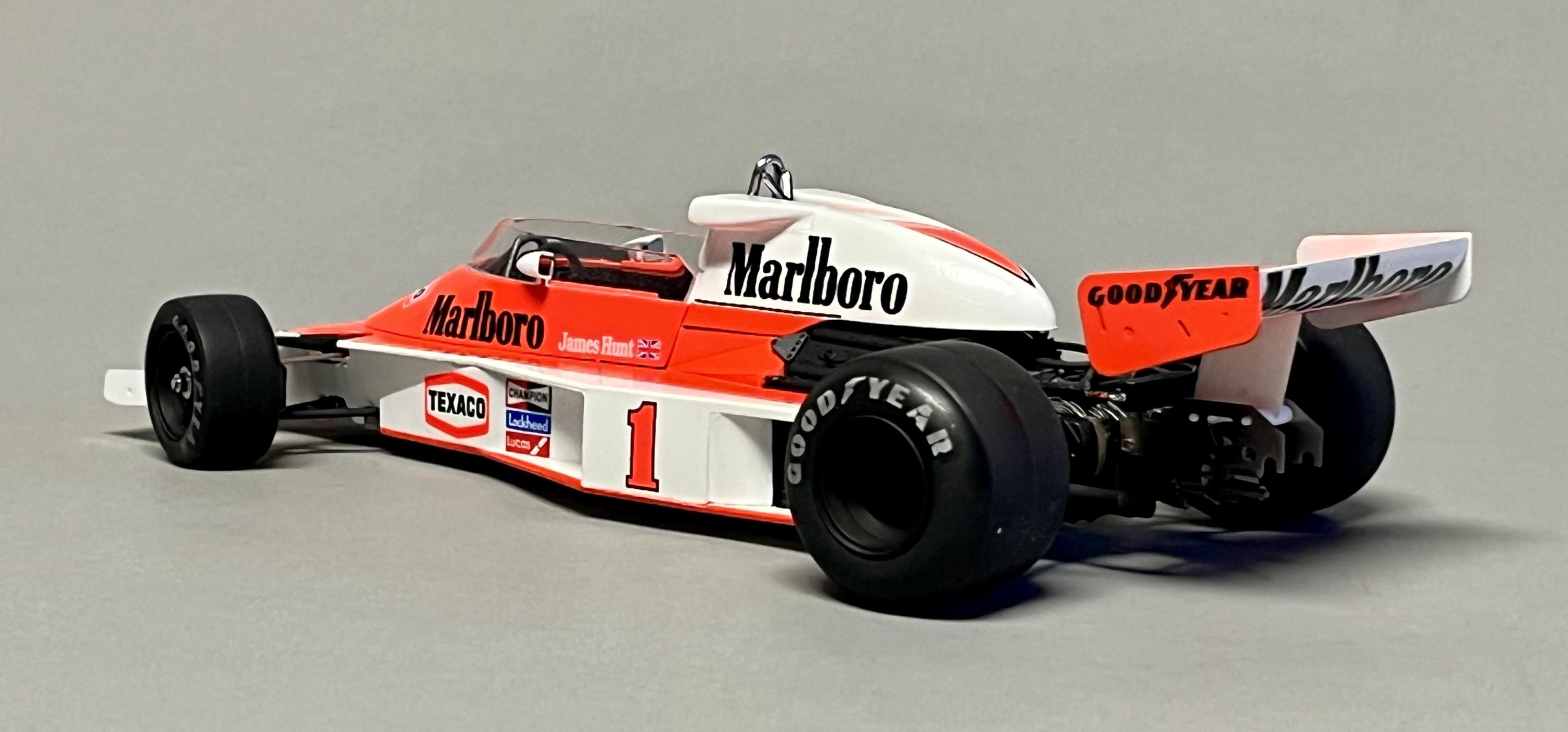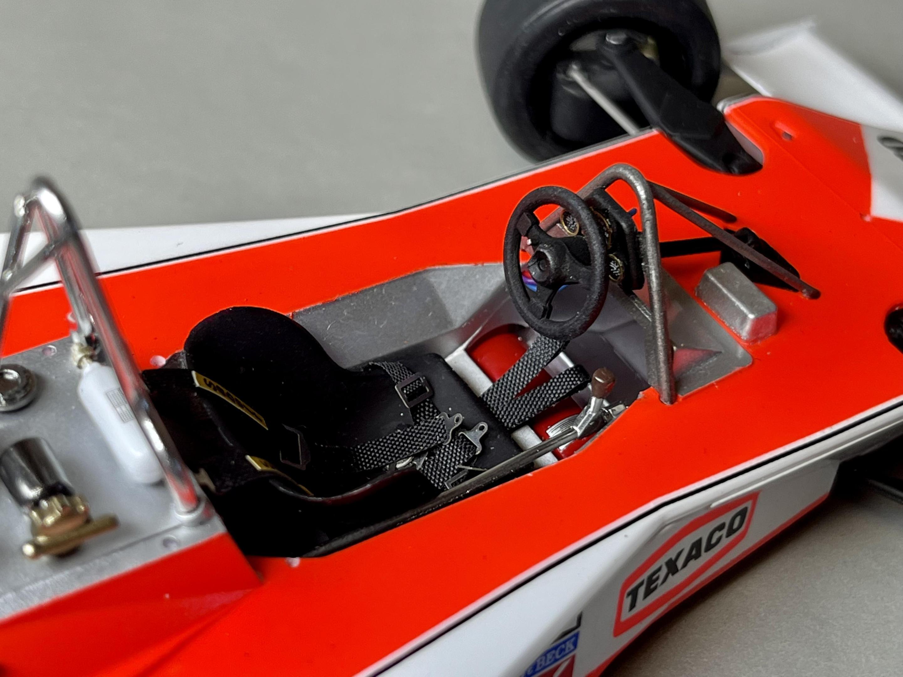 This is built from the re-issued orange box kit to which I added the Tamiya photo-etch set and after-market cigarette sponsor decals from MSM Creation. The exterior was airbrushed using red and white McLaren colors Zero base paints. All of the kit chromed parts were oven cleaner stripped and re-metallized using Alclad over black lacquer. The remaining parts were painted using airbrushed Tamiya acrylics per the instruction call-outs. This is the first kit that I have clear coated using airbrushed Mr Color “Super Clear UV Cut” lacquer and self-leveling thinner (50/50) which, unlike Tamiya TS-13 clear coat that I’ve used on past builds, had no effect on the decals - I’m sold! I added MFH fuel lines and additional black shrink tubing oil cooler lines and fittings and seat belt material from Tuner Model Manufactory (unfortunately I only had black, they should be blue). This kit went together seamlessly until I installed the roll bar and support after which the cockpit and engine cover location pins refused to fit into the mating holes on the lower body shell. I was able to fix this by removing plastic from the rear white crossmember on the cockpit cover which was interfering with the front of the roll bar. Otherwise typical Tamiya smooth going. I like building classic race cars that I actually saw race in the period - this one with James Hunt and Jochen Mass driving in Long Beach in ‘77. Between these 1/20 Tamiya seventies F1 kits and the 60’s -70’s 1/20 kits from Ebbro and Hasegawa, I have built seven thus far and have another 8 - 9 in my stash. Even built OOTB, I find this 1/20 scale ideal for creating detailed models of these classic racing machines without taking up a lot of shelf space (or box space in the closet in my case!). Hope you like this one. Cheers, John