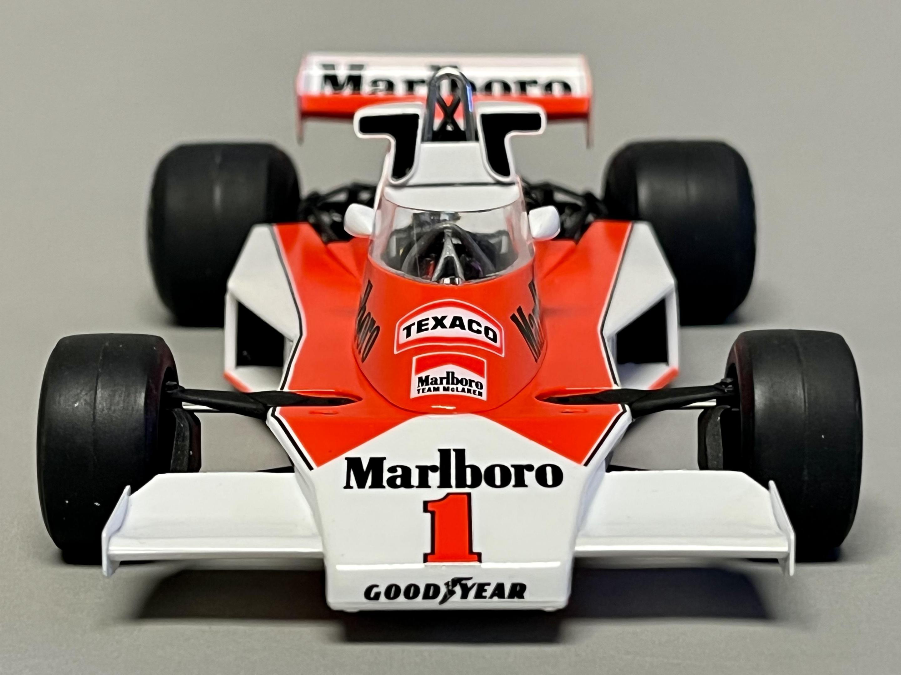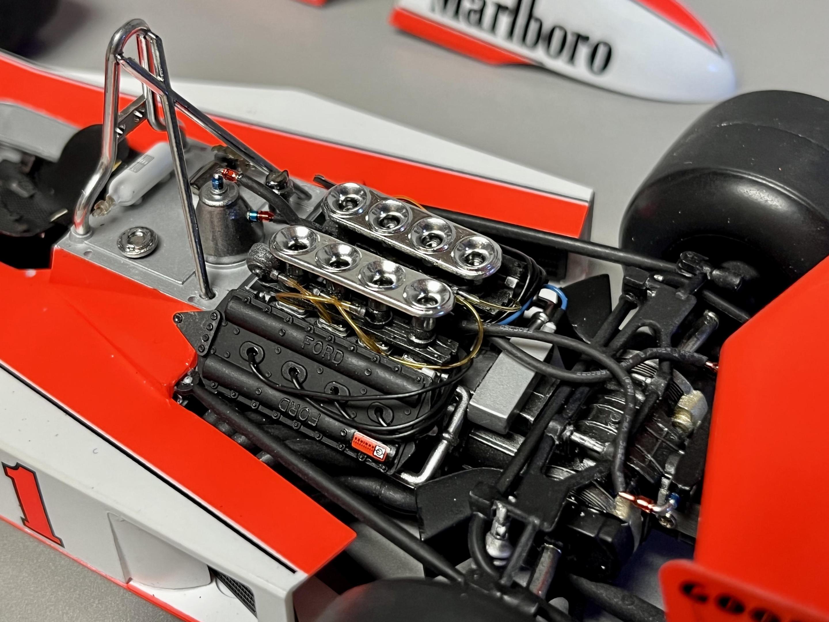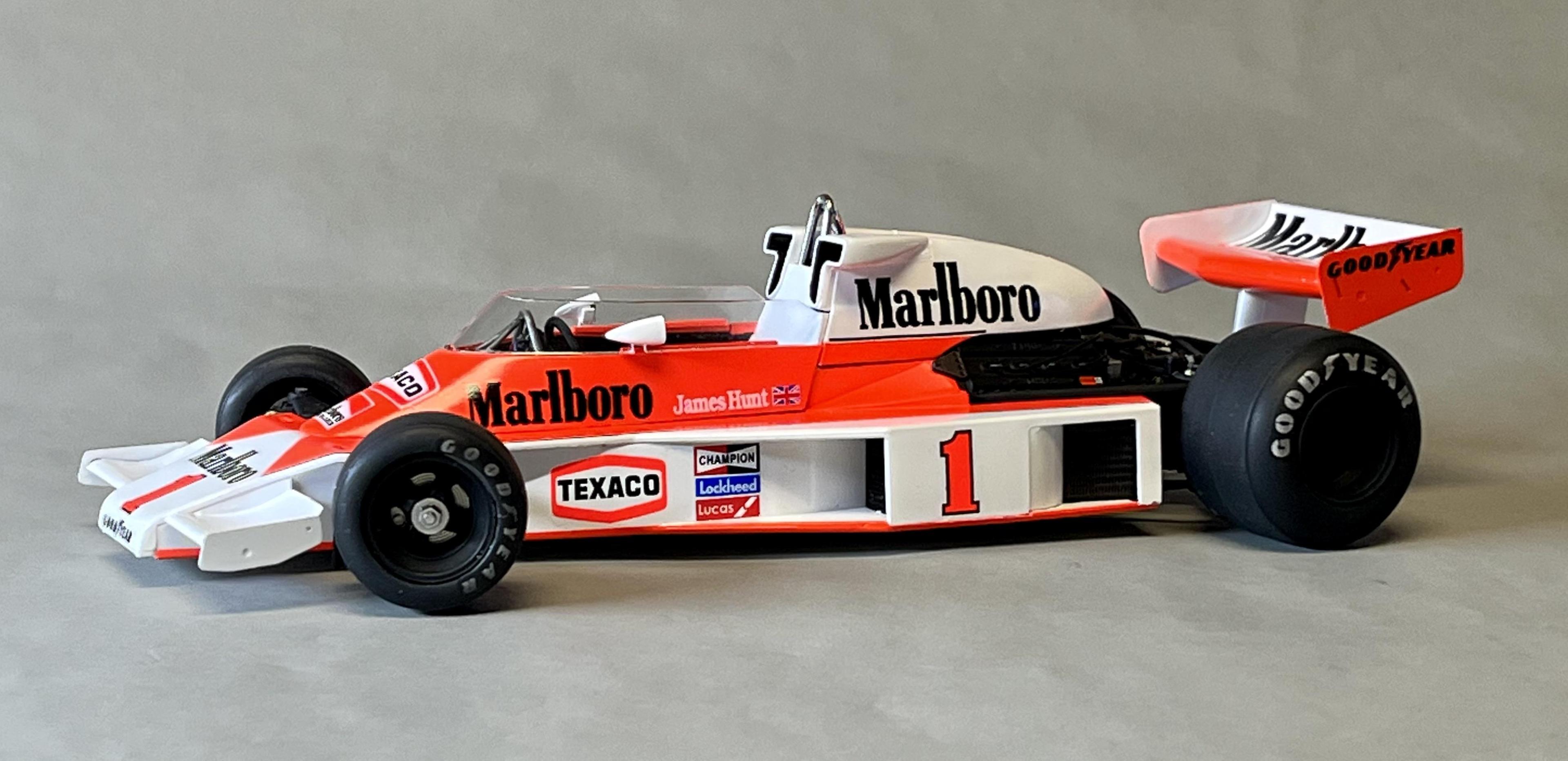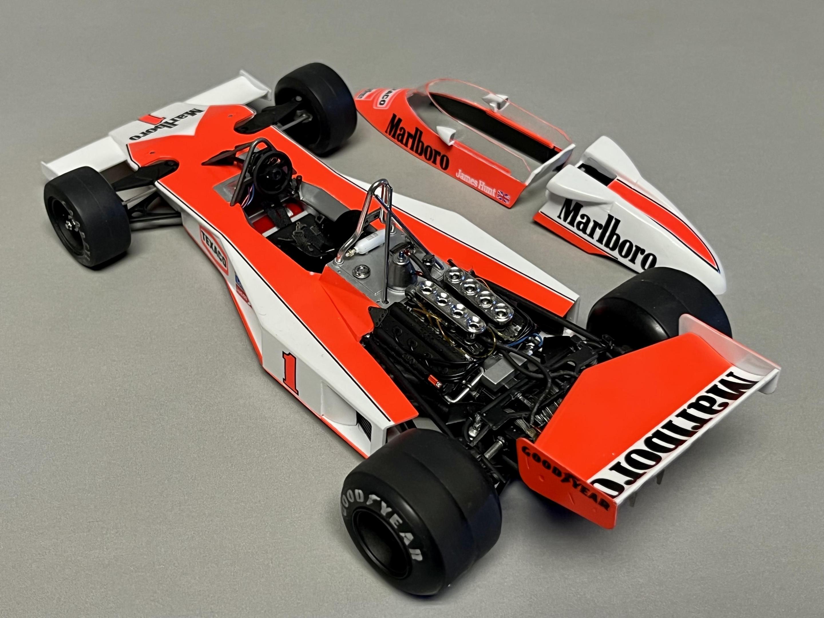 This is built from the re-issued orange box kit to which I added the Tamiya photo-etch set and after-market cigarette sponsor decals from MSM Creation. The exterior was airbrushed using red and white McLaren colors Zero base paints. All of the kit chromed parts were oven cleaner stripped and re-metallized using Alclad over black lacquer. The remaining parts were painted using airbrushed Tamiya acrylics per the instruction call-outs. This is the first kit that I have clear coated using airbrushed Mr Color “Super Clear UV Cut” lacquer and self-leveling thinner (50/50) which, unlike Tamiya TS-13 clear coat that I’ve used on past builds, had no effect on the decals - I’m sold! I added MFH fuel lines and additional black shrink tubing oil cooler lines and fittings and seat belt material from Tuner Model Manufactory (unfortunately I only had black, they should be blue). This kit went together seamlessly until I installed the roll bar and support after which the cockpit and engine cover location pins refused to fit into the mating holes on the lower body shell. I was able to fix this by removing plastic from the rear white crossmember on the cockpit cover which was interfering with the front of the roll bar. Otherwise typical Tamiya smooth going. I like building classic race cars that I actually saw race in the period - this one with James Hunt and Jochen Mass driving in Long Beach in ‘77. Between these 1/20 Tamiya seventies F1 kits and the 60’s -70’s 1/20 kits from Ebbro and Hasegawa, I have built seven thus far and have another 8 - 9 in my stash. Even built OOTB, I find this 1/20 scale ideal for creating detailed models of these classic racing machines without taking up a lot of shelf space (or box space in the closet in my case!). Hope you like this one. Cheers, John