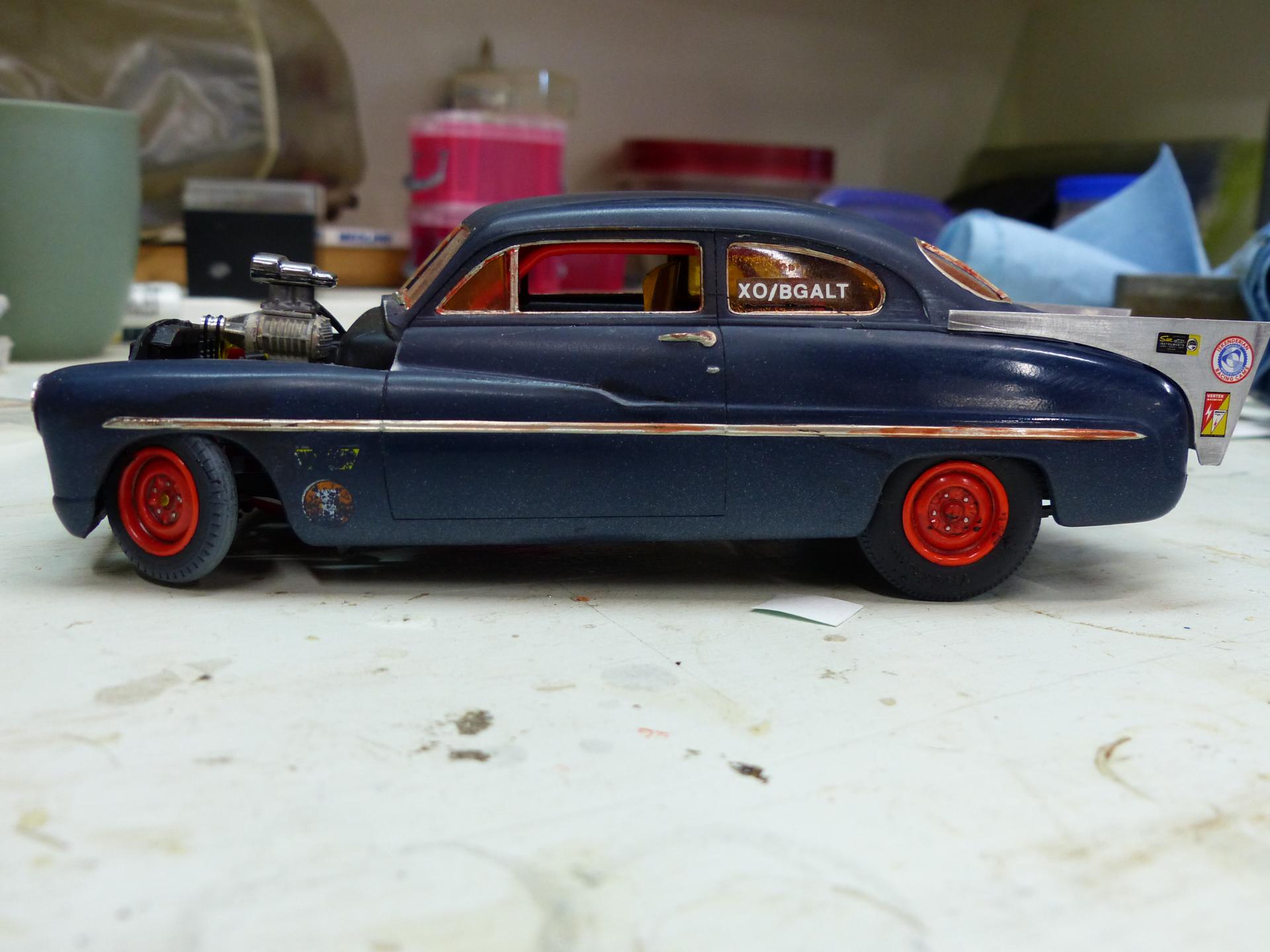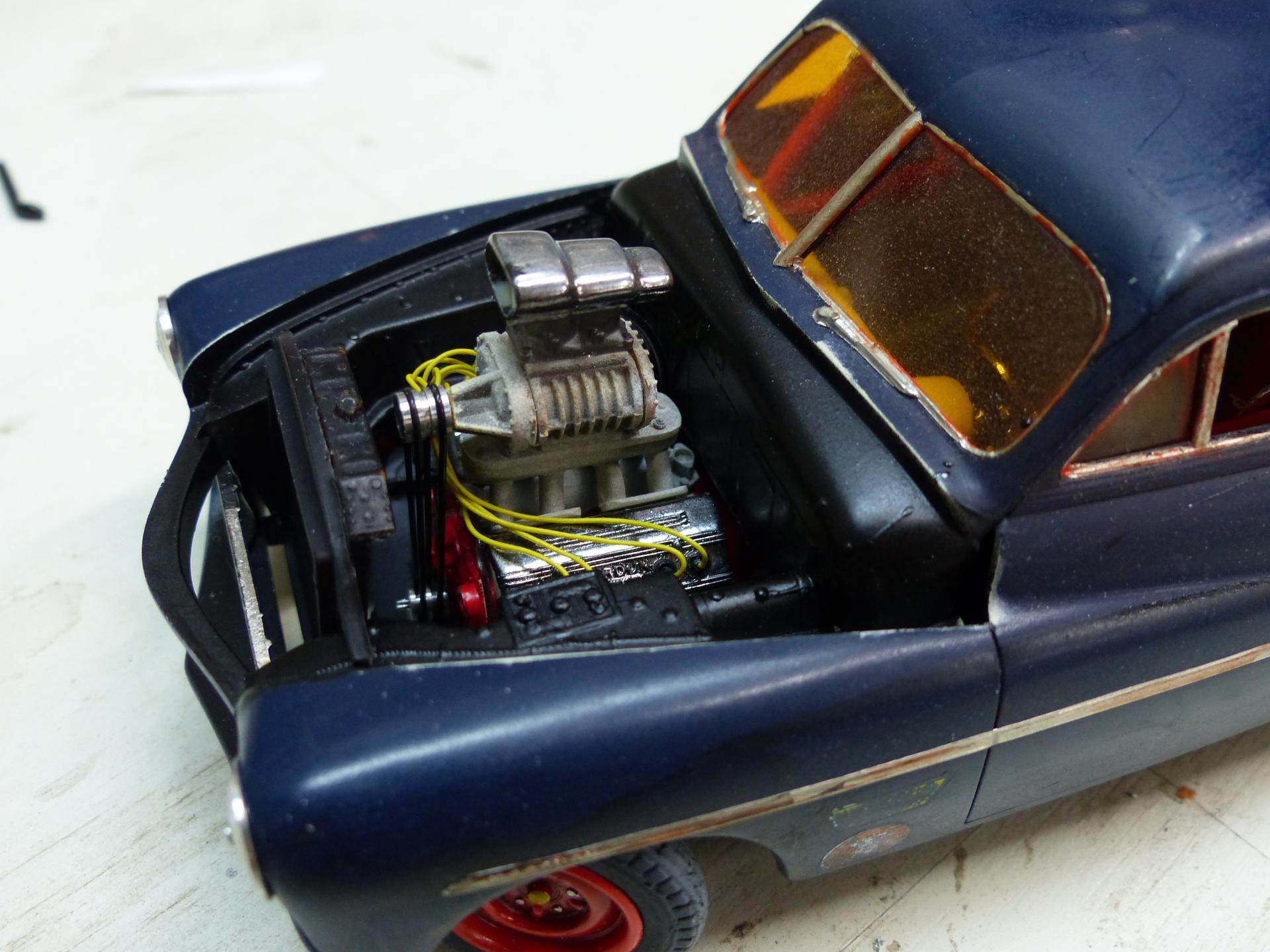 I know a lot of you guys will have built either this, or the chopped version, so you'll know how nice this kit goes together. Anyone who's wondering if they should build one; Do yourself a favour and buy this kit. I've been used to old kits and re-pops of old kits, where the tooling is dodgy. But this is like a Tamiya kit in its engineering and moulding. The decals are also some of the best I've ever used. That said, the review in ModelCars Mag, proved to be very useful, especially when highlighting symmetry issues on the front end. All of the following photos are from my phone, so please excuse the quality. Body issues dealt with. Rattle-can primer. One of my favourite parts of building a kit, is the engine. I added a rudimentary attempt at a fuel system (it looks ok to the naked eye). I made the fuel filter from clear sprue, tinted with a yellow and silver Sharpie. I drilled out the kit distributor and added plug wires. The coil was about to be added after this photo I decided to make the Woody more 'surf'. So I gave it hibiscus upholstery . Here's the rear seats too The engine got some wires to the alternator and a basic throttle linkage. These Caddy engines are nice to detail.