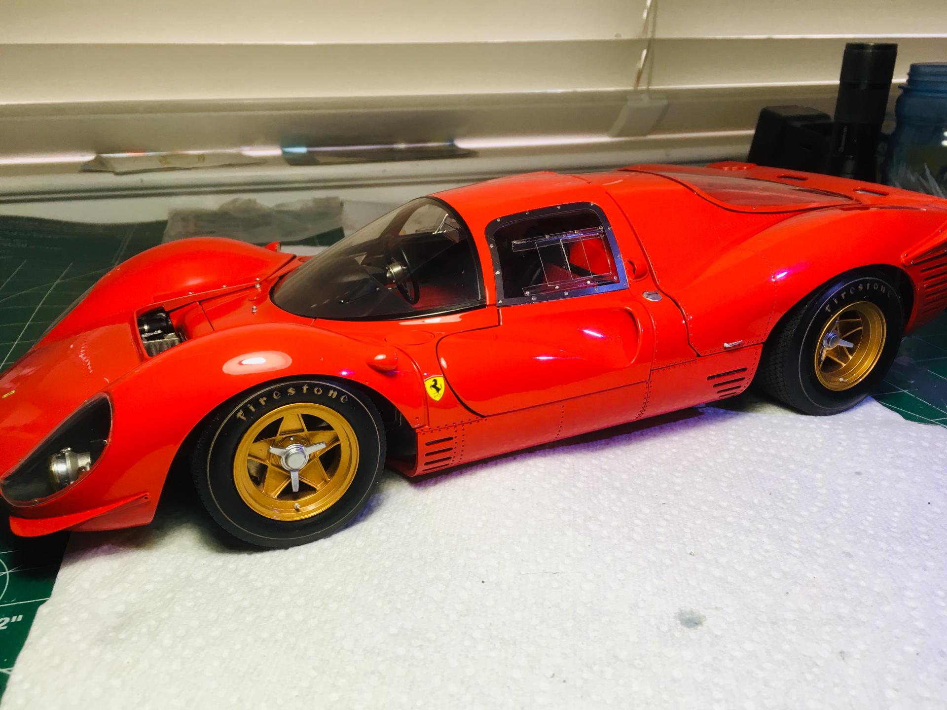 Model factory hiro Ferrari P4. Pretty much out of box. Water based automotive paint with urethane clear.Not glamor pics just on the work table.Hope you like