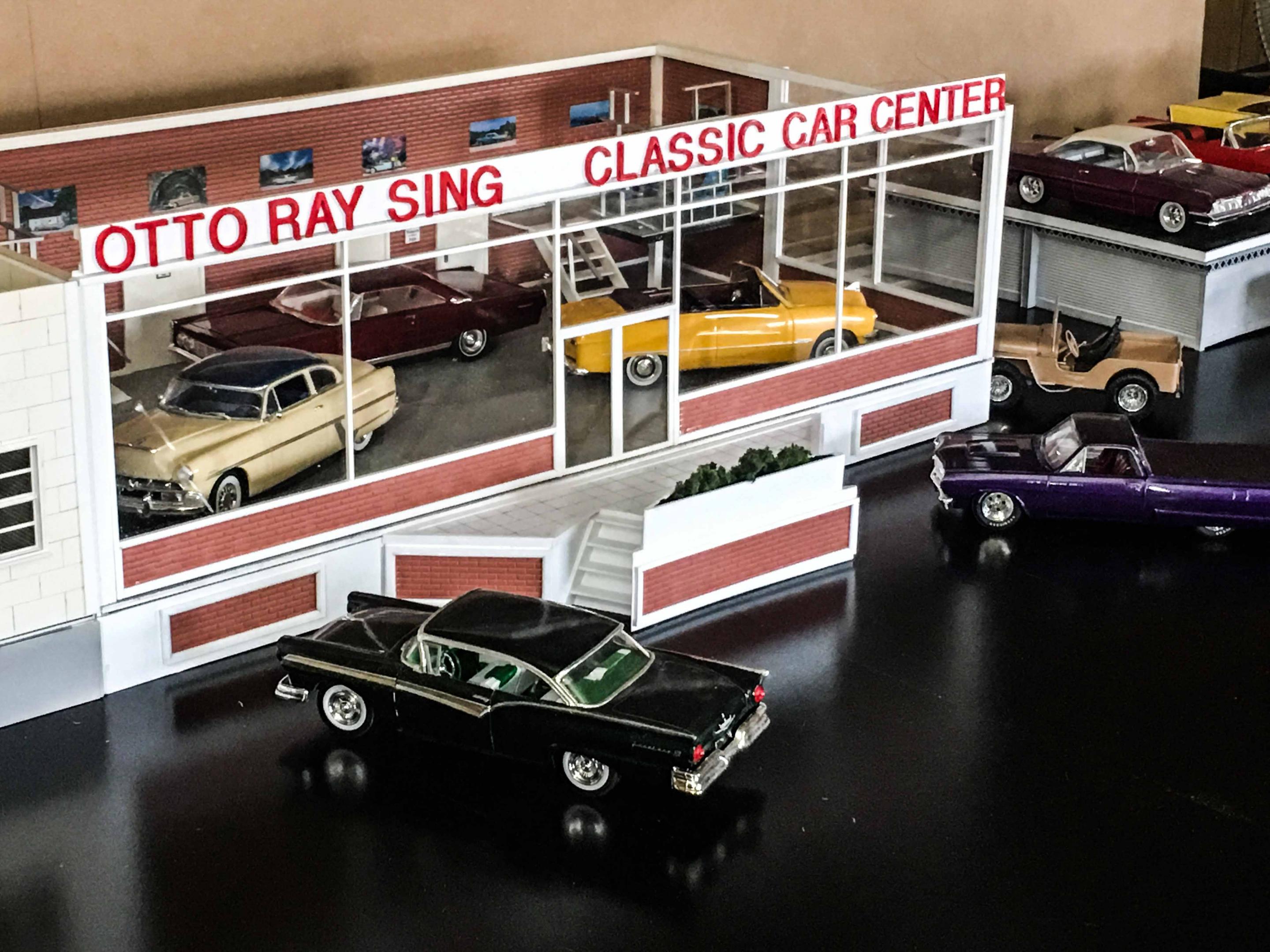Welcome to the current Otto Ray Sing Classic Car Center. After rather humble beginnings, and now under new ownership, the business has expanded and become even more efficient. The garage area is much larger than the previous versions, and results in more efficient repairs, as well as increased customer satisfaction. The show room is large enough to display three cars. It follows the mid-century modern theme and allows customers to view their dream cars at all times.. The dealership is inviting and always stocked with beautiful cars to please any taste. Actually, there is one detriment. In front of the garage is a cement walkway, that has so far, resisted all attempts to remove it. These two workers will attest that it is much easier to stand around and look at it, than it is to perform the exercise in futility of trying to remove it. Management had a sense of humor when they put up the restroom signs. The entryway to the showroom was also well thought out to draw customers eyes to the vehicles found within. A classic car is always in view while approaching the building. This is what I call a 'photographic diorama', as the purpose is for it to be able to have scenery, vehicles, & figures changed to suit the needs of the vehicle being photographed. I will be adding a history to this as well as introducing figures, etc, if there is interest.