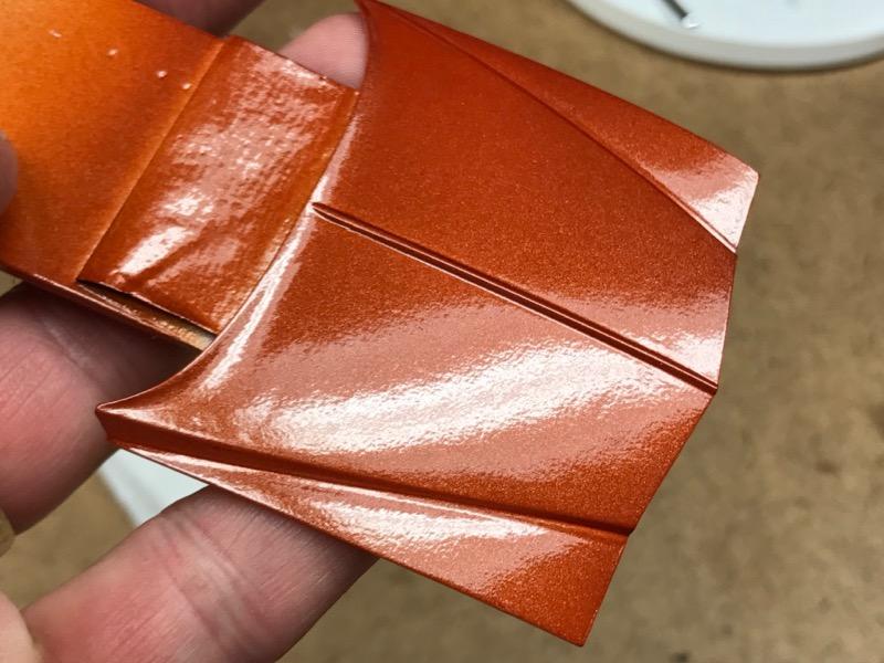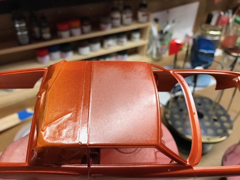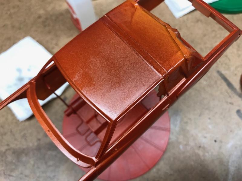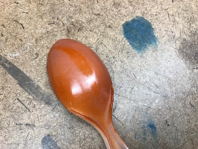 So I'm having another interesting problem with Scale Finishes paint. I am not sure it is specific to that brand. Here is the story. First, spoons. I very often test paint on plastic spoons. I bought a box of 1000 styrene spoons and have bene using them for years. Lately, the spoons show a glossy/not glossy pattern on them - see the photo below. This is with MANY different brands of paint, so I assume it is something to do with contamination in the plastic of the spoon. I tested the Dark Camel color from Scale Finishes on a spoon, and it exhibited the problem. After I applied the paint to the car, I noticed the same problem. See the photos - there are non-glossy patches on the body. This is after several light/medium coats of the paint, and it looked fantastic wet. As it dried, it got blotchy. Notice the picture of the hood, though - it looks great. Yeah it's orange-peely but this is before any gloscoat or sanding/polishing. --> What is going on with this blotchy paint!? Does anyone have any insight? Hoping that gloss coat would make it look right, I took my test soon and put on TWO medium/heavy coats of alclad clear kote, then a very heavy coat. When wet it looked like glass, but after it dried - blotchy. So it seems that no amount of clear coat is going to fix this. It is possible that the hood has more primer on it than the body. I had to fill dimples and depressions, and to cover the putty and sanding it took more primer. Is that the key? A lot more primer? Any help you all can give would be great. Thanks.
