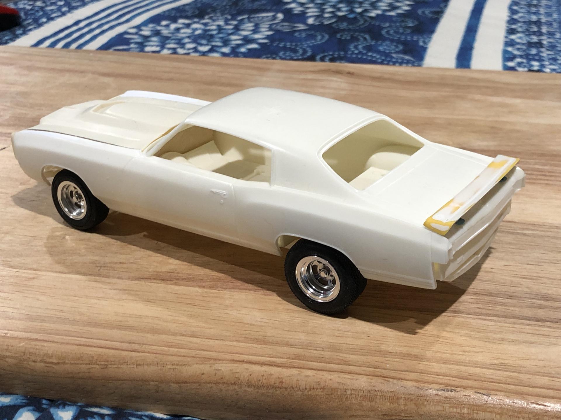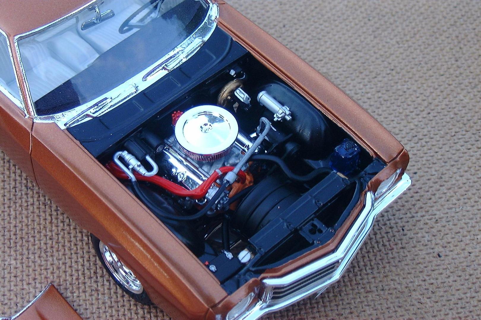 This Monte Carlo was built as a vague recreation of the copper Monte Carlo my dad had when I was a teenager. (Oh the stories that back seat could tell, LOL!) Anyway, this was an open, pre-painted kit I got on ebay. I didn’t like the purple, so I repainted it metallic copper. I usually build my models with the factory “High Performance” option which usually includes a special hood. Unfortunately, Monte Carlos were never offered from the factory with any hood other than flat. However, I learned that PSF Hobbies offers a custom 70 Chevelle Cowl Induction hood for this kit, so I got it. During the build, I had progressed about a third of the way through before discovering that the suspension pieces were missing. Fortunately, members of the DMPCC came through and gave me the missing parts I needed. The kit is surprisingly detailed for an AMT offering. It has details such as separate control arms for the 4-link rear and a complete multi-piece A/C system in the engine compartment. I also added chrome valve covers and air cleaner from my parts box. The gage faces have been decaled from a Keith Marks decal set.