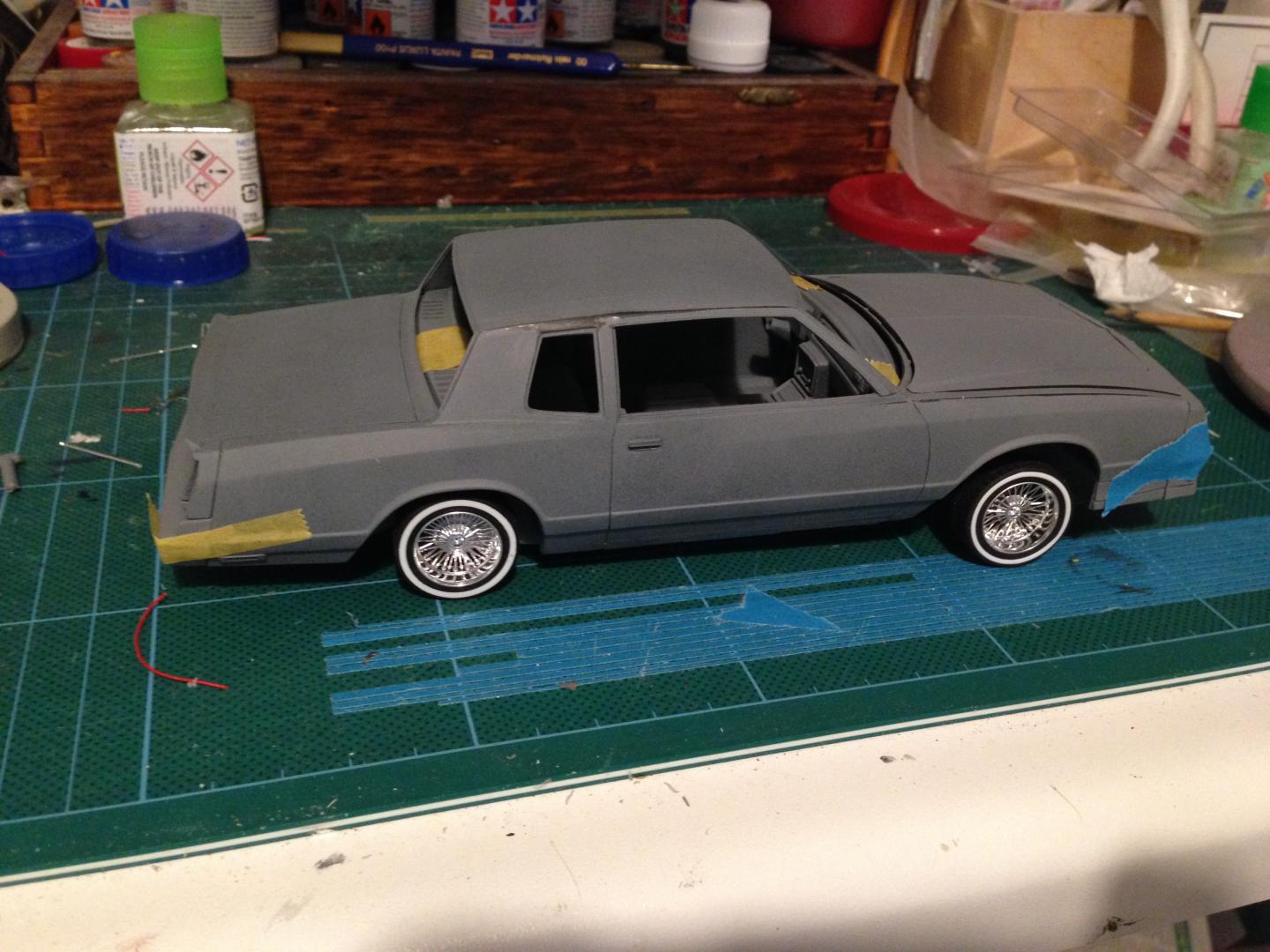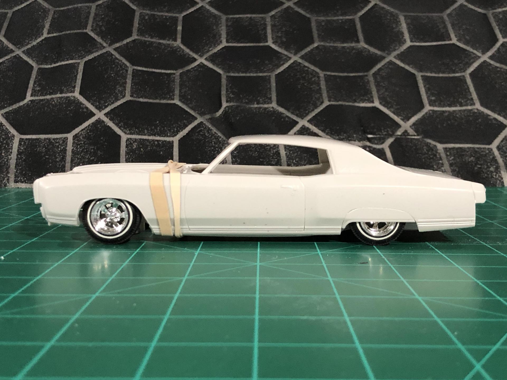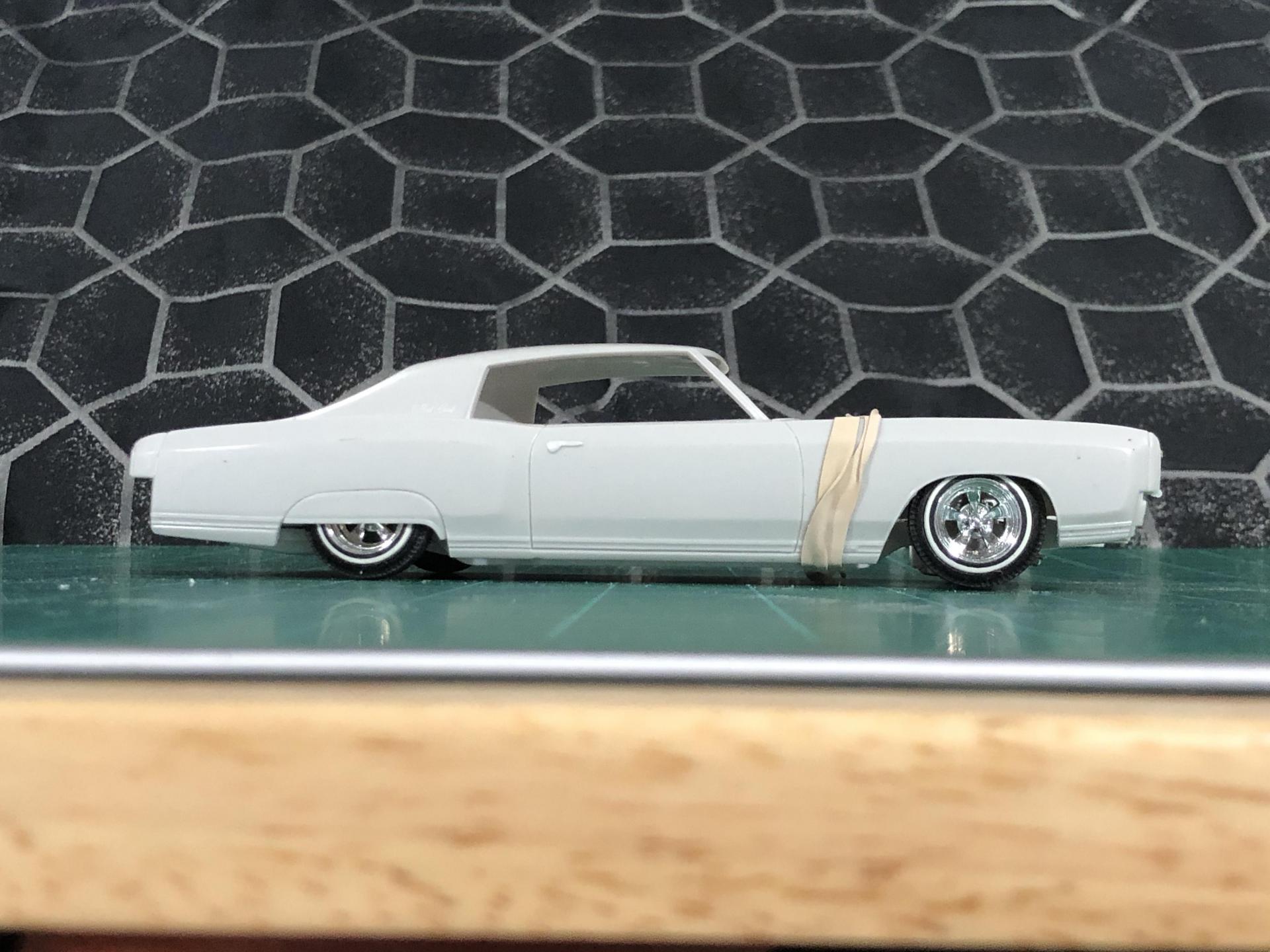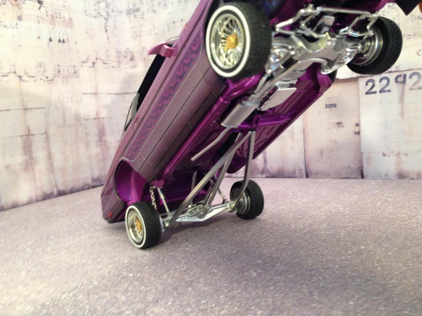 I’ve always admired the workmanship that goes into low riders. Especially the multi layered paint jobs. There’s a guy that shows his models at our local LIARS show and the NNL East. His work is fantastic and always inspires me. After seeing his work a couple weeks ago I’ve decided to dip my toe into the water and give it a try. I’ll be converting the 70 Monte Carlo into a 1971. I don’t know if I’m going to do a multi color paint job or maybe a two-tone. But I worked tonight on the ride height. I wanted it Looooooooow!