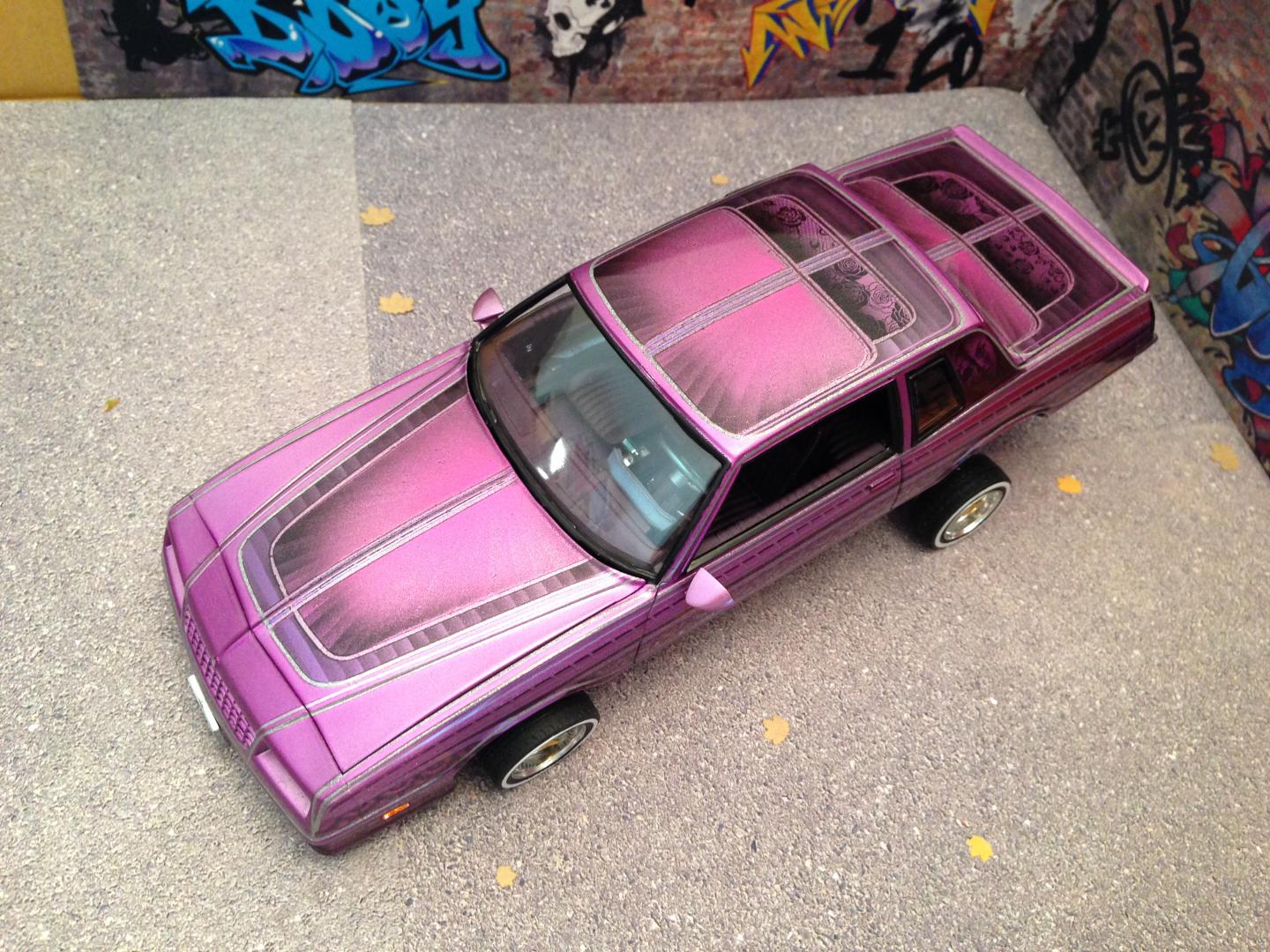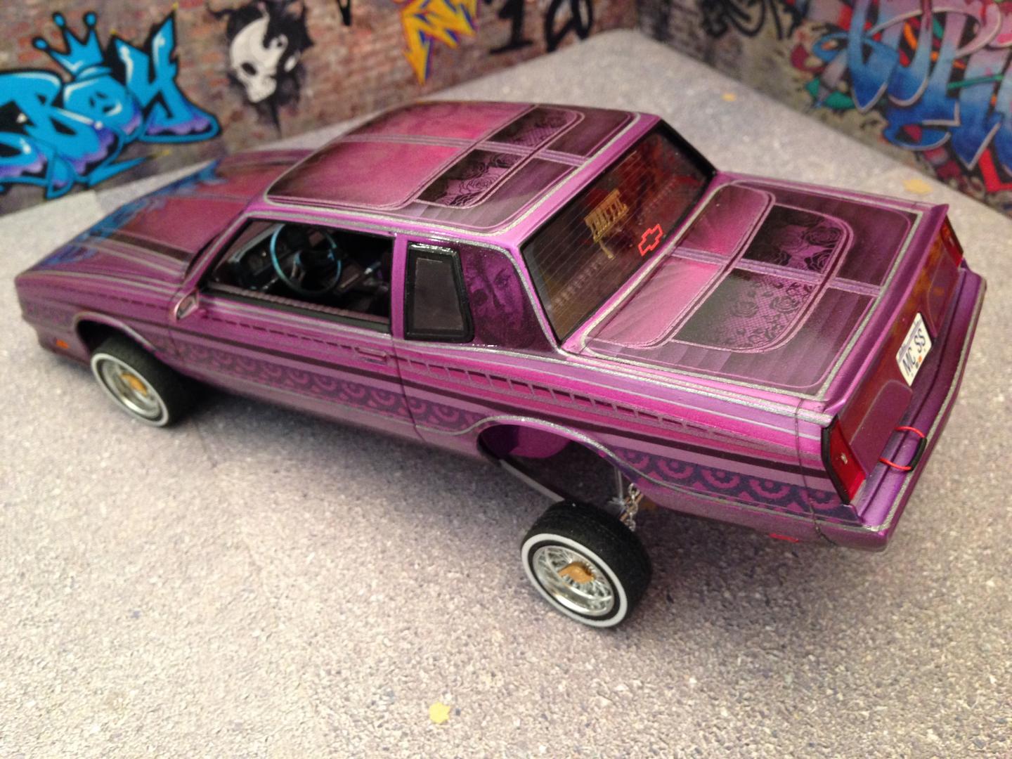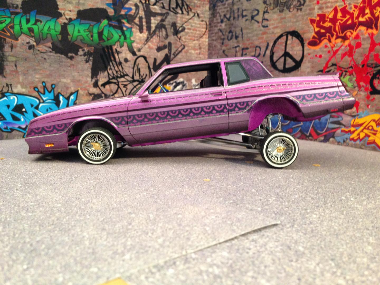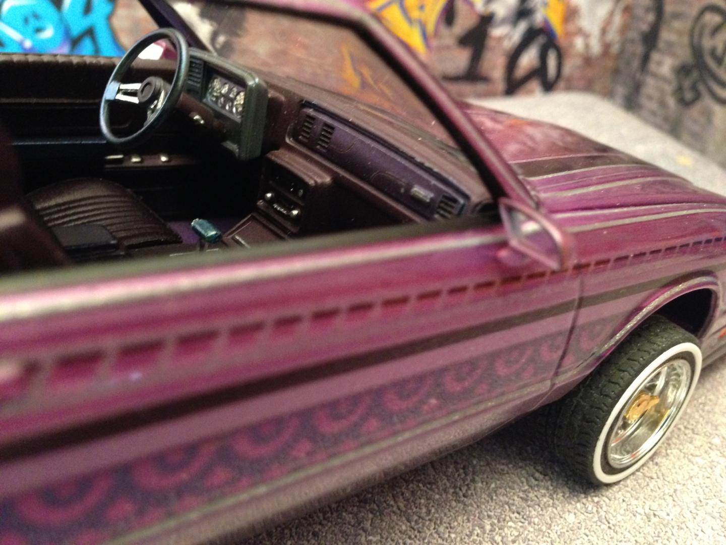 Just finished this Monte. I swapped out the rear axle for something with better detail, scratch built coils and hydraulic struts and made a 4-link suspension setup. Rides on Pegasus wheels and painted with automotive paint and nail polish. Flocked carpet with matching headlining.