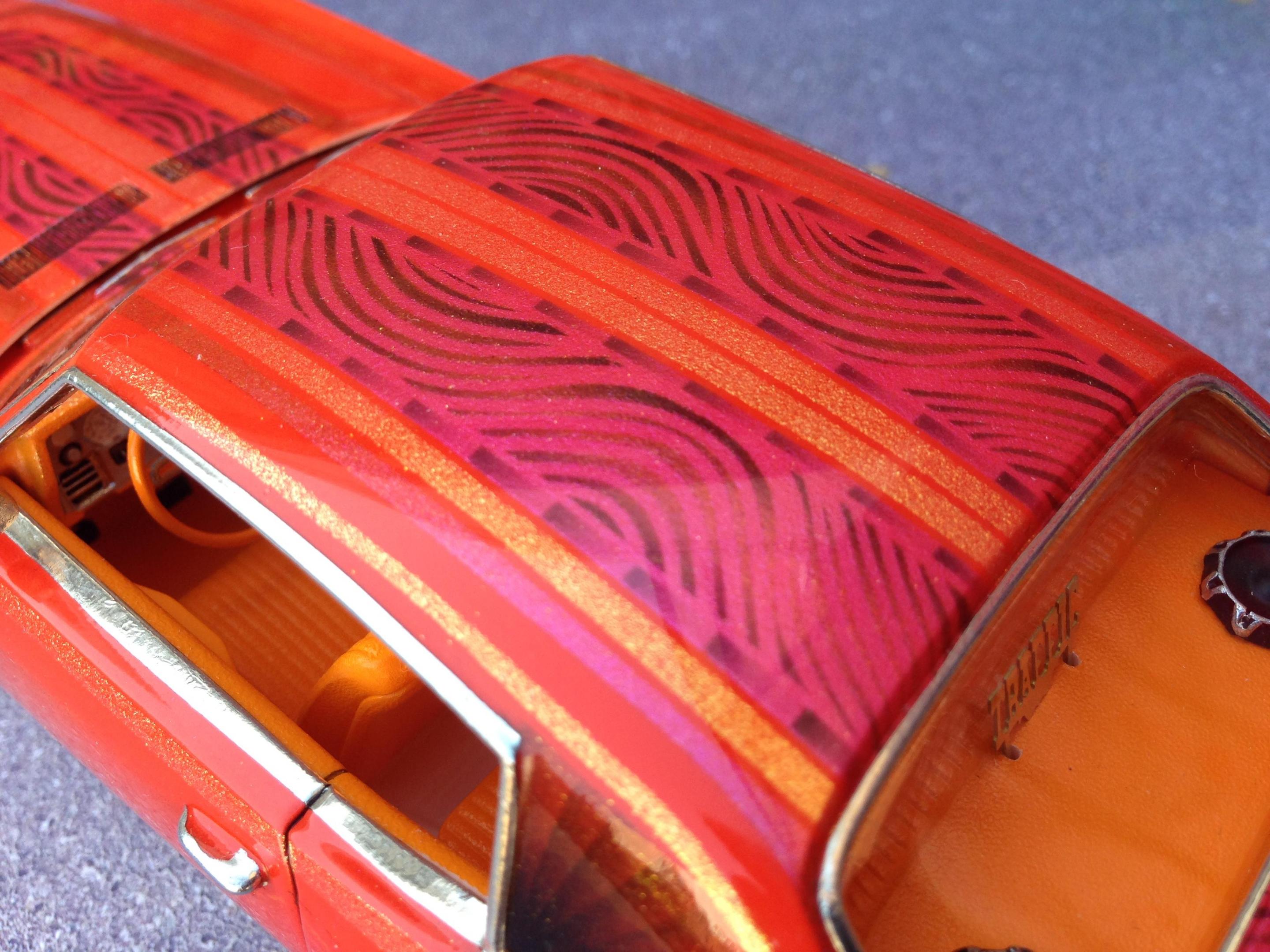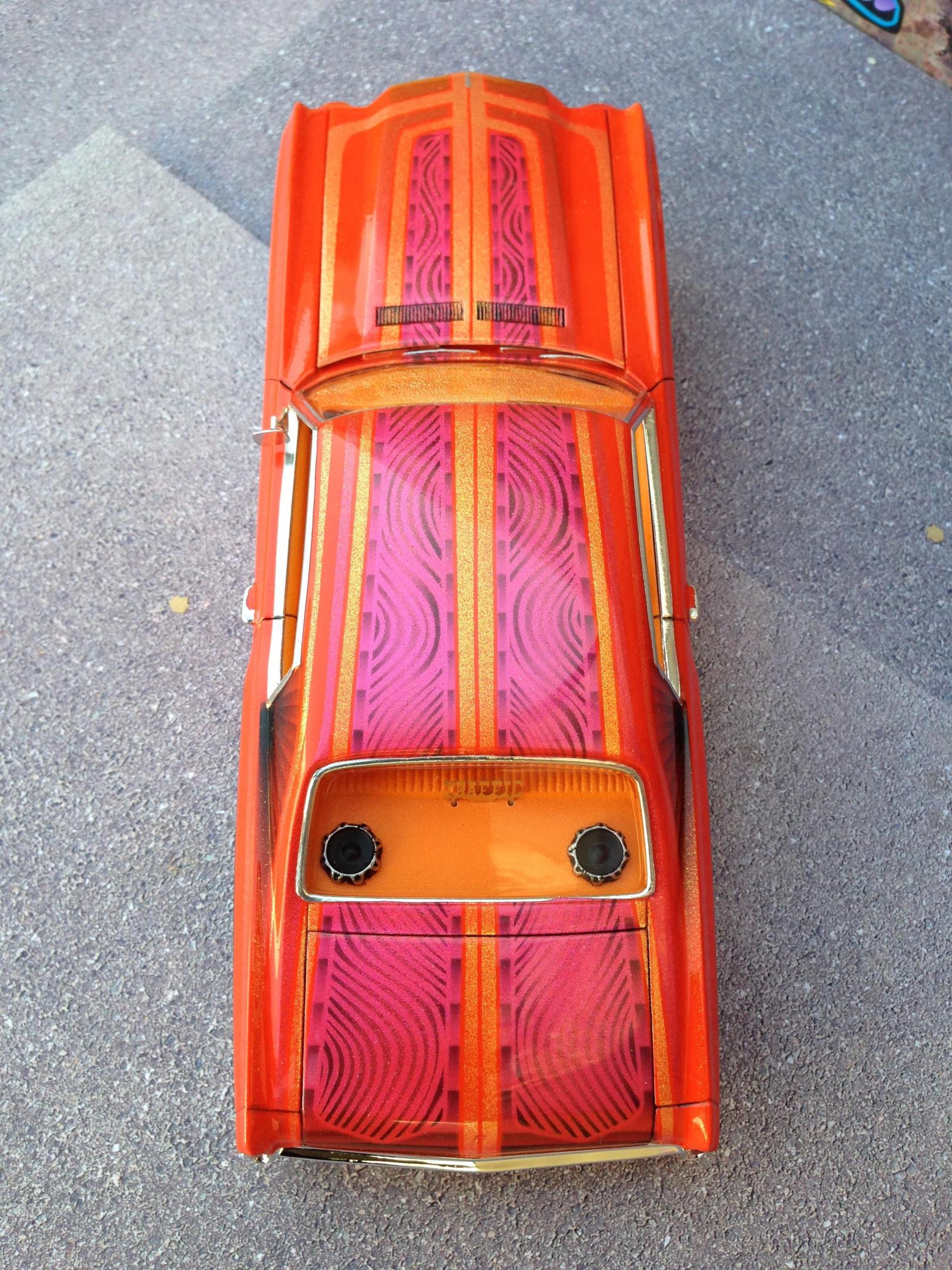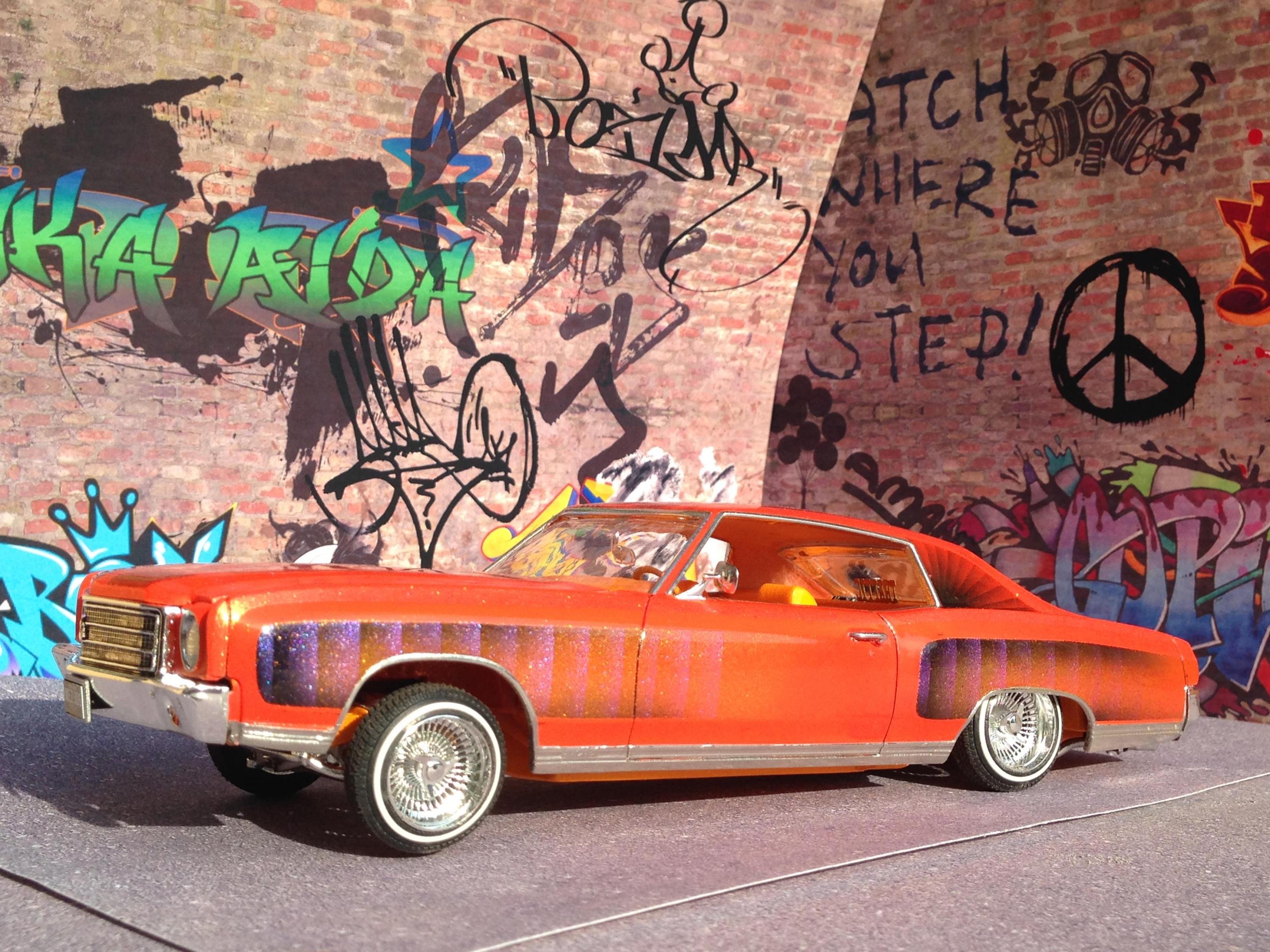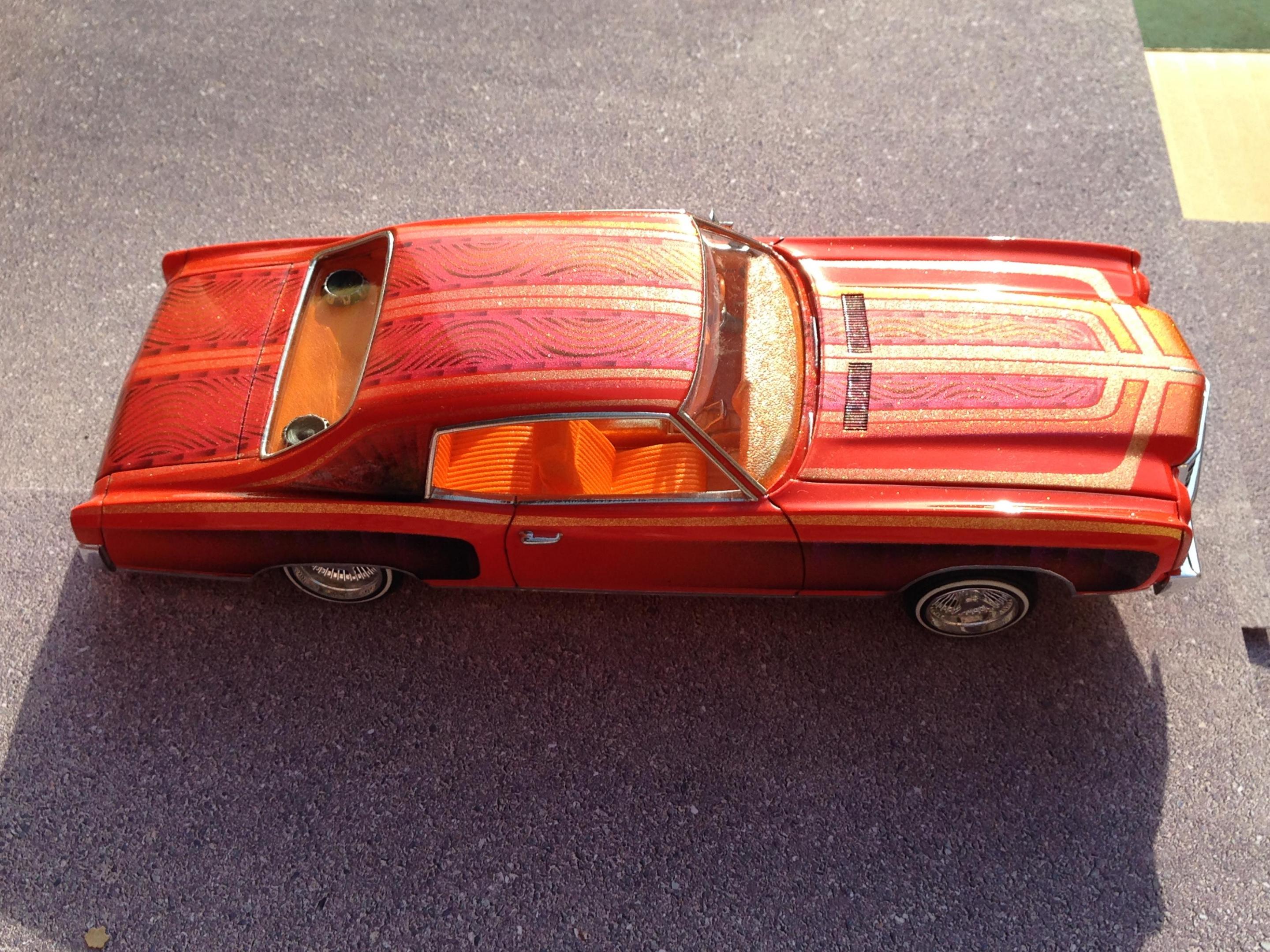 I can't seem to stop making lowriders at the moment. I'm obsessed or something. anyway, here's my go at a 1970 Chevy Monte Carlo. I reworked the rear suspension to drop it as far as the chassis would allow and converted it to a 4-link setup. Paint is all nail polish, with rattle can clear. It's base colour is orange, in case your screen makes it look red. The interior is Tamiya orange with some gold flake highlights. Any comments or questions are welcome. thanks for looking