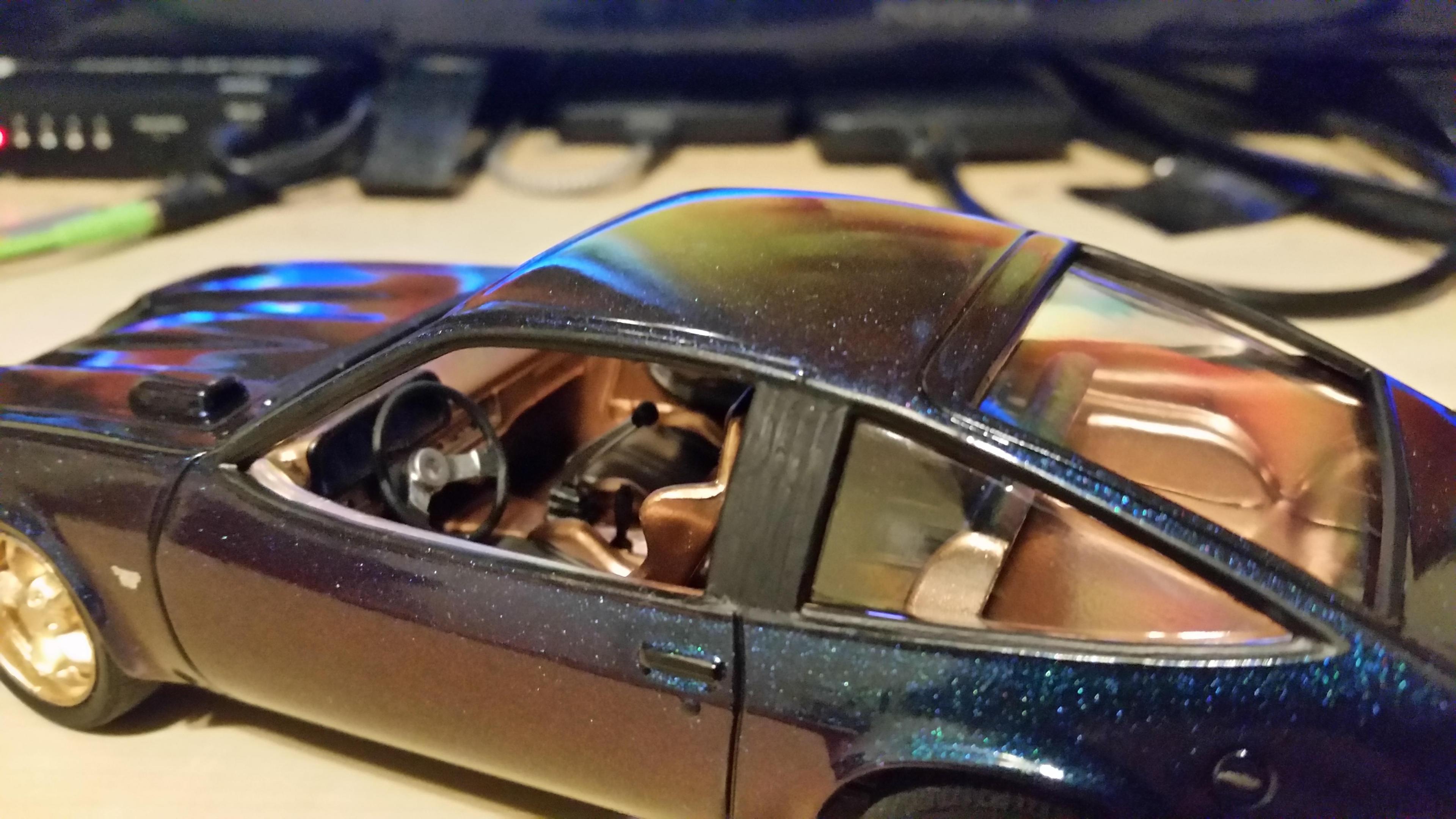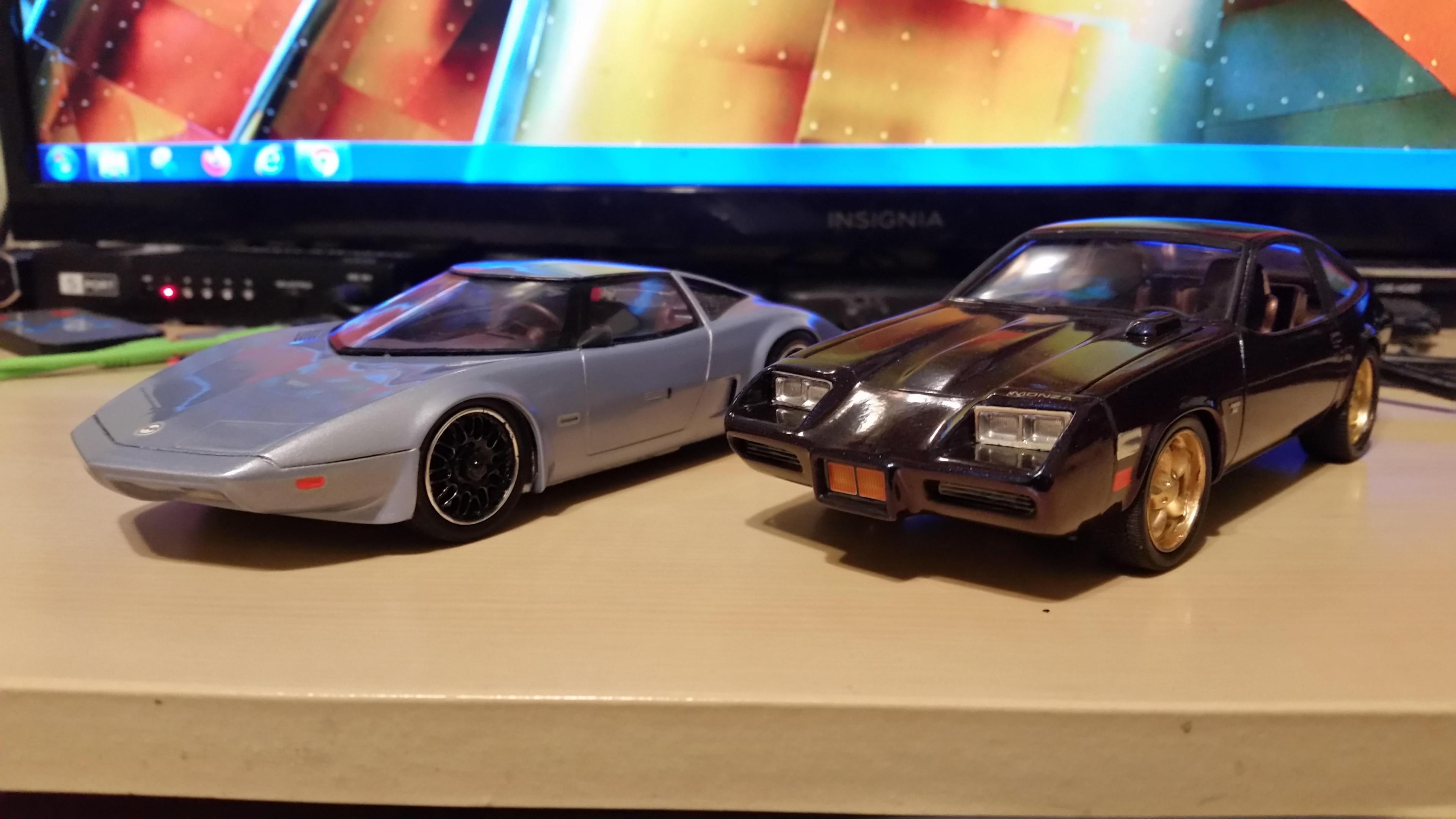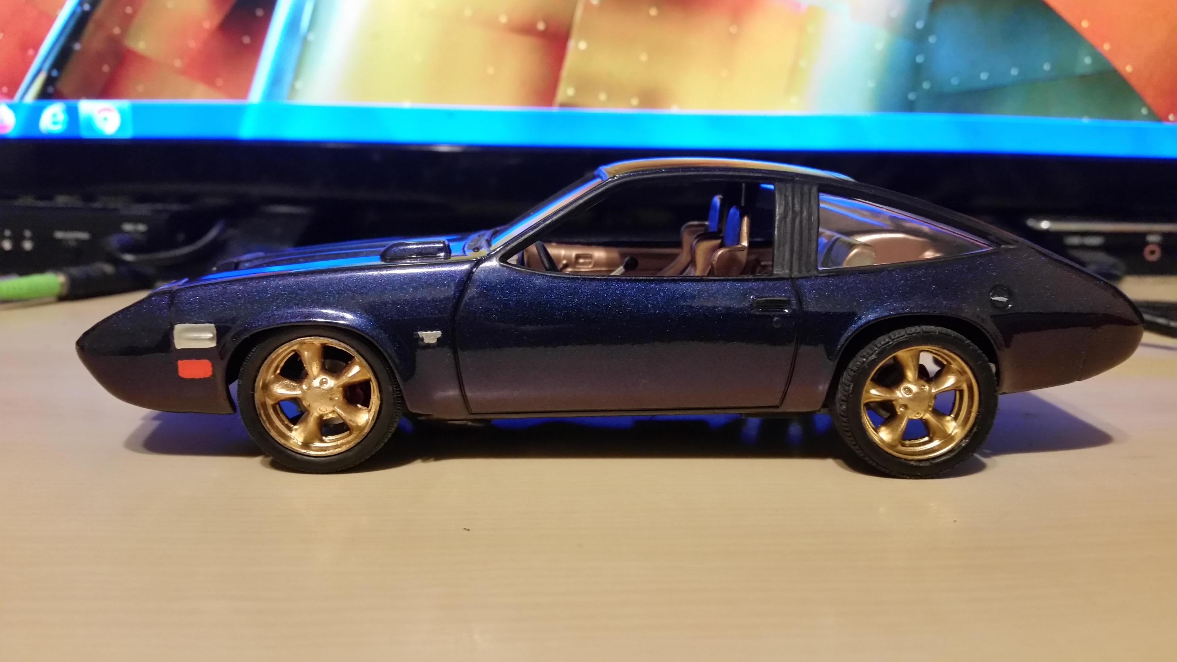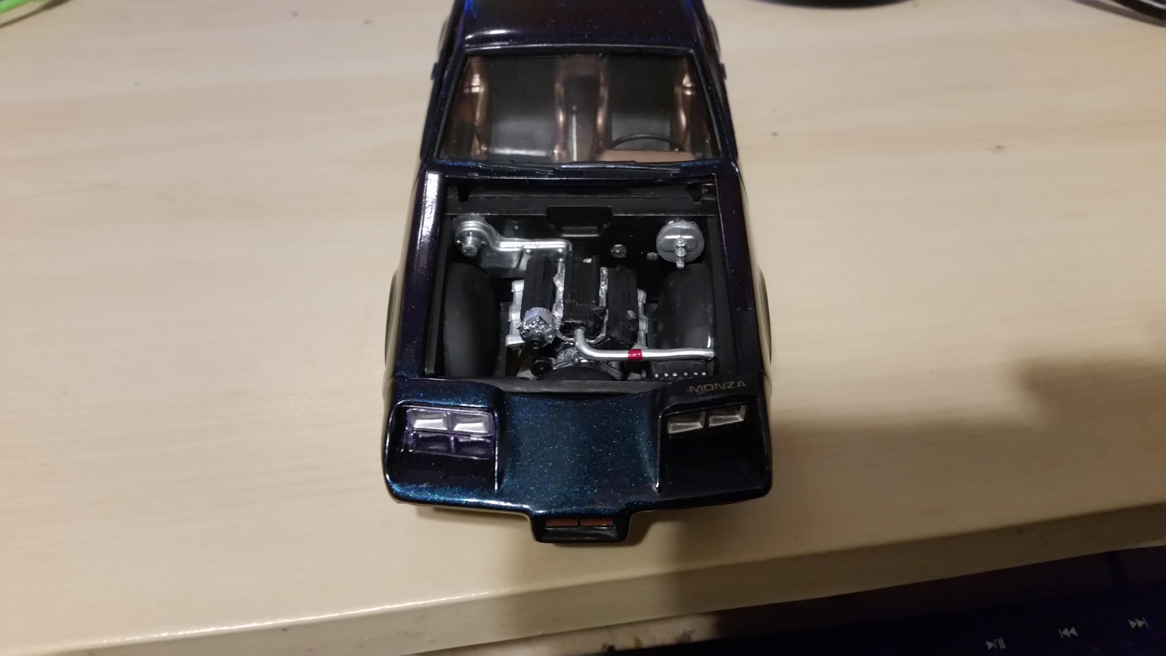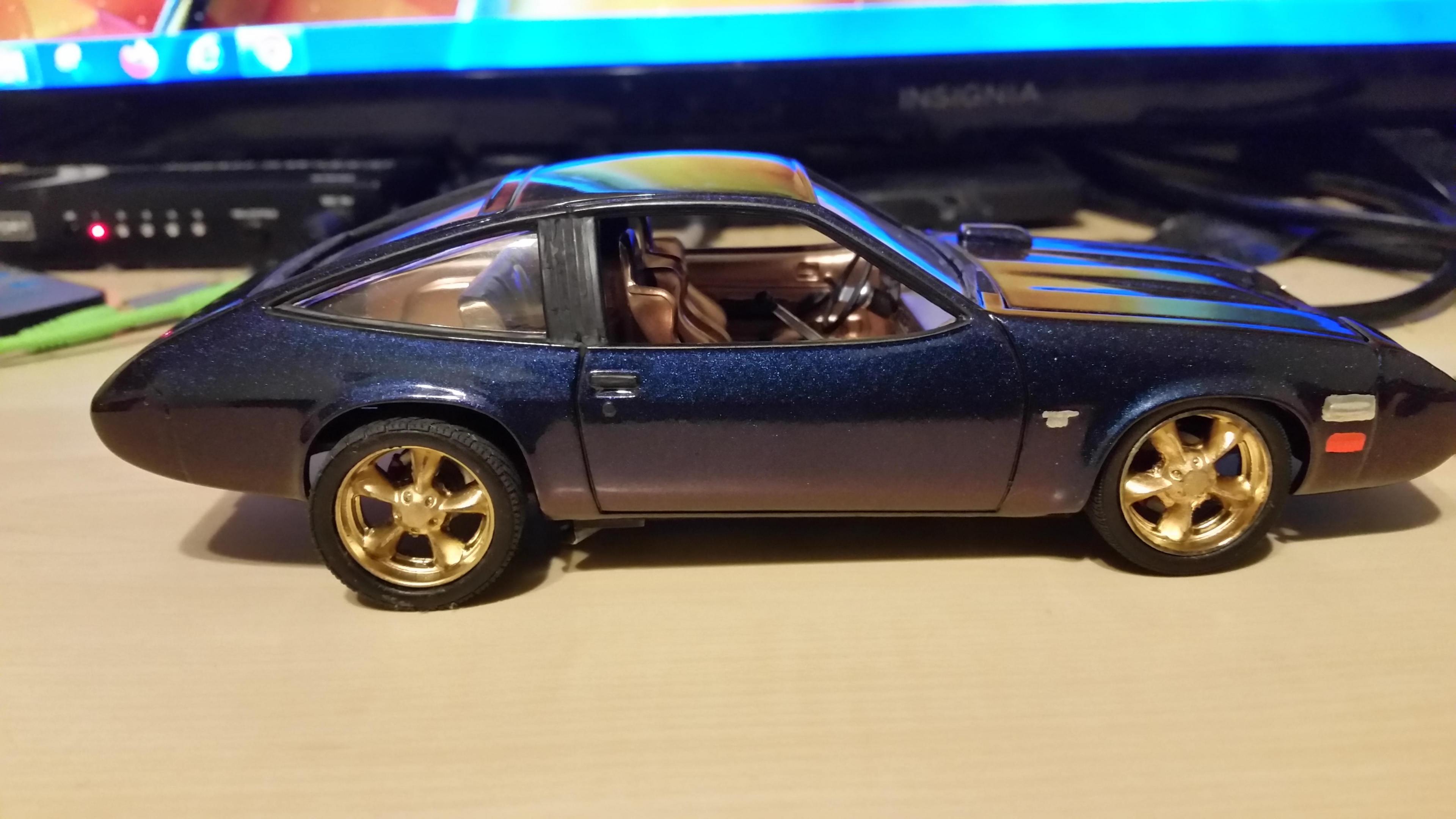 Recent "Original Art" series reissue of AMT 1/25th scale kit. Modifications as followed: Custom "Aero" front and rear bumper parts that came with Monza were used. GTO style hoot tach bump from unknown source. Most of LT1 motor from AMT '94 Camaro manifold; oil pan and water pump/pulley pieces came from AMT Monza V8 Custom headers (may have been the ones for the 350 turbo setup) from a MPC 82 Knight Rider Firebird Custom side exhaust made from scrap plastic sprue and muffler+tip from unknown subject Ricardo like seats and shiftier from MPC '70 Super Bee Pro Street Kit came with 3 dashboards, one was a newly tooled piece with better details that was used. Little did I know it was such a poor fitting piece that it required trimming to get in the grooves in the door panels. It worked out, but still Round 2 double check these things! Wheels are custom ones from a Revell '50 Ford F-150, painted Rustoluem Metallics Pure Gold. Front suspension was lowered as it sat too high, rear was left as-is. Yet again, front tires are from a Revell Acura RSX, and the wider rears come from what could be an AMT Fast and Furious Veilside Toyota Supra. Brakes are from a Revell 4th Gen Camaro Interior paint is Krylon Rose Gold Metallic; exterior paint is Rustoluem Color Shift Galaxy Blue cleared with Pledge. Group photo with recently finished AeroVette It's own thread here: