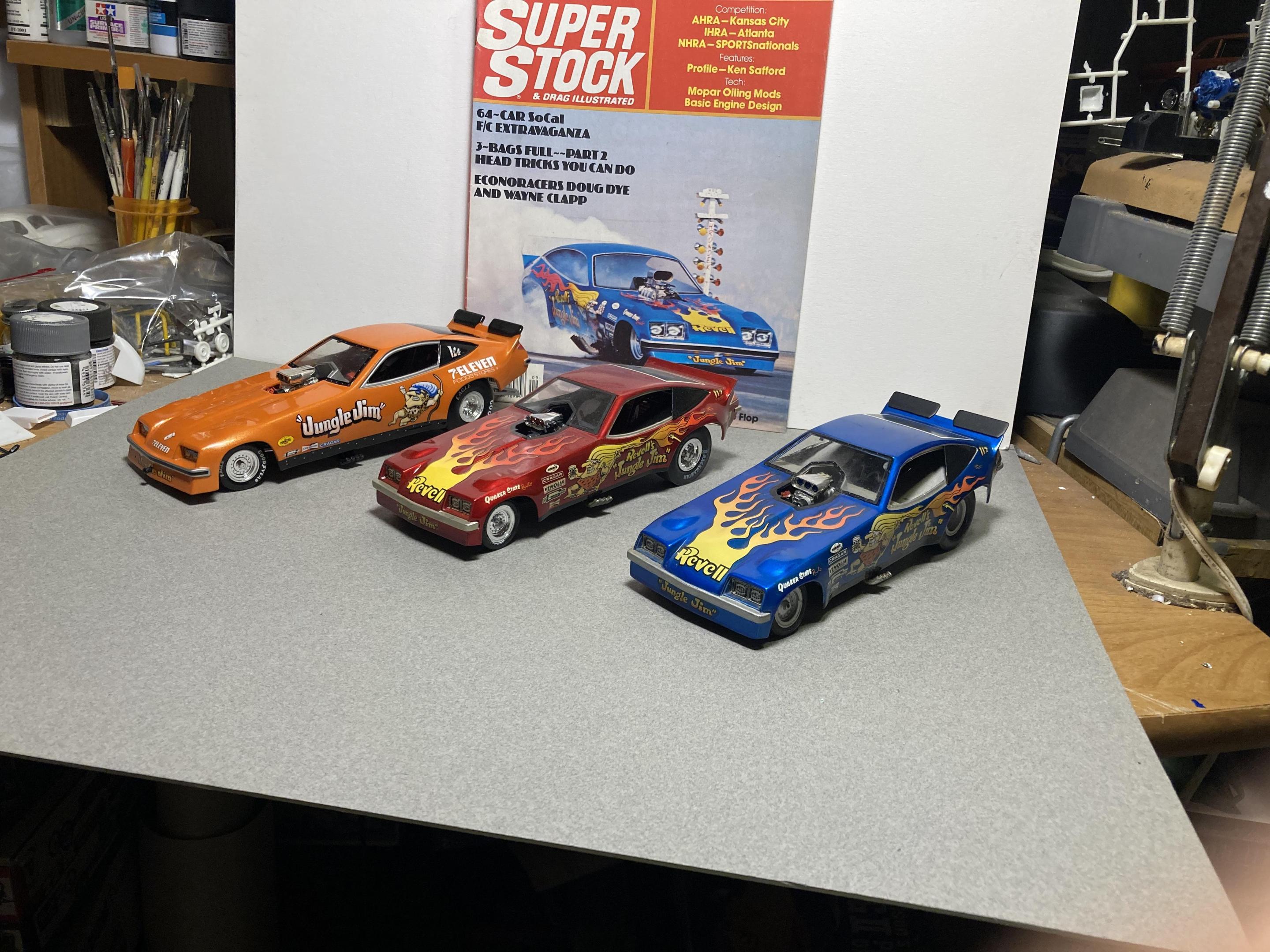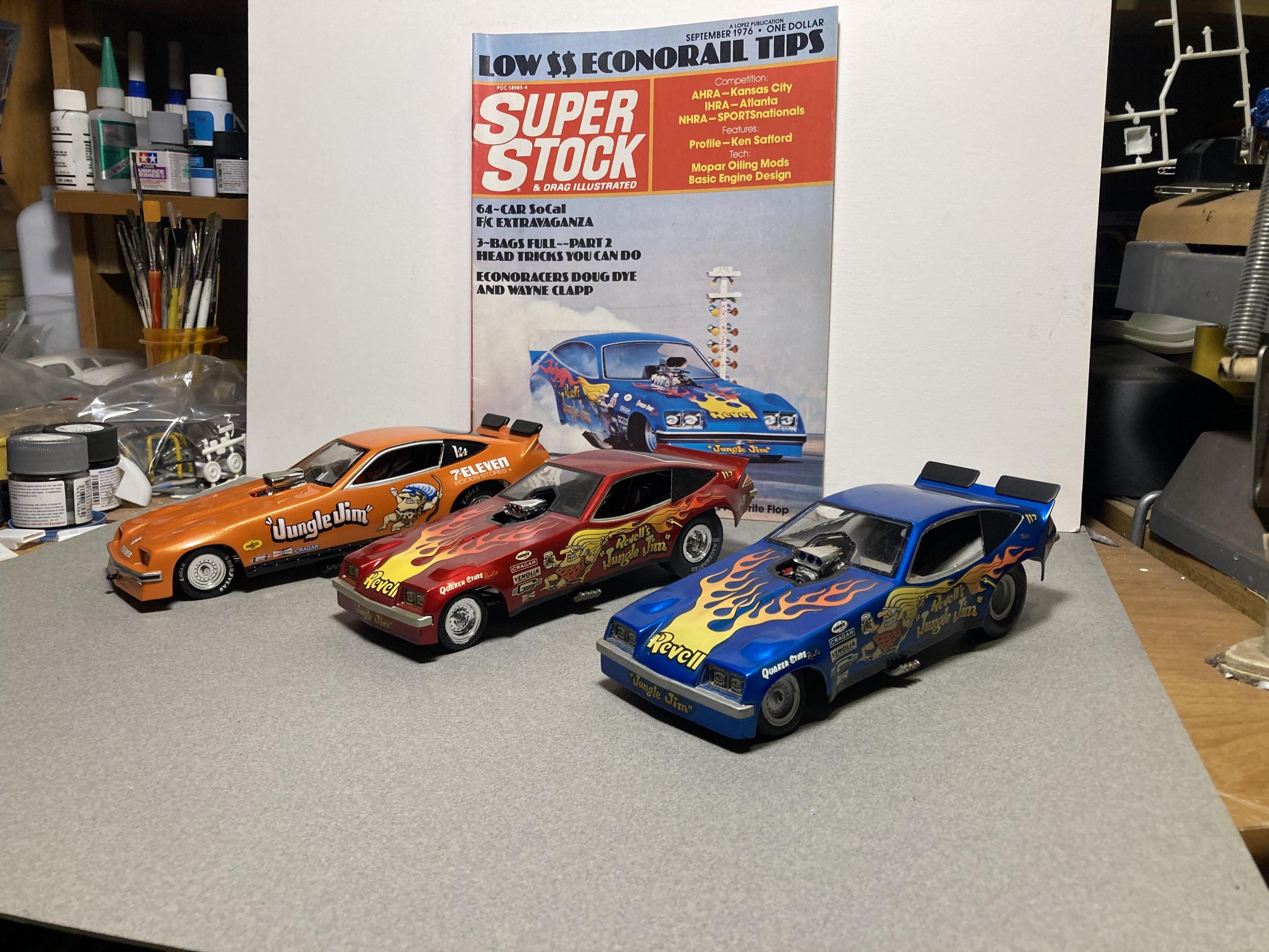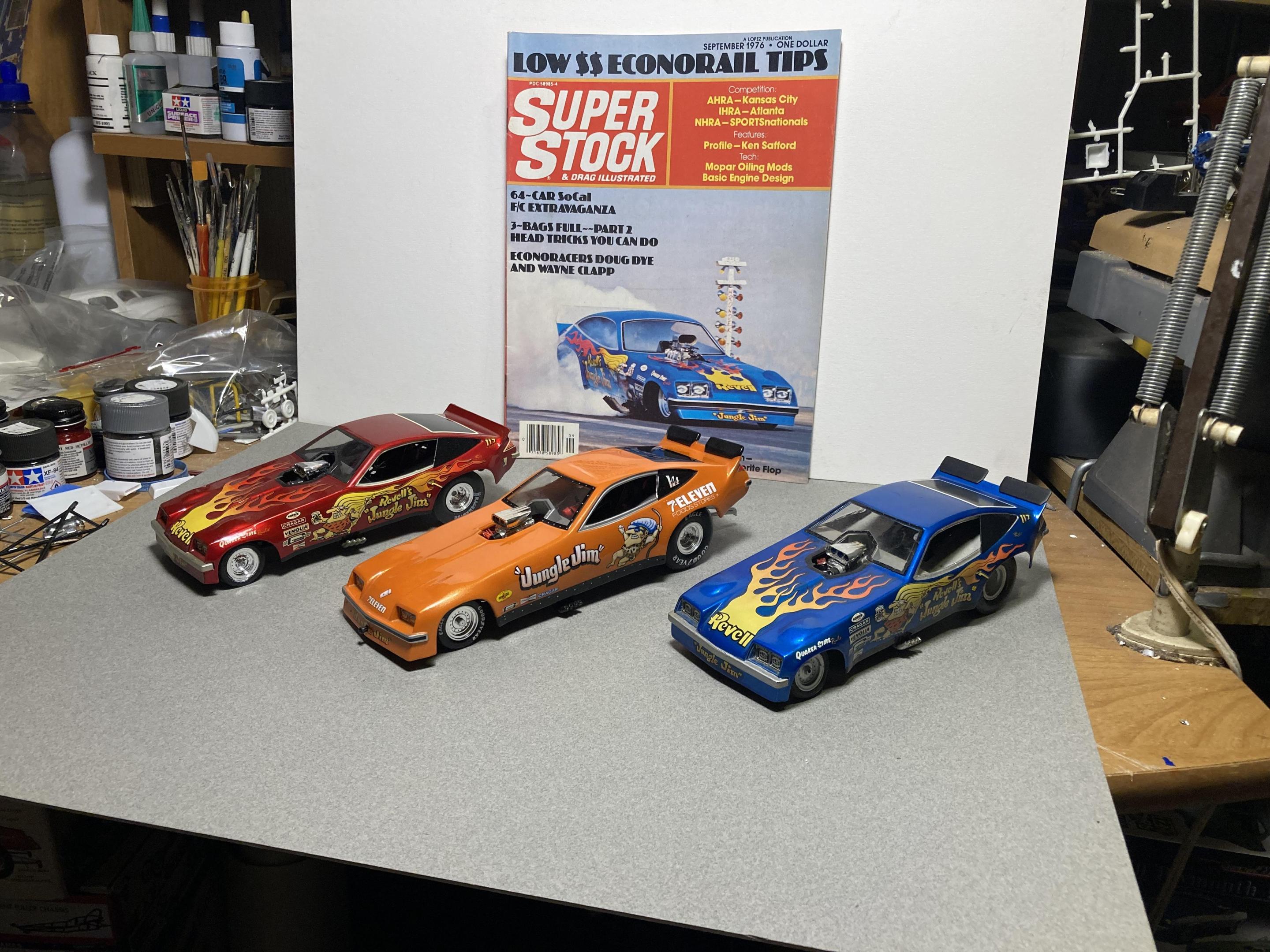The blue and red monzas are box stock revell with testors blue and red candy over silver bases. The orange monza is a Tom Hoover die cast that was stripped and repainted with house of color candy tangerine. Topped with slixx decals and a few coats of clear As always thanks for looking ? , Mike