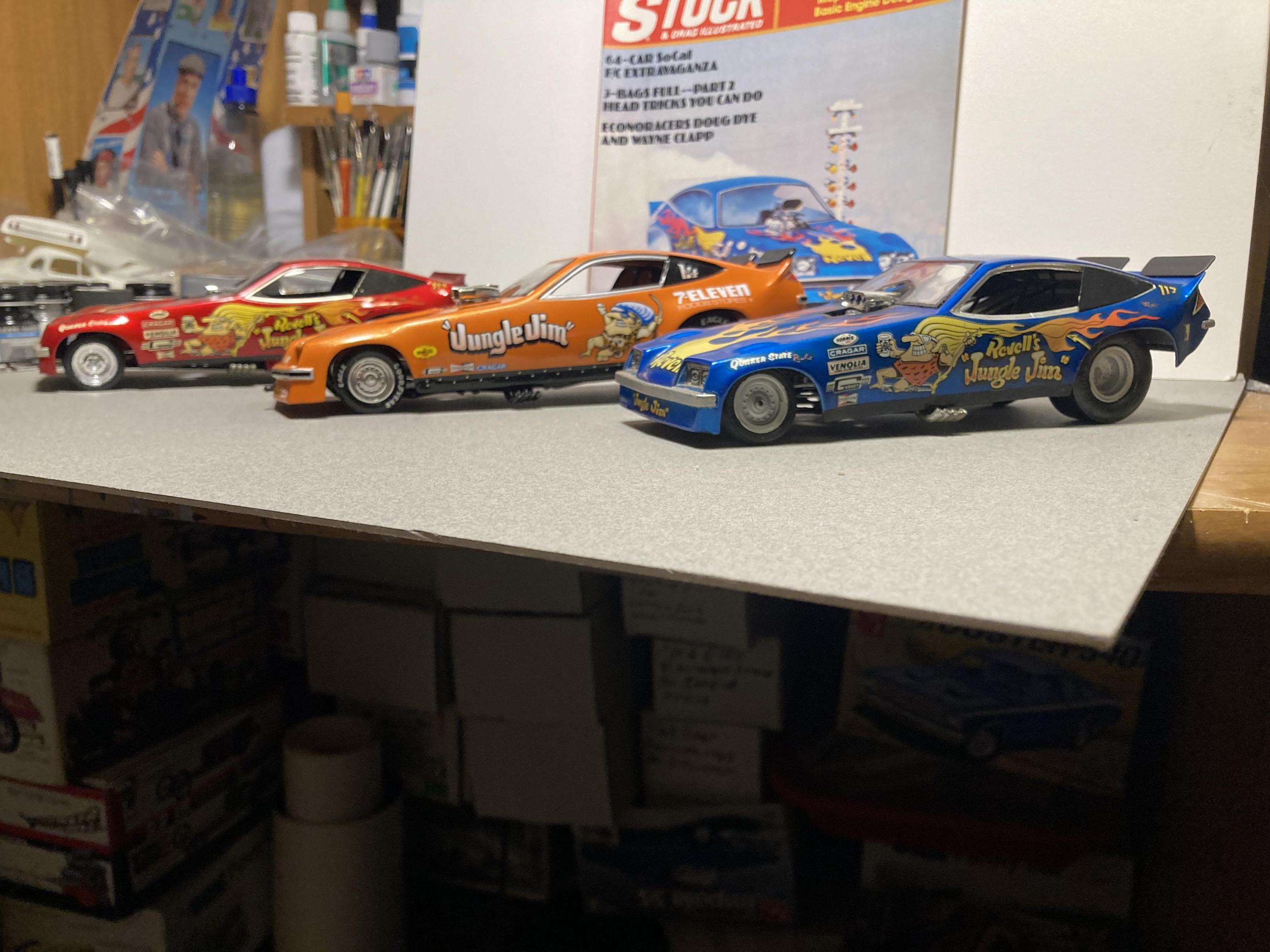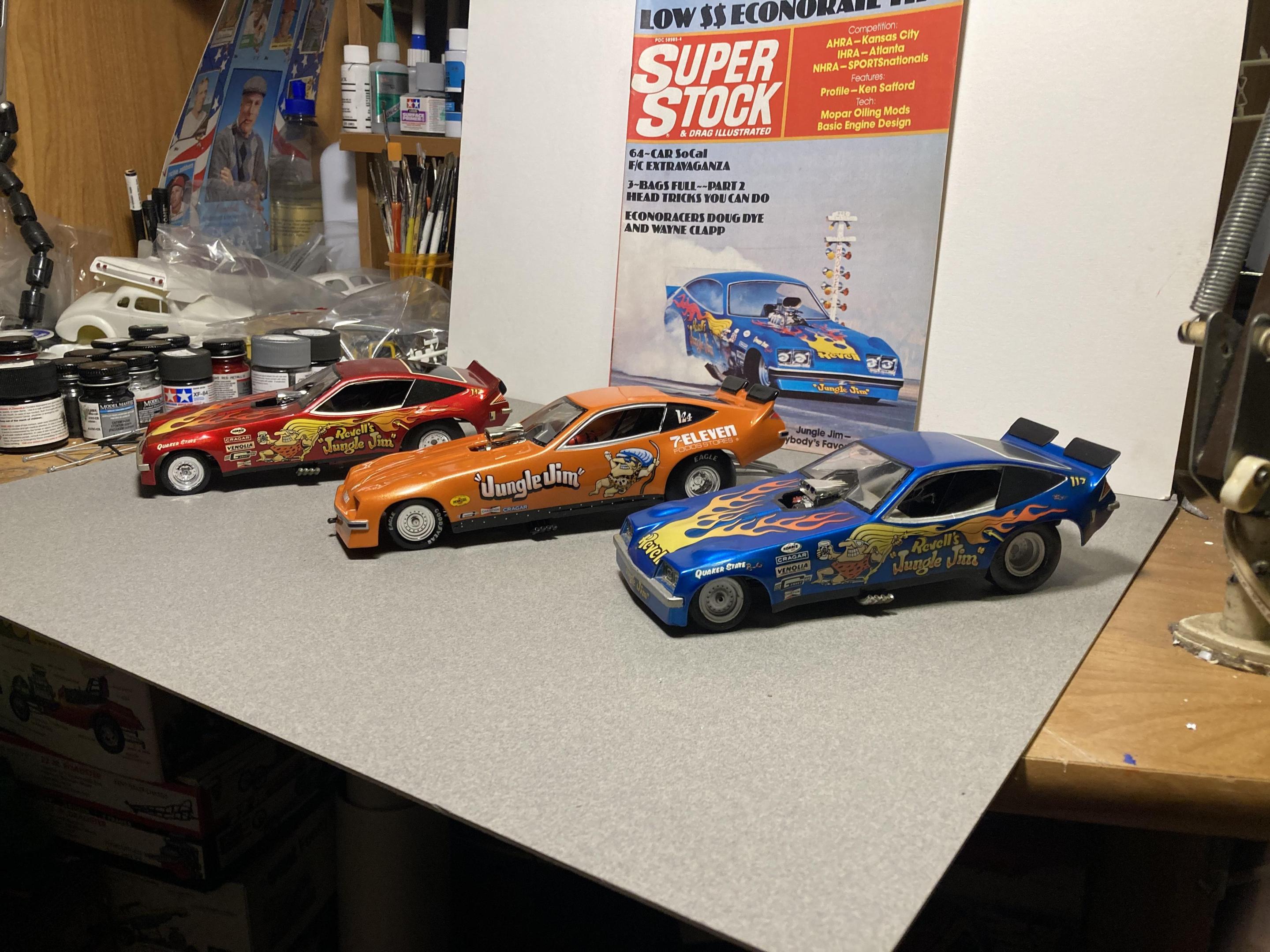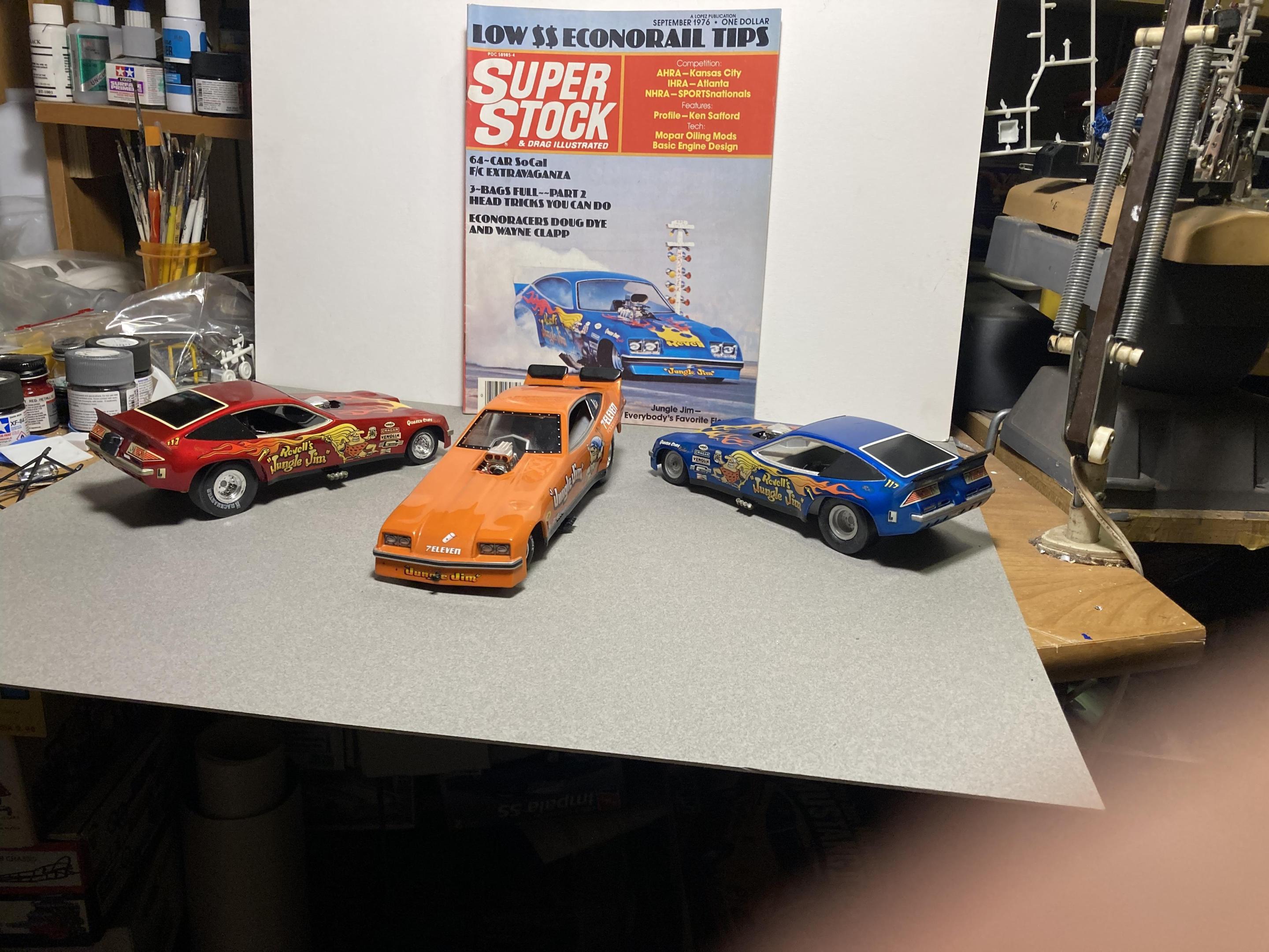 The blue and red monzas are box stock revell with testors blue and red candy over silver bases. The orange monza is a Tom Hoover die cast that was stripped and repainted with house of color candy tangerine. Topped with slixx decals and a few coats of clear As always thanks for looking ? , Mike
