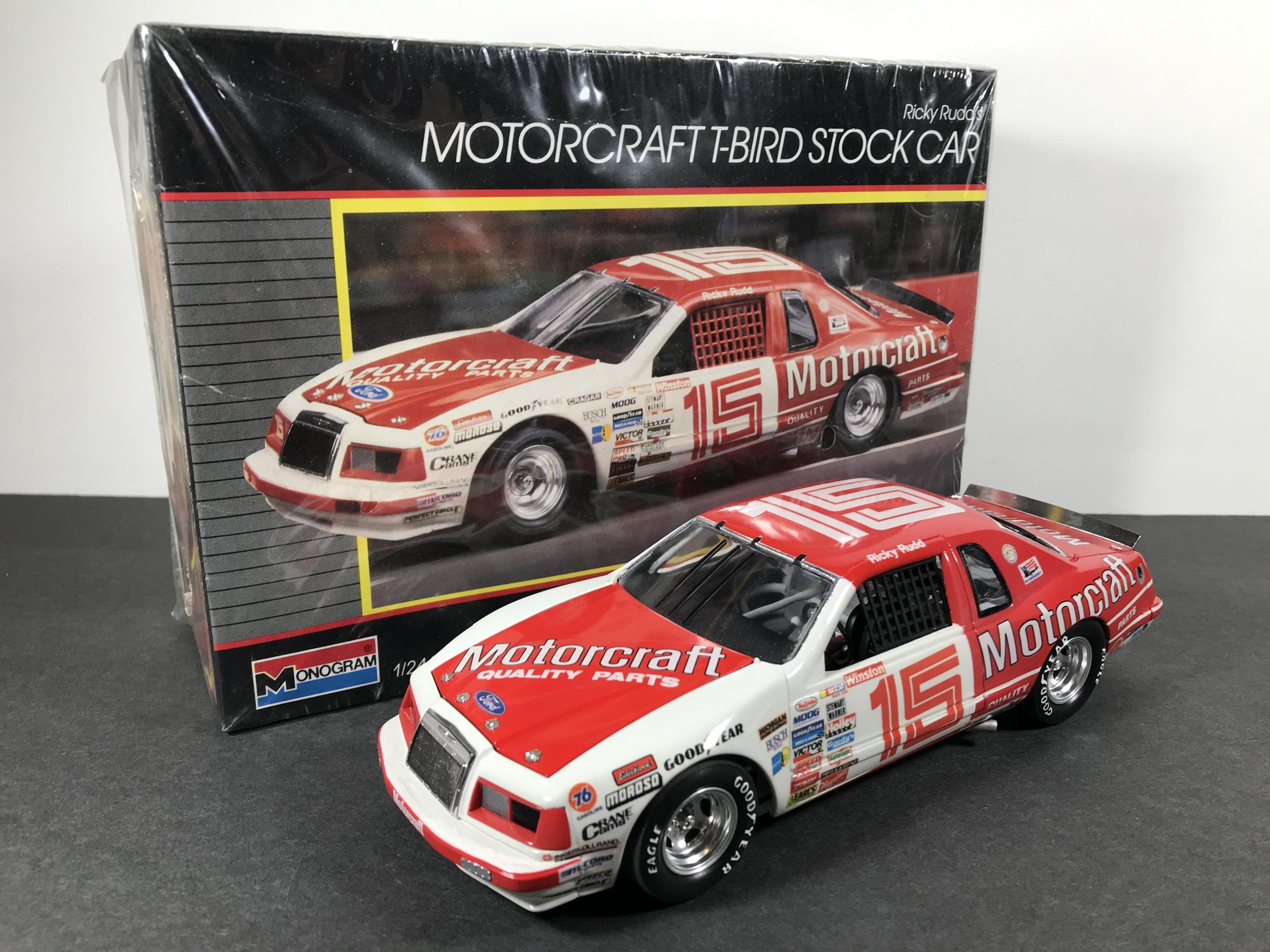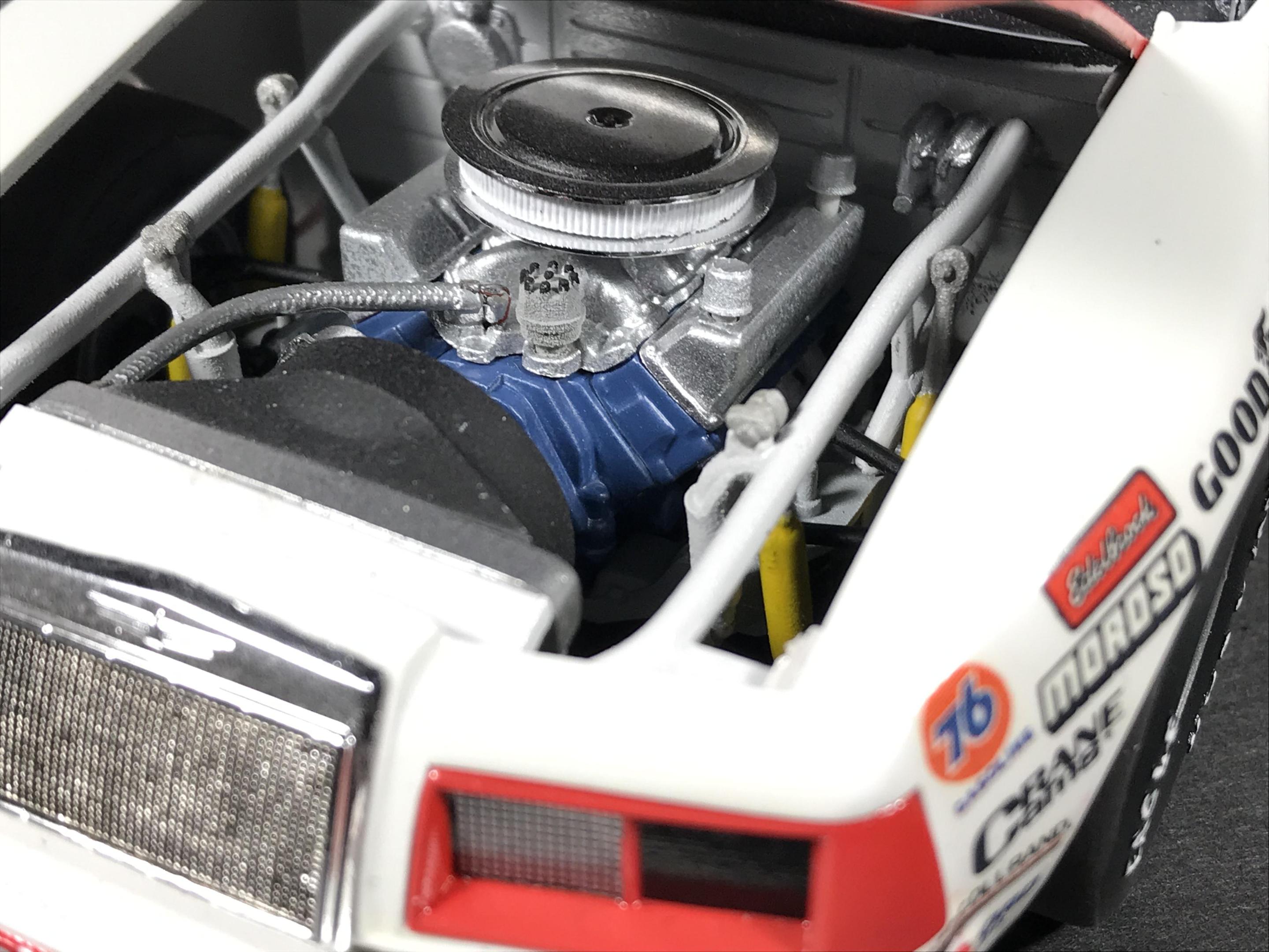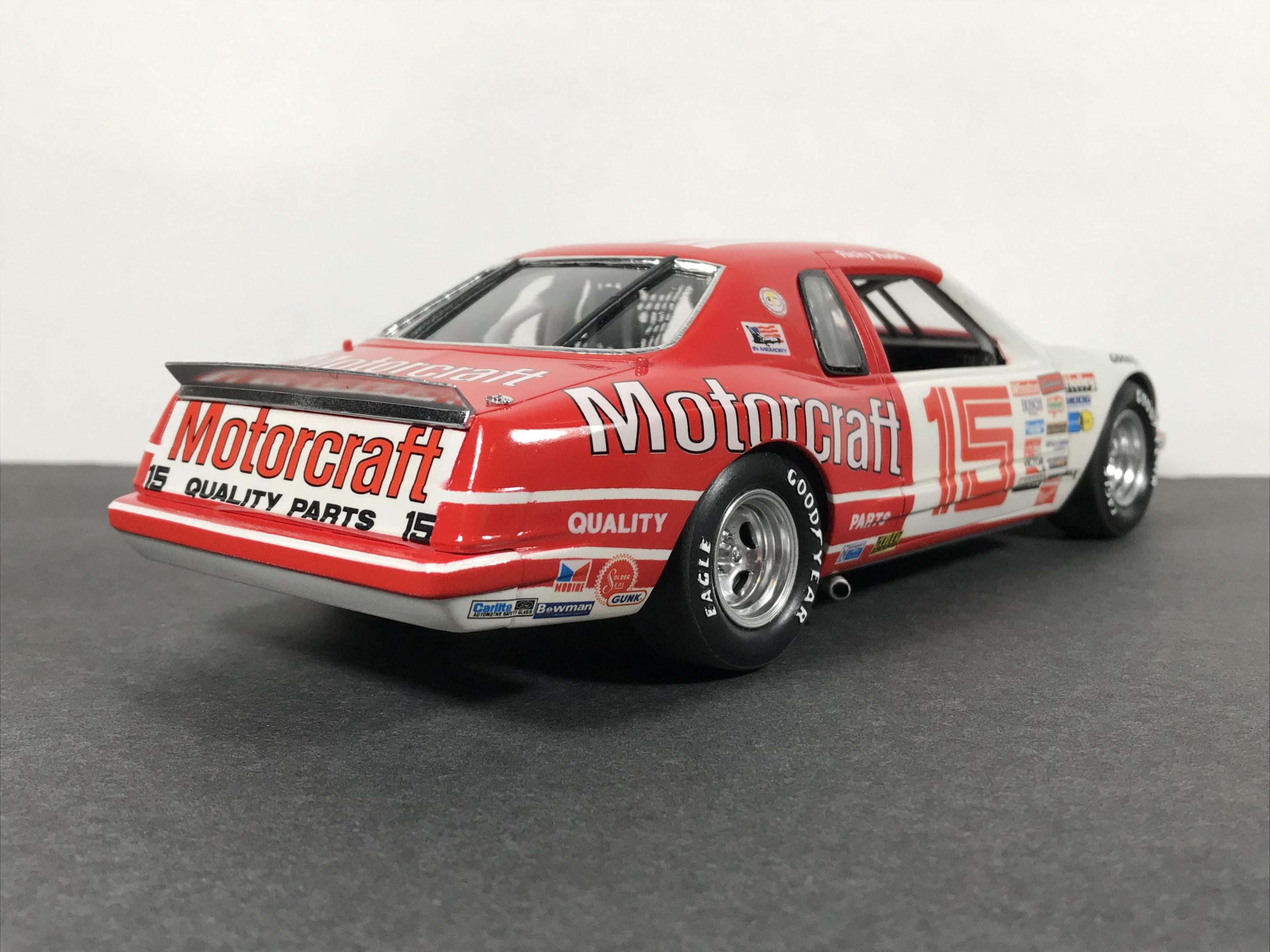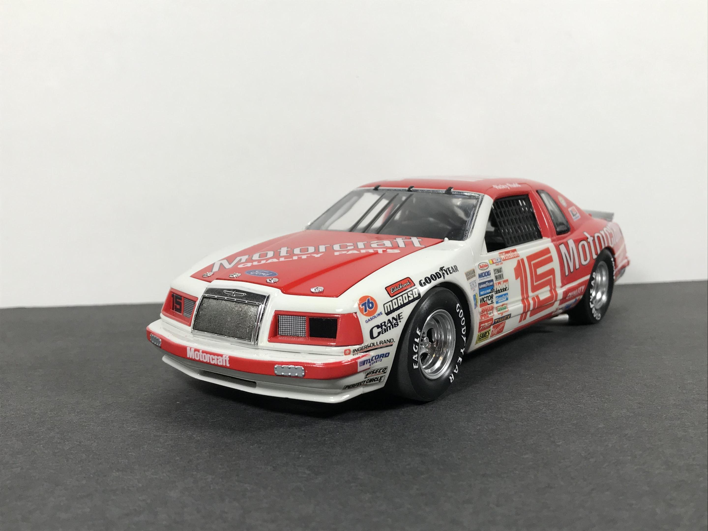 The first time I tried to build a NASCAR kit was 1987-ish. At 11 years old and having no idea that automotive spray paint would craze unprimed plastic, it didn’t go so well. Fast forward to five years ago when I picked up a box lot of six of these 1980s vintage Monogram T-Bird kits. After selling off five of them, I kept one and went to work on the build. After a couple weeks I lost interest in it, so it went back into the box as a partial build. A few months ago I was anxious to clear out some old works in progress, and this one was at the top of the pile. A good bit of research revealed how inaccurate these mid-80s T-Bird kits were, but it looked decent on the box art so that’s what I aimed for. After body prep and primer, it got a few coats of DupliColor Ford Oxford White. Having just got my hands on some of the new Tamiya LP range of lacquers, the red sections were masked and shot with some LP-7 Pure Red. The decals were the 35 year old sheet from the kit, but despite their age they finally went down decently with copious amounts of Micro Sol, a plethora of foul language, and many walks around the block to calm my nerves. After that hassle I didn’t want to risk using a hot clearcoat that might react with the DupliColor or Tamiya lacquer, so it was the first time I used Future as a final clearcoat finish. Despite the kit’s inherent inaccuracies, helpfully pointed out by some great model builders who have built these over the years, the end result makes a nice shelf piece. I was so pleased after all these years to have finally finished a NASCAR kit that I’ve already started work on another.. well, maybe two more.. you know how that goes.