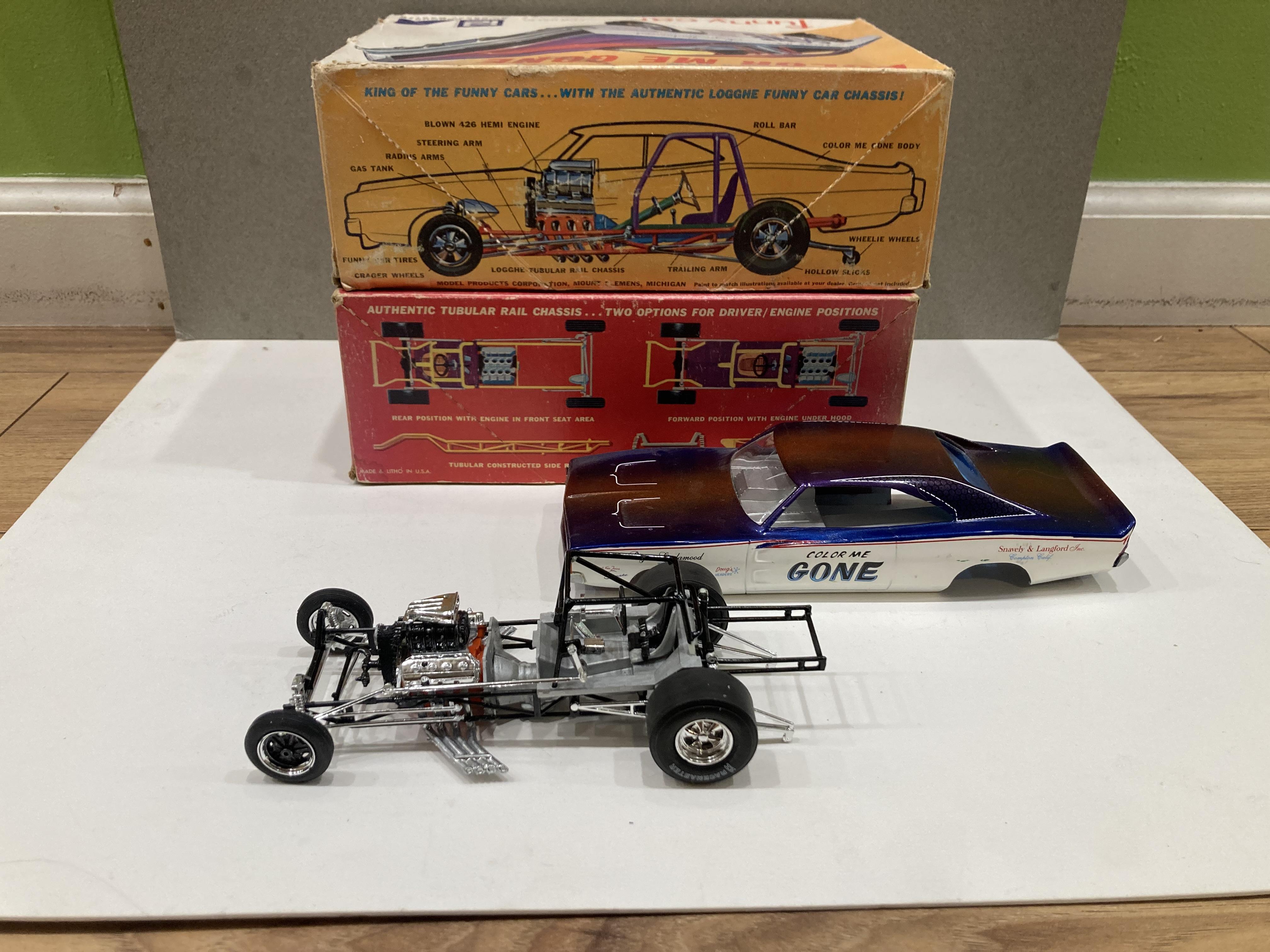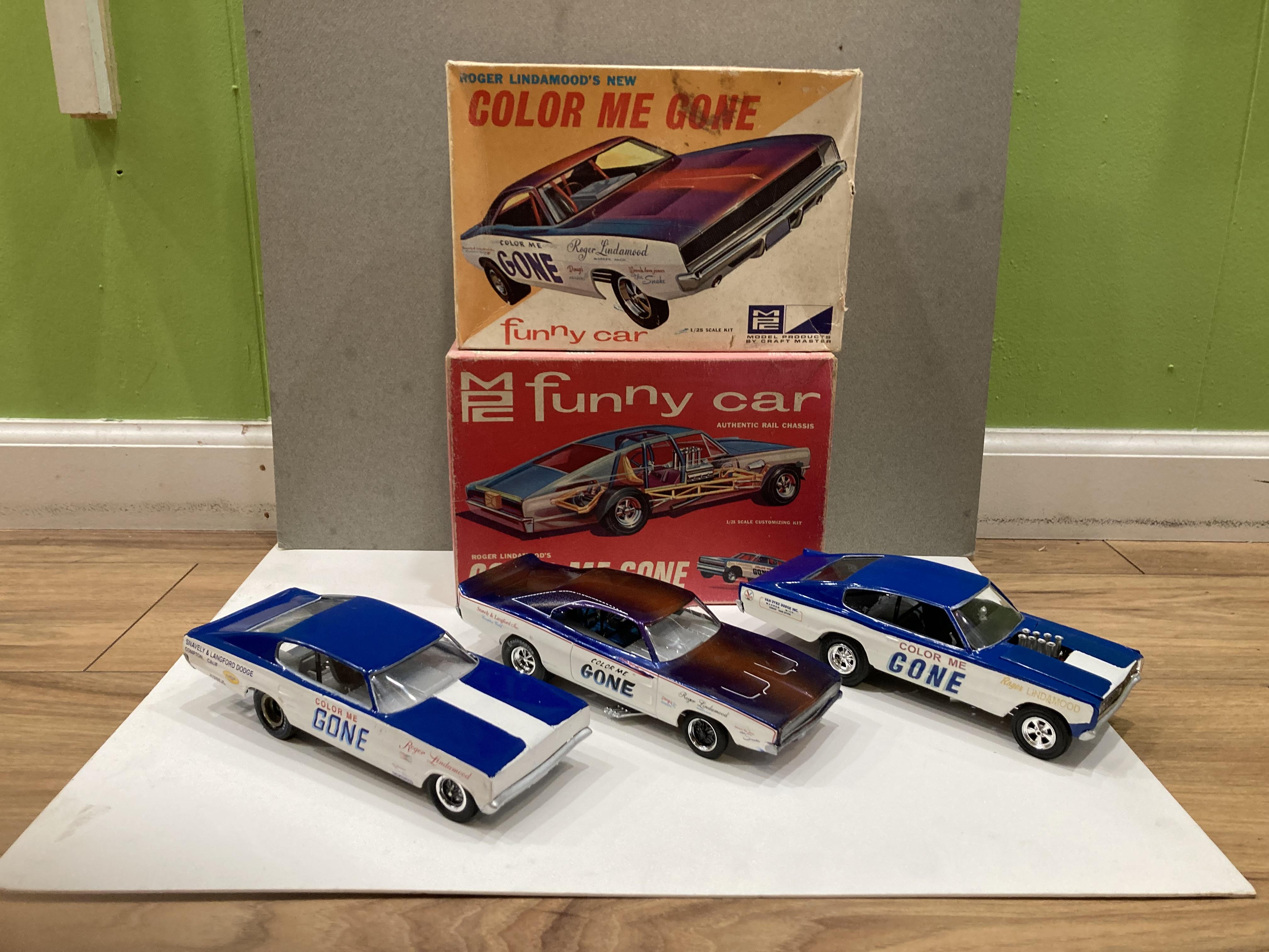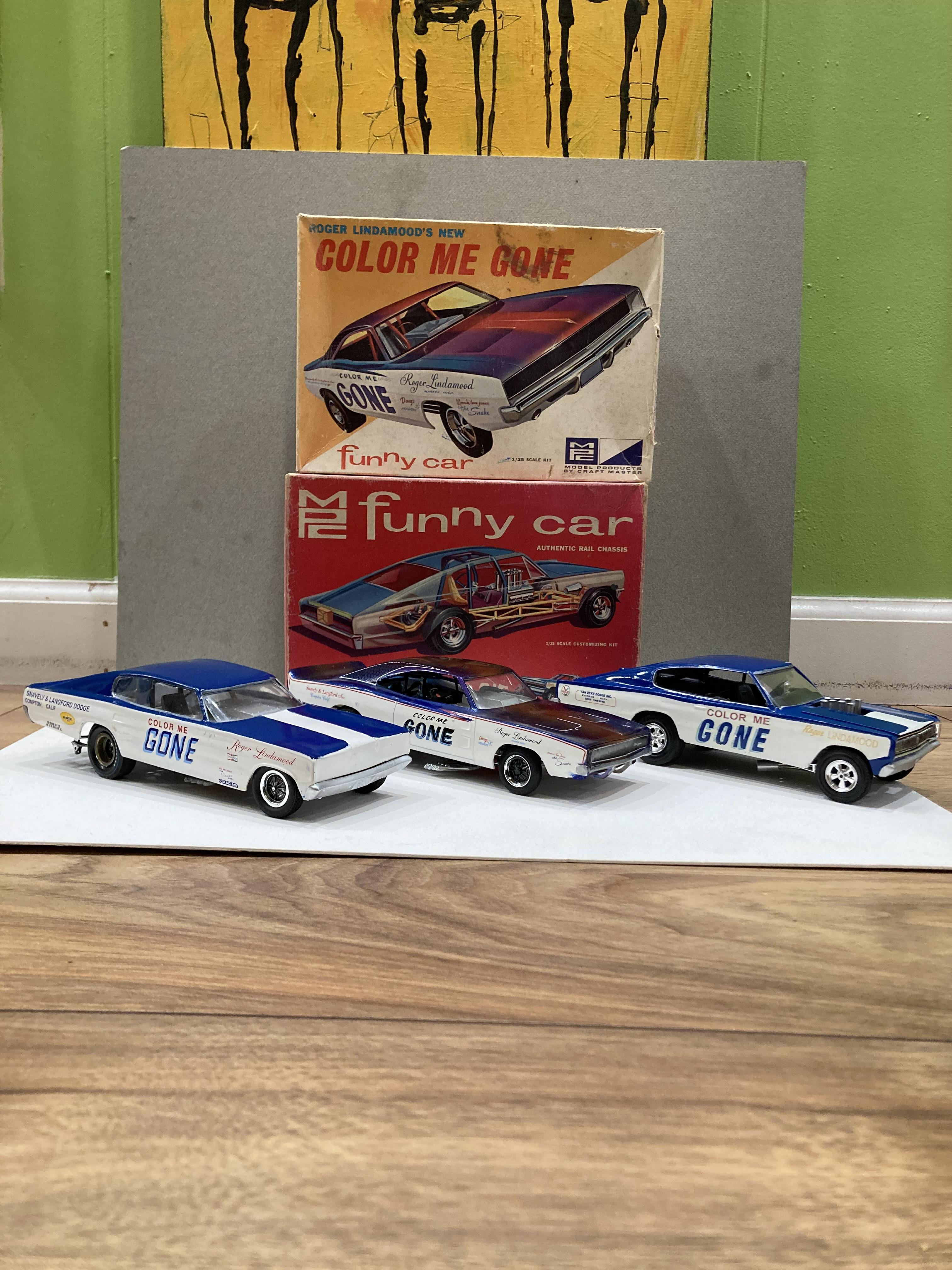I just thought this would be a neat look at the progression of the funny car in the late 60’s mpc did a pretty good job keeping up with the popularity of the sport back then . I built the 68 car from a Revell body and a polar lights chassis. The custom fade paint job is testors lacquers the decals are SLIXX . The 68 kit with that great box art would make a great reissue. until next time thanks for looking, Mike