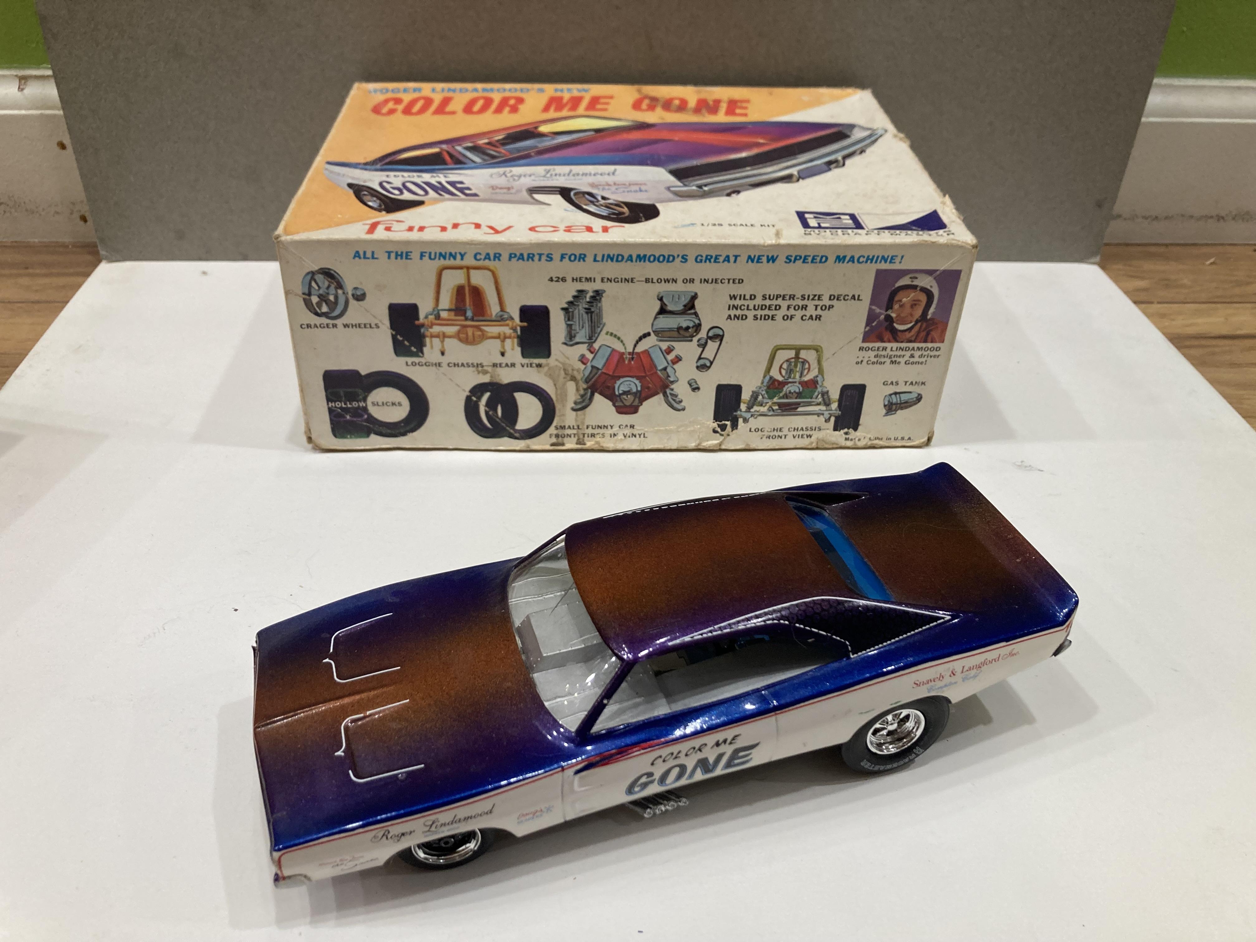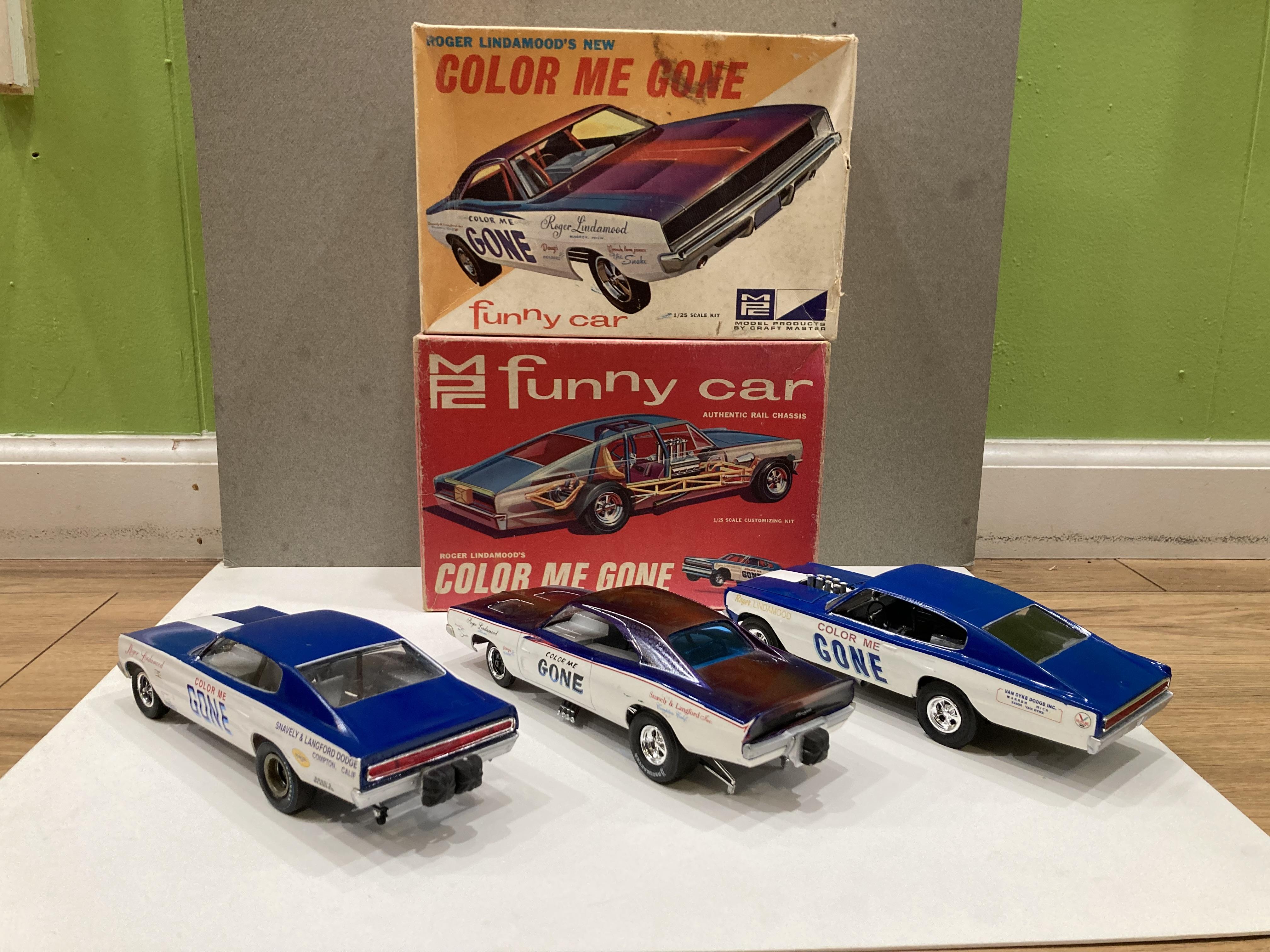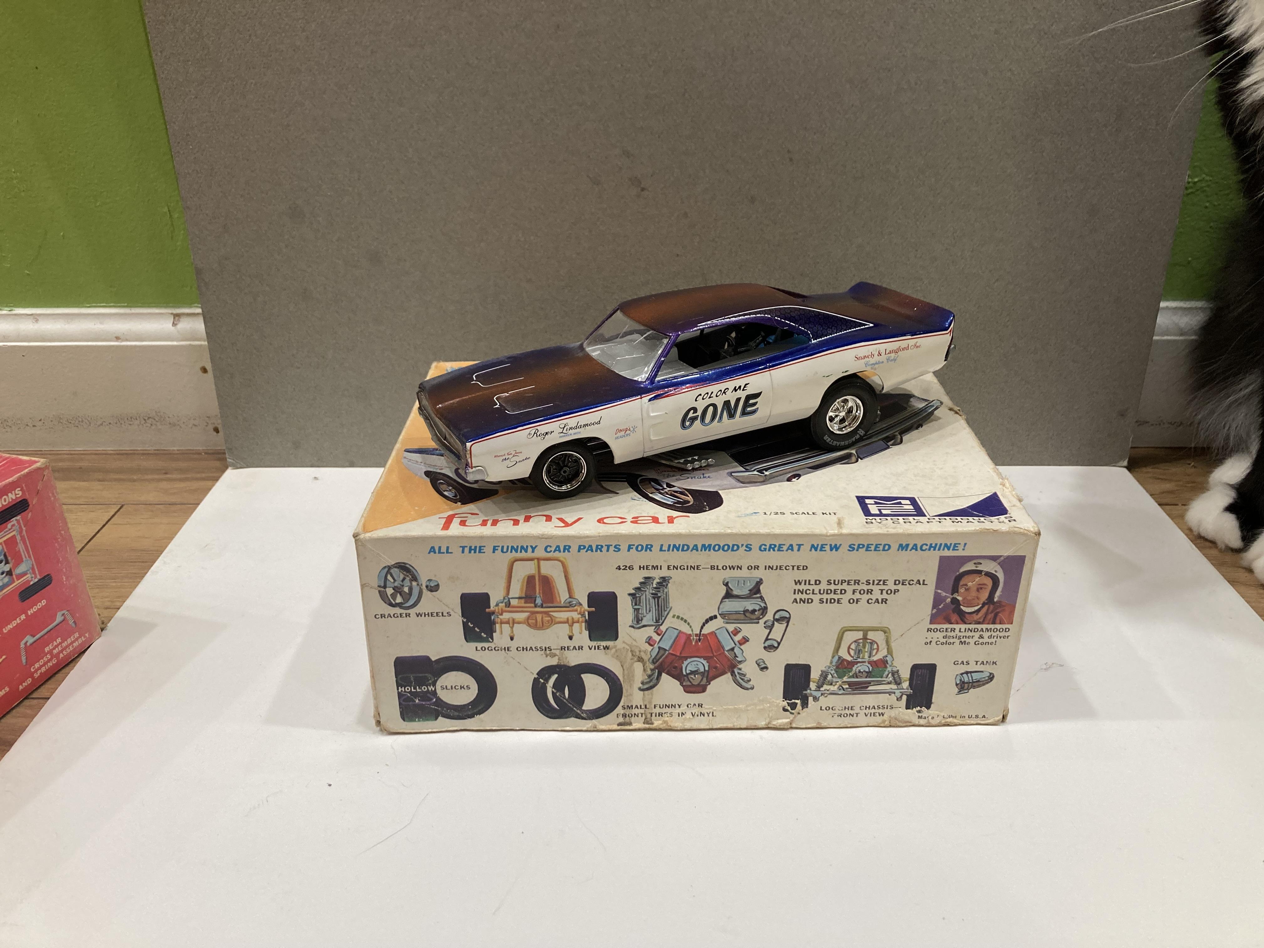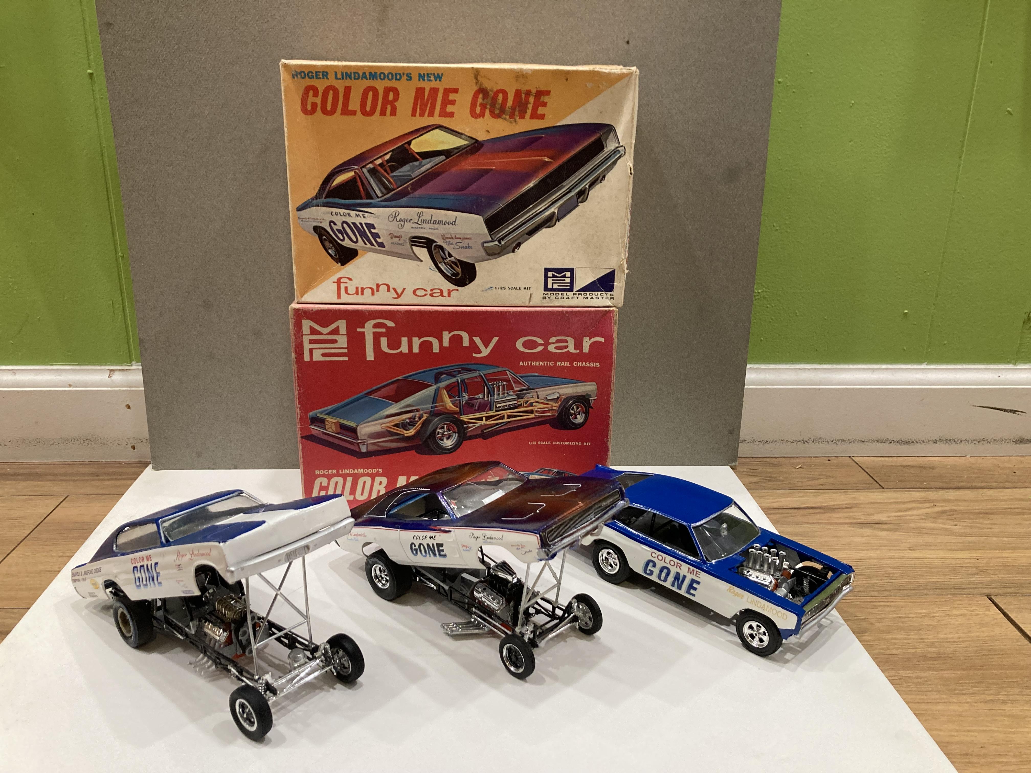 I just thought this would be a neat look at the progression of the funny car in the late 60’s mpc did a pretty good job keeping up with the popularity of the sport back then . I built the 68 car from a Revell body and a polar lights chassis. The custom fade paint job is testors lacquers the decals are SLIXX . The 68 kit with that great box art would make a great reissue. until next time thanks for looking, Mike