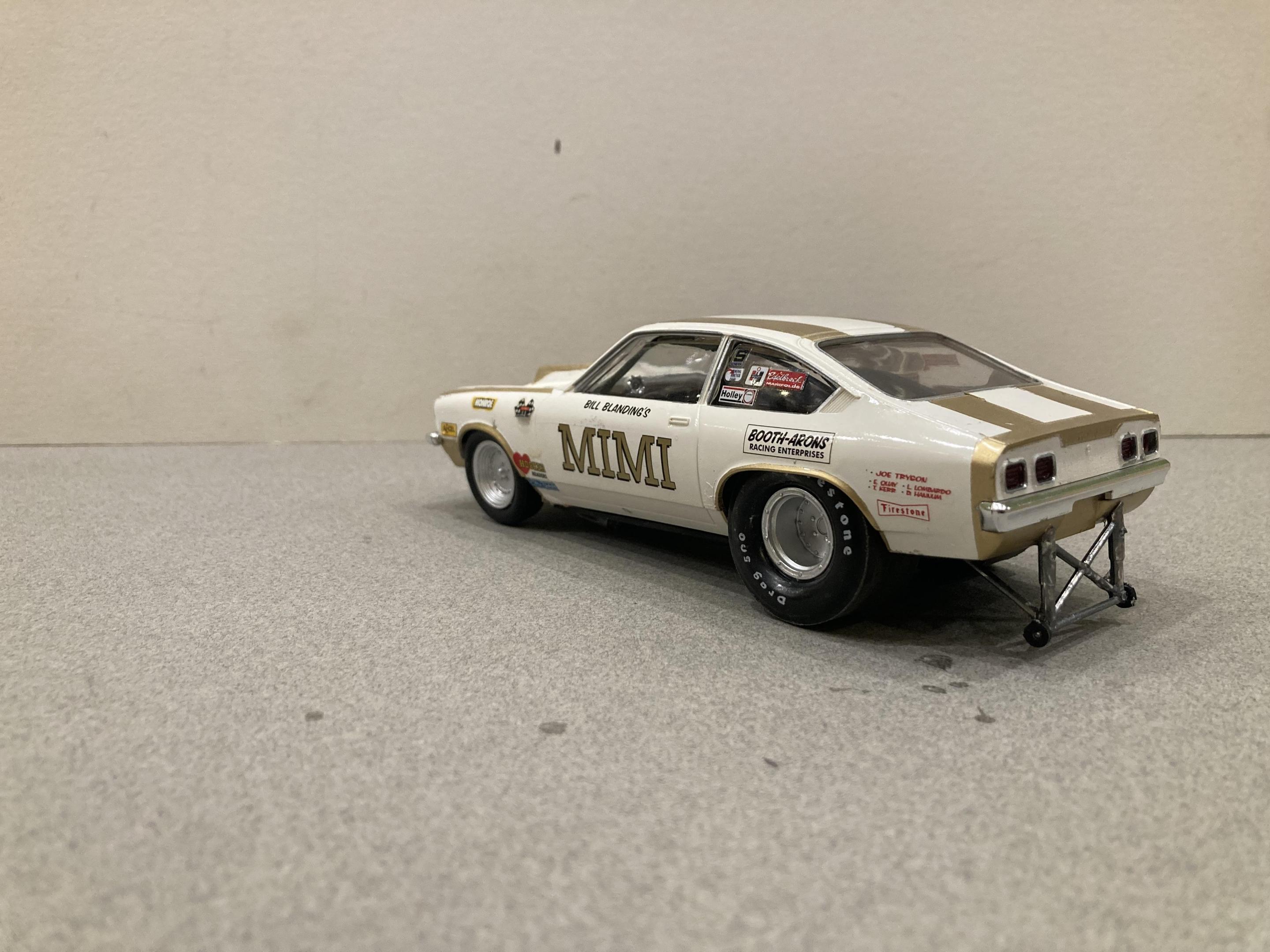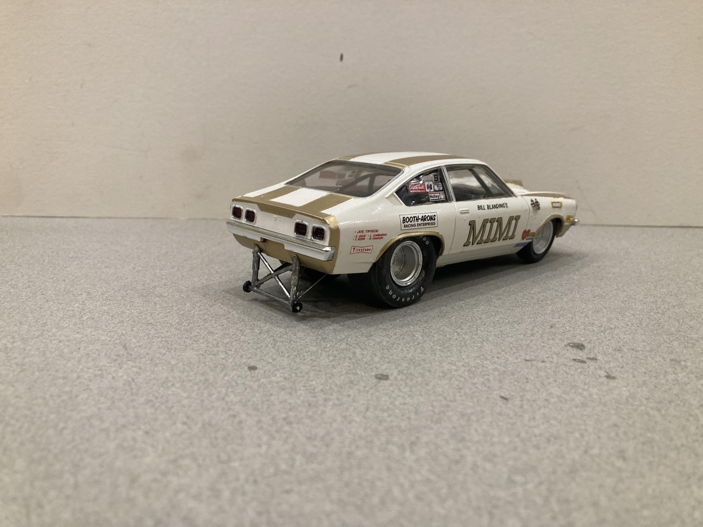 The mpc grumpy’s toy kit with a swapped out small block painted with testors white and gold enamel. I pieced the decals together from various slixx sheets. I just can’t build enough of these pro stock Vegas there a nice easy quick build that look great on the shelf. I’ve built 9 so far and have decals for at least 4 more. I think it would be great if Steve G and the folks at round 2 would reissue the pro stock pinto with the earlier 1972 skinny bumpers , and the Sox & Martin duster .Thanks for checking it out, mike