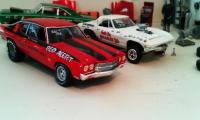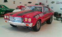Here is bob hamaltons Red Alert Chevelle, unlike the vintage Amt kit,I built this as correct as I could, the orig kit had single headlights like a 71,72, 73, the 70 had twin lights ea side, also, the orig kit has a blown engine with a hat. Lol, also kinda big deal, the orig kit has a 4 speed. And Bobs was automatic. H handle shifter, I made one. Also went to GM dealer and got the paint code for Cranberry red, it "75" by the way, the body shop mgt even mixed me some an gave me formula, pretty cool of him. So here ya go, my Red Alert, thanks for looking,