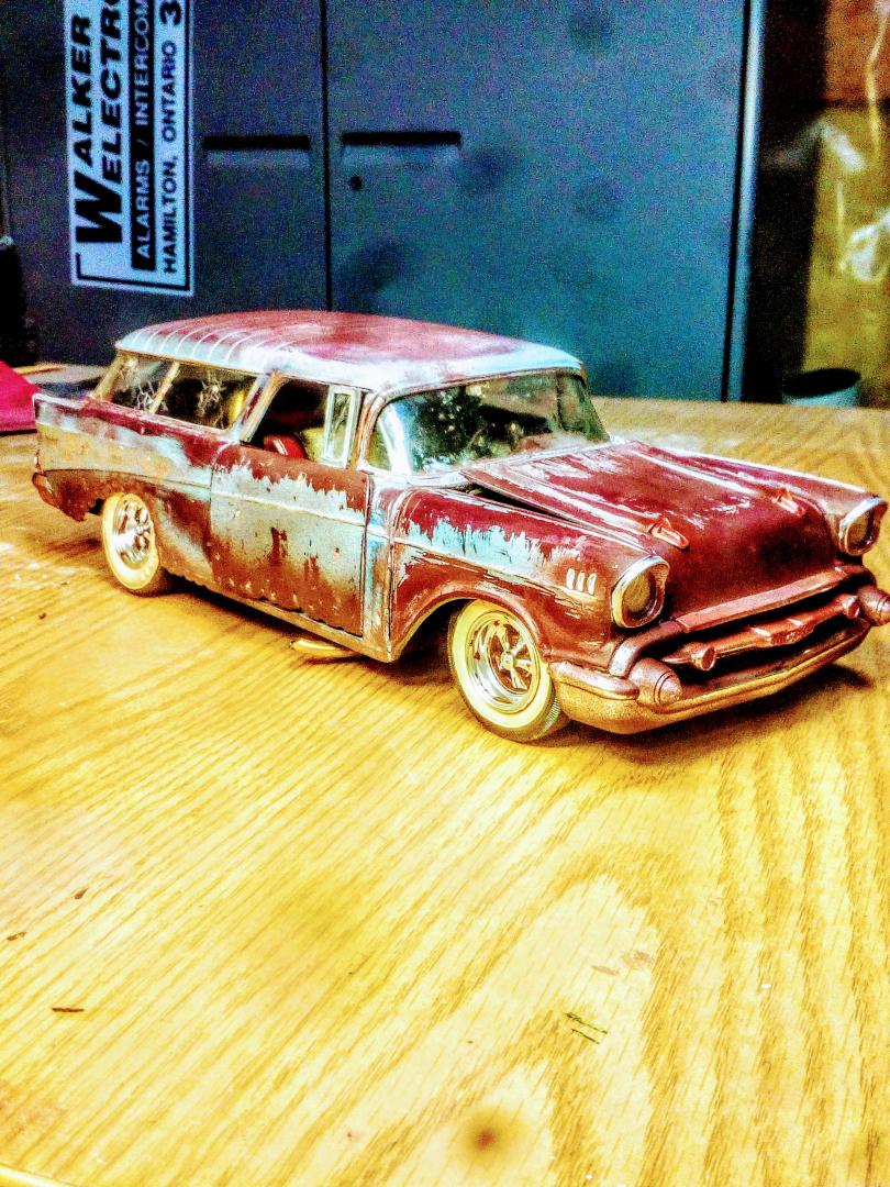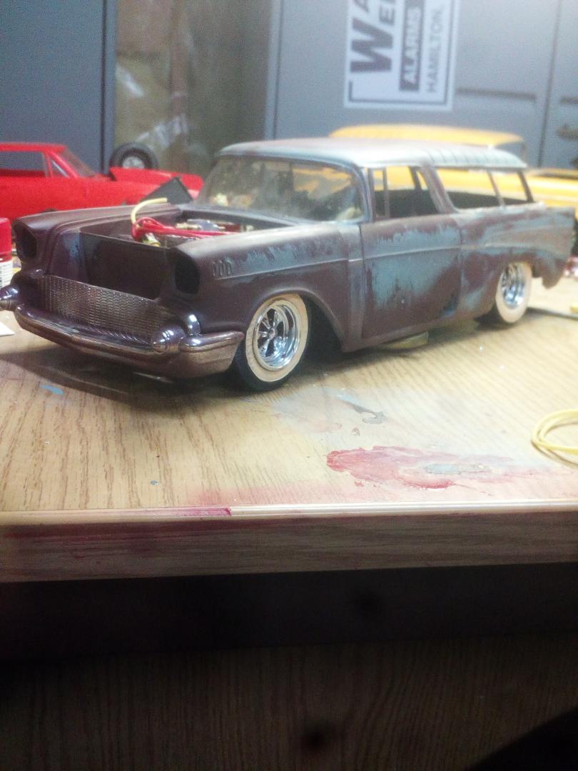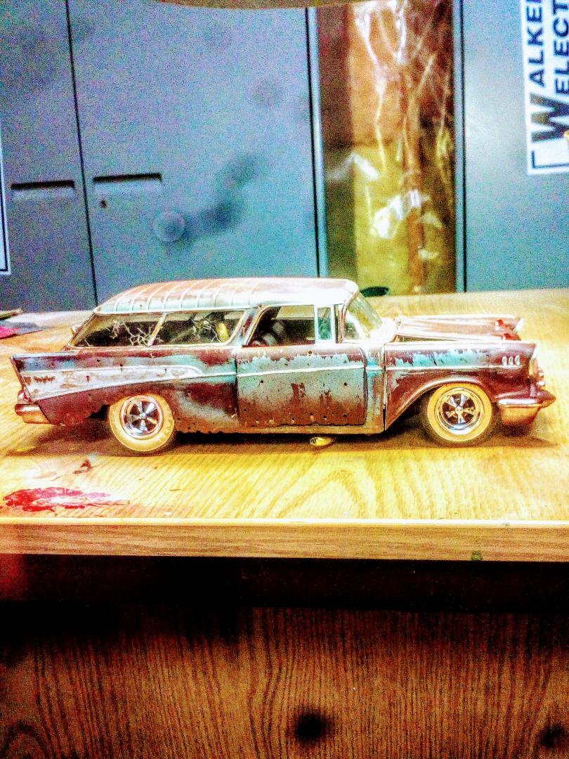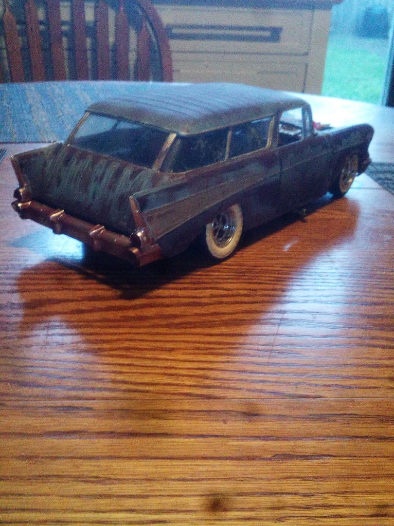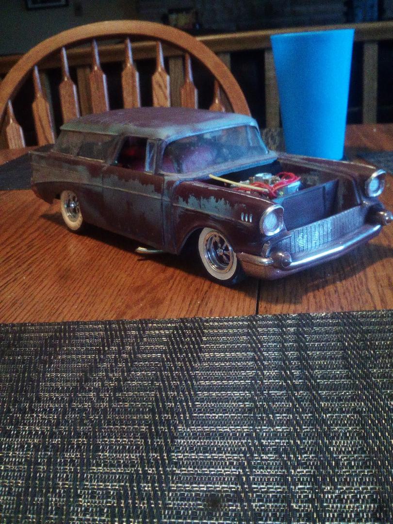 The newbie here... OK typos aside, this thing is for sure... A 1/16 scale kit. This is my WIP 1957 Chevy Nomad garage sale special. It began its life as a incomplete model, but soon became something that I can tick my Chevy and Chrysler friends off. The simple reason on why I put a 1969 General Lee Hemi in it, is because... why not. The Dodge began its life as a complete model, though after some time it got somewhat destroyed. My hopes are to give the 57 "Ch-emi" the look of a rat rod, on top of the look of an old school street rod. Neat things done: Lowered car, put in a Hemi, roll cage, side exhaust, fuel lines, break lines, ignition wires, and cut out firewall. Neat things to be done: Transmission, electrical wires, finish model.