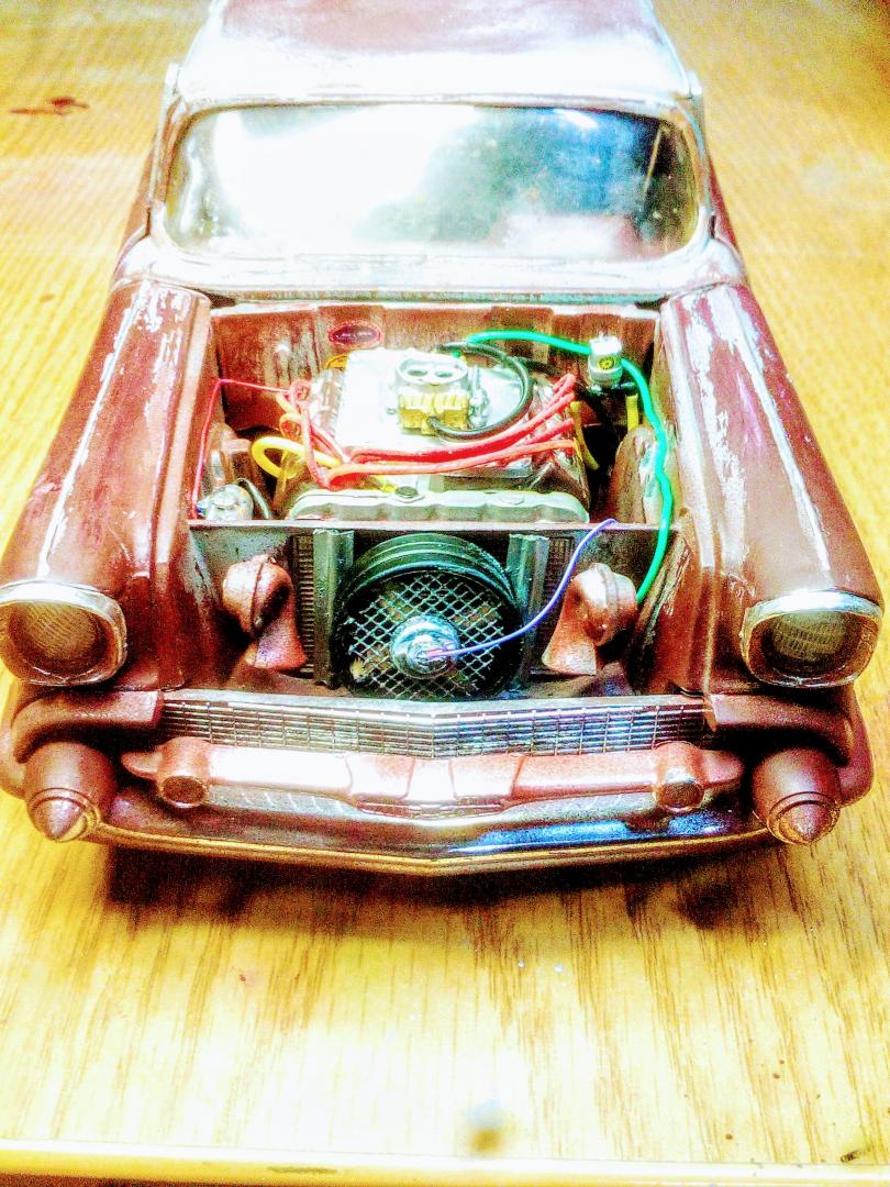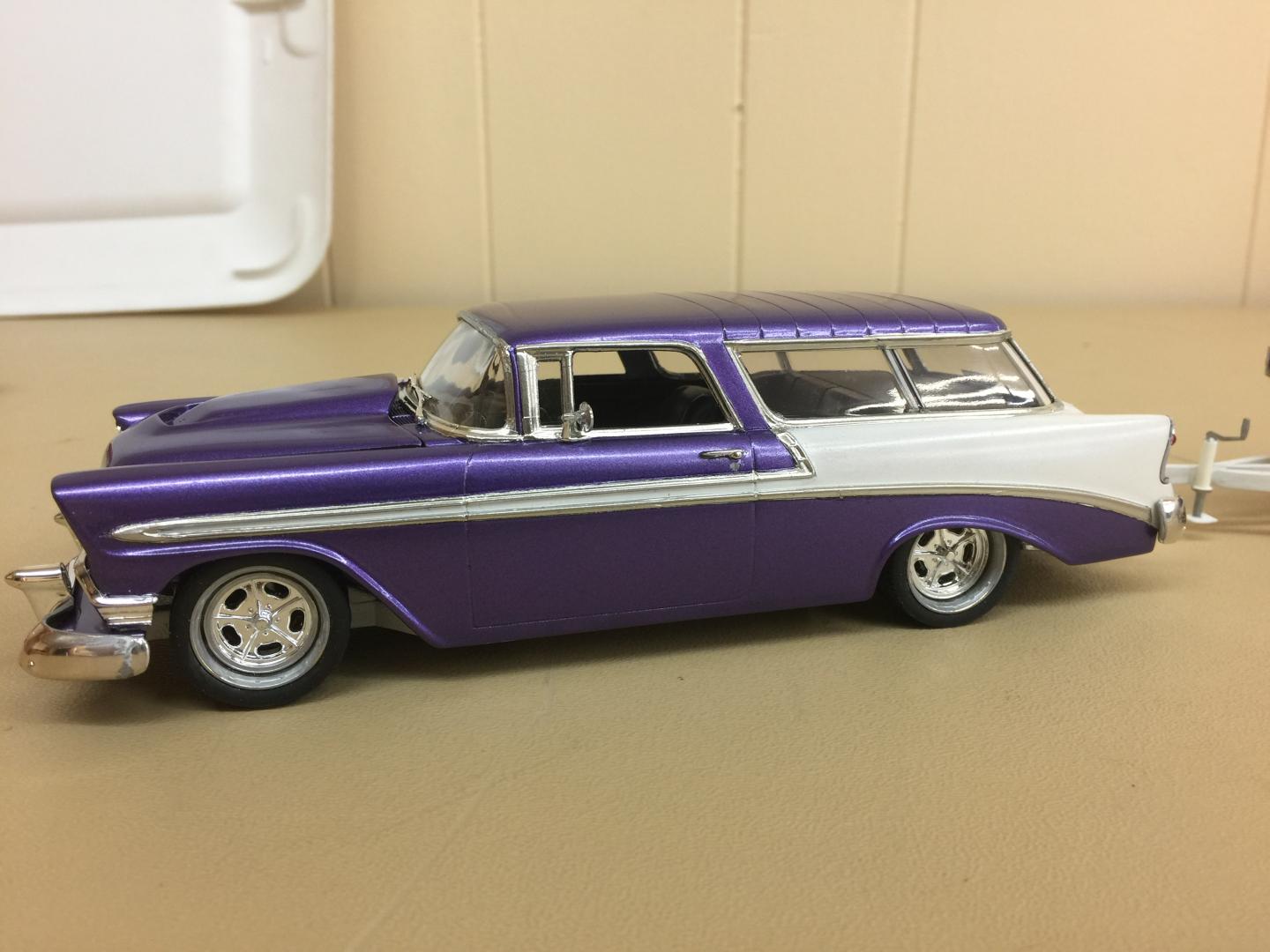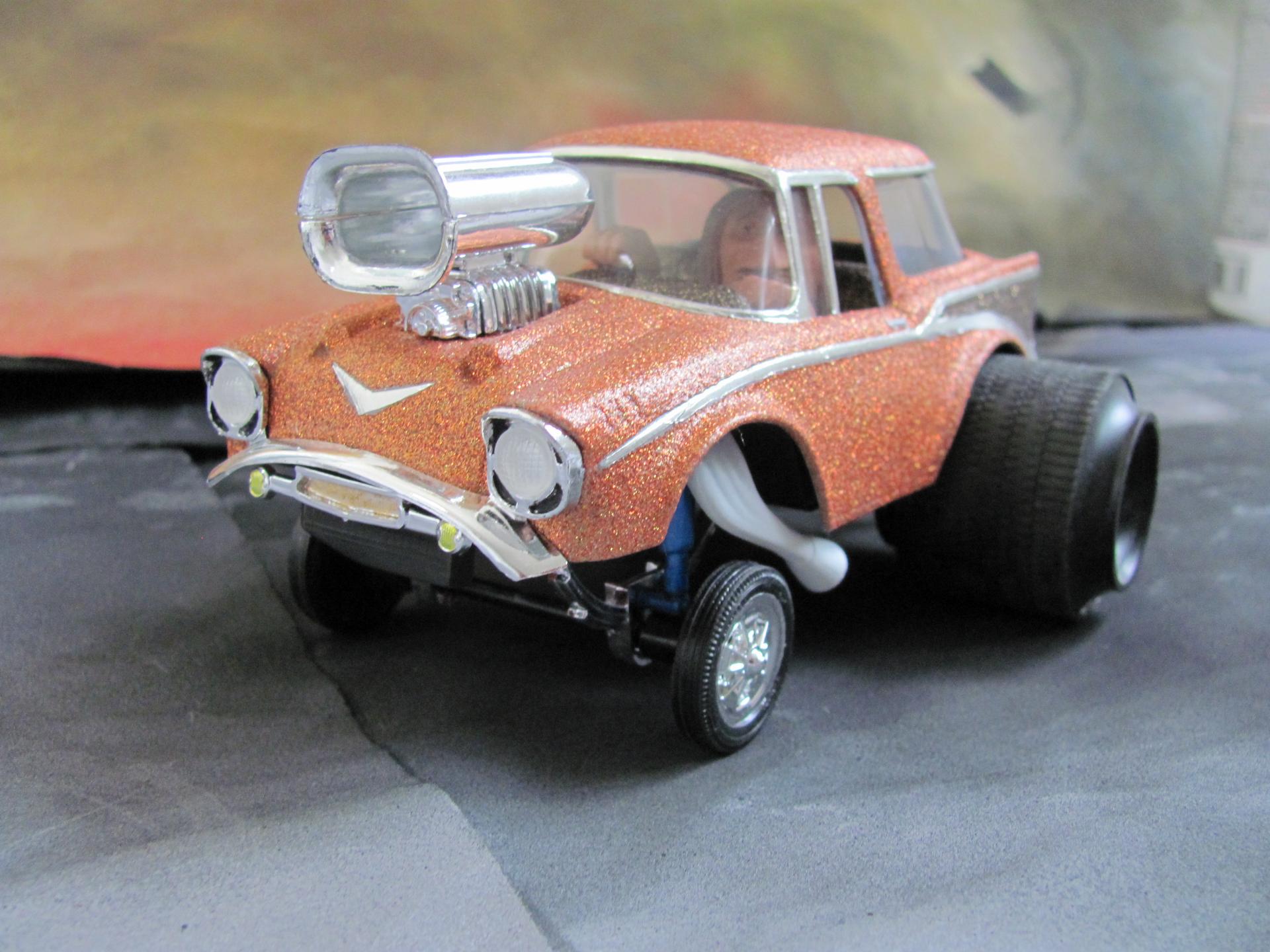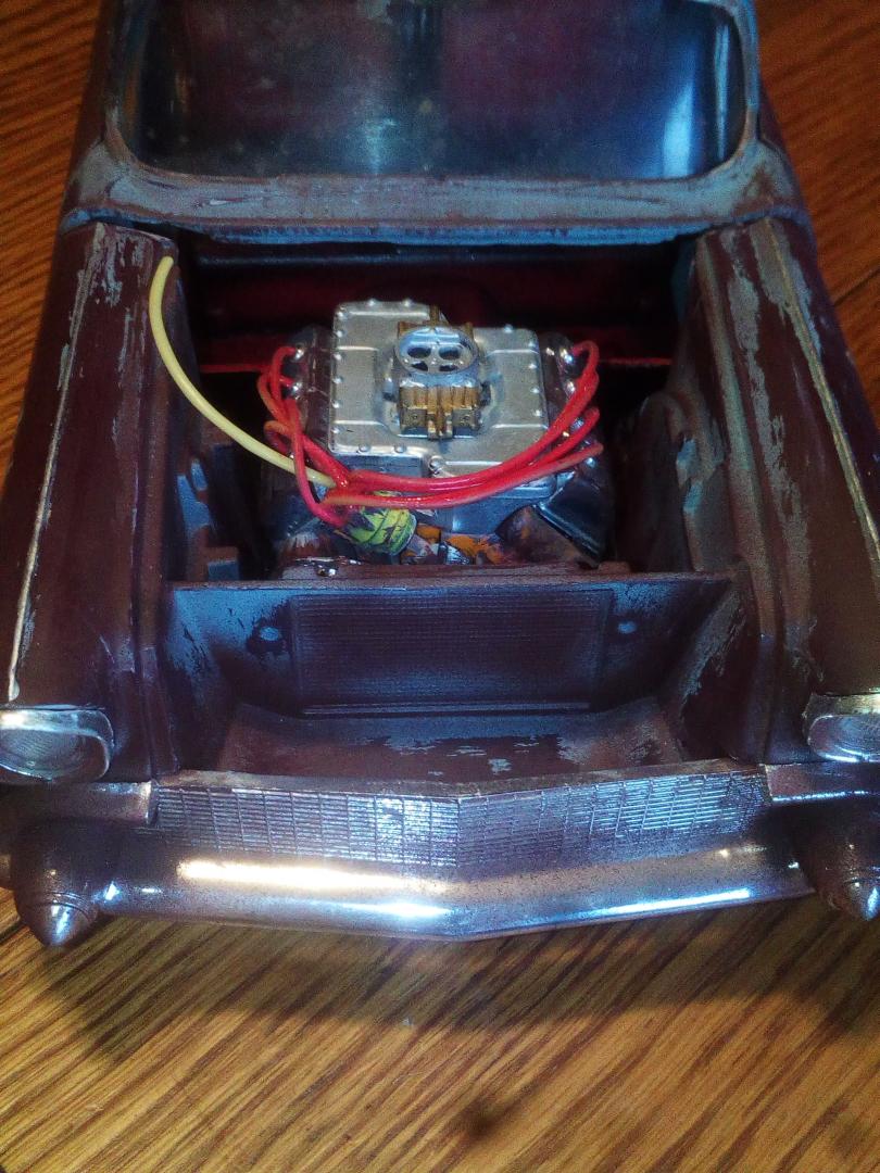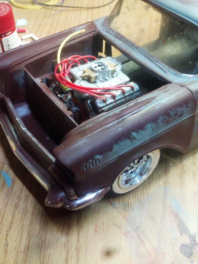 The newbie here... OK typos aside, this thing is for sure... A 1/16 scale kit. This is my WIP 1957 Chevy Nomad garage sale special. It began its life as a incomplete model, but soon became something that I can tick my Chevy and Chrysler friends off. The simple reason on why I put a 1969 General Lee Hemi in it, is because... why not. The Dodge began its life as a complete model, though after some time it got somewhat destroyed. My hopes are to give the 57 "Ch-emi" the look of a rat rod, on top of the look of an old school street rod. Neat things done: Lowered car, put in a Hemi, roll cage, side exhaust, fuel lines, break lines, ignition wires, and cut out firewall. Neat things to be done: Transmission, electrical wires, finish model.