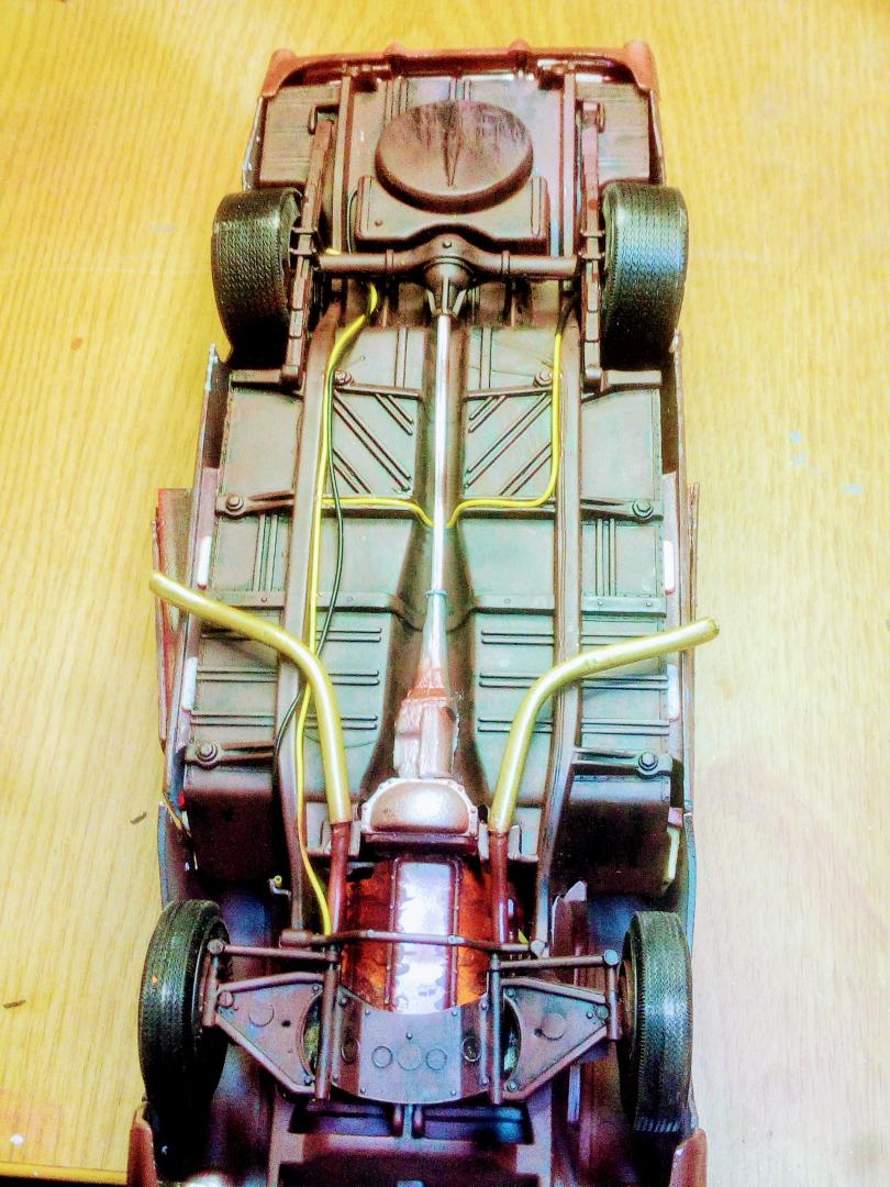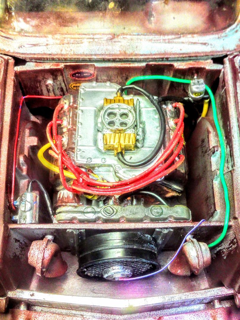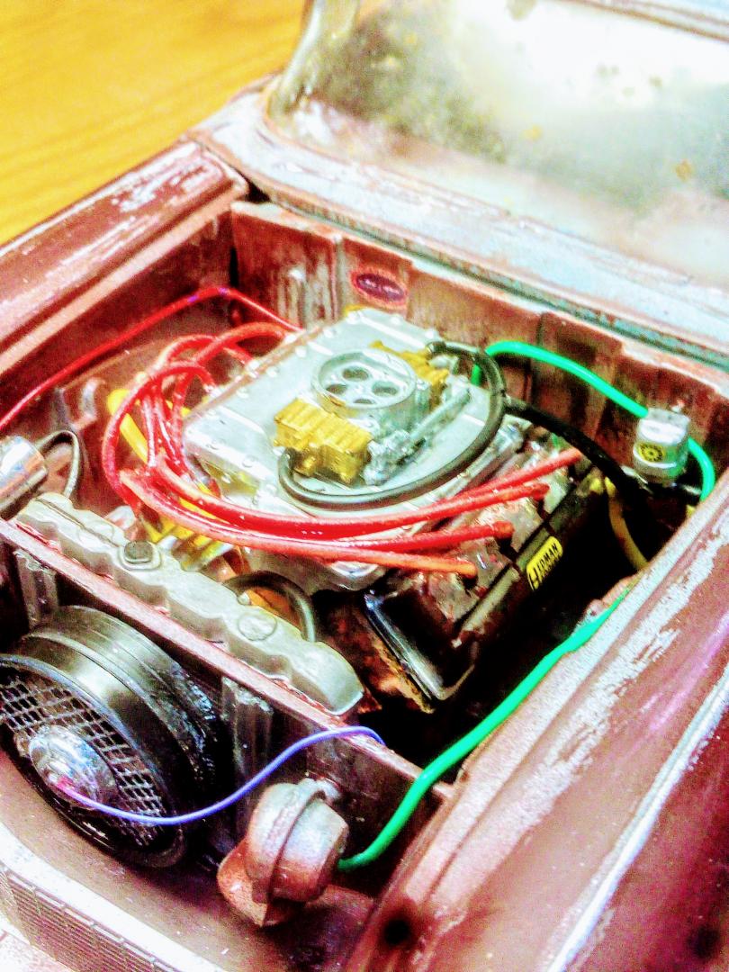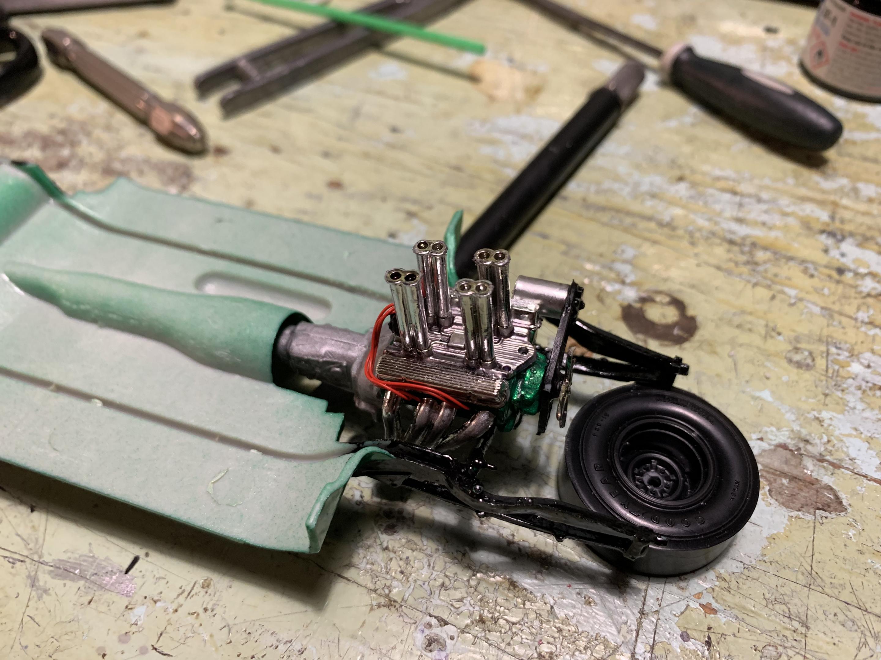 Hey guys, it’s been along time since i just built a model, i was into it heavy when i was younger, but haven’t built anything in years so I’m jumping back in, trying to keep the build simple but I’ve changed up a few things the kit came with a straight axle setup it was a weird traverse spring setup and i wanted to run a parallel spring set up, so i made some mount/shackles/springs and a tube axle Slapped it all in the chassis and painted it i started to assemble the motor and wiring it up, only real mods i made on the motor are the headers, they are the kit headers but with the square collectors cut off and the end filed into single pipes to look like short zoom or style headers I also included a picture on how the cars gonna sit, I radiused the wheel wells, the kit had marks on the inside that they suggest to cut to, which i did but in my opinion opens the wheel well up to much , but i think it will turn out ok