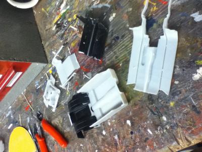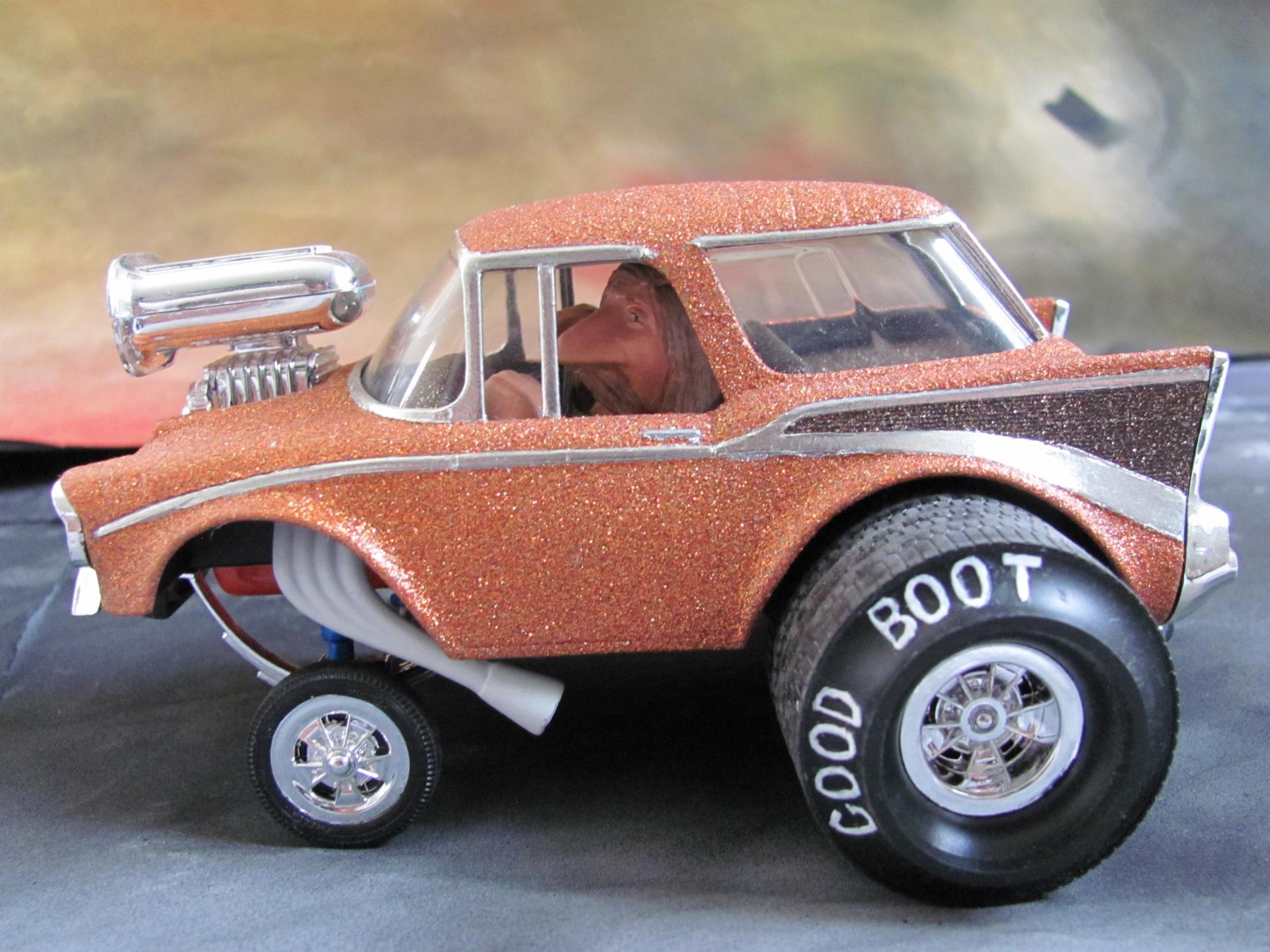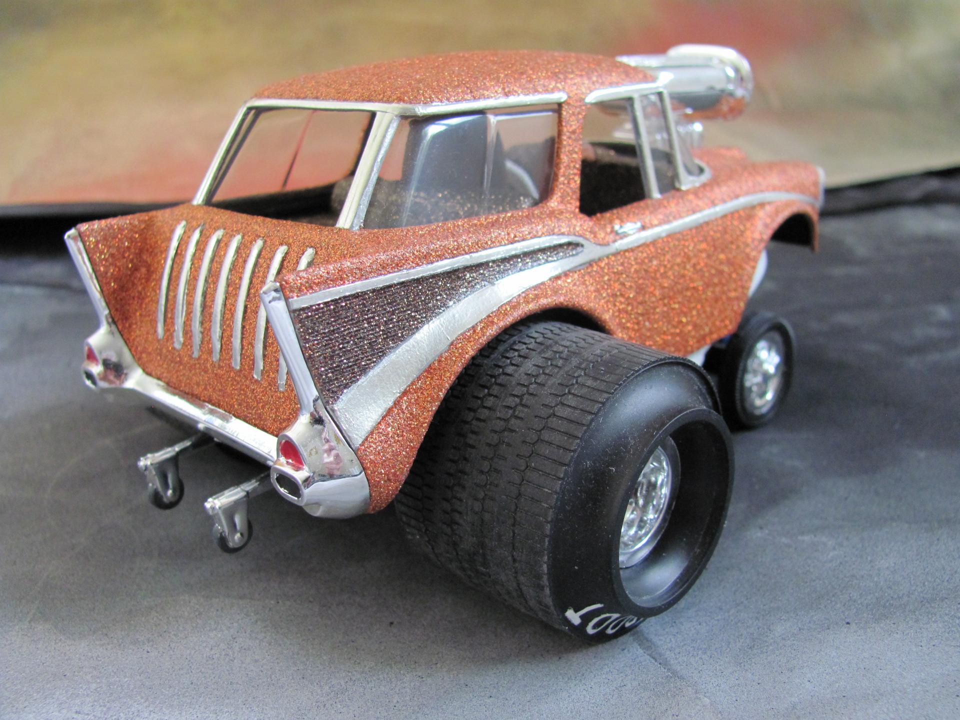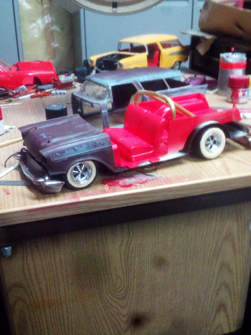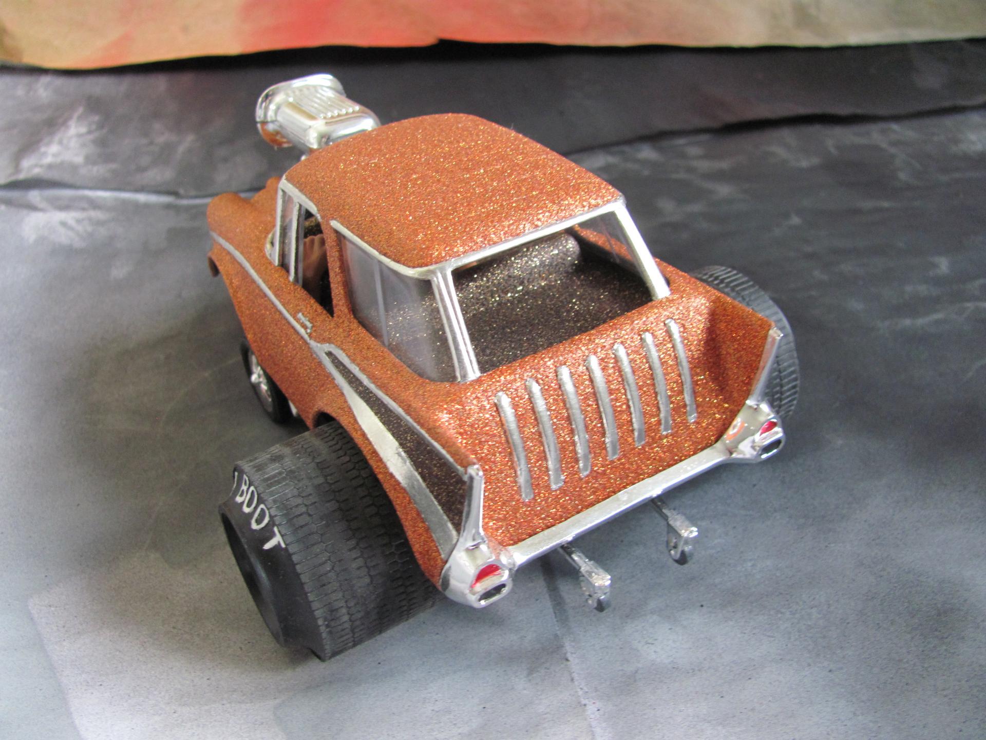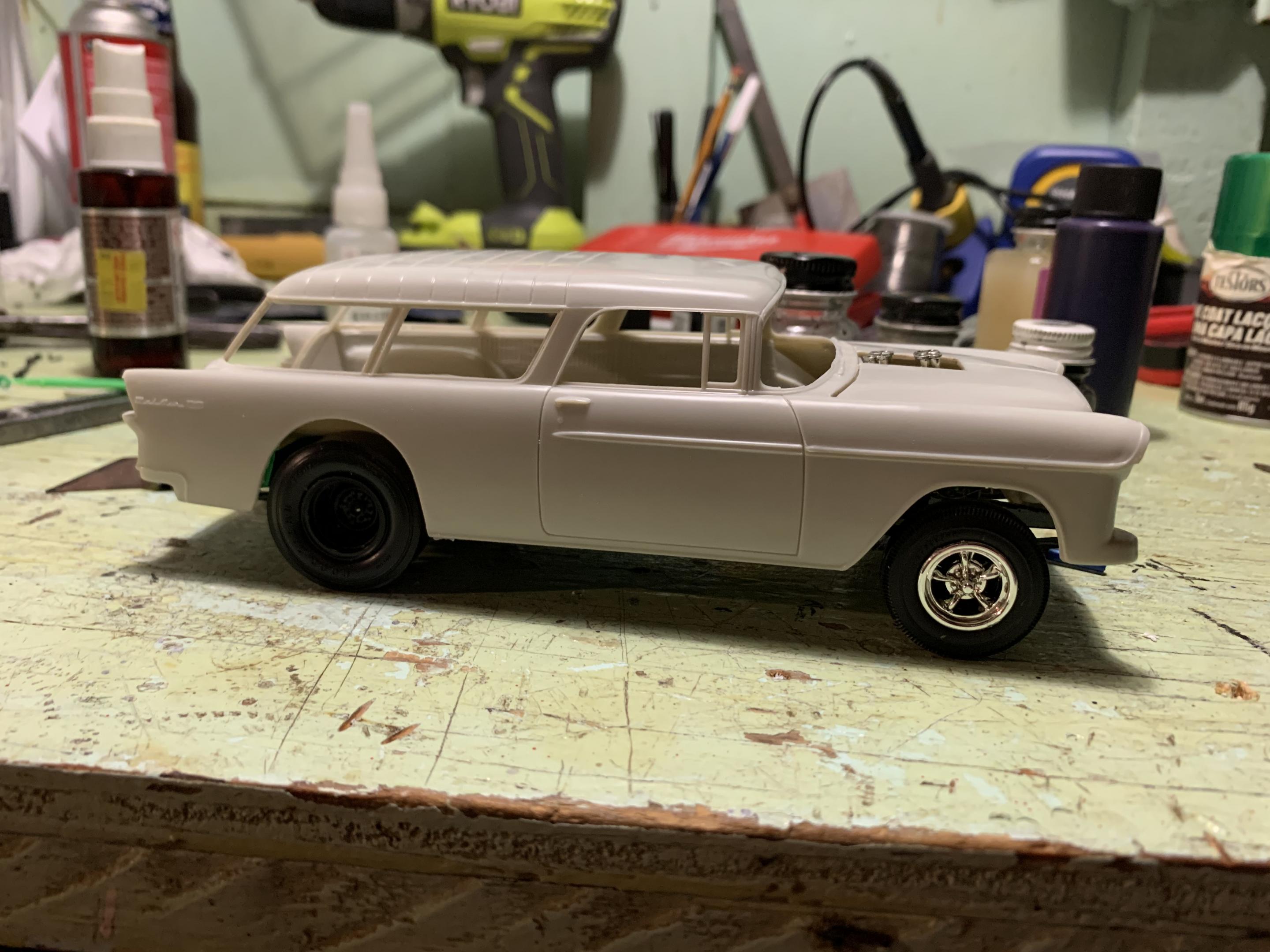 Hello, for my first post, I'd like to show you my 1955 Nomad Pro-Street/Drag Wagon. I decided to call it the 9 Second Grocery Getter, for short I'll just call it the Grocery Getter. First, lets start off with the motor. It is a motor from a 1955 Badman Gasser kit. It is painted flat aluminum (oil pan, transmission) satin black (transmission) guards red (block) I re-painted the blower flat aluminum, since the chrome was not so good I painted the headers satin black and I drilled the ends out to look like actual pipe. Originally, I was just going to take parts of the interior and the chassis to fit the large wheels up there like this: But then I remember I still had the chassis to a prostreet 55 belair I did a while ago, so I cut it up and slapped it on there. More updates will be coming soon! Any advice/recommendations are welcome! -Glenn Also, where do you guys get your really wide slicks, and for what price?